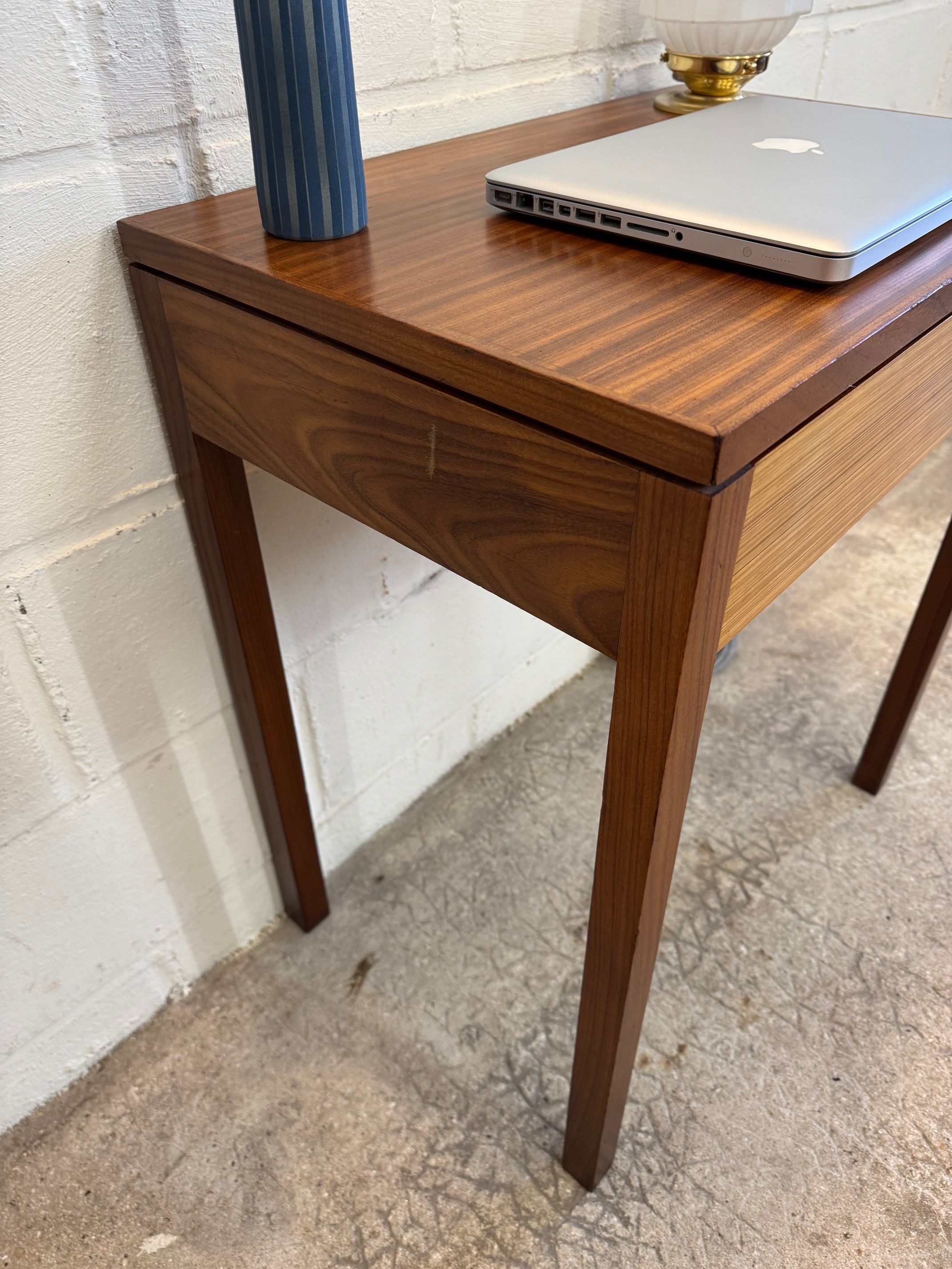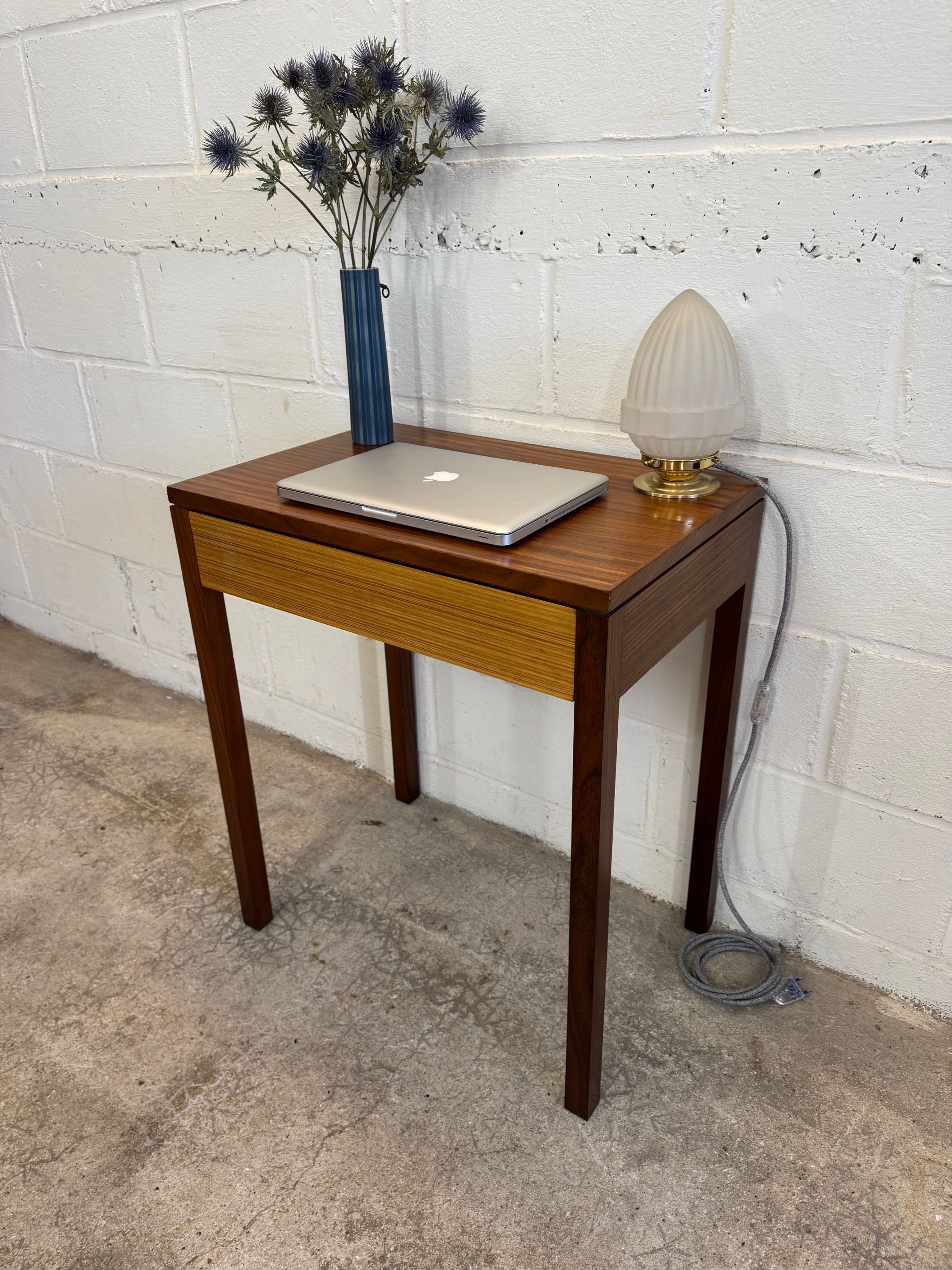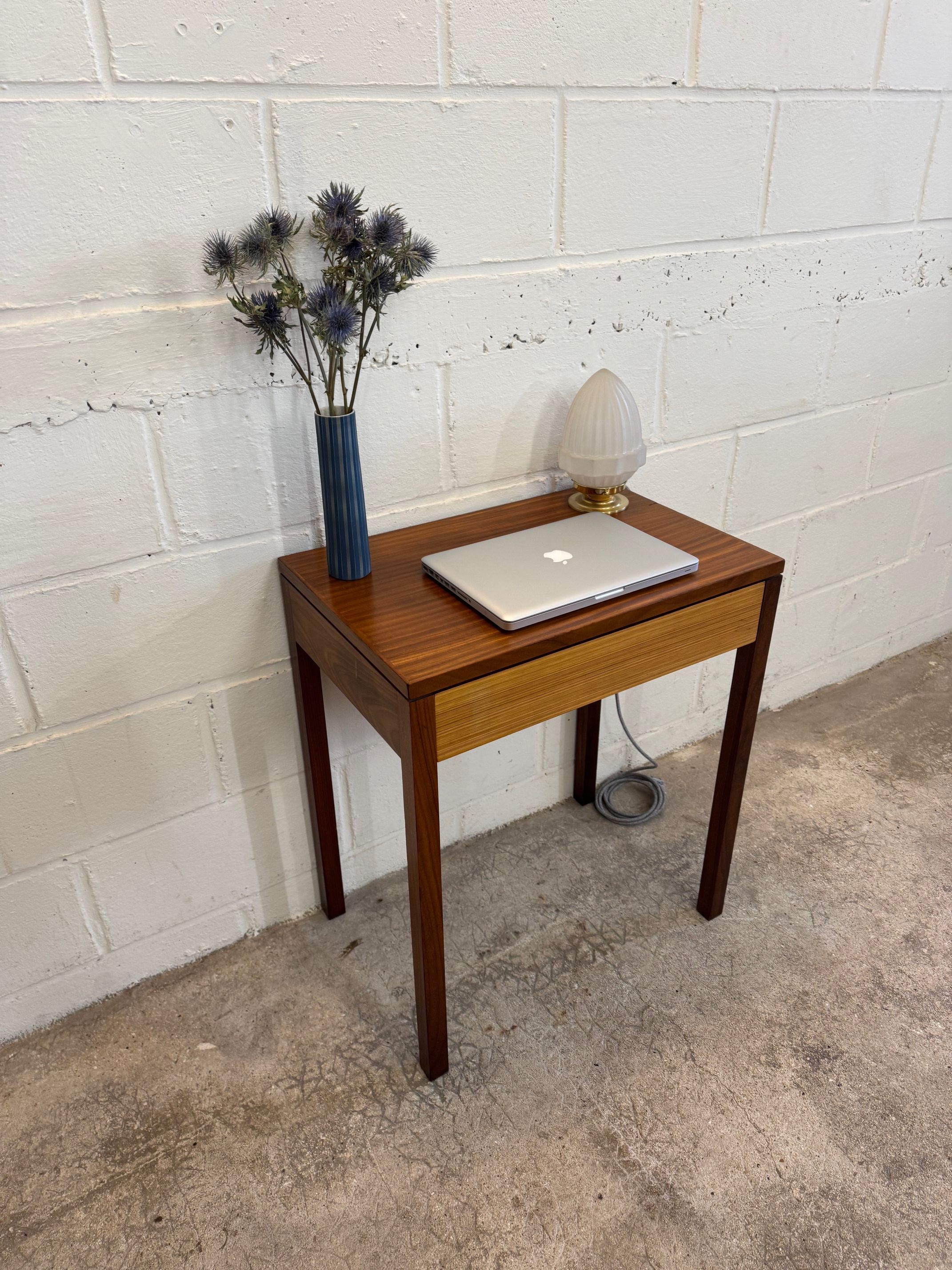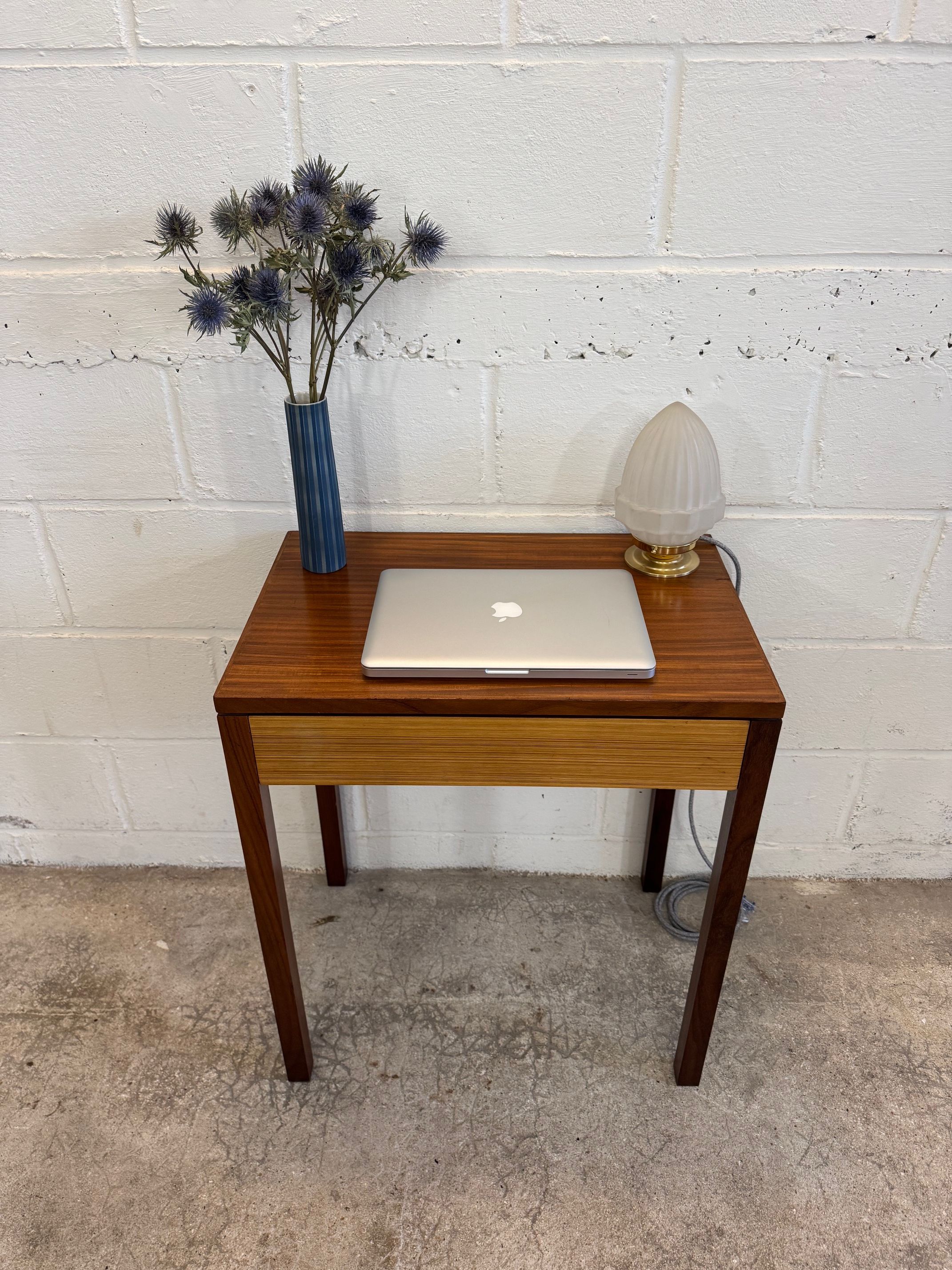 Un petit bureau en teck, disposant d'un tiroir. Il peut aussi être parfait comme console avec le tiroir vide-poche.