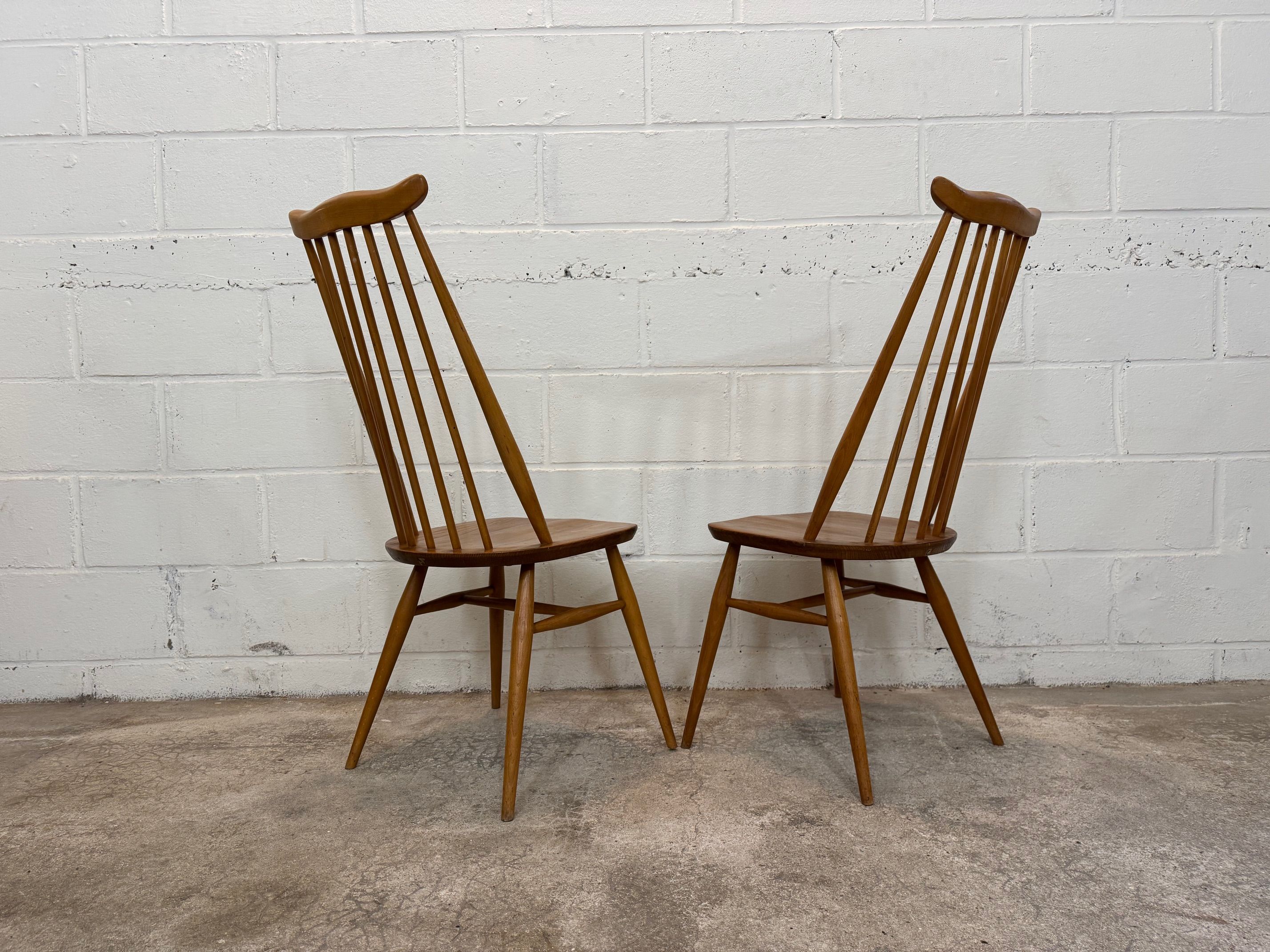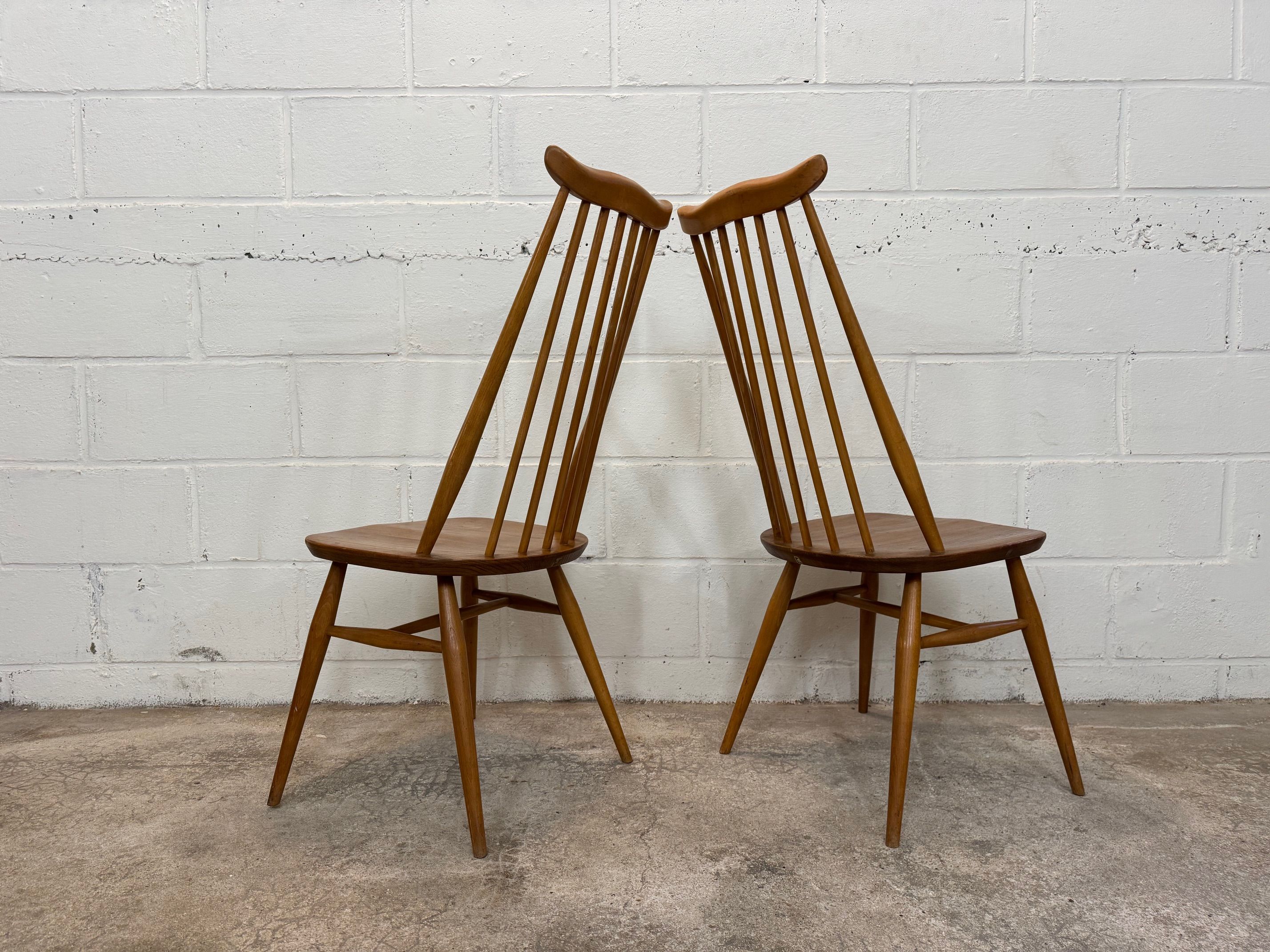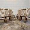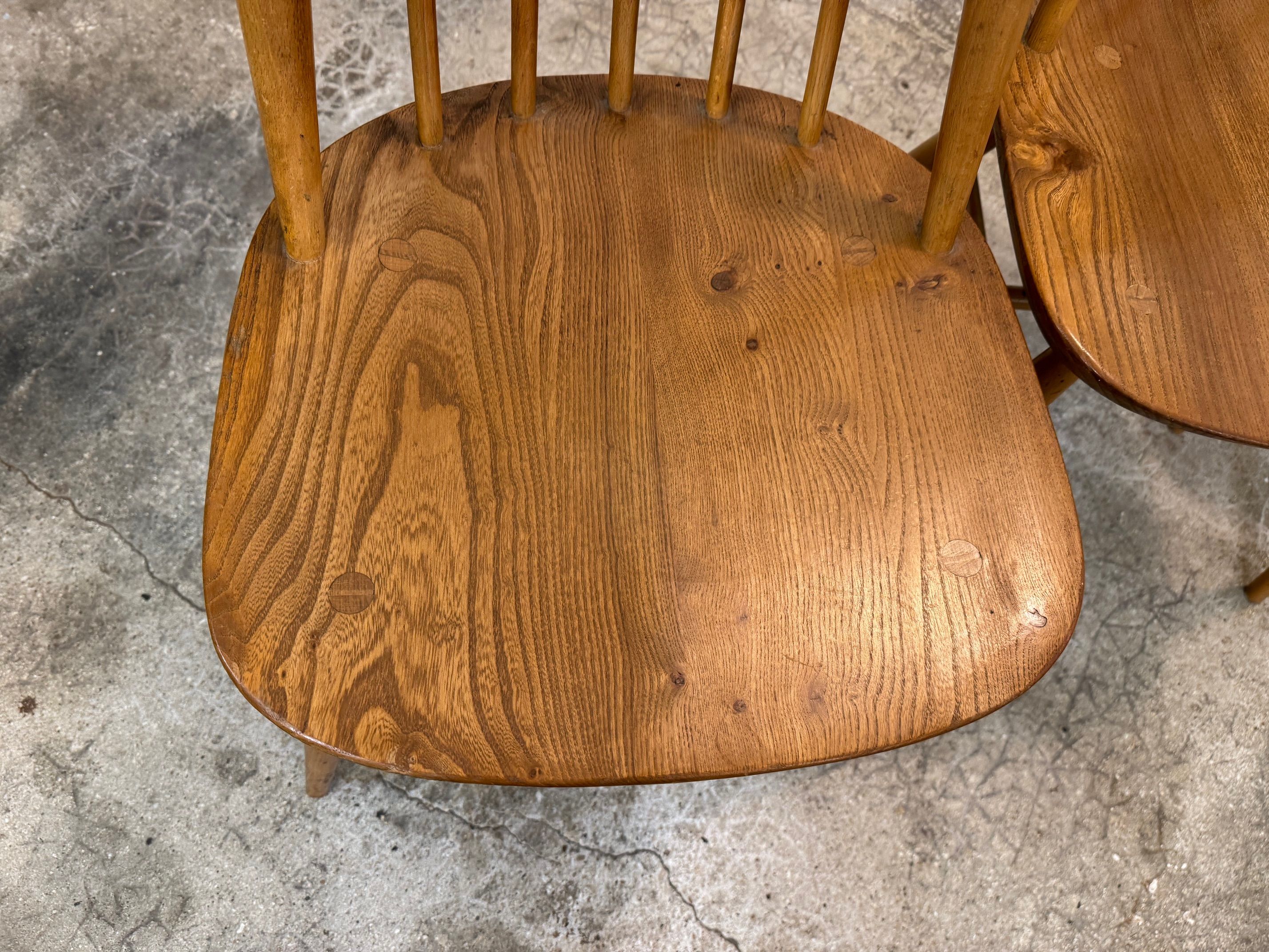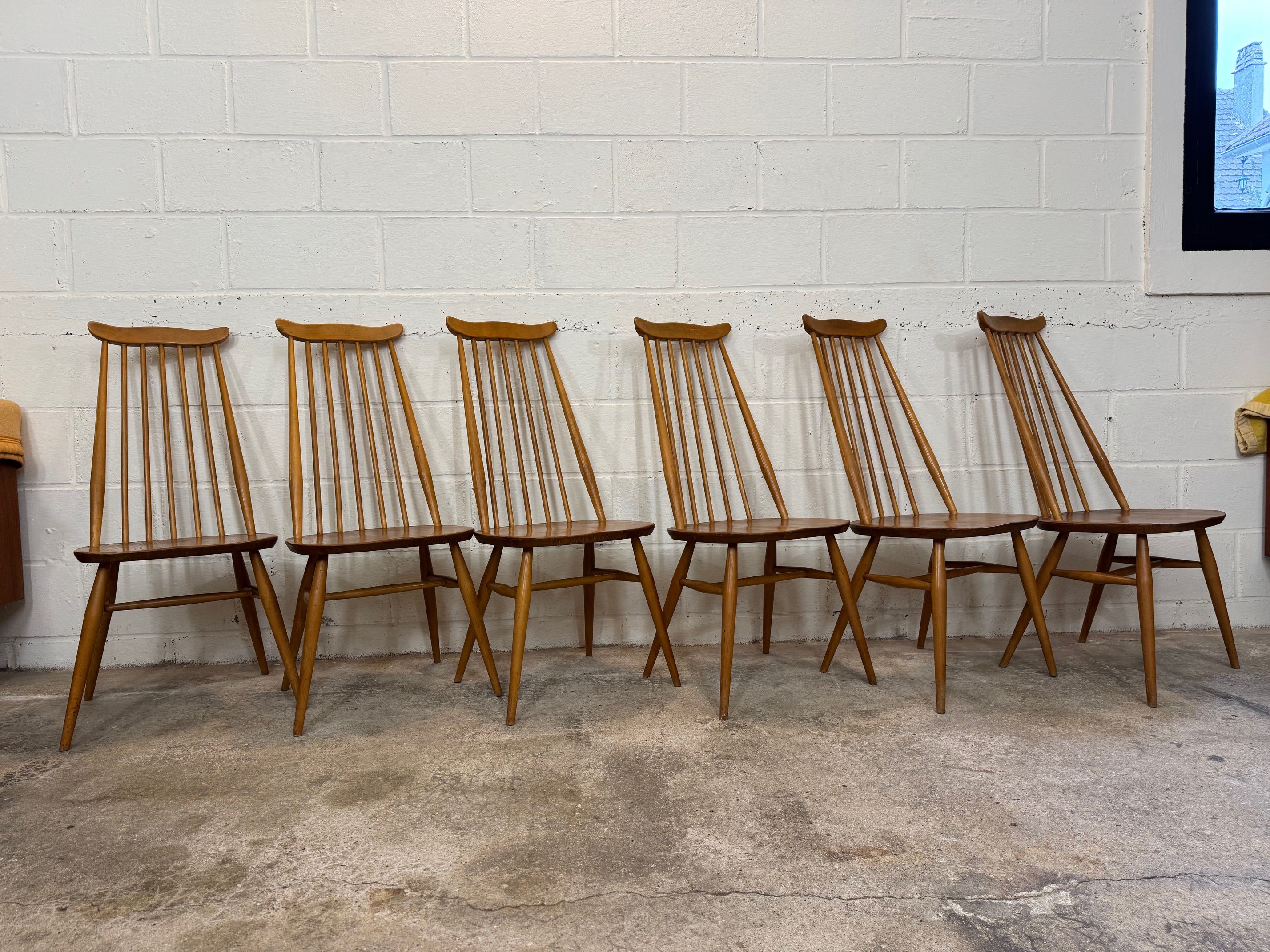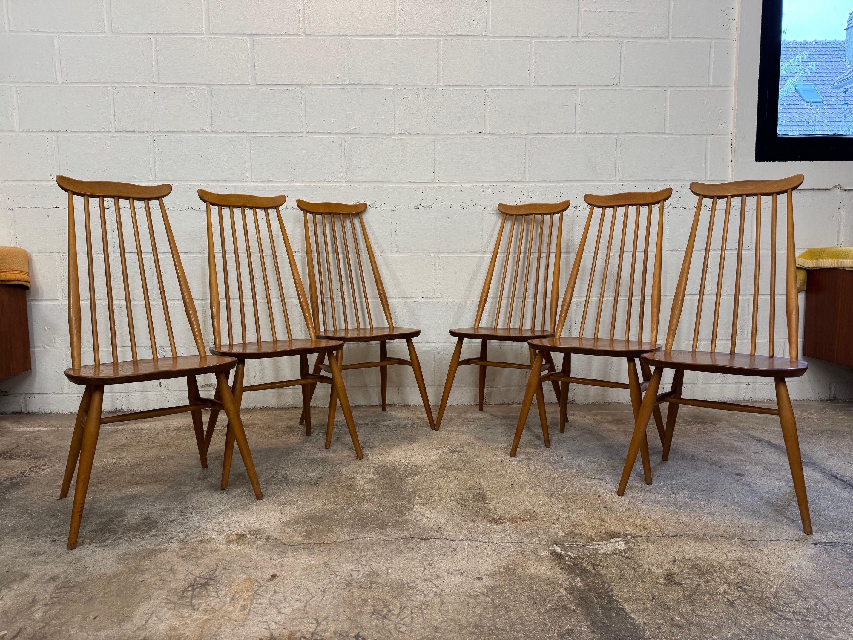 Une suite de 6 chaises années 60, éditée par Ercol, modèle Windsor avec haut dossier moustache. Assise en Orme massif, piétement compas et dossier en Hêtre.