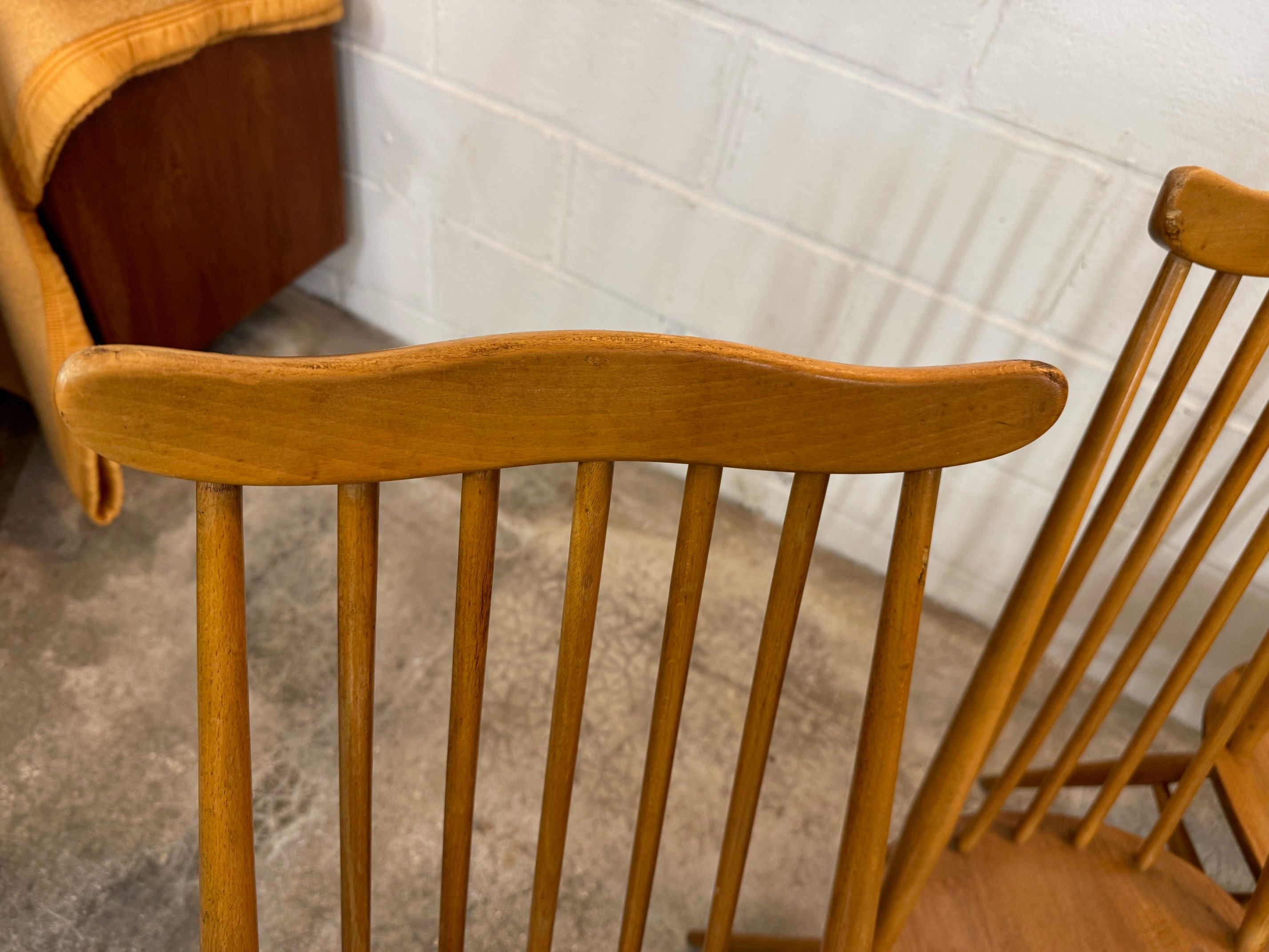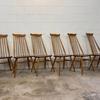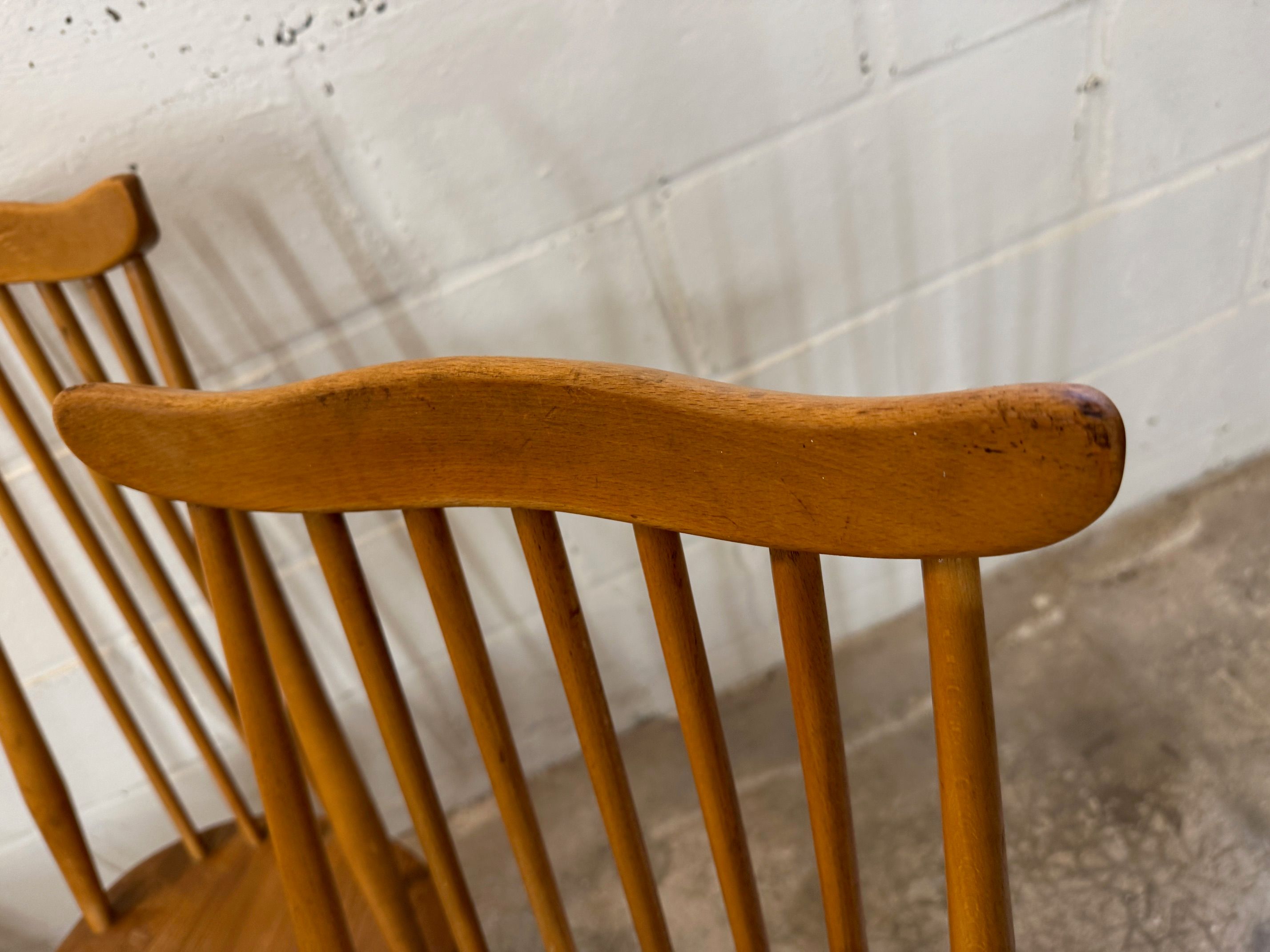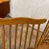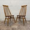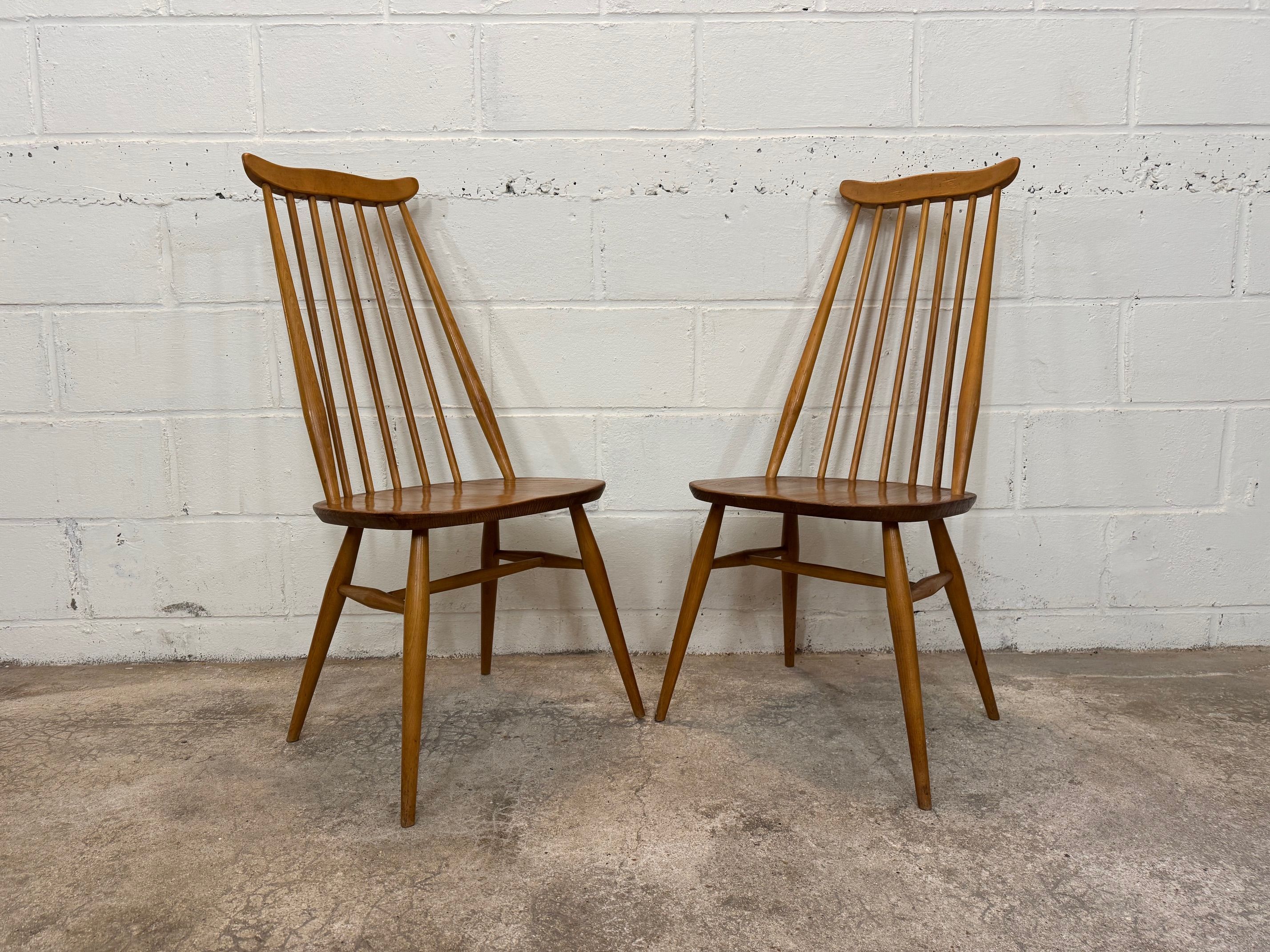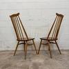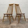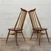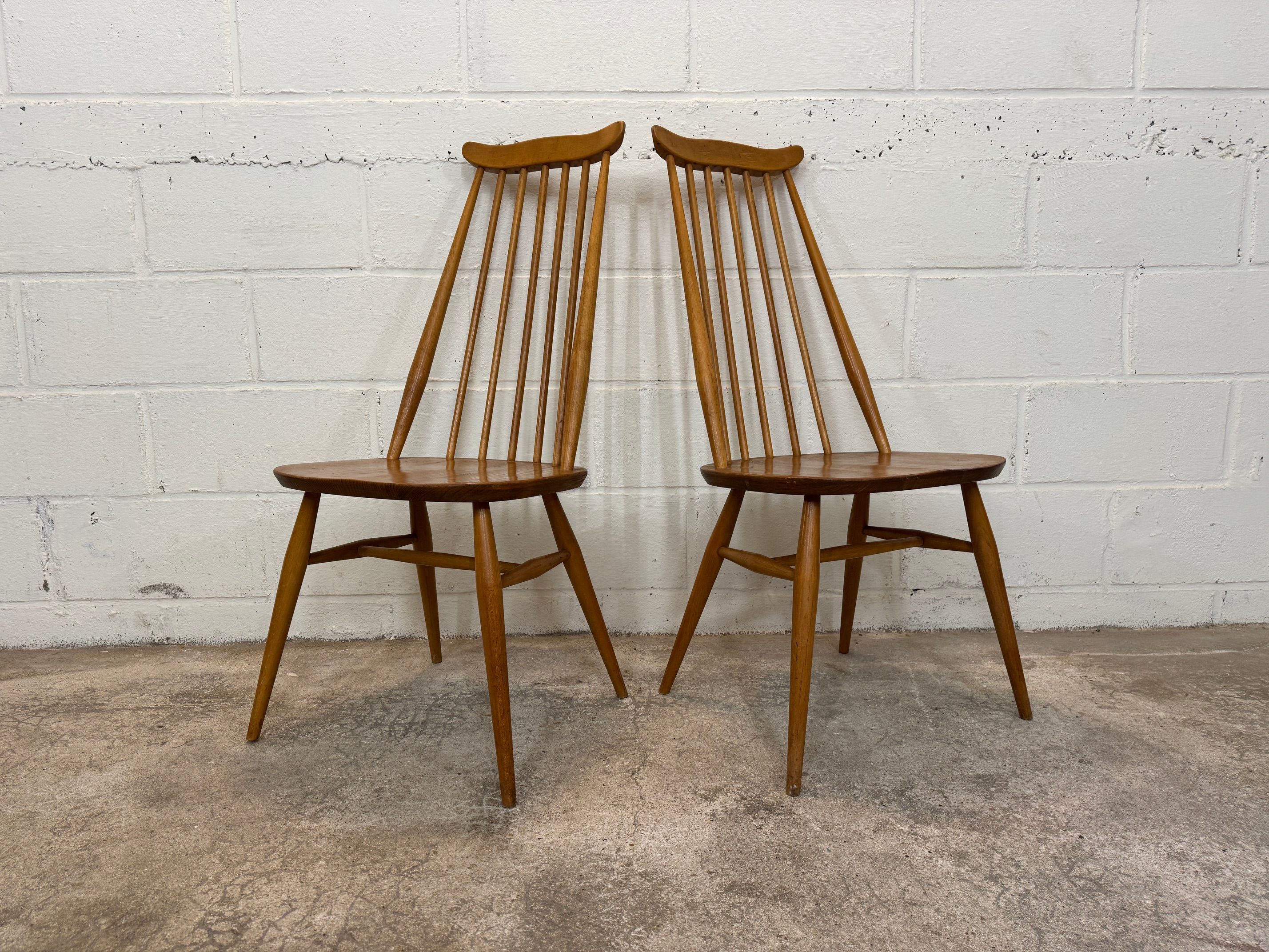 Une suite de 6 chaises années 60, éditée par Ercol, modèle Windsor avec haut dossier moustache. Assise en Orme massif, piétement compas et dossier en Hêtre.