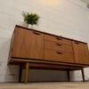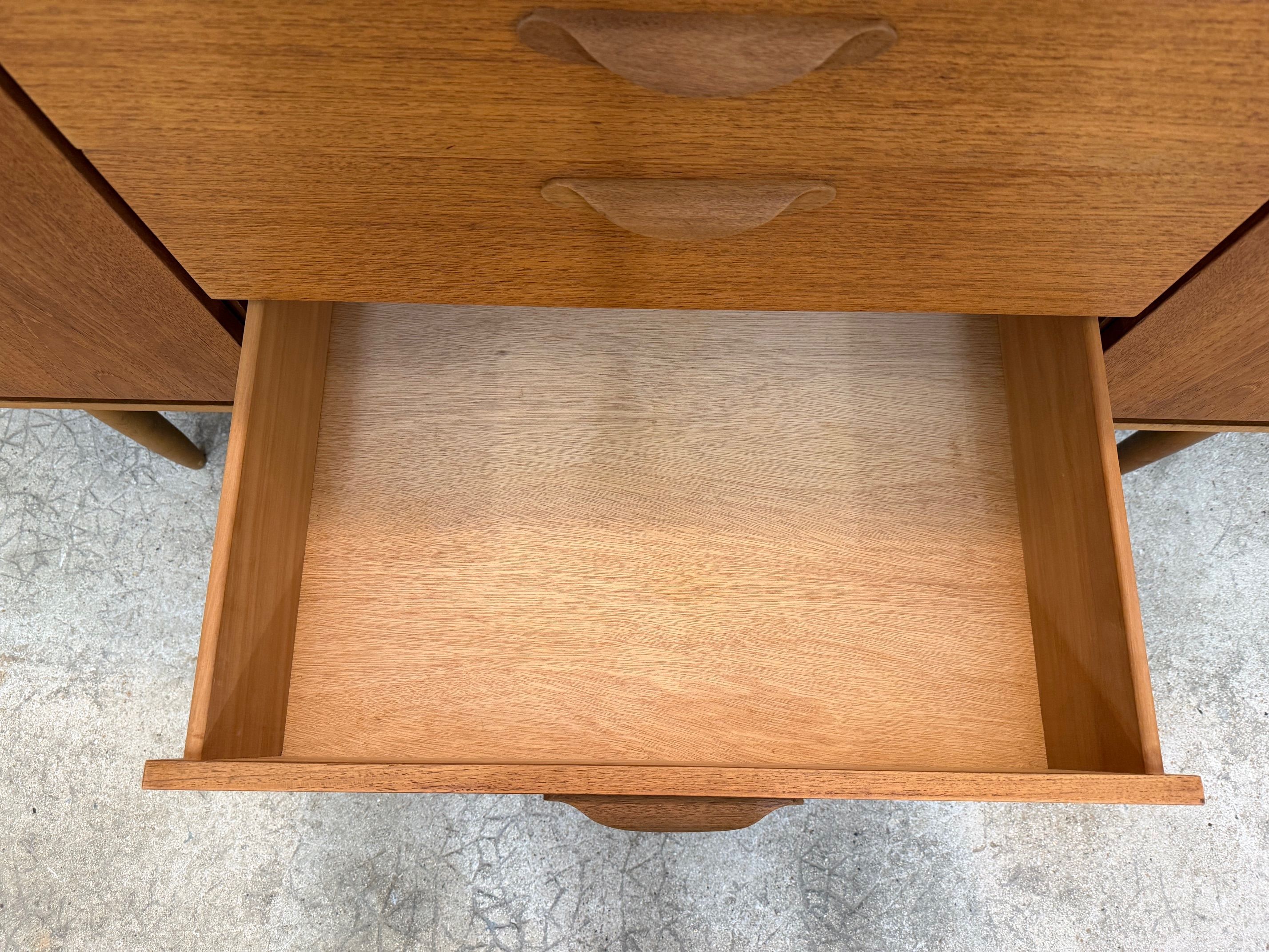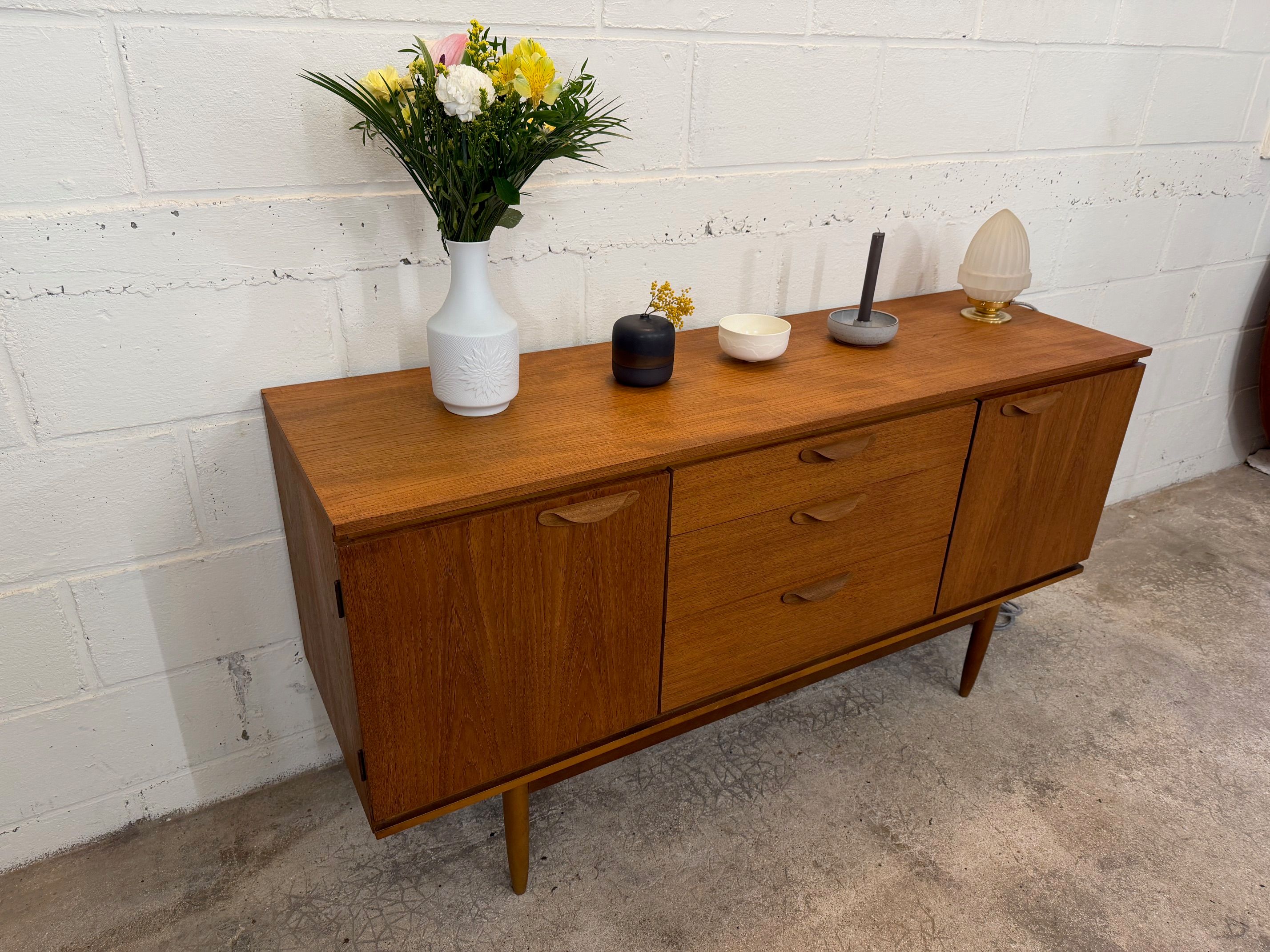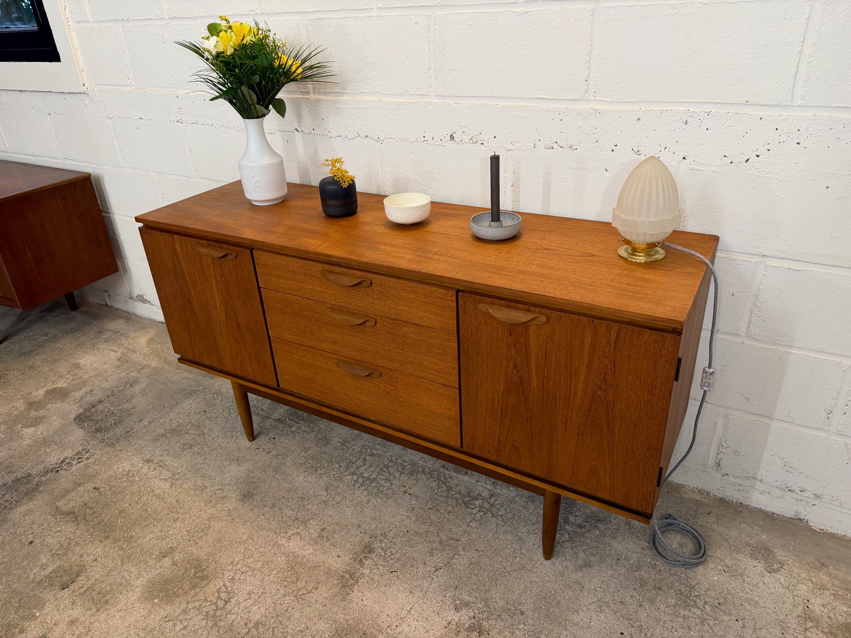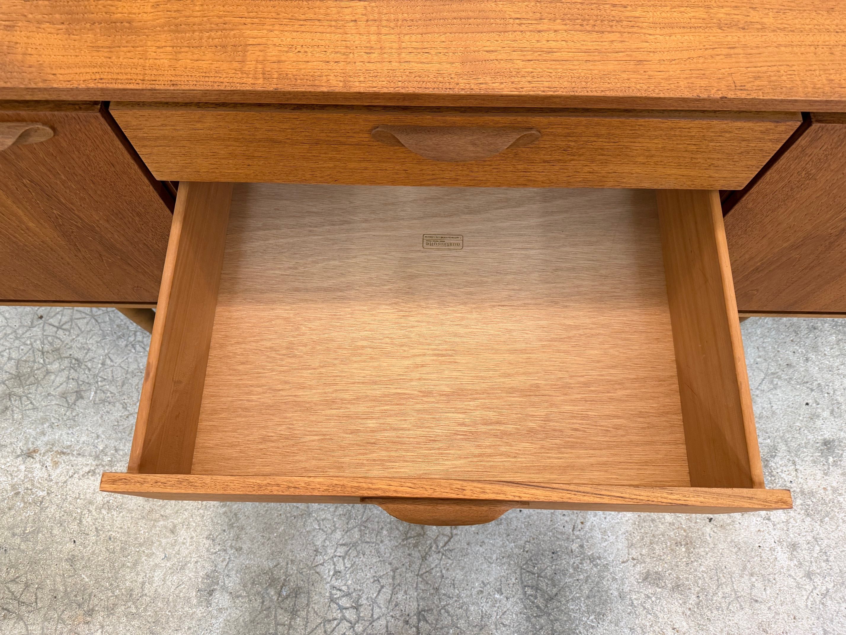 Une belle enfilade scandinave en teck, éditée en Angleterre par Austinsuite dans les années 60. Elle offre une bonne capacité de rangement.