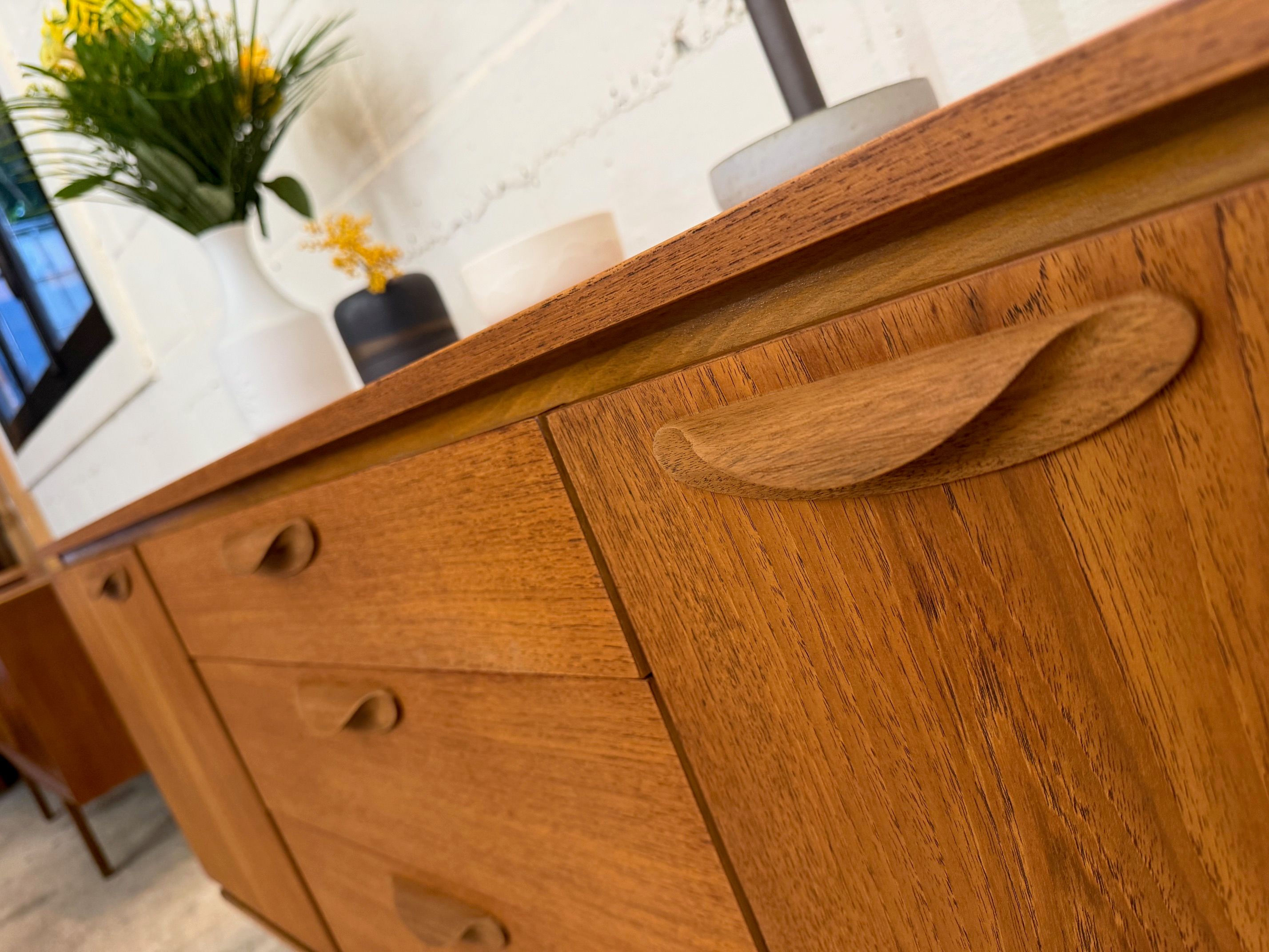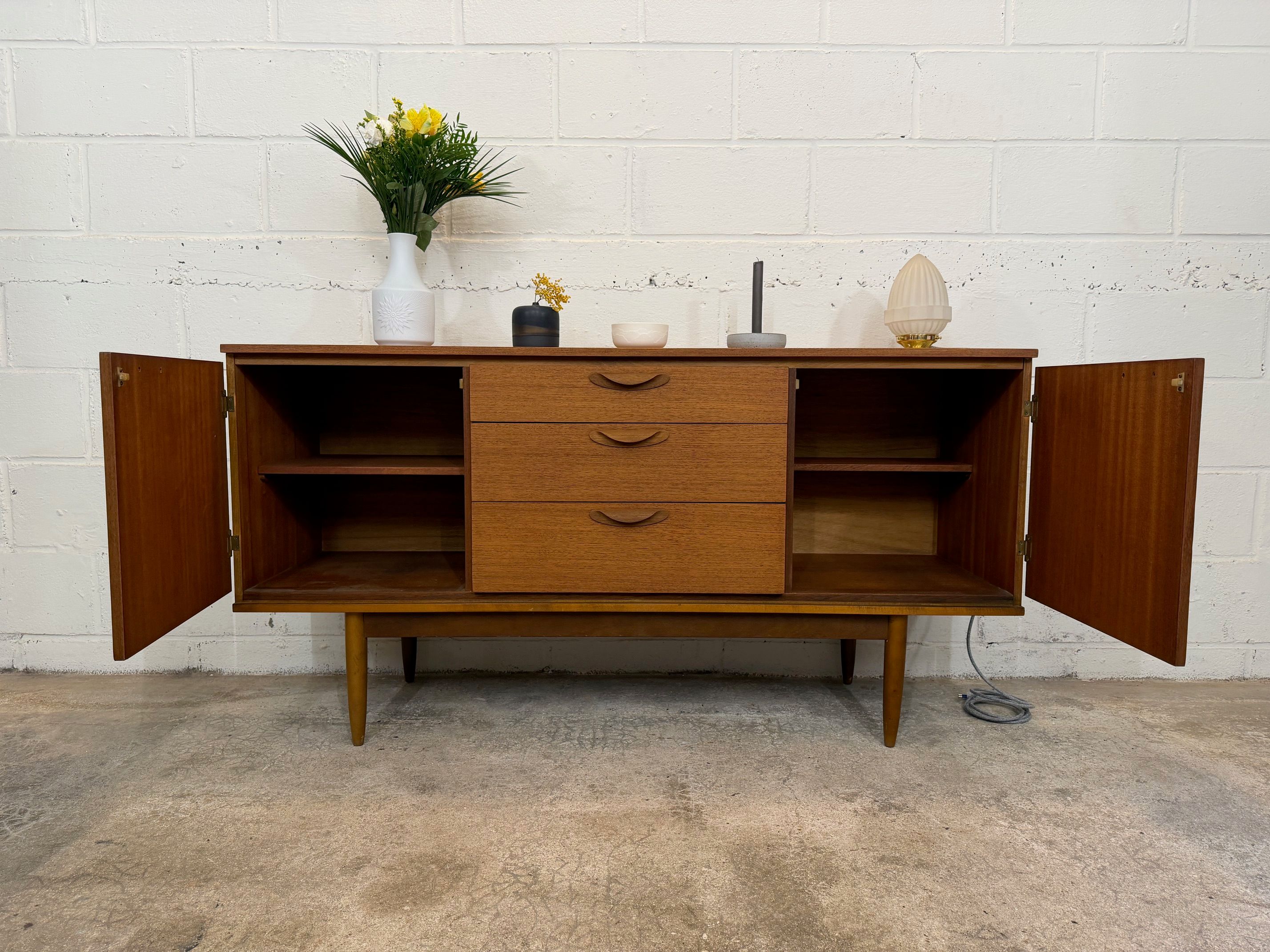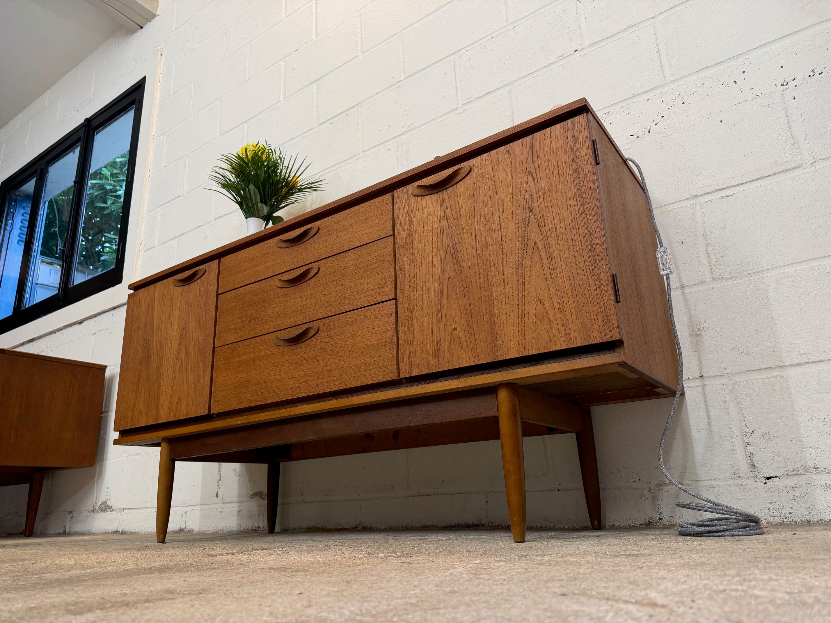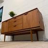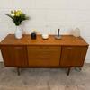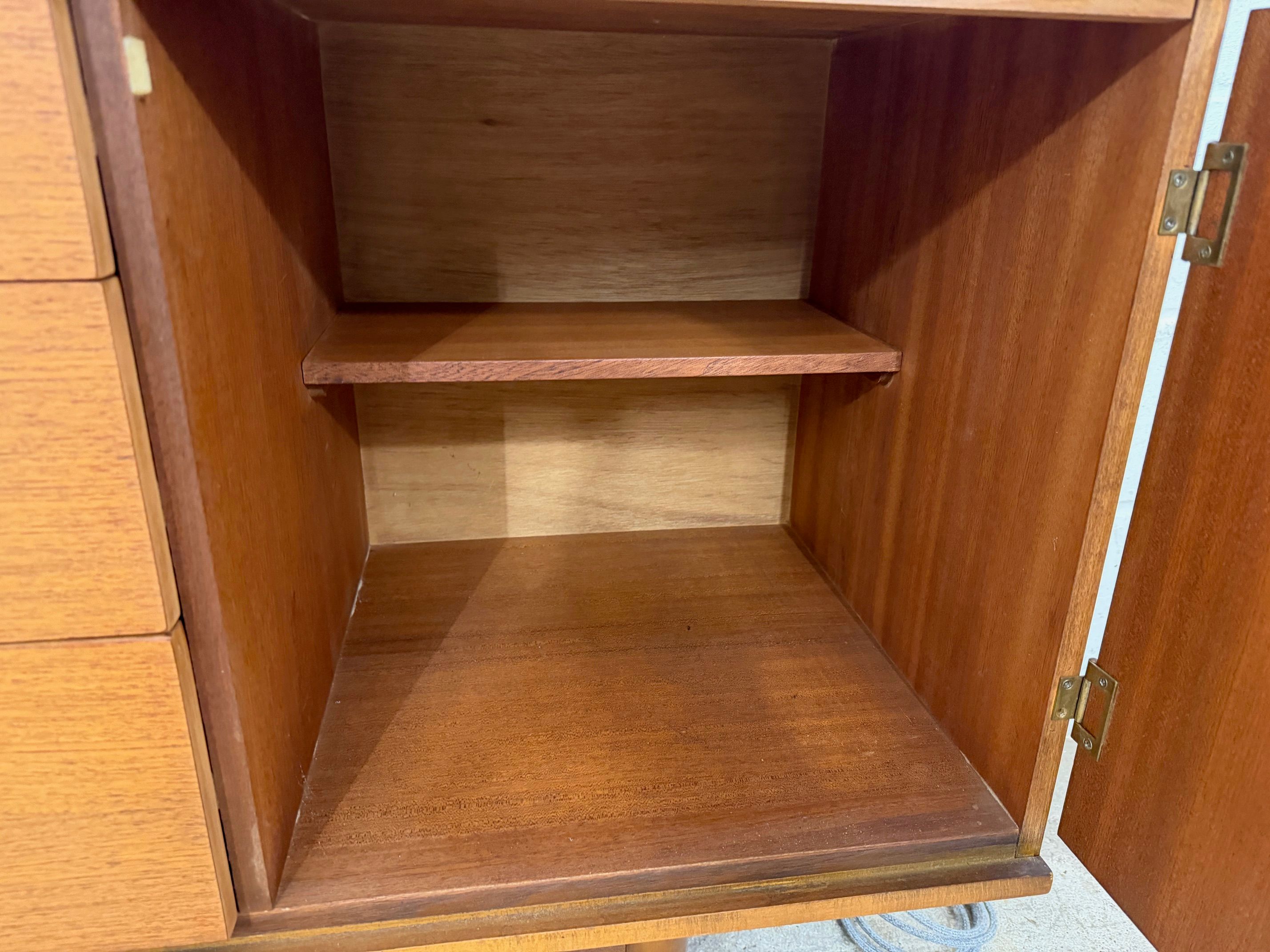 Une belle enfilade scandinave en teck, éditée en Angleterre par Austinsuite dans les années 60. Elle offre une bonne capacité de rangement.