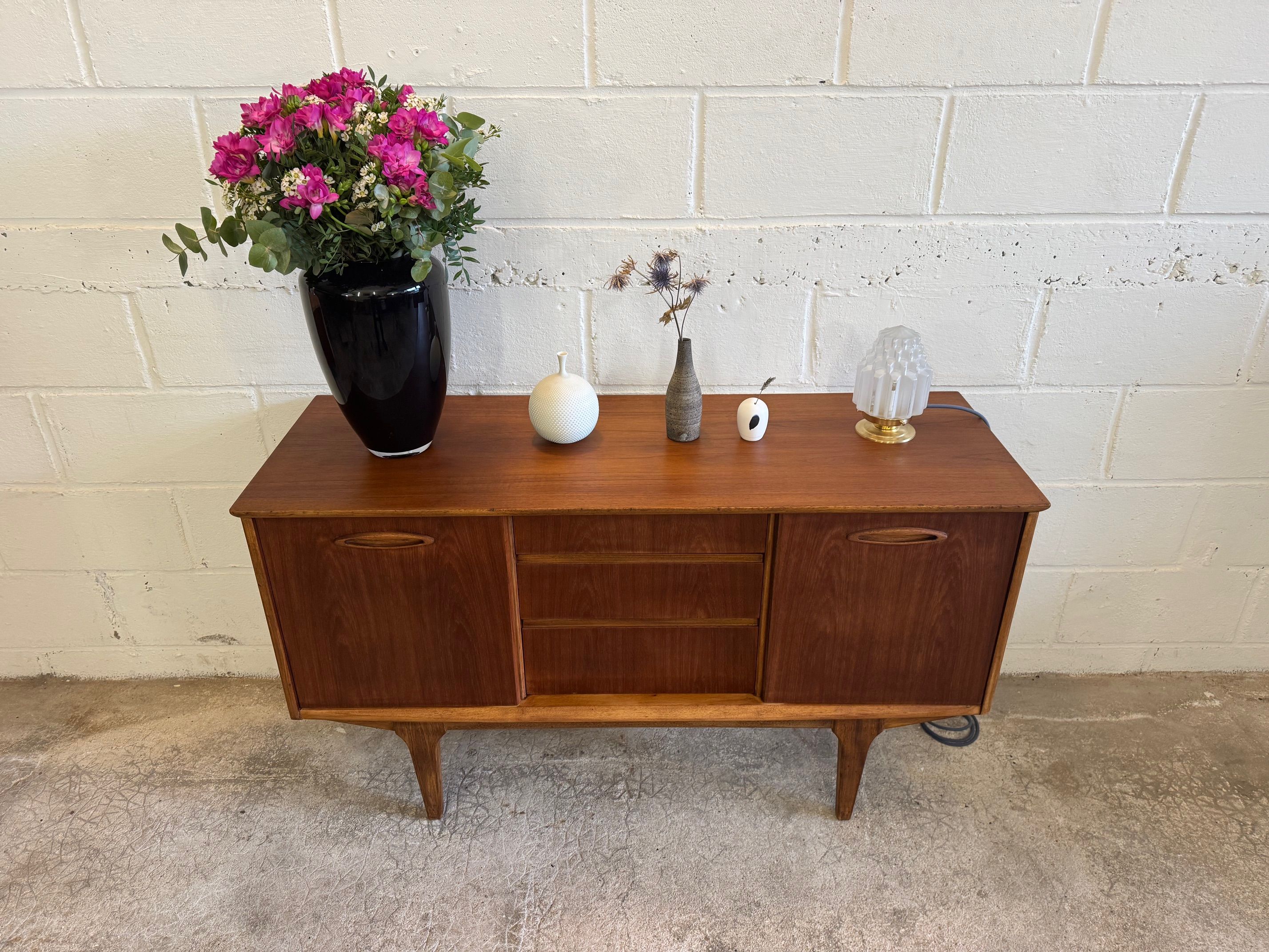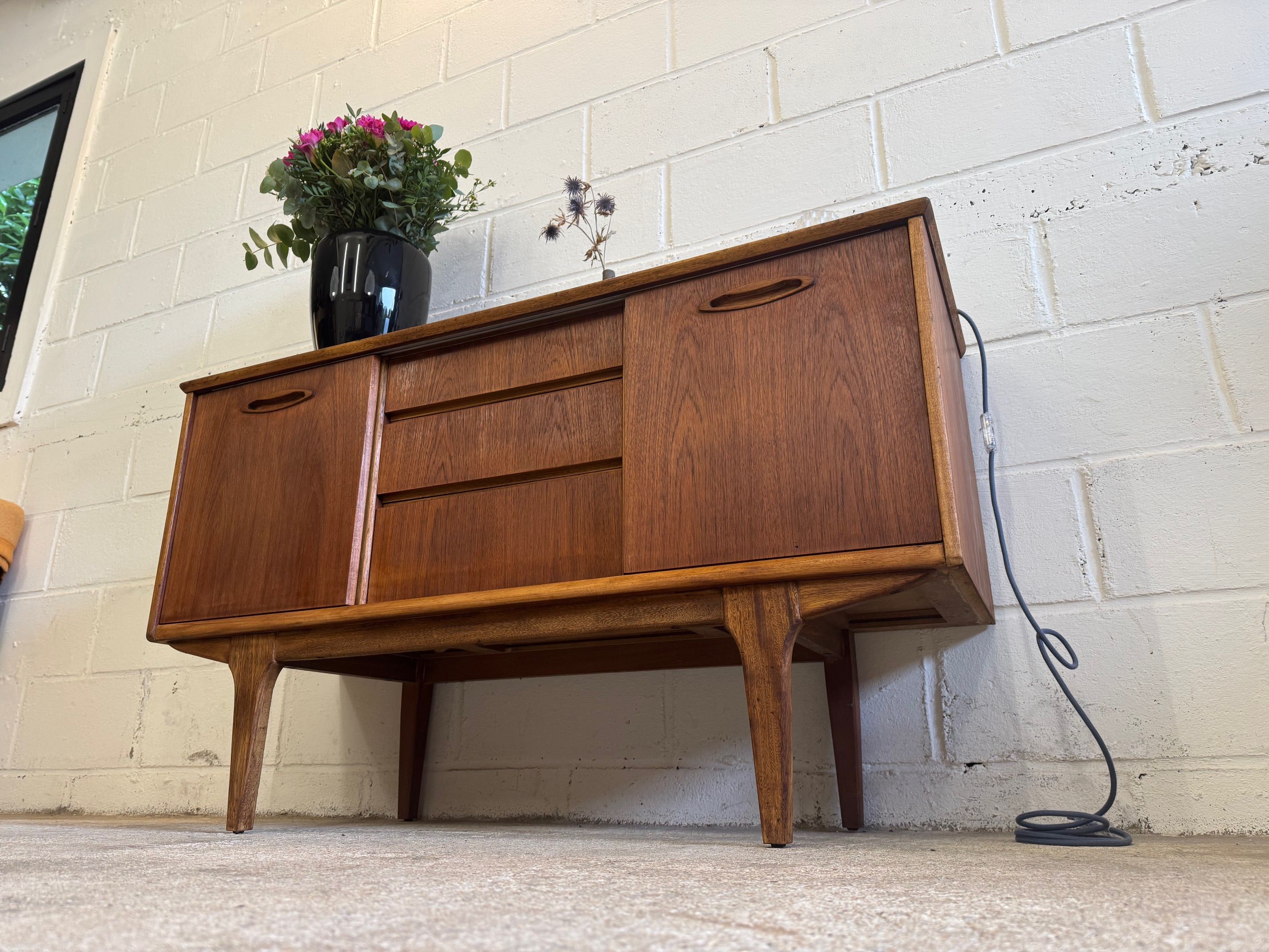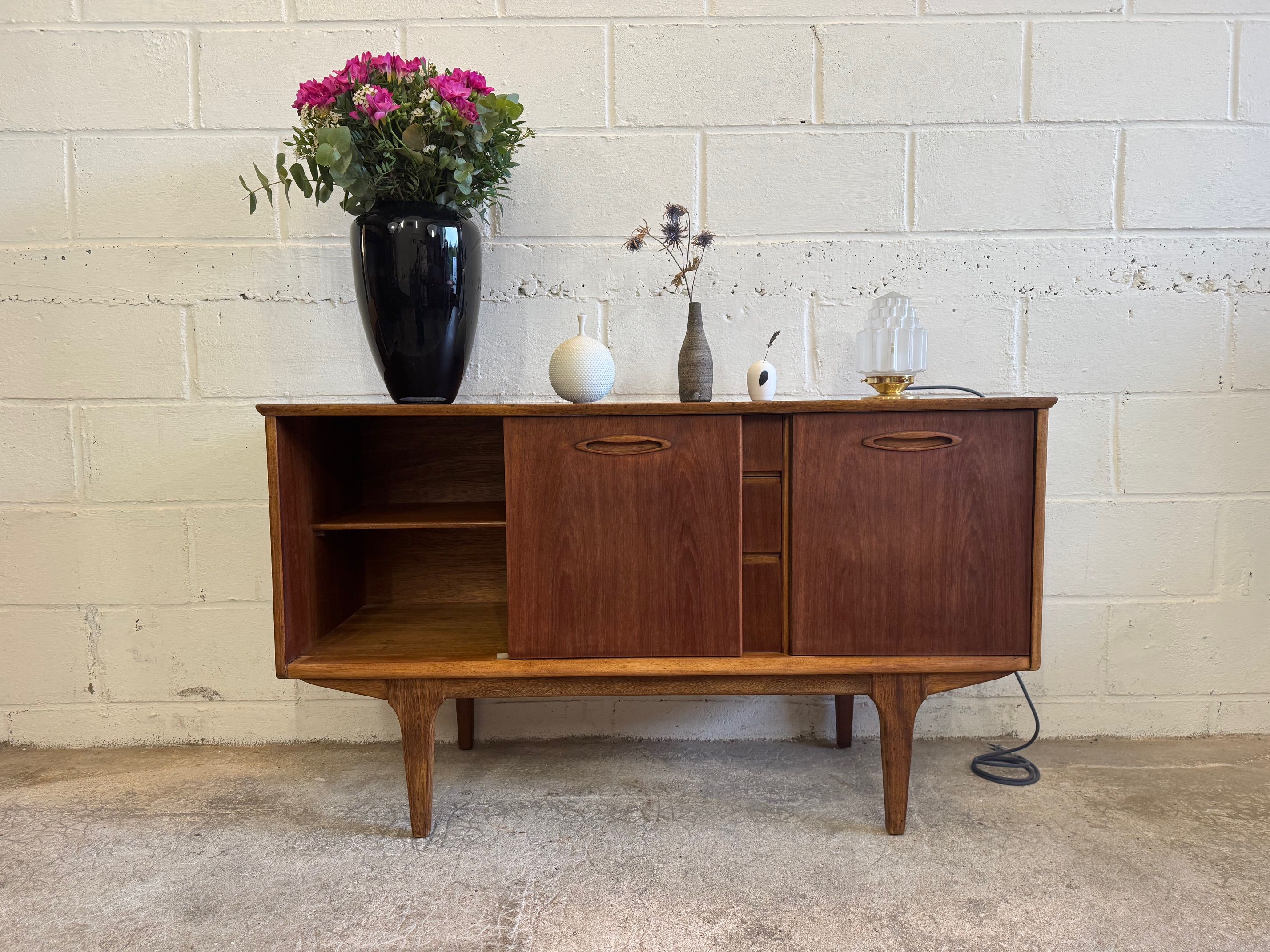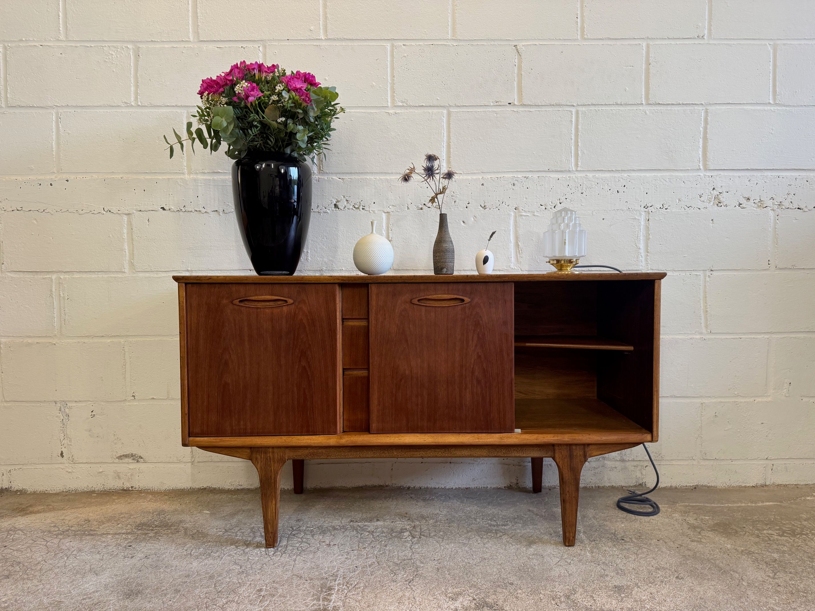 Une belle enfilade scandinave en teck, à portes coulissantes. Modèle aux dimensions idéales pour les petits espaces, édité par Jentique au Royaume-Uni dans les années 60.