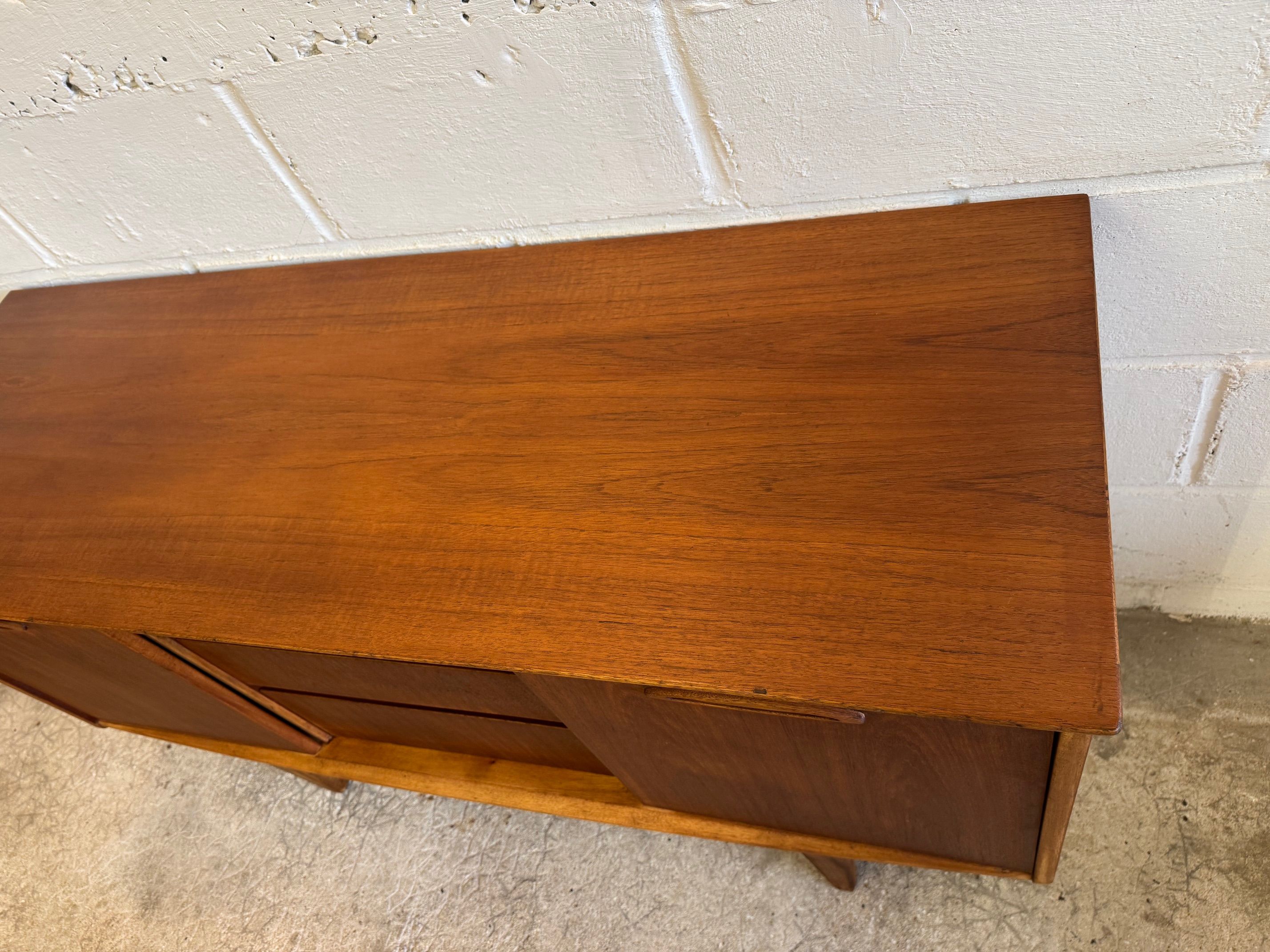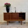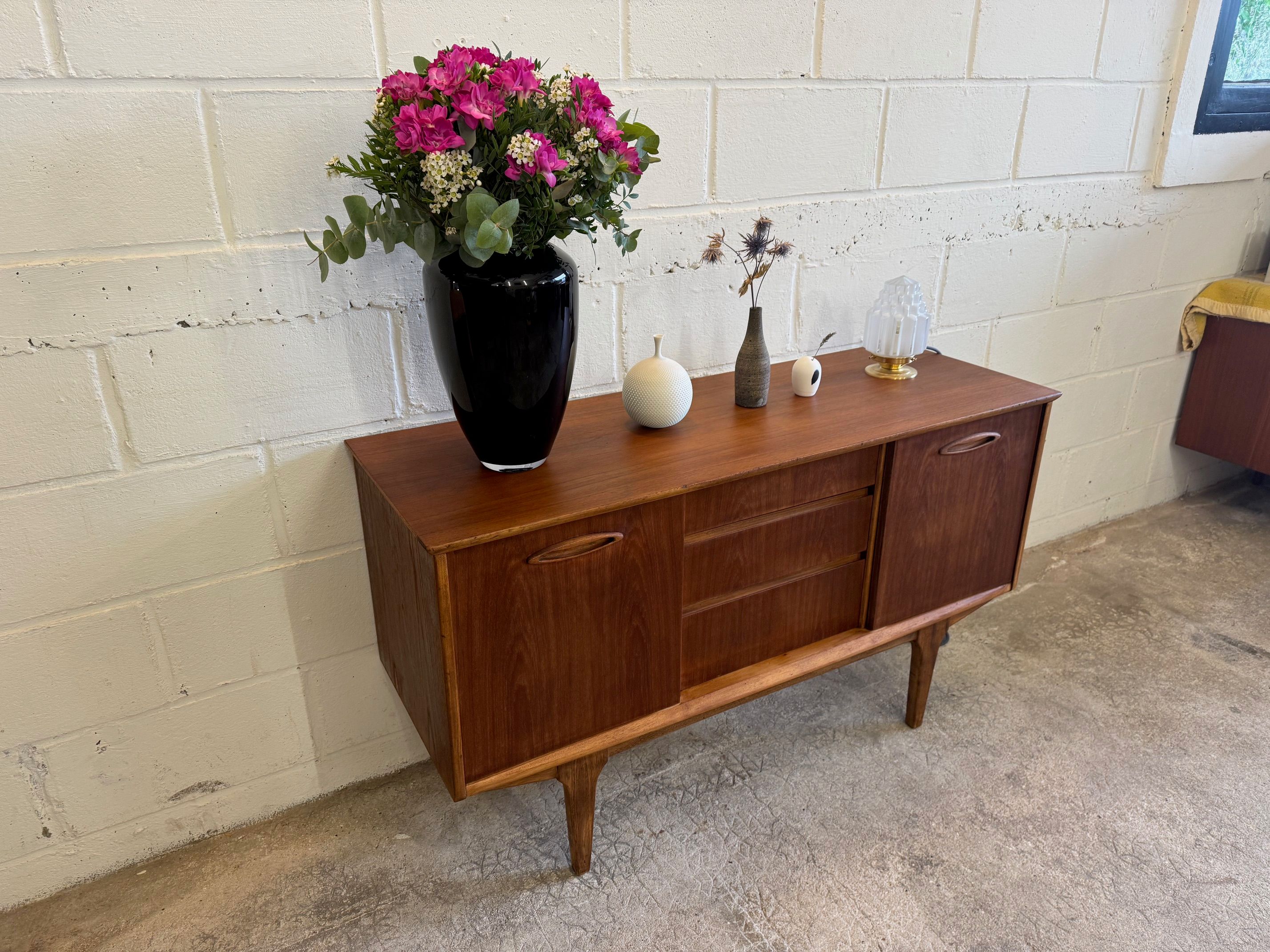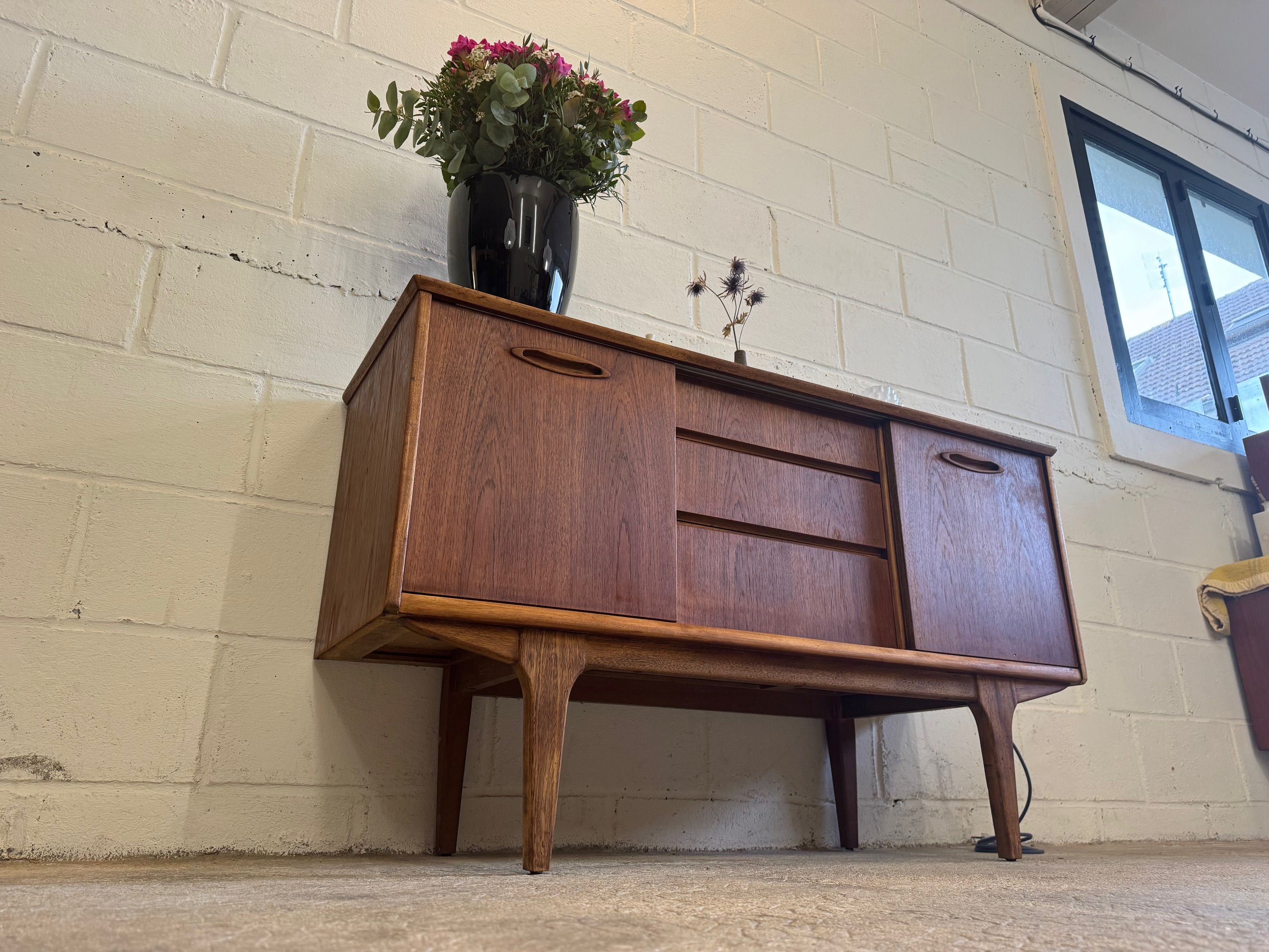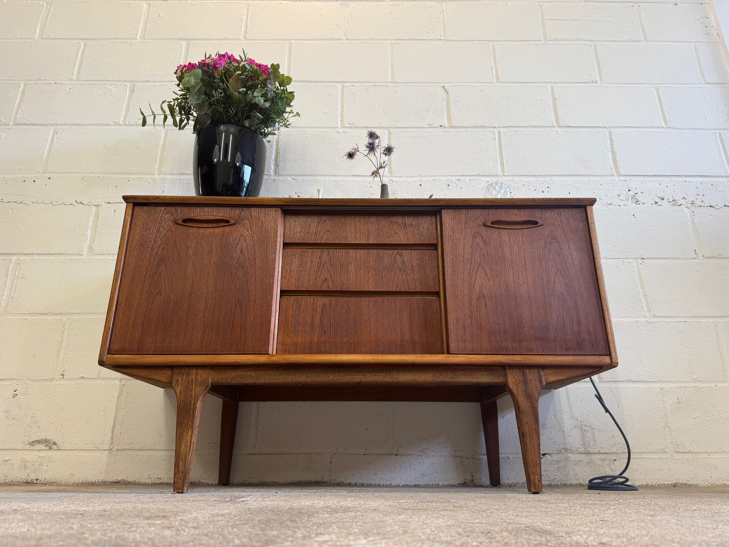 Une belle enfilade scandinave en teck, à portes coulissantes. Modèle aux dimensions idéales pour les petits espaces, édité par Jentique au Royaume-Uni dans les années 60.