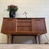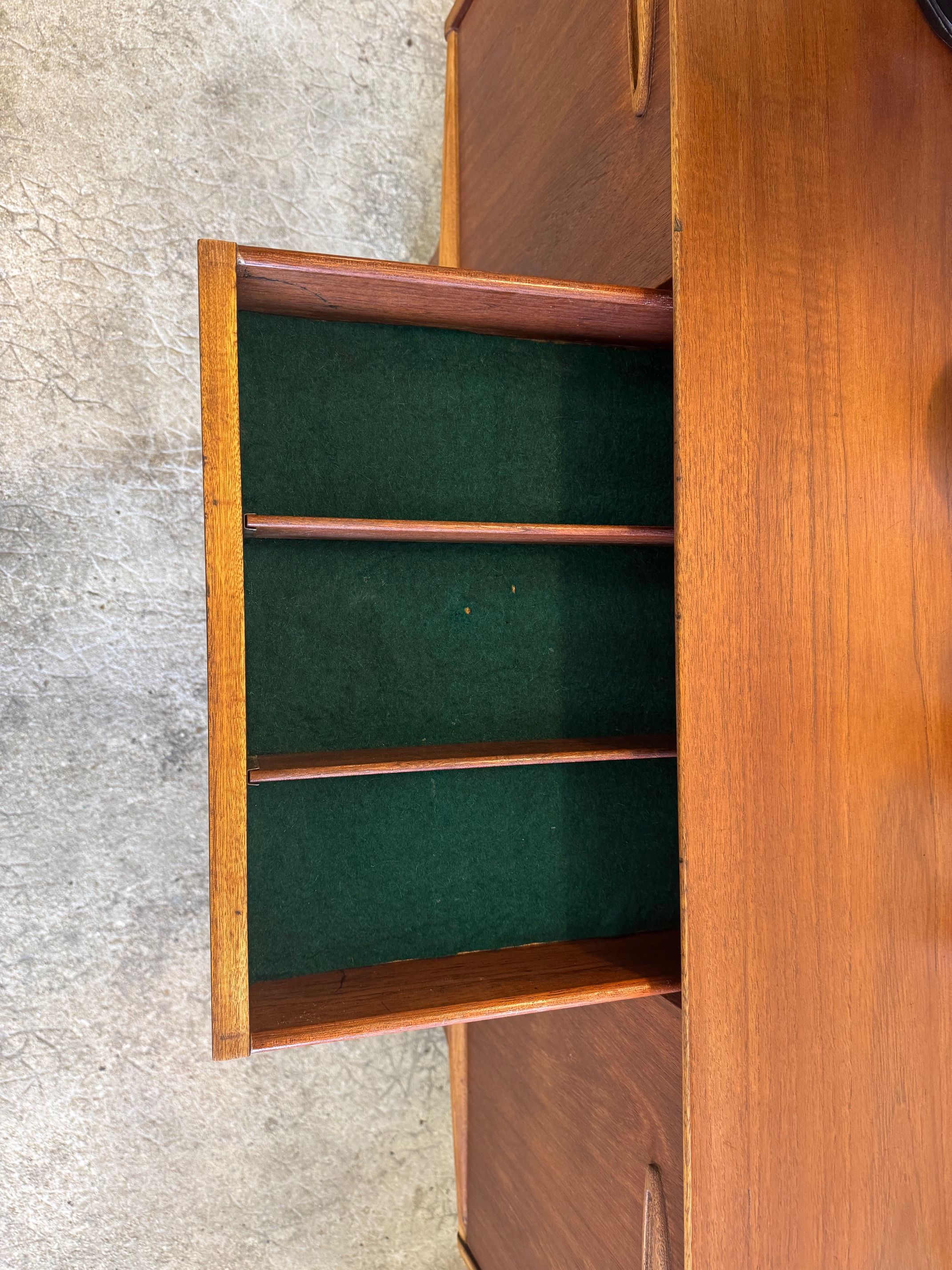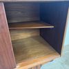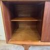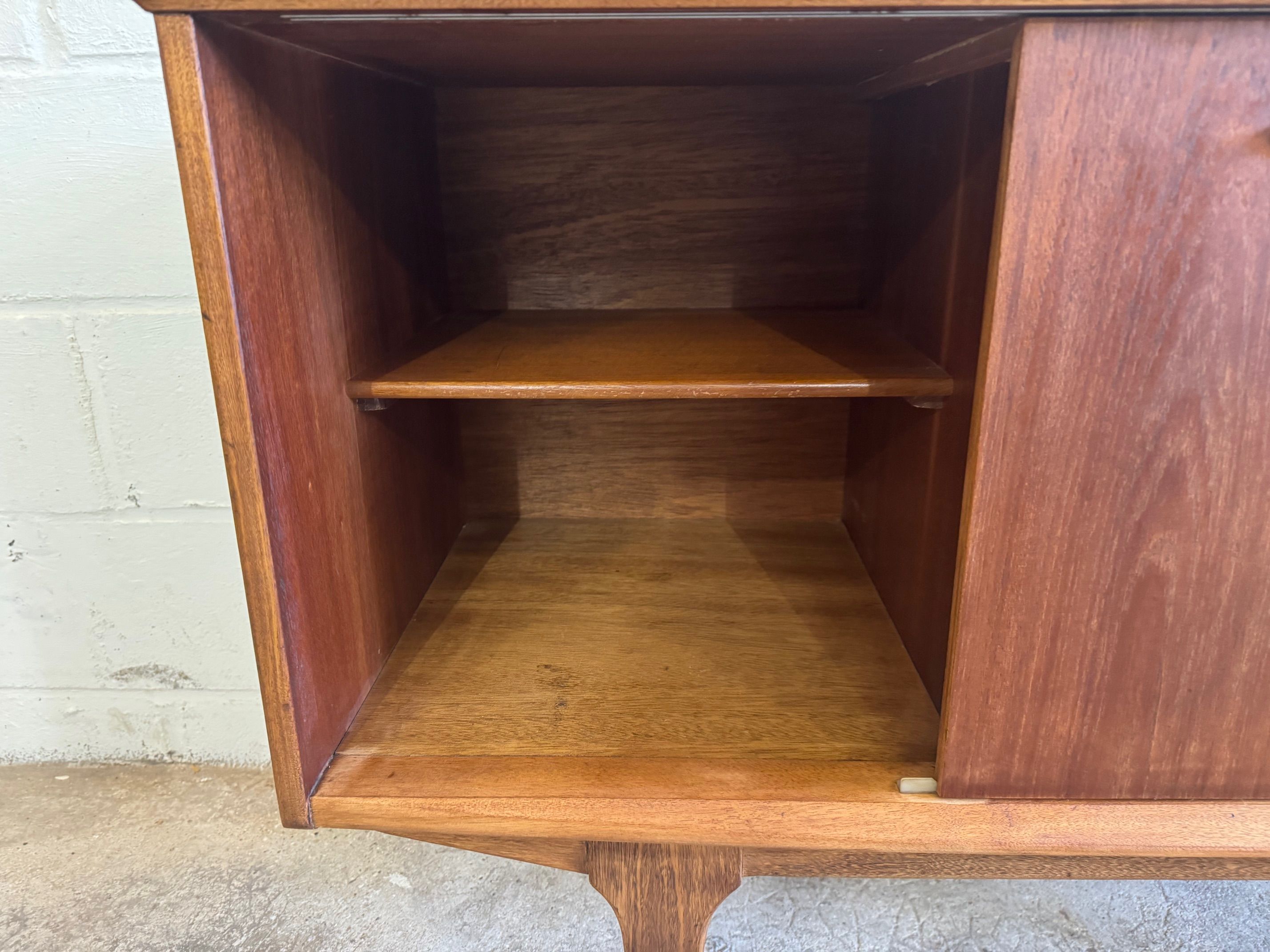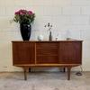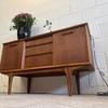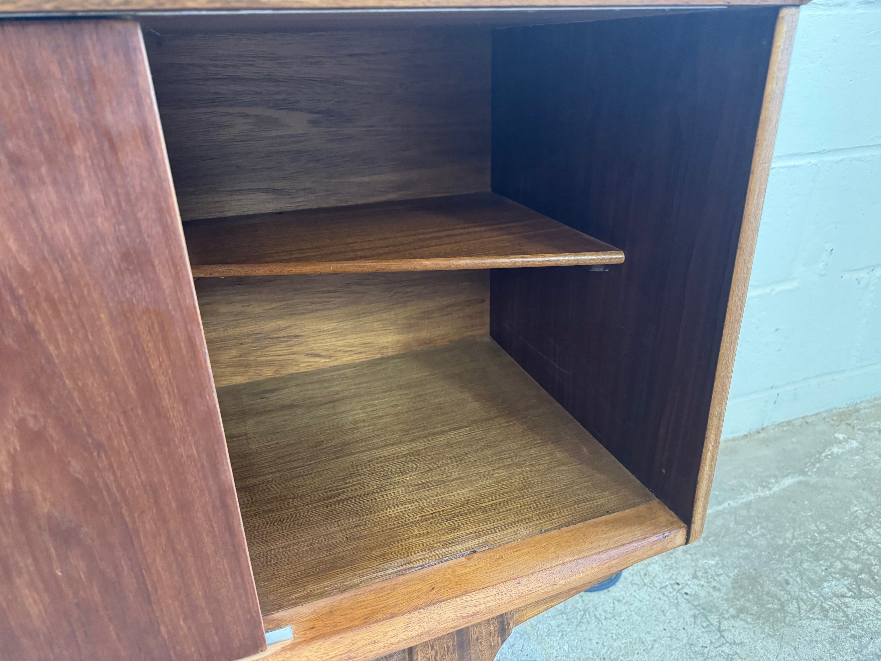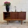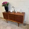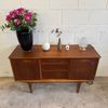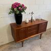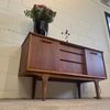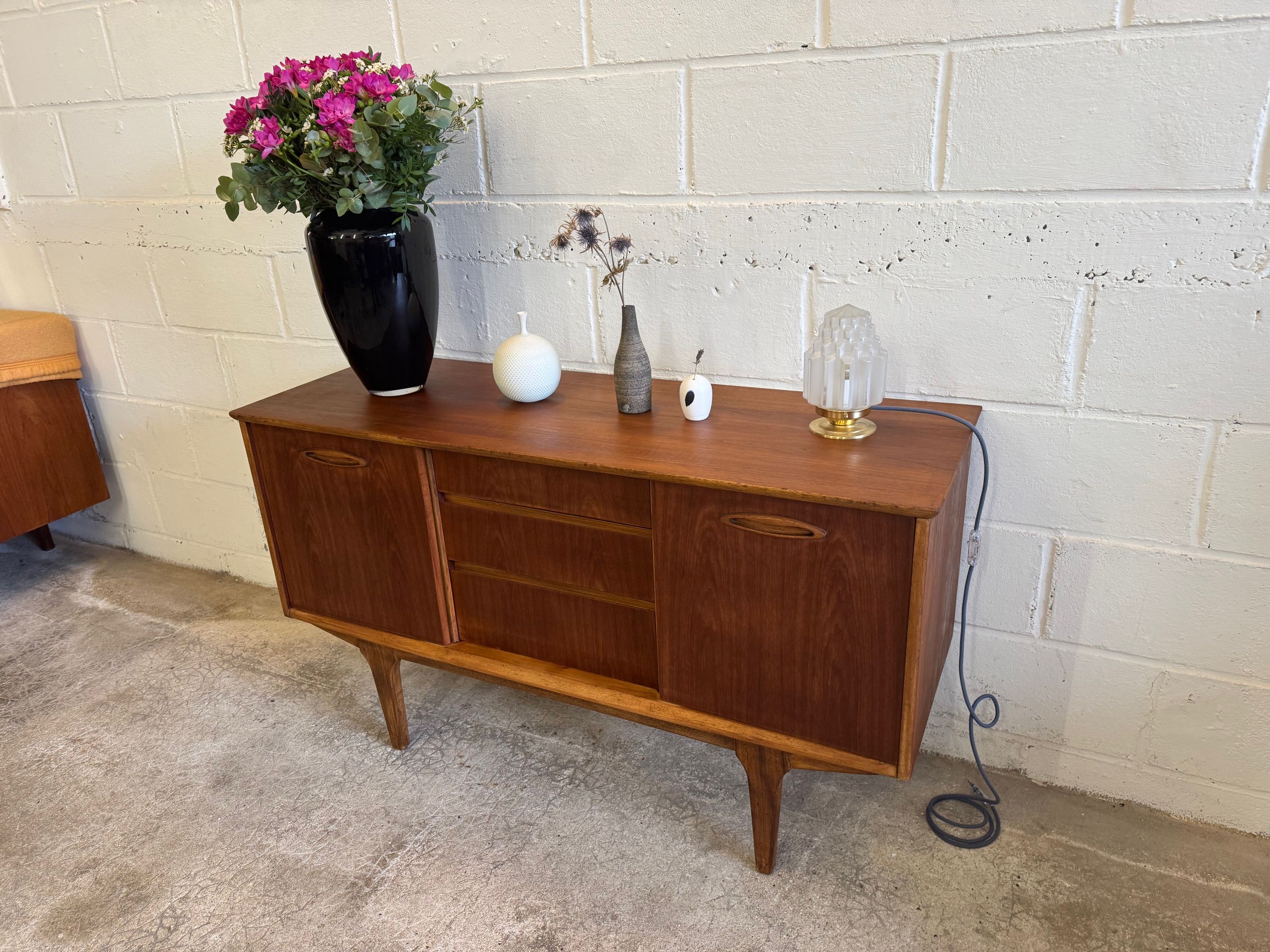 Une belle enfilade scandinave en teck, à portes coulissantes. Modèle aux dimensions idéales pour les petits espaces, édité par Jentique au Royaume-Uni dans les années 60.