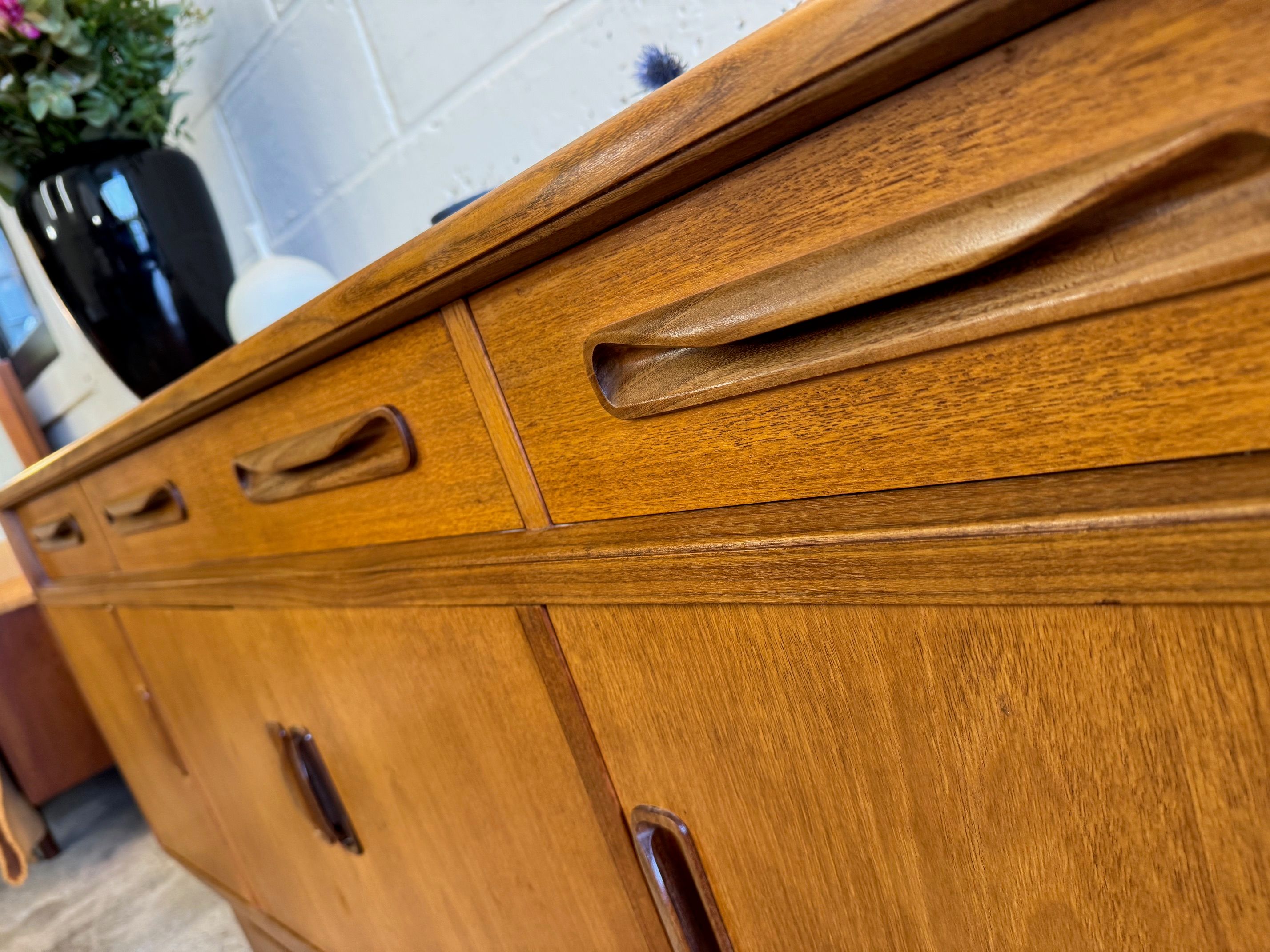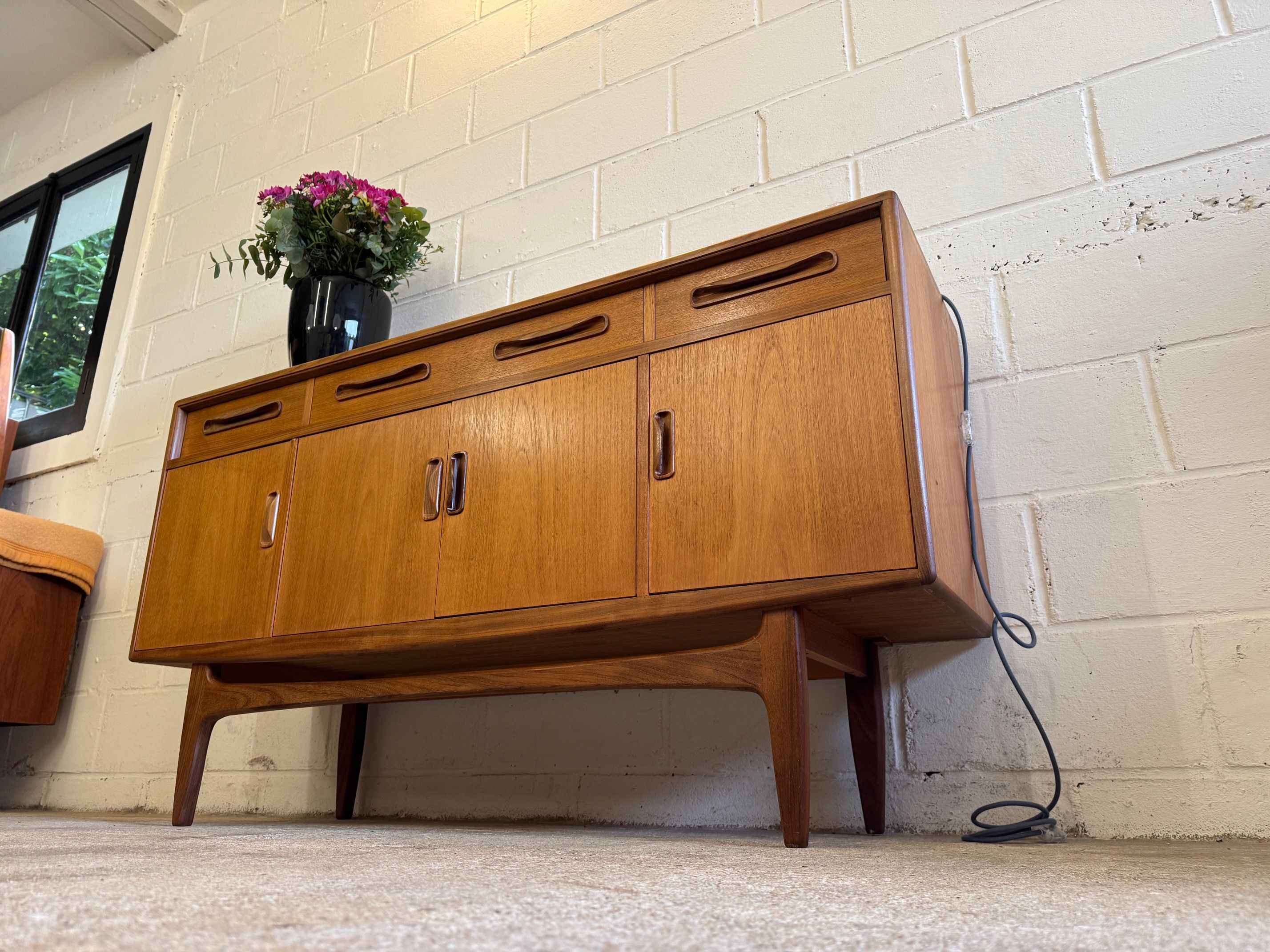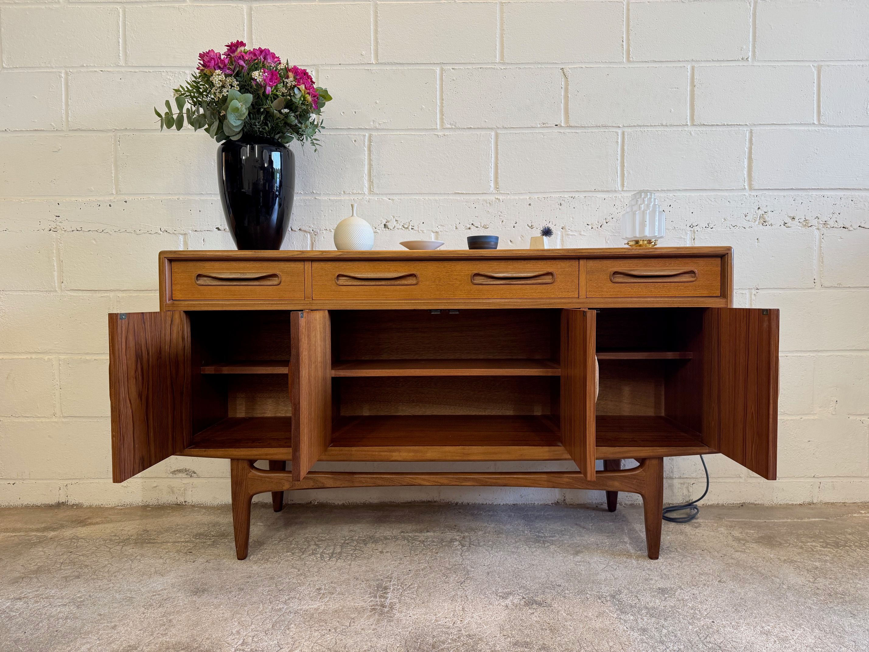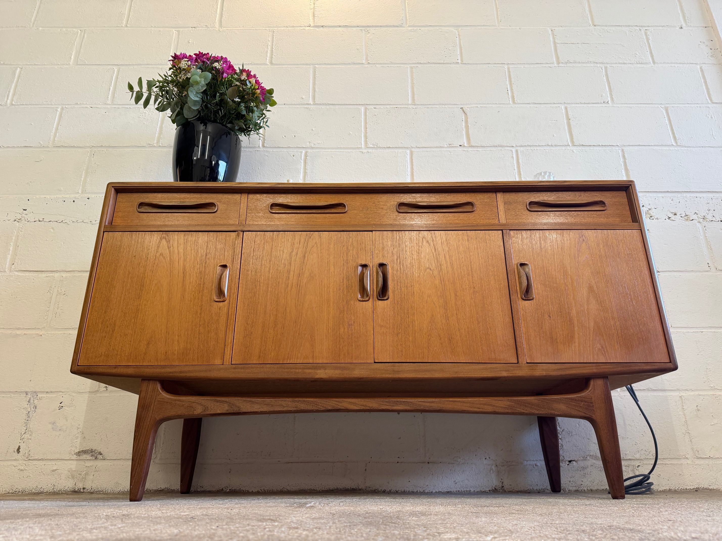 Une belle enfilade scandinave en teck, éditée en Angleterre dans les années 60 par G-Plan. Modèle Fresco de Victor Wilkins. Elle offre une bonne capacité de rangement.