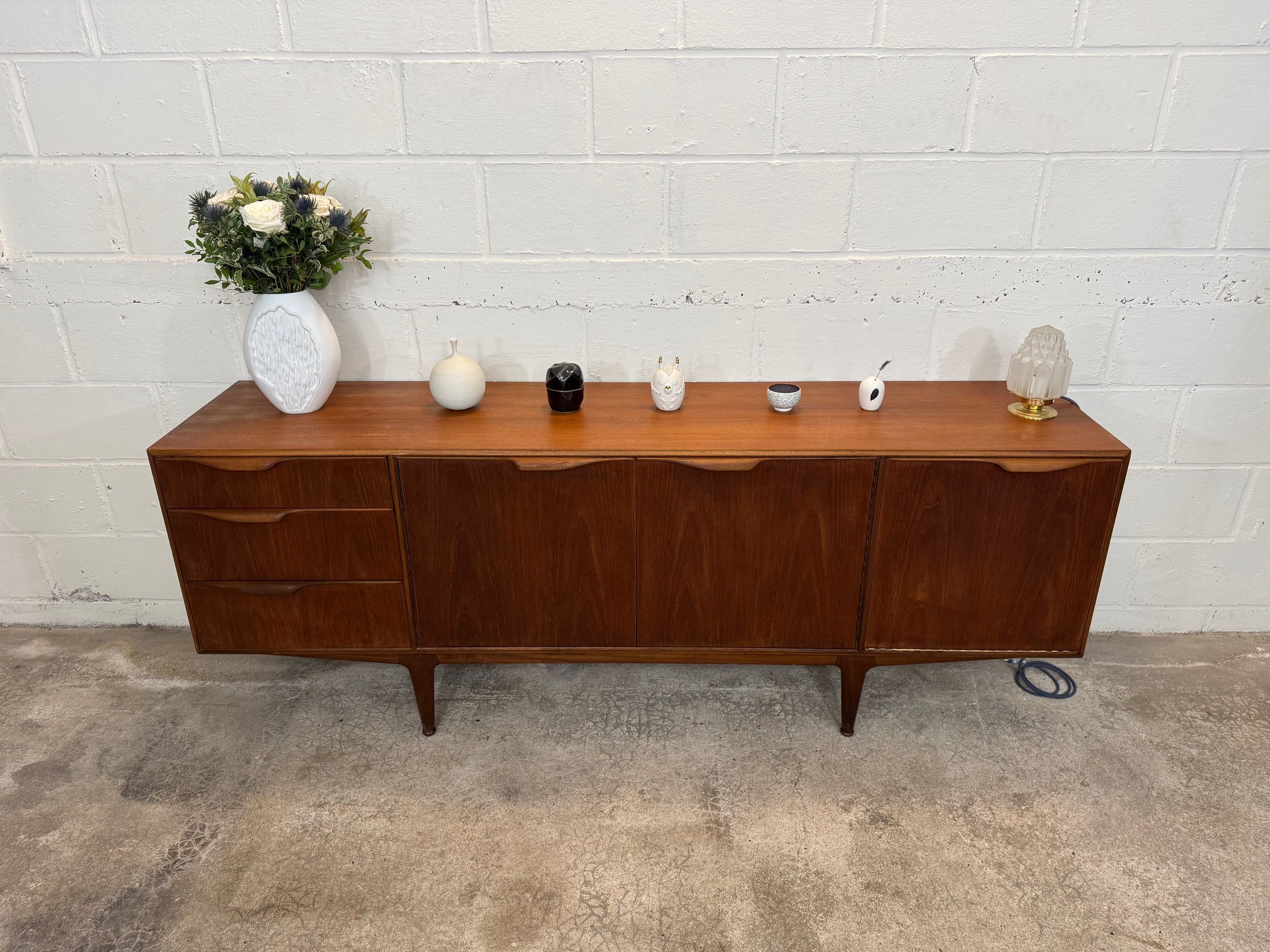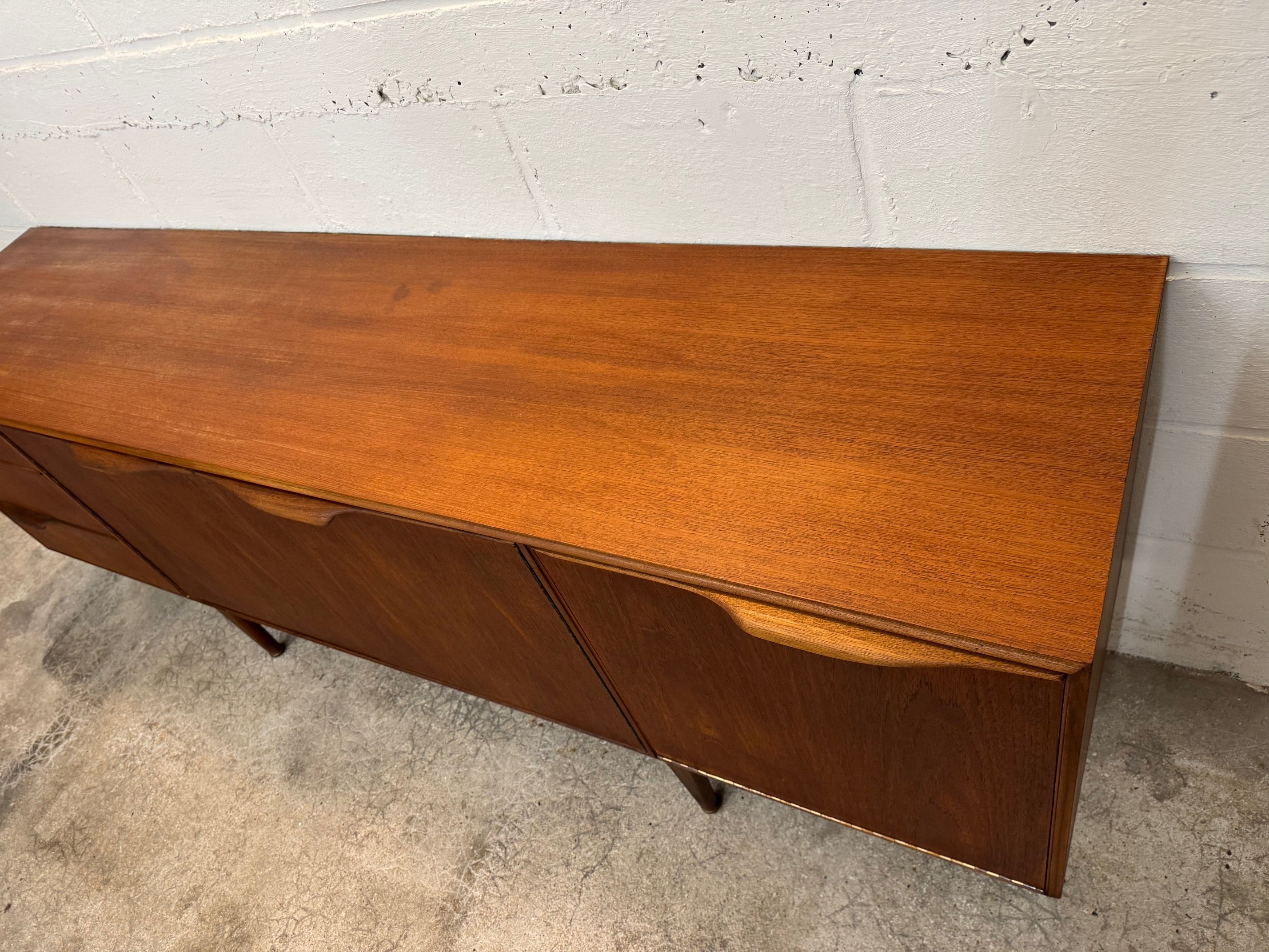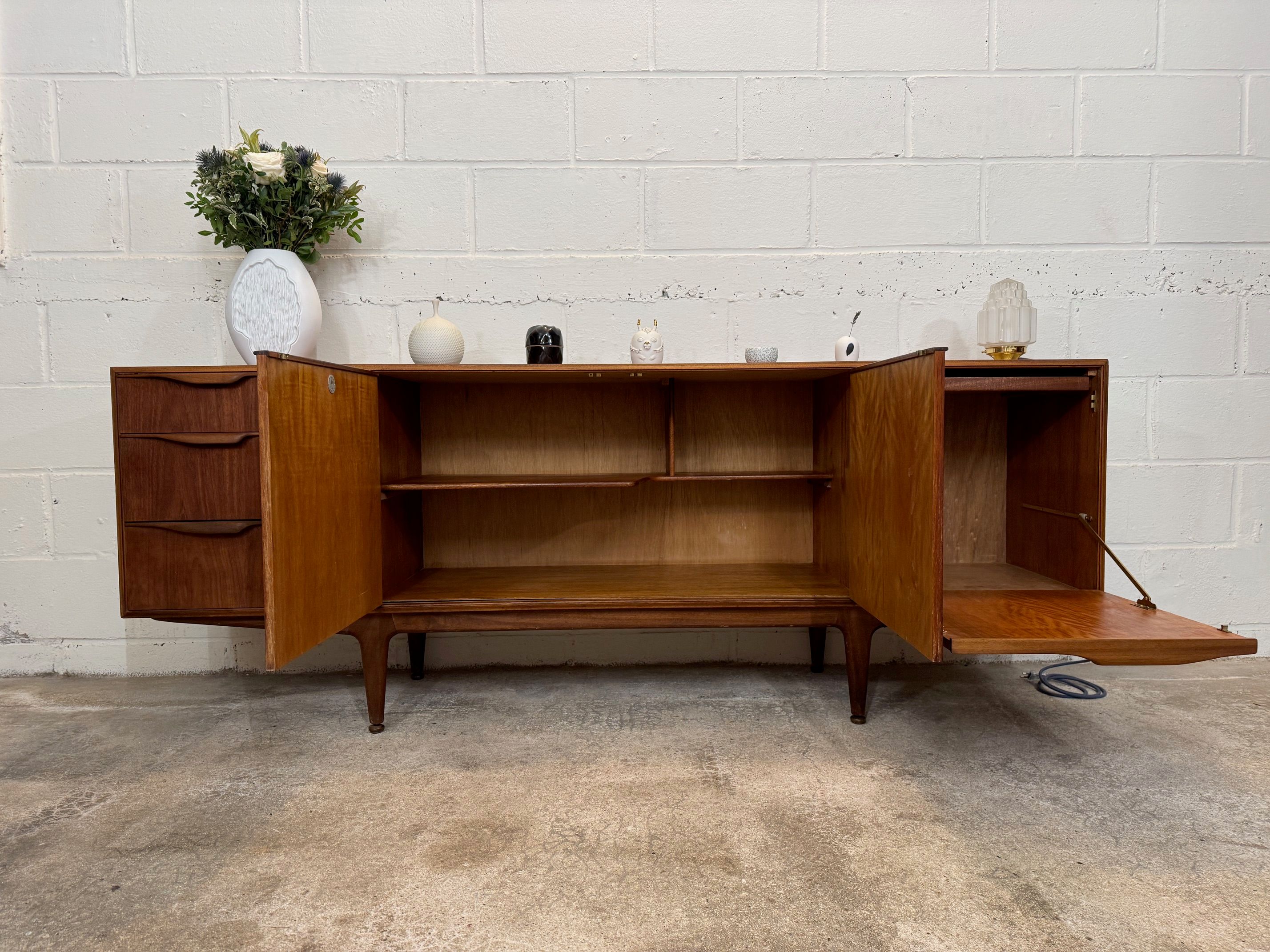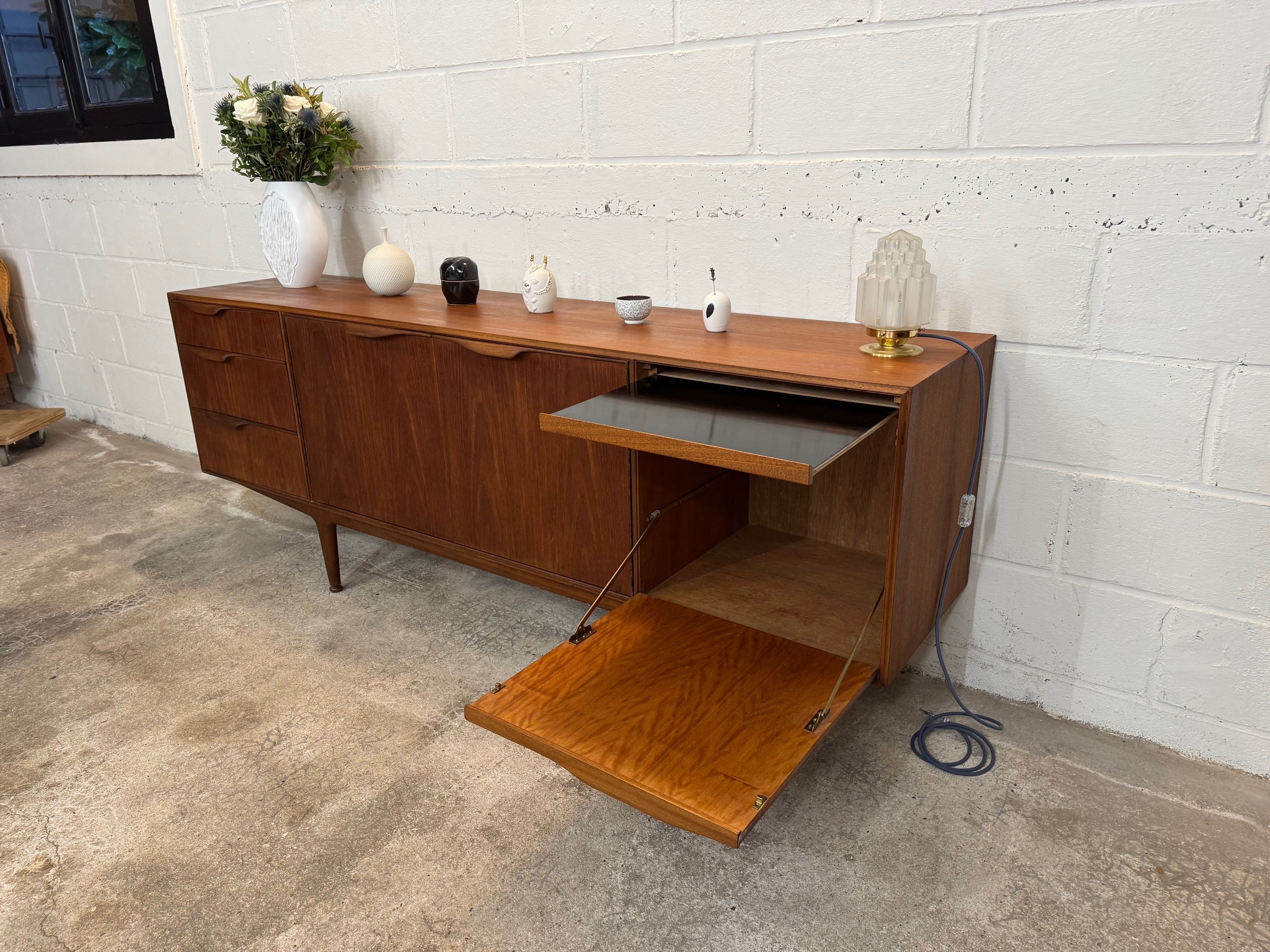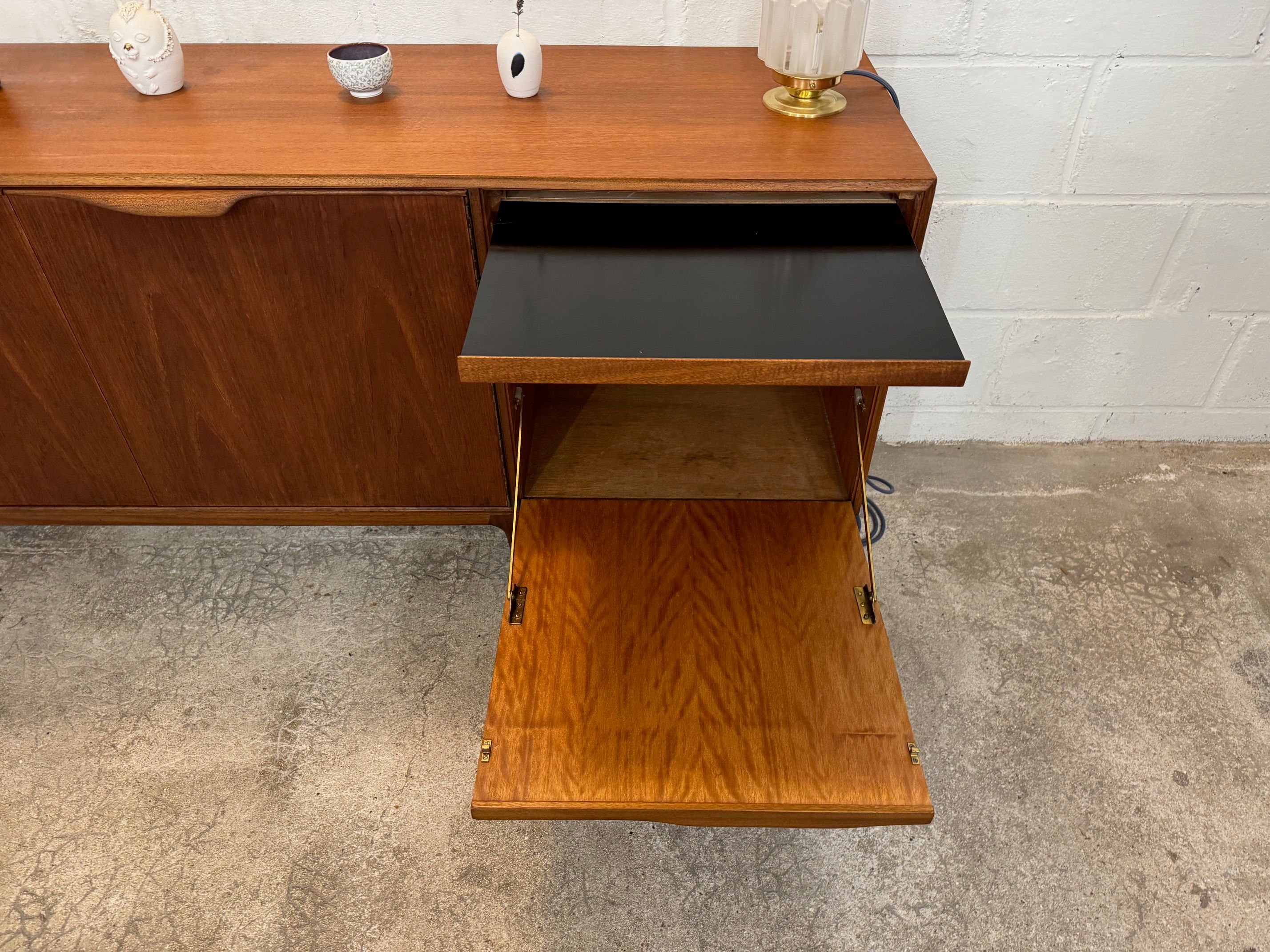 Une belle enfilade scandinave en teck, éditée par McIntosh au Royaume-Uni dans les années 60. Modèle Dunvegan disposant d'un espace bar avec une tablette de service coulissante. (Estampillée)