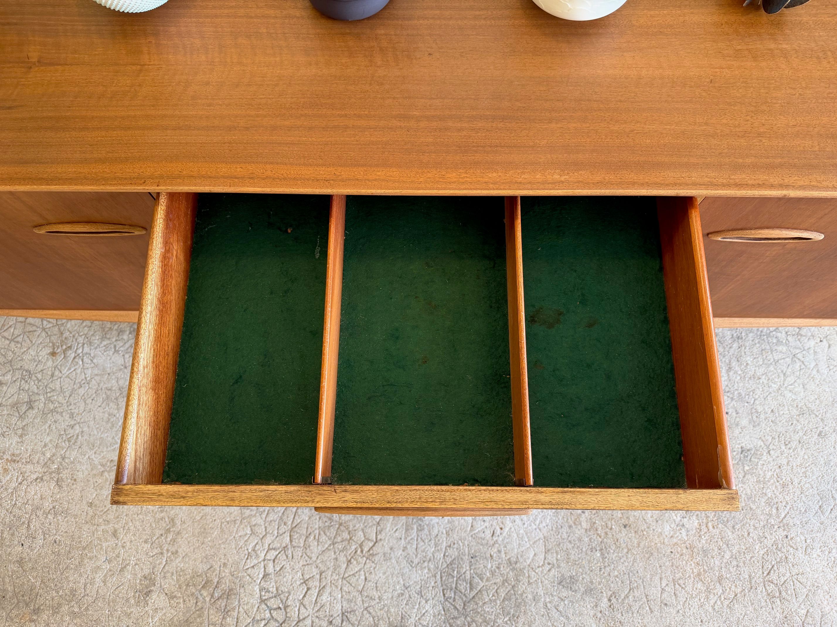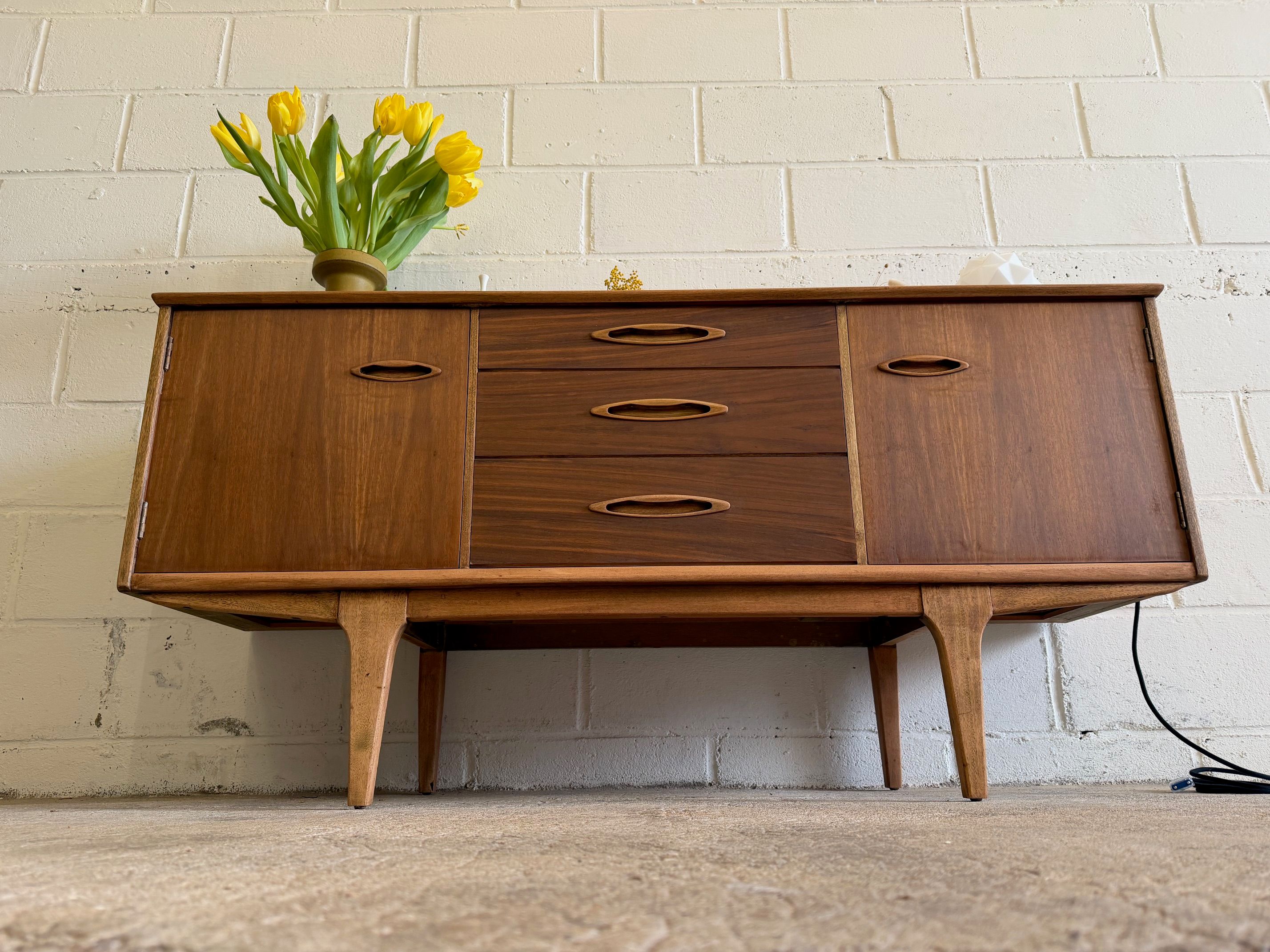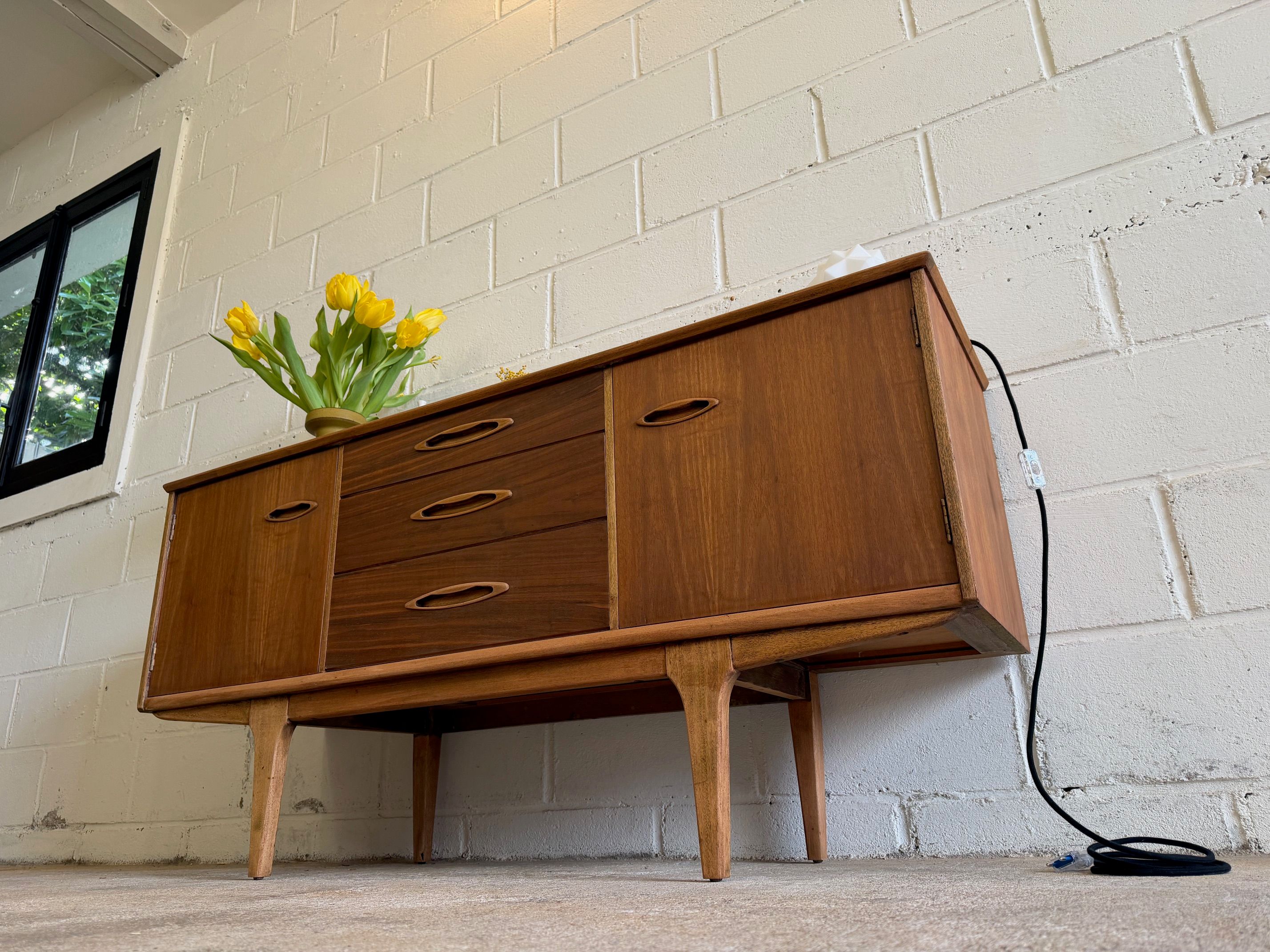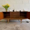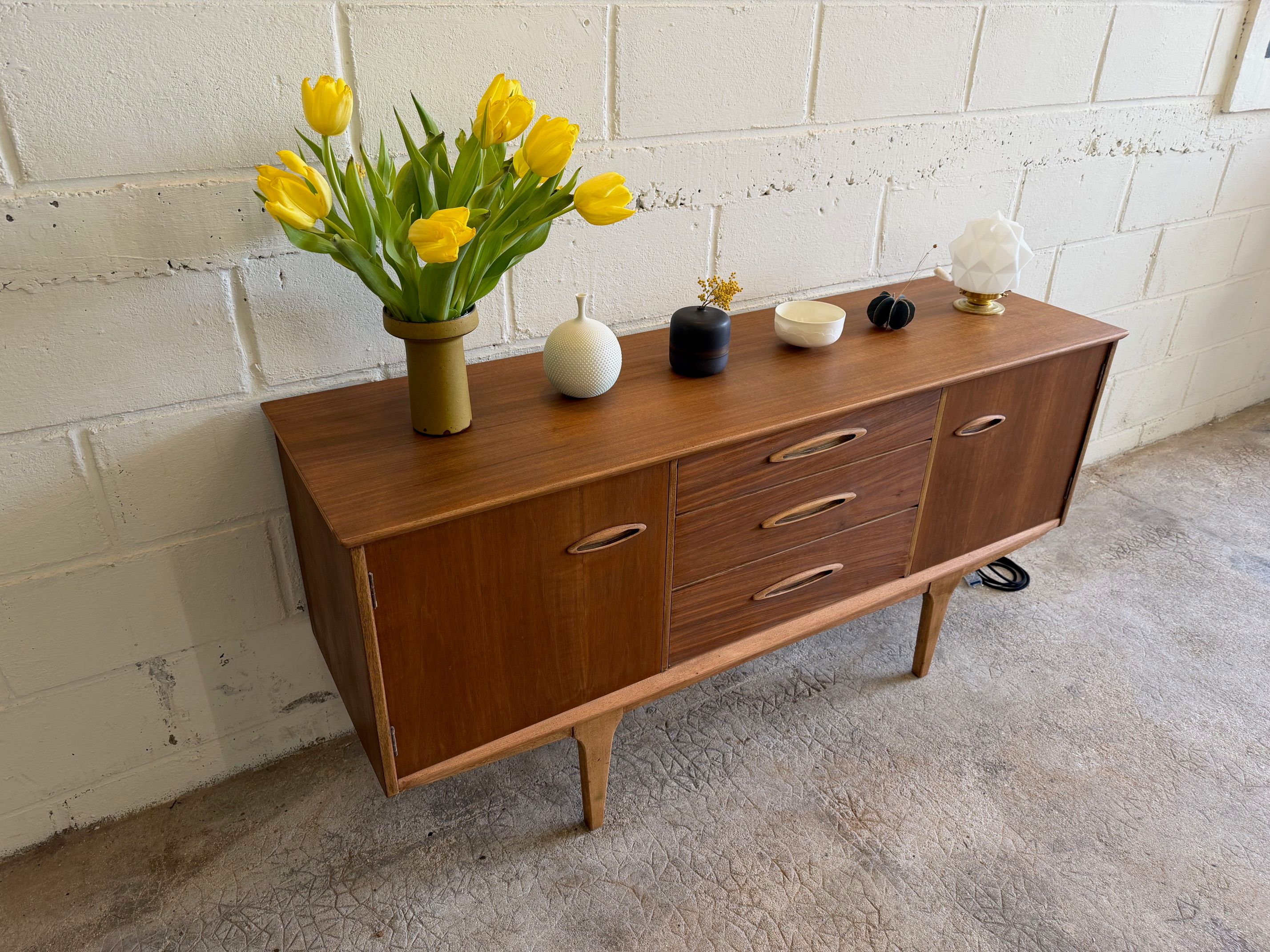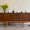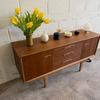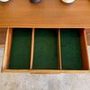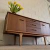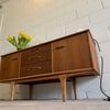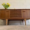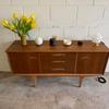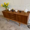 Une enfilade en teck mat, éditée par Jentique au Royaume-Uni dans les années 60. Modèle classique disposant de 3 tiroirs et de 2 espaces de rangement avec étagère.
