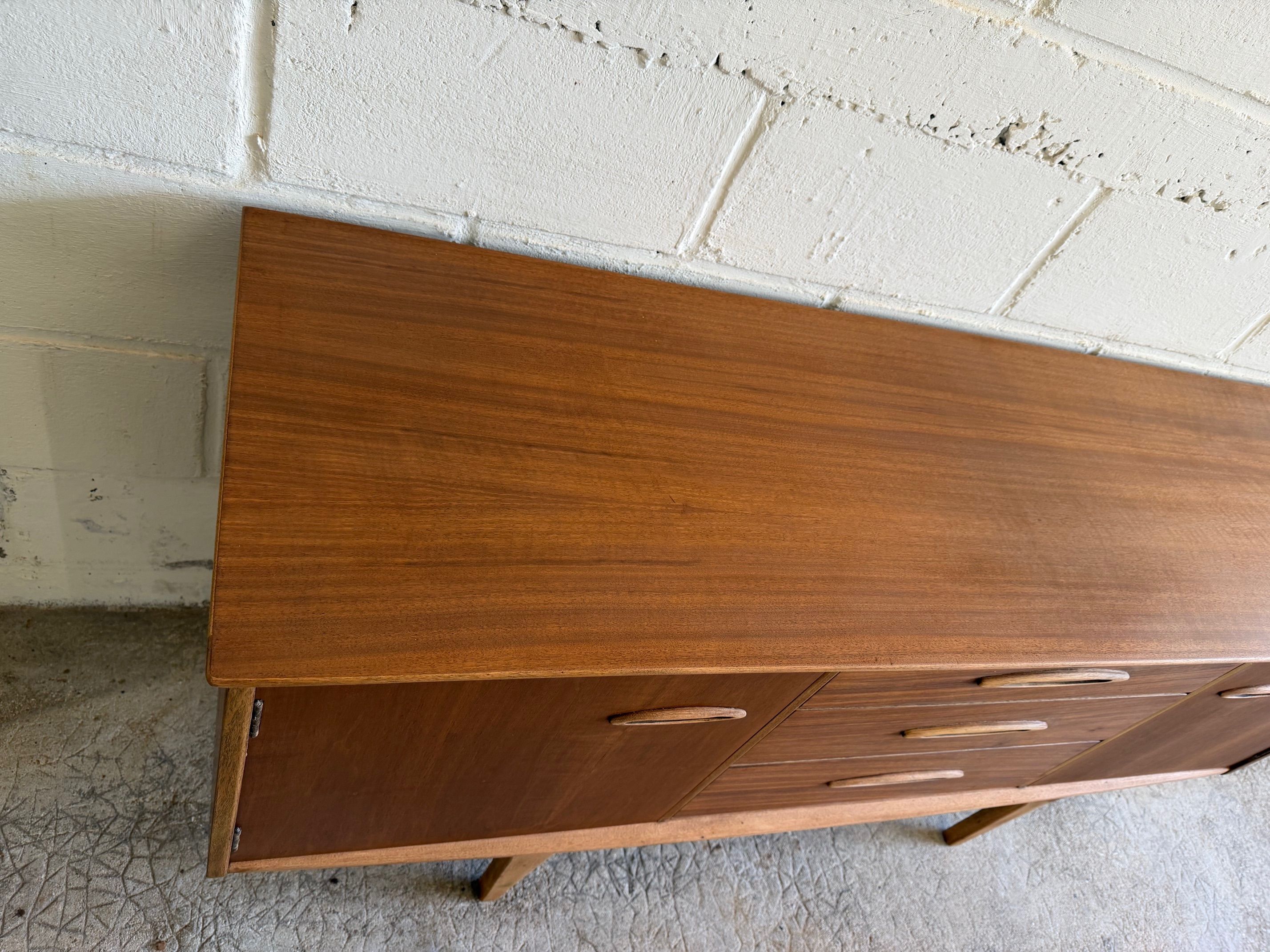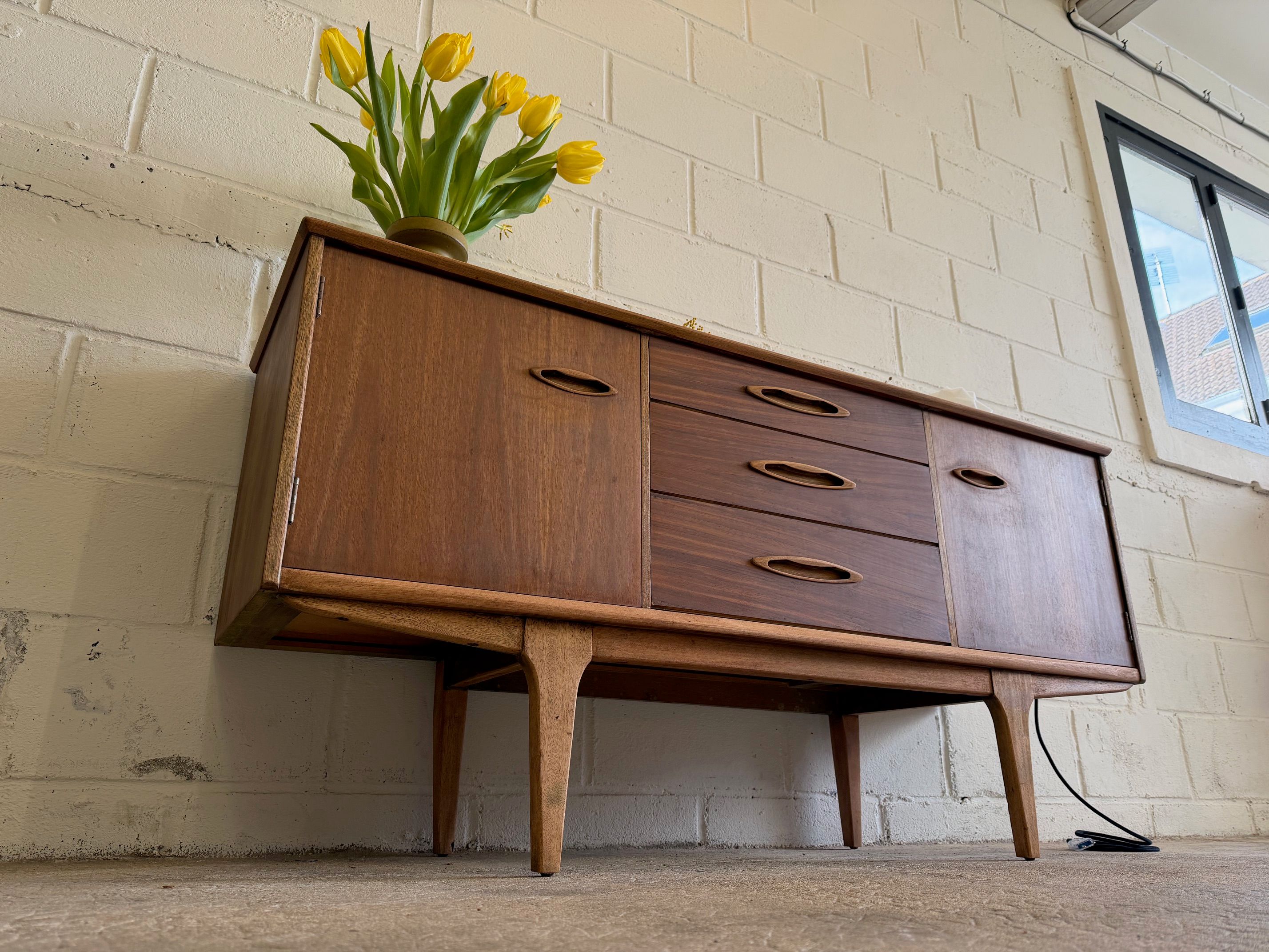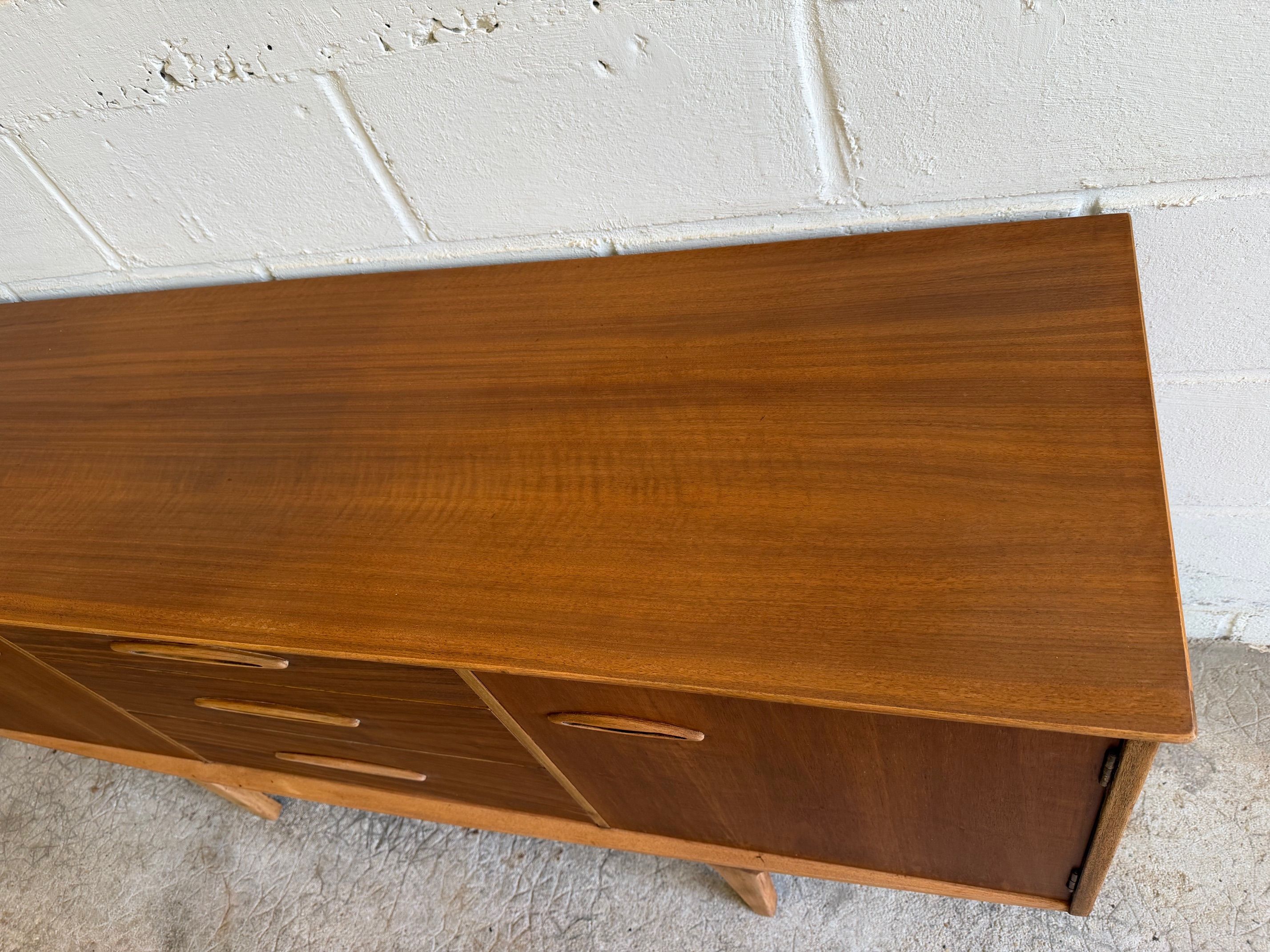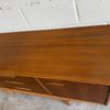Une enfilade en teck mat, éditée par Jentique au Royaume-Uni dans les années 60. Modèle classique disposant de 3 tiroirs et de 2 espaces de rangement avec étagère.