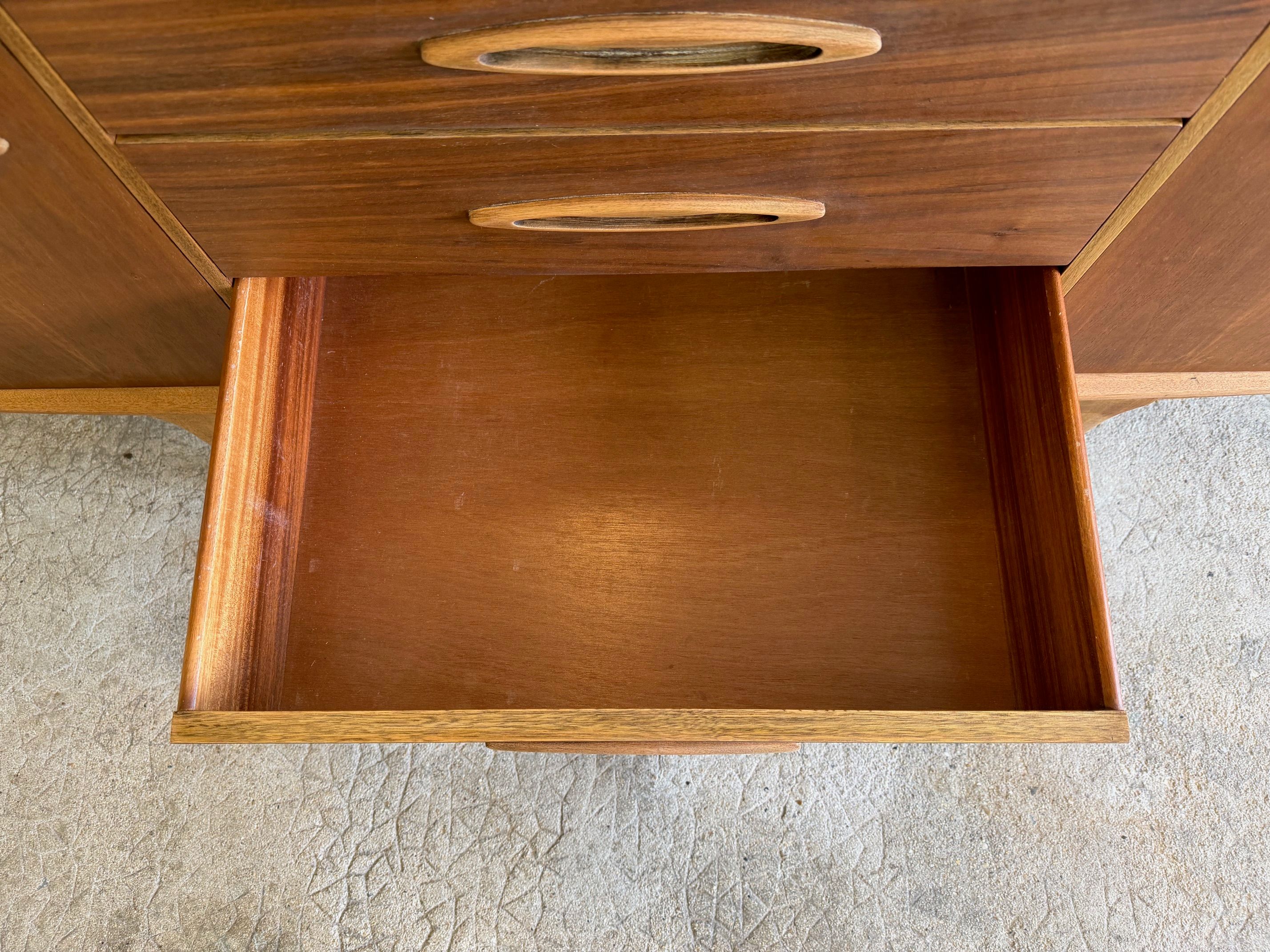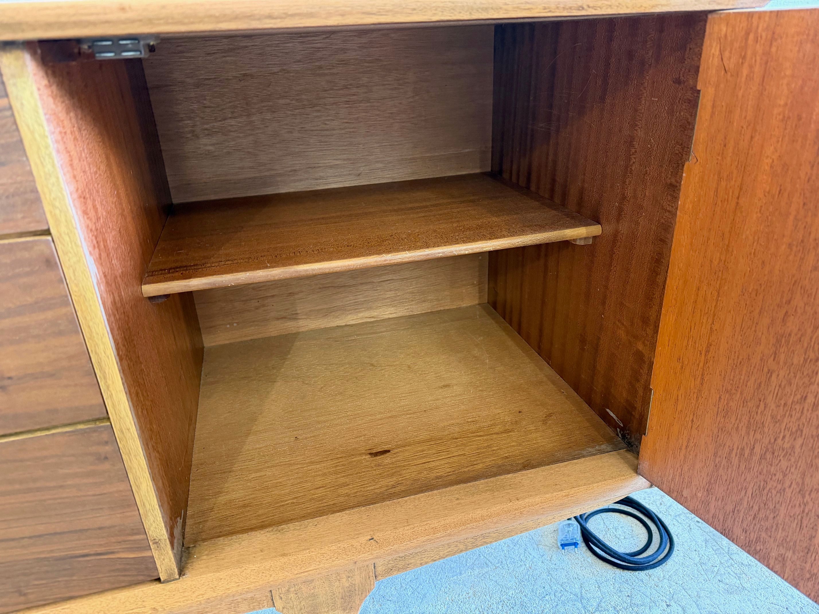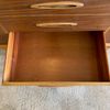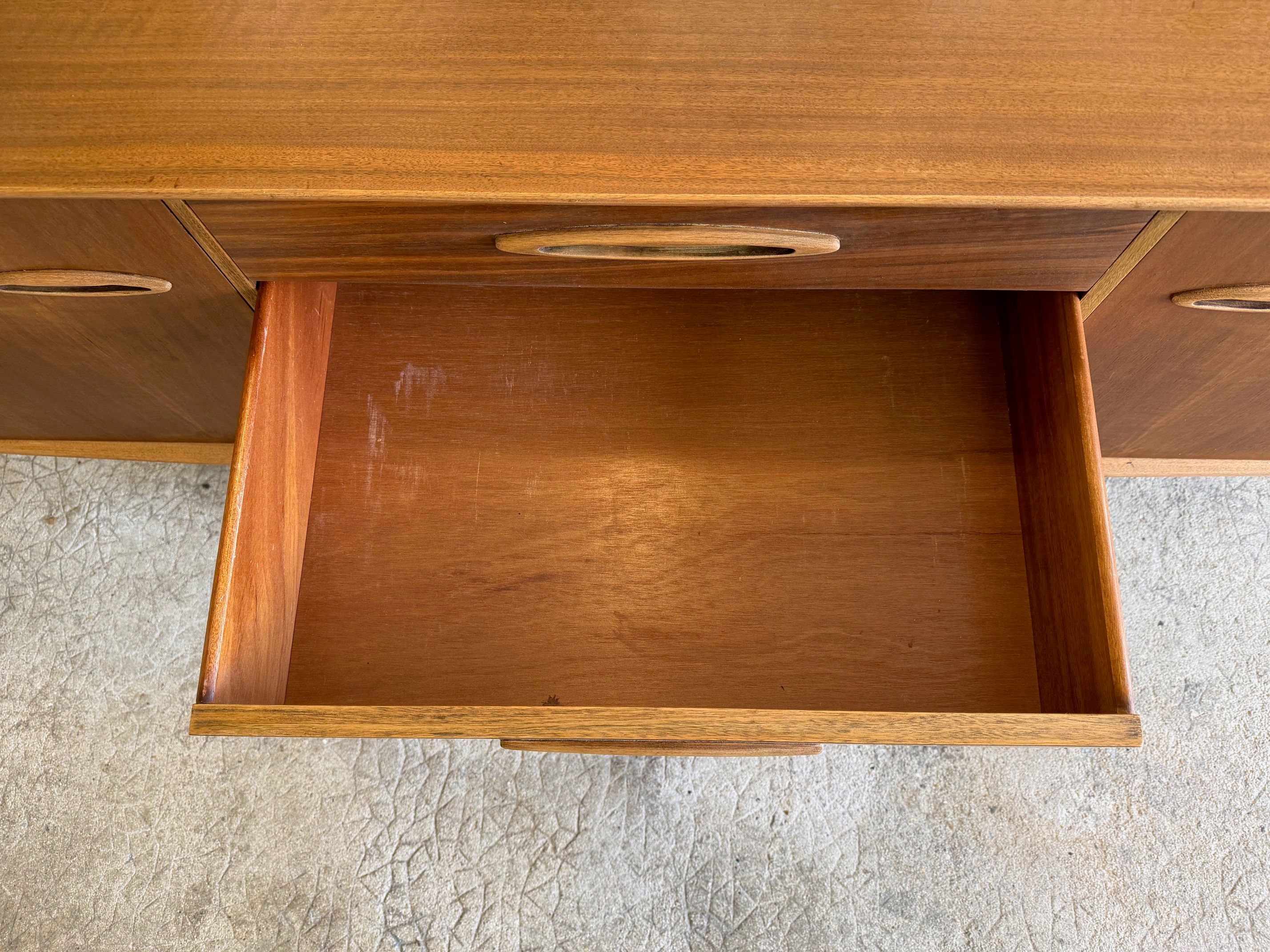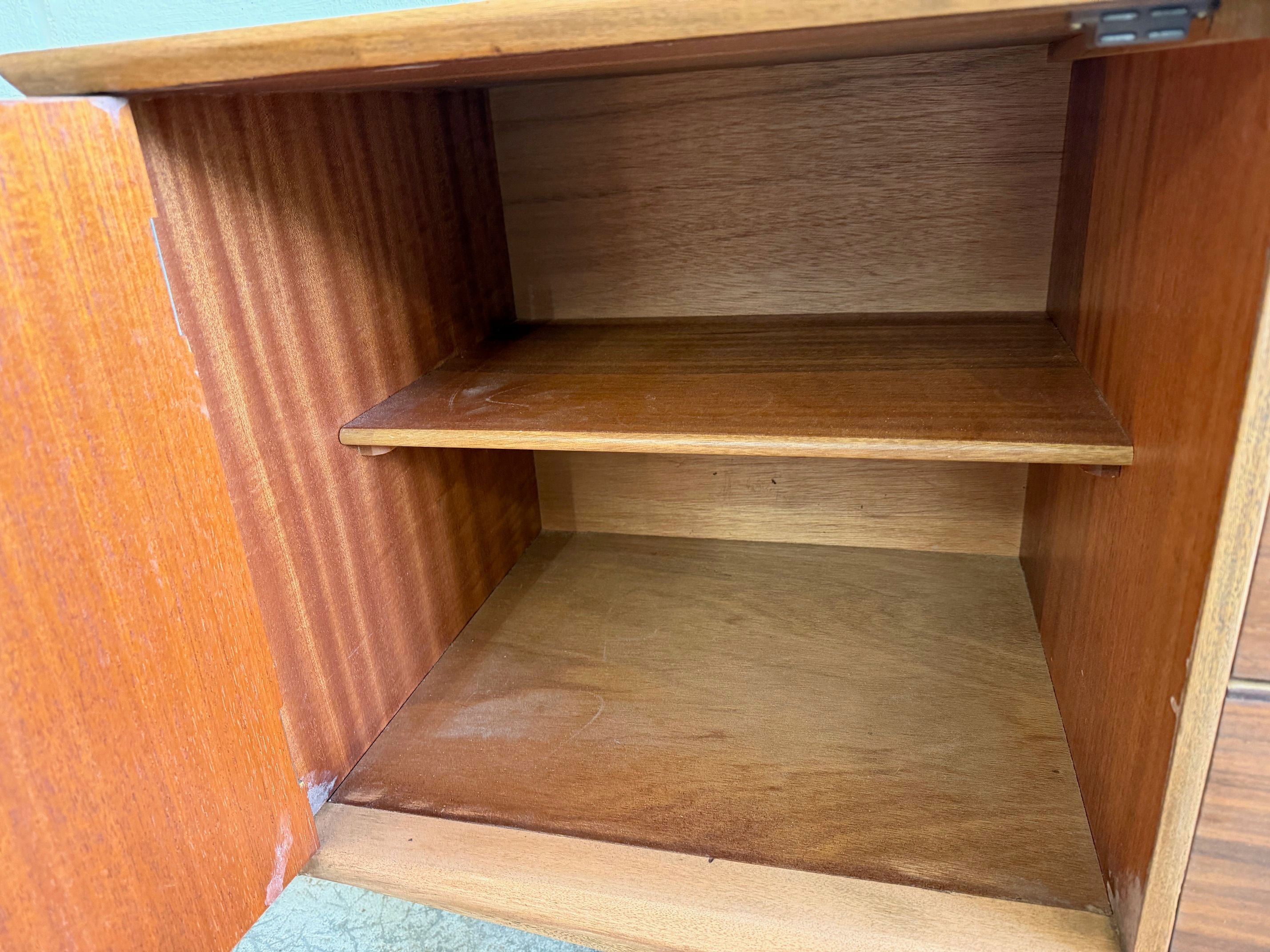 Une enfilade en teck mat, éditée par Jentique au Royaume-Uni dans les années 60. Modèle classique disposant de 3 tiroirs et de 2 espaces de rangement avec étagère.