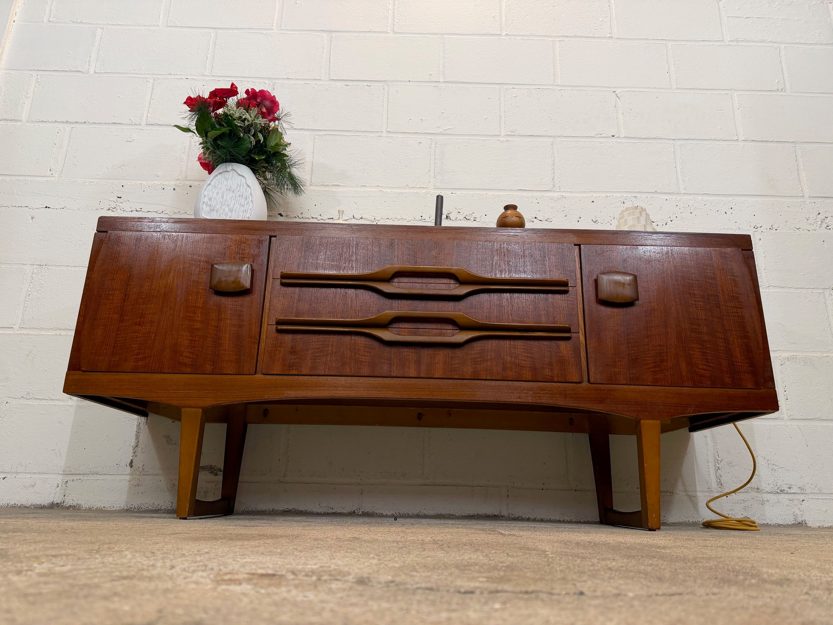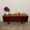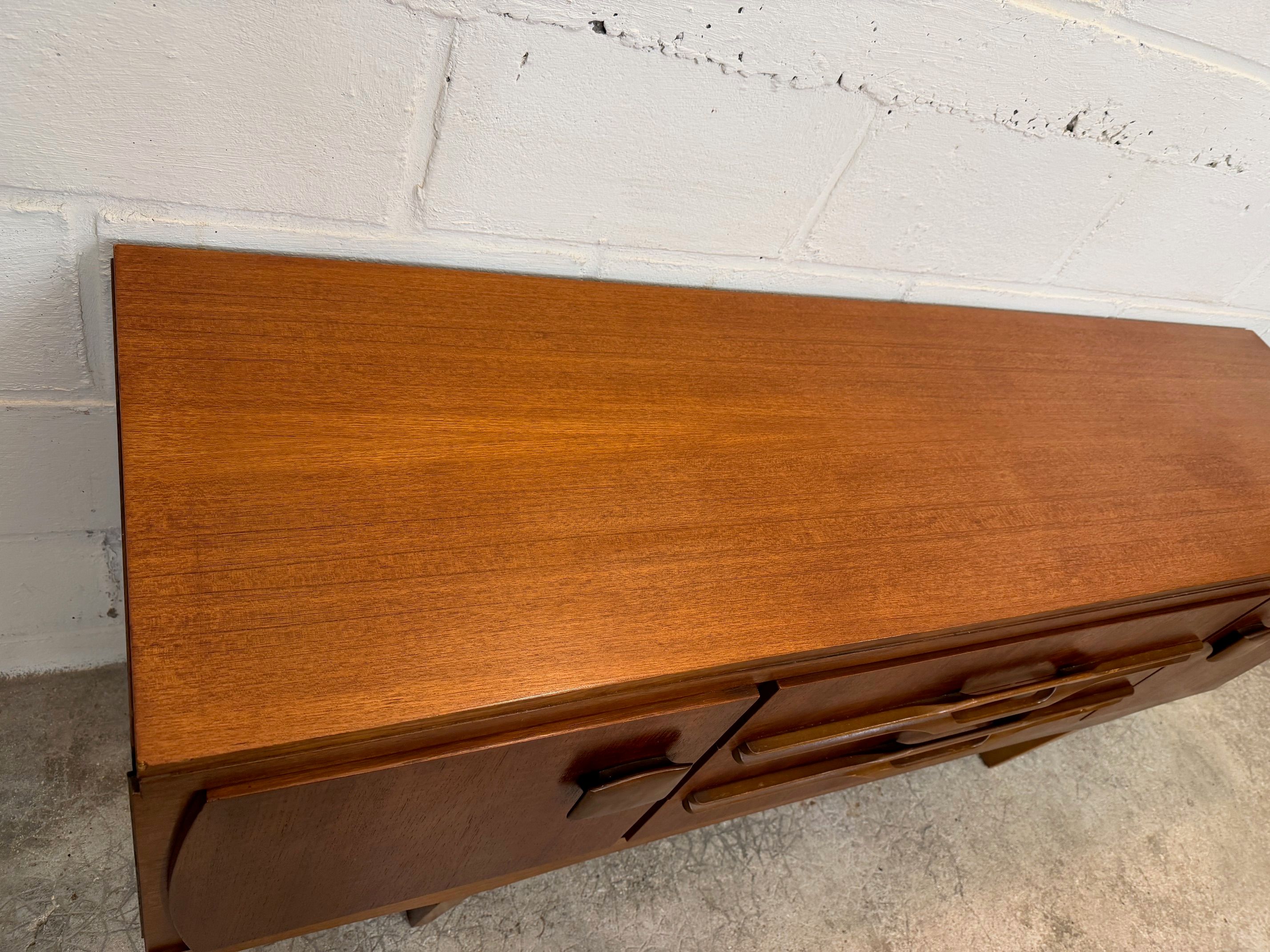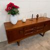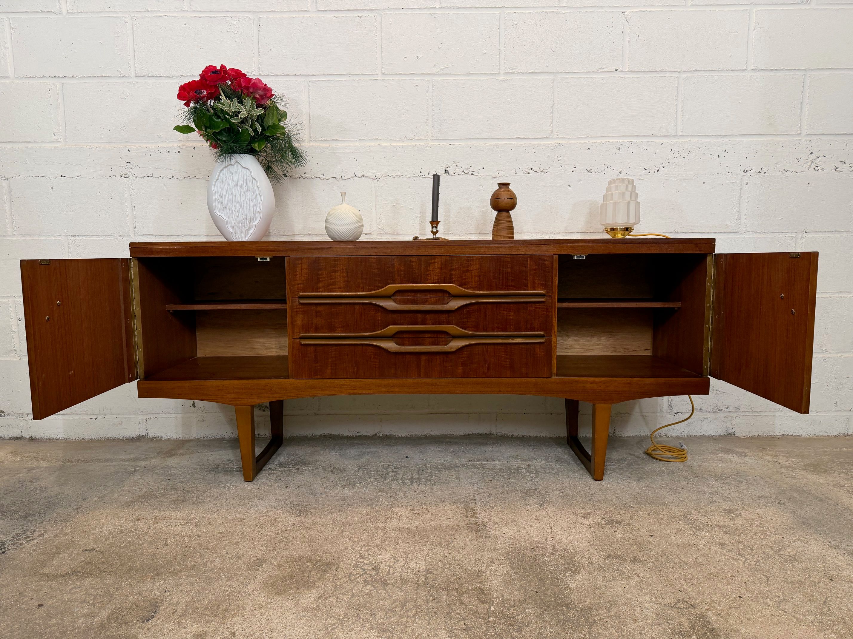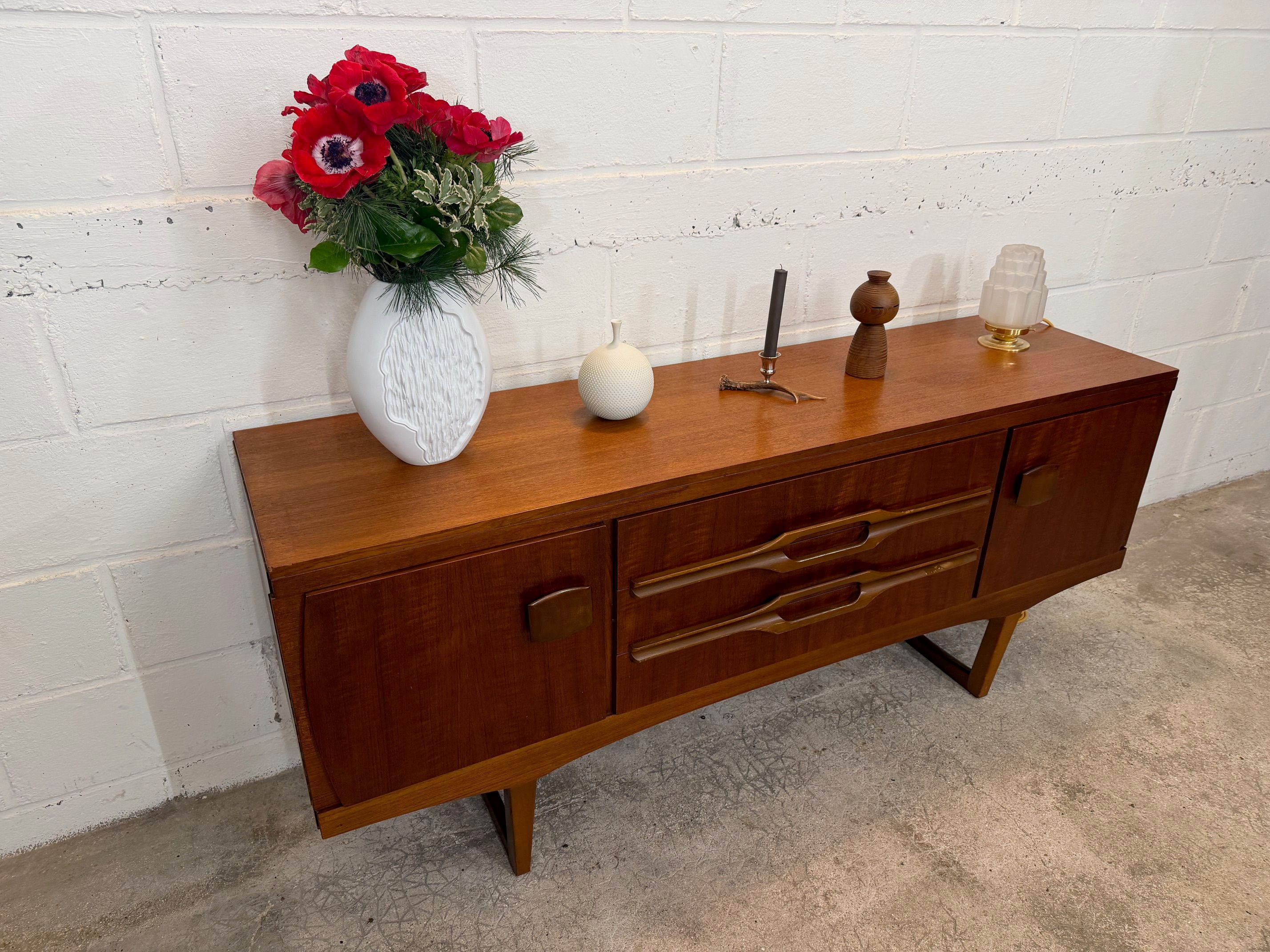 Une enfilade en teck, Angleterre dans les années 60. Elle dispose de deux espaces de rangements et de trois tiroirs.