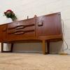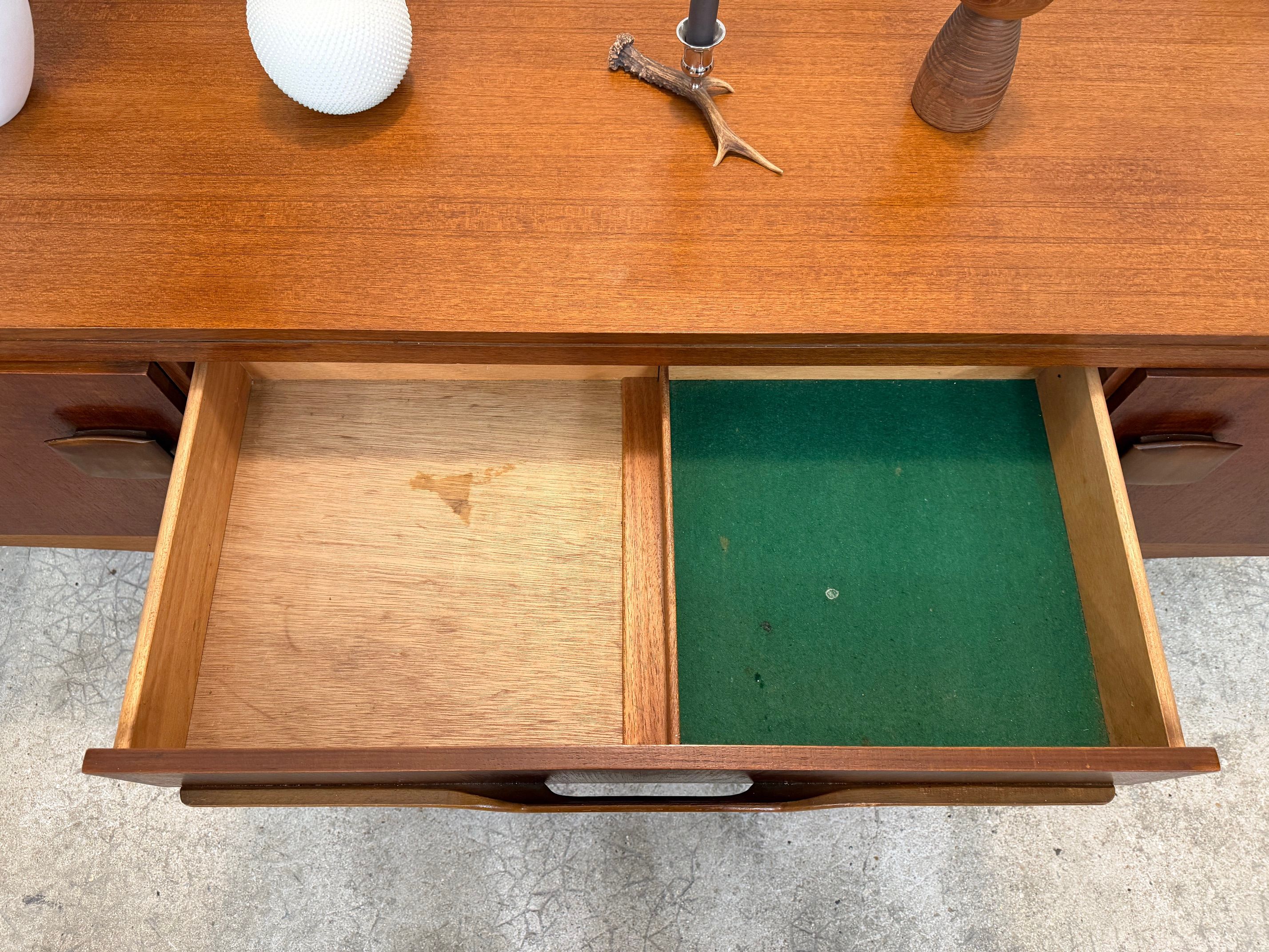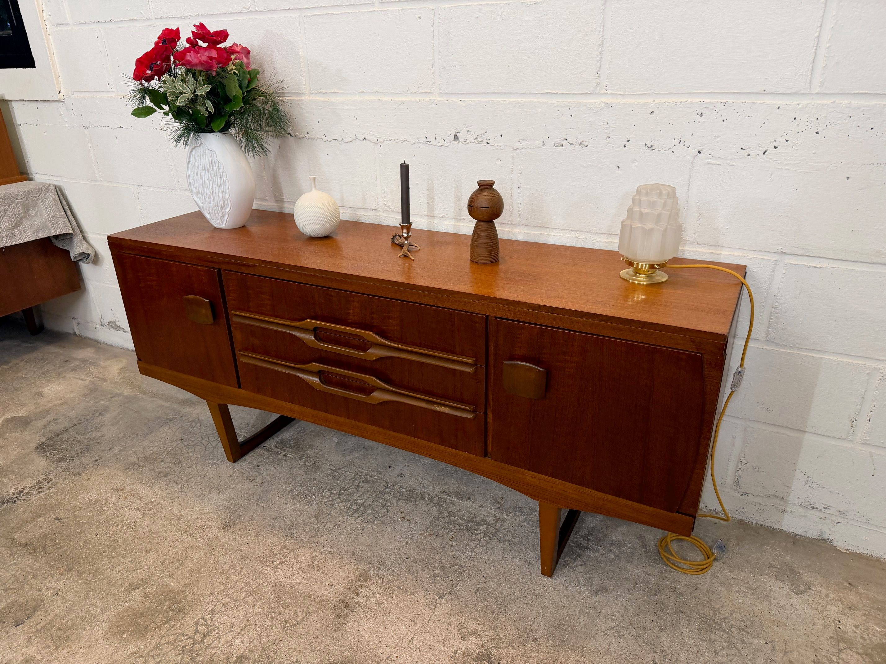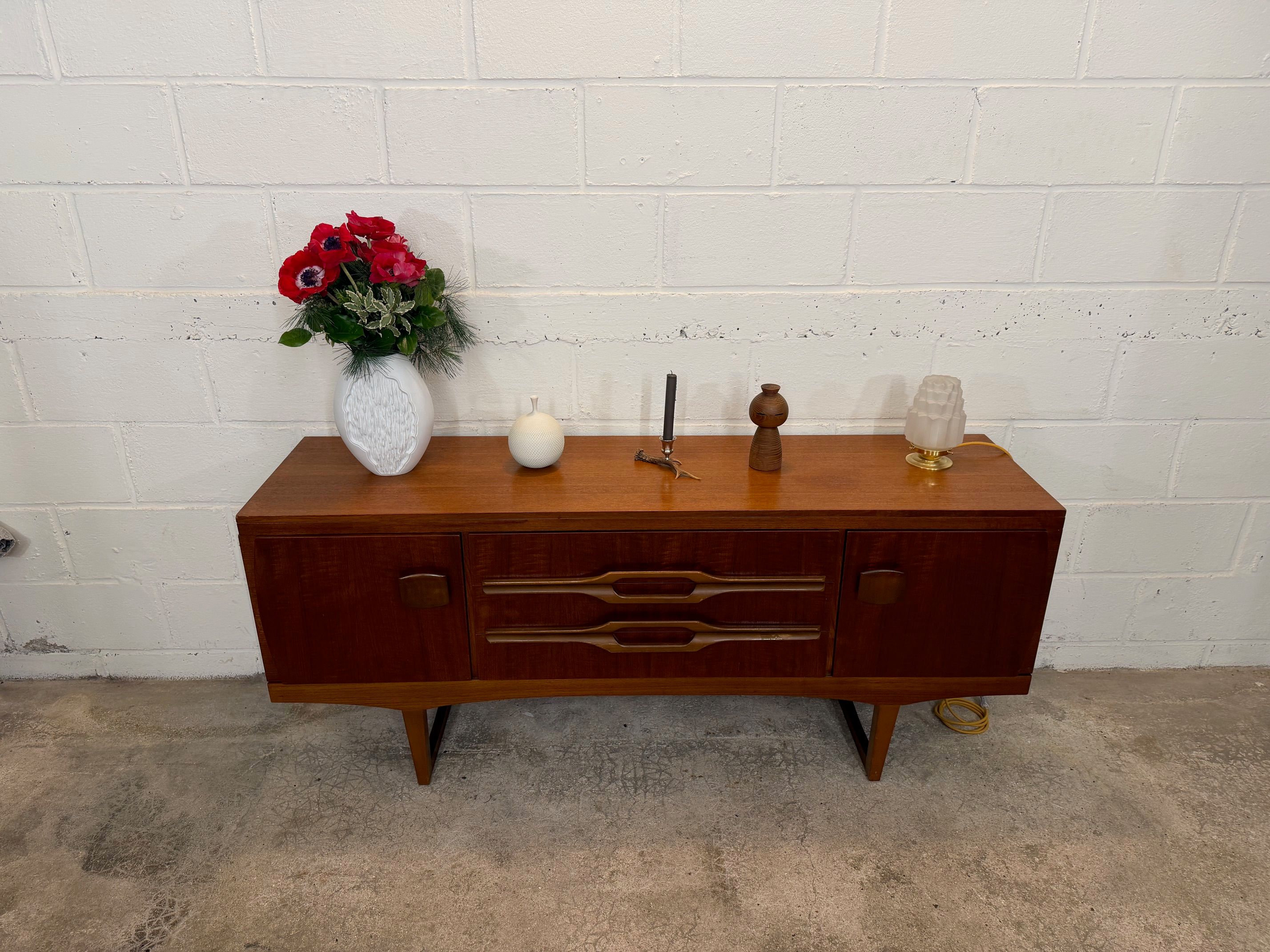 Une enfilade en teck, Angleterre dans les années 60. Elle dispose de deux espaces de rangements et de trois tiroirs.