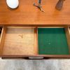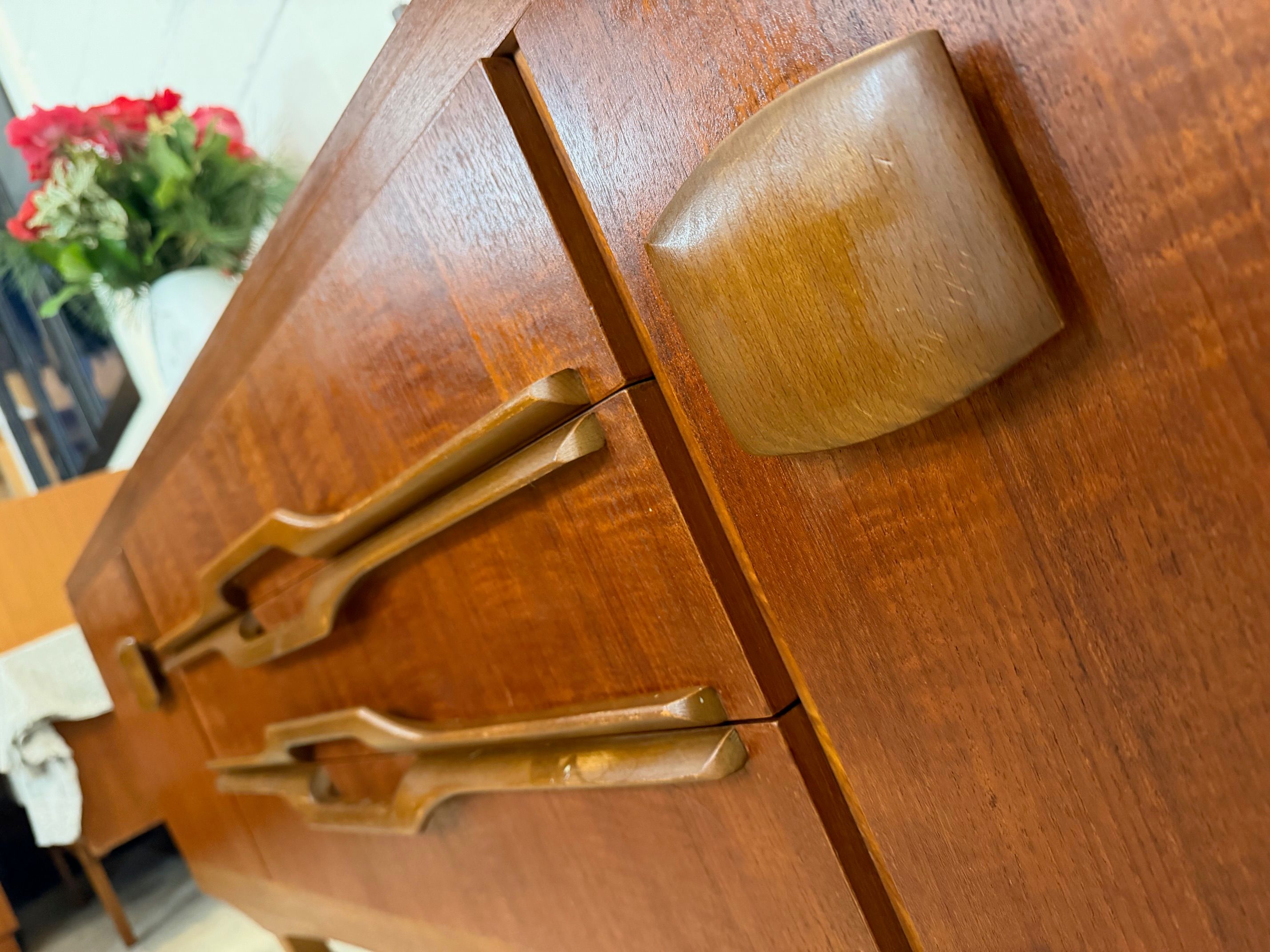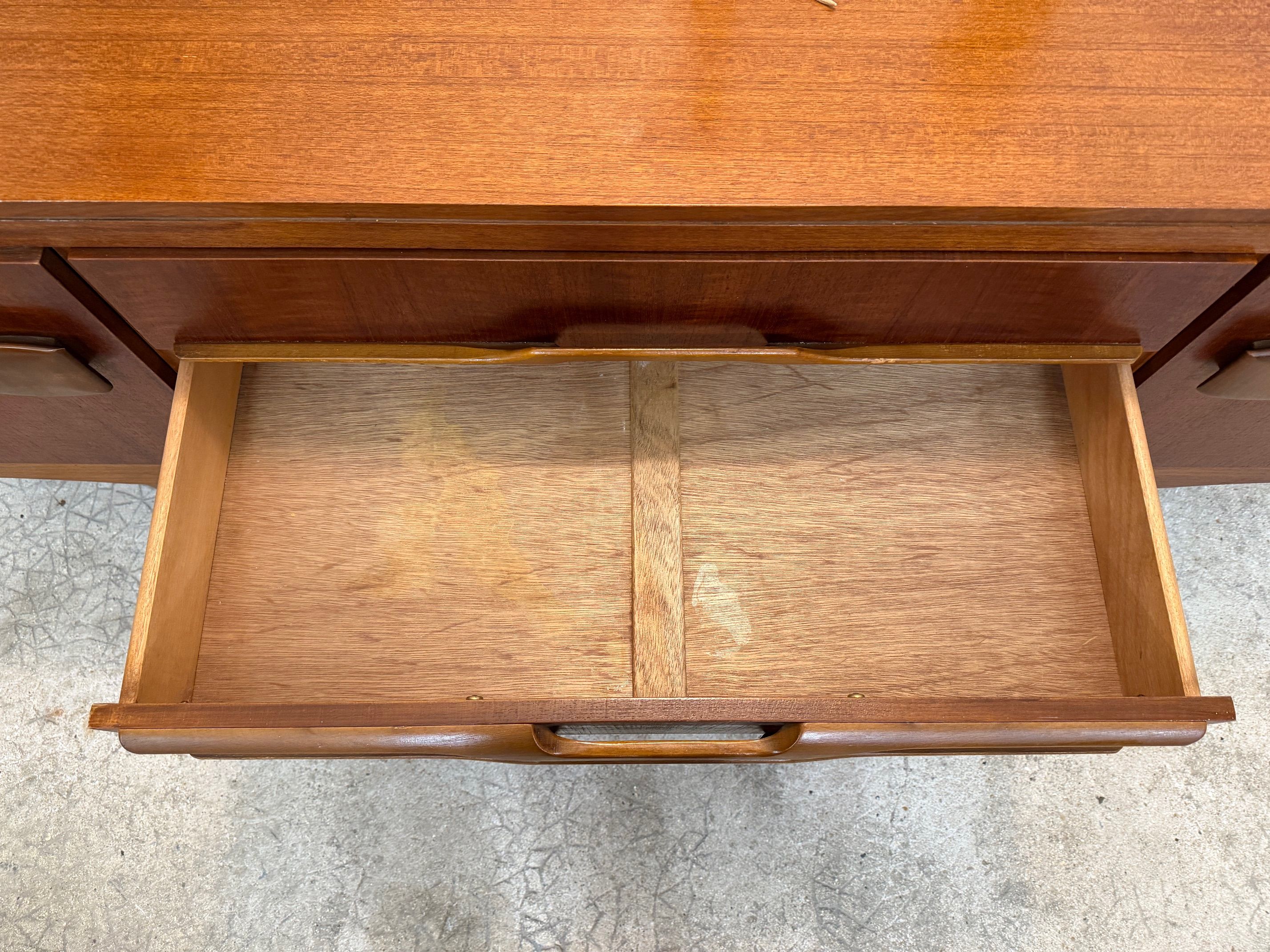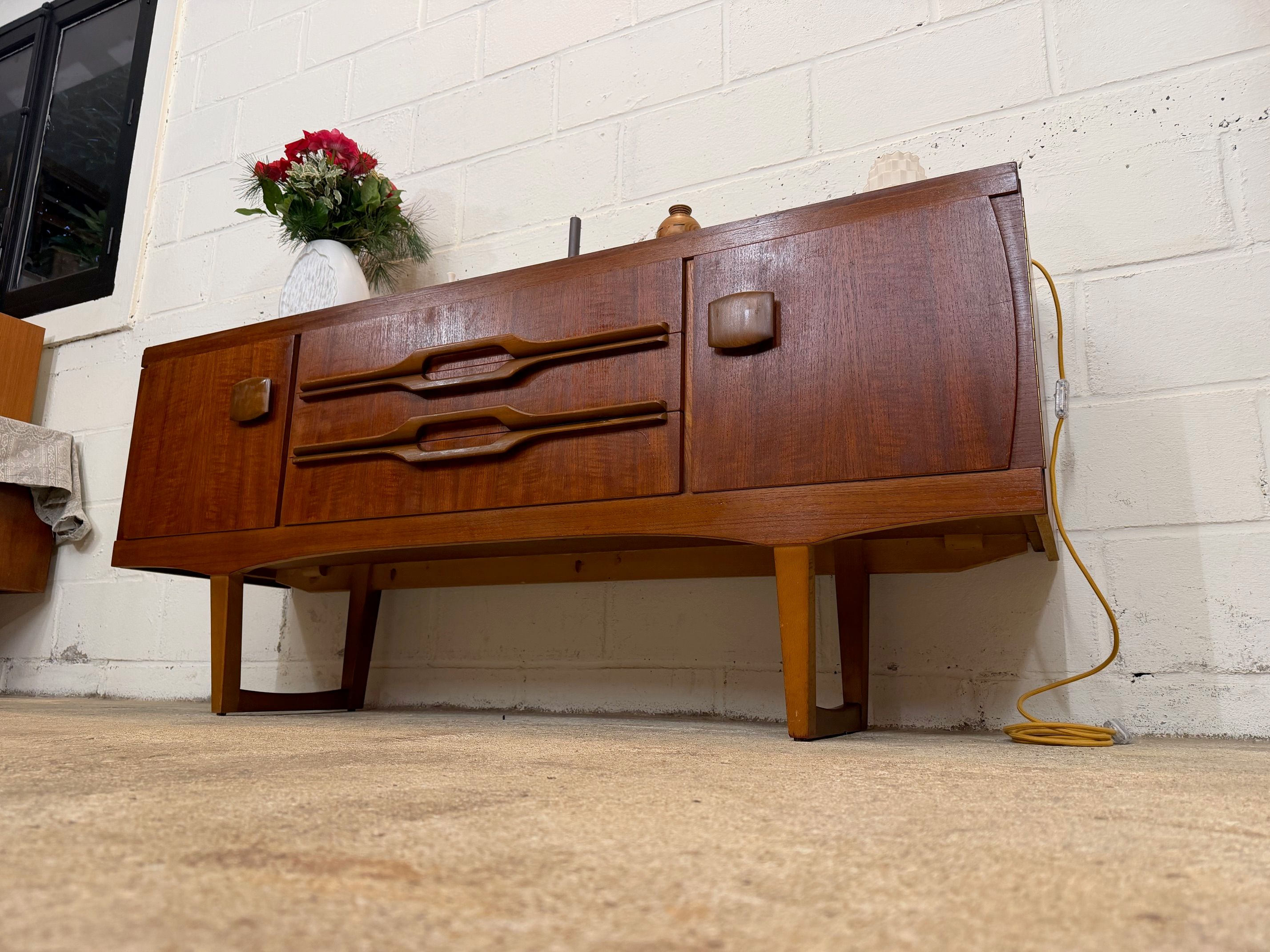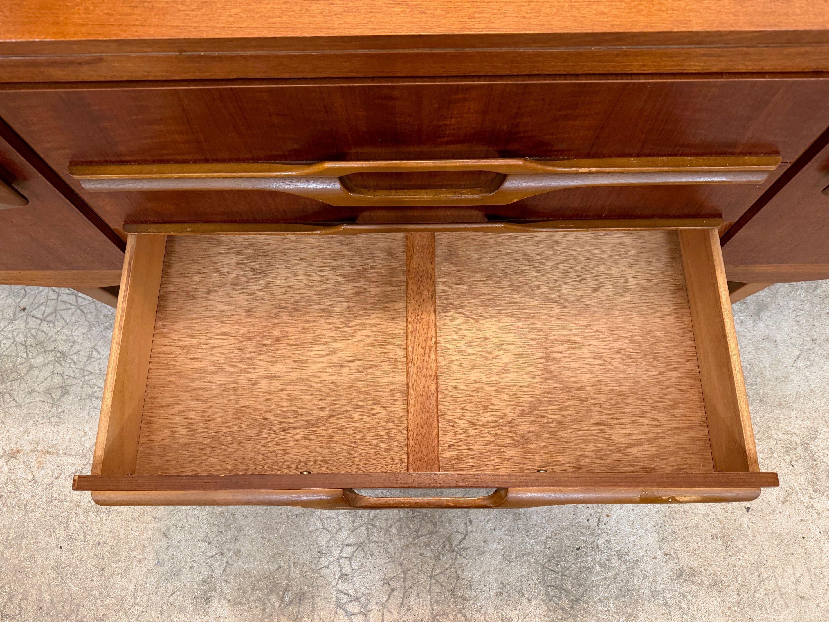 Une enfilade en teck, Angleterre dans les années 60. Elle dispose de deux espaces de rangements et de trois tiroirs.