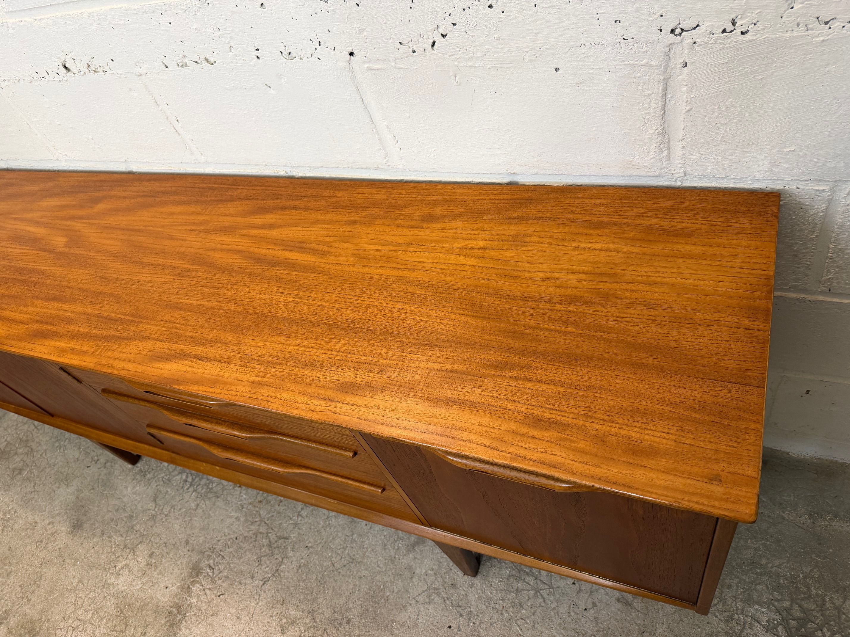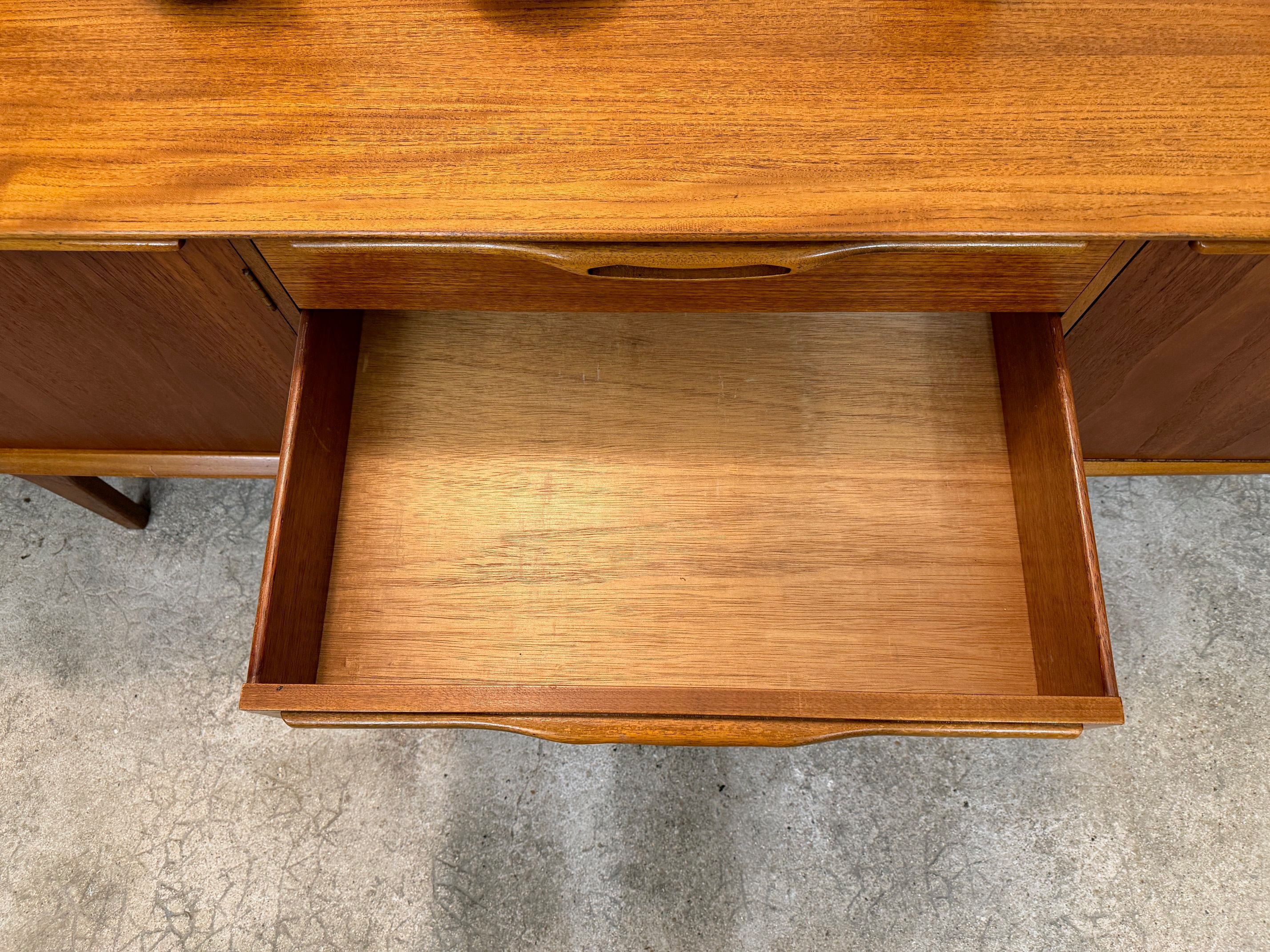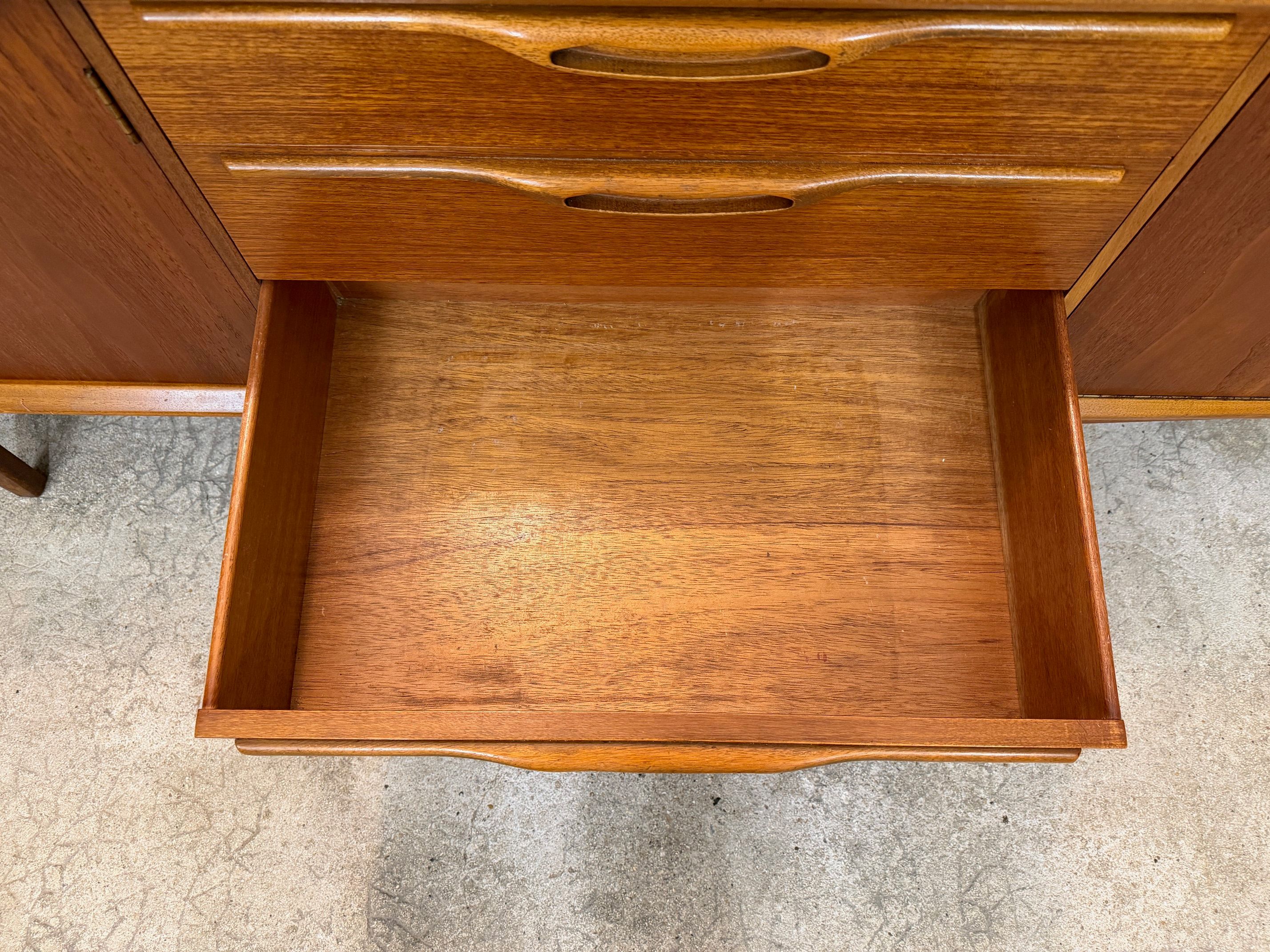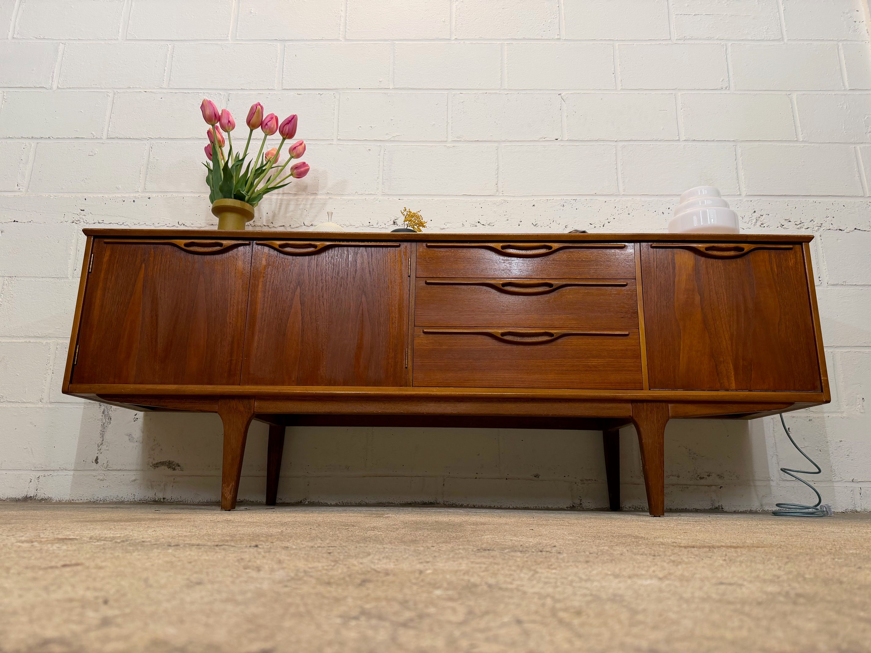 Une grande et belle enfilade scandinave en teck, éditée en Angleterre par Jentique dans les années 60. Elle offre une bonne capacité de rangement, dont un espace bar.