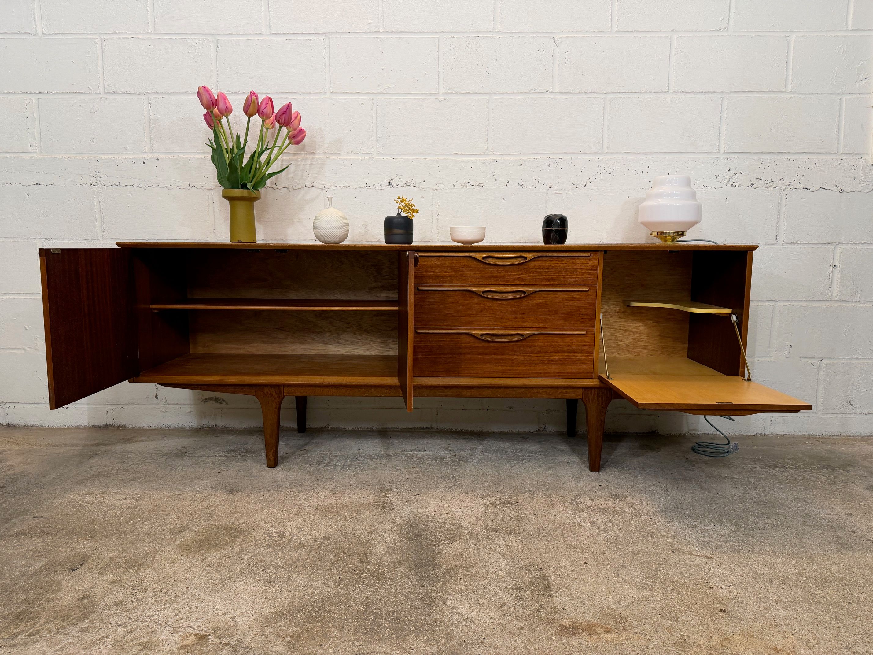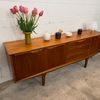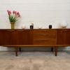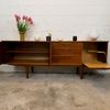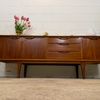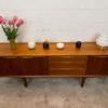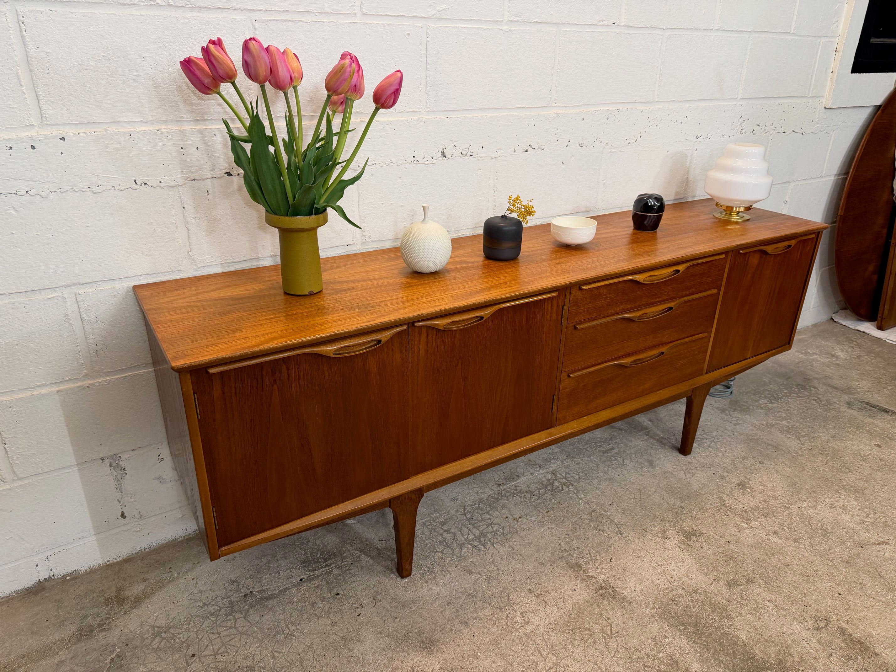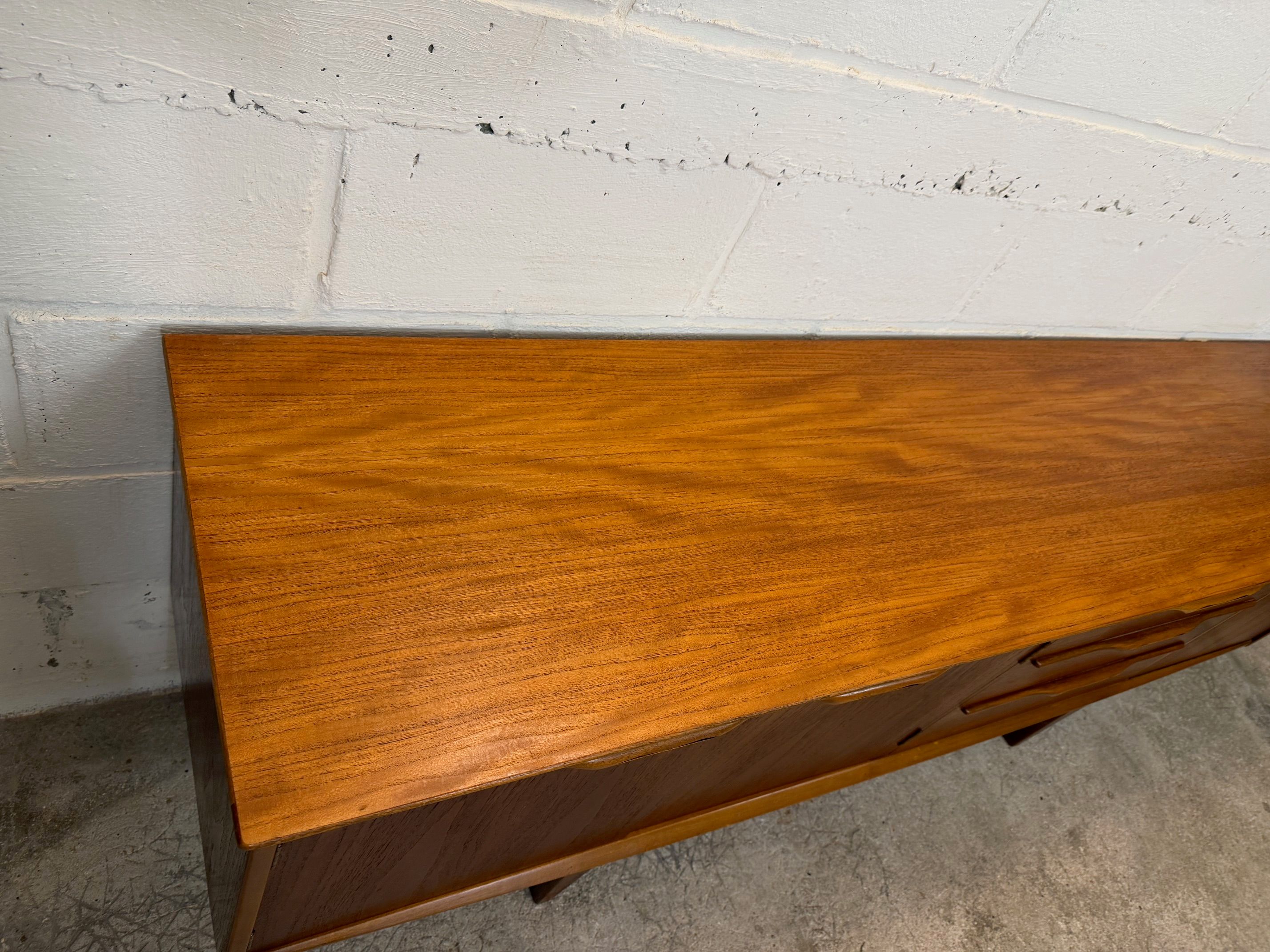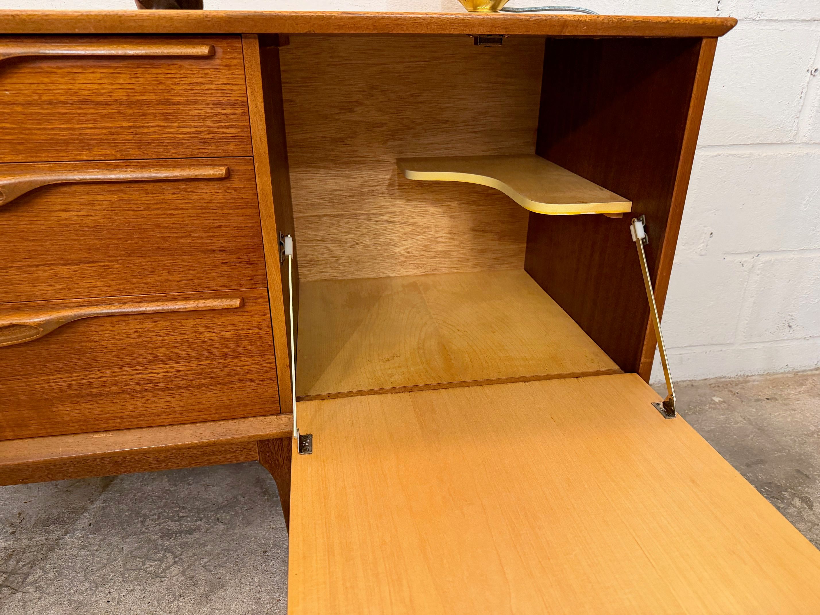 Une grande et belle enfilade scandinave en teck, éditée en Angleterre par Jentique dans les années 60. Elle offre une bonne capacité de rangement, dont un espace bar.