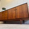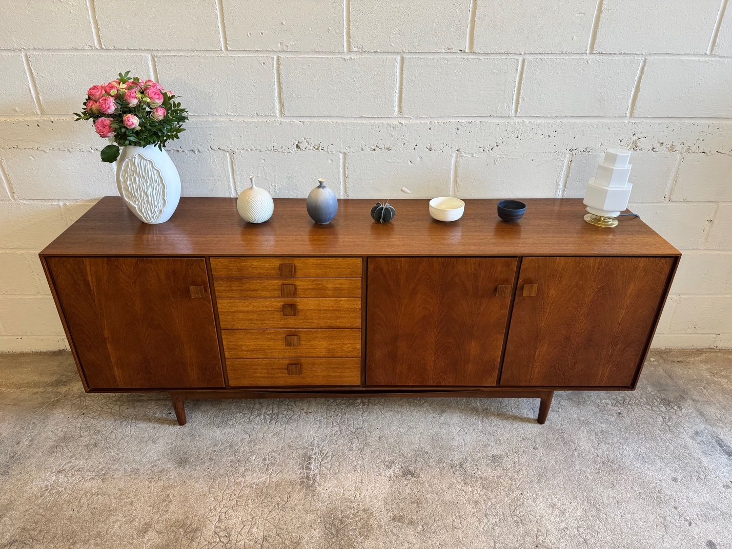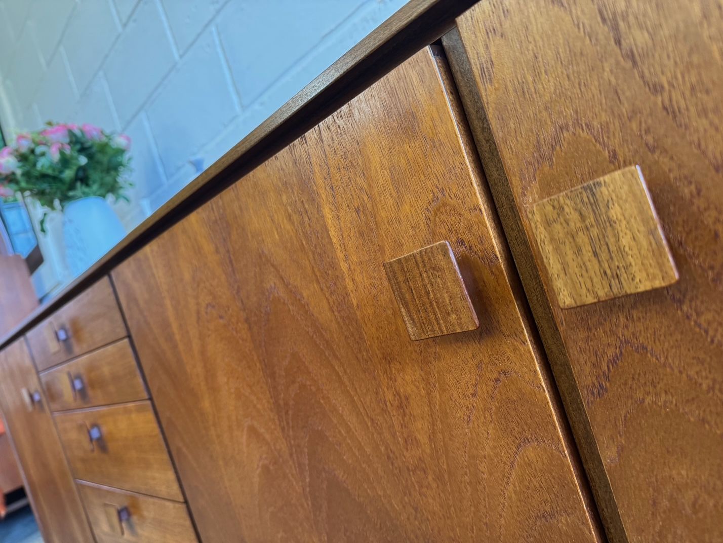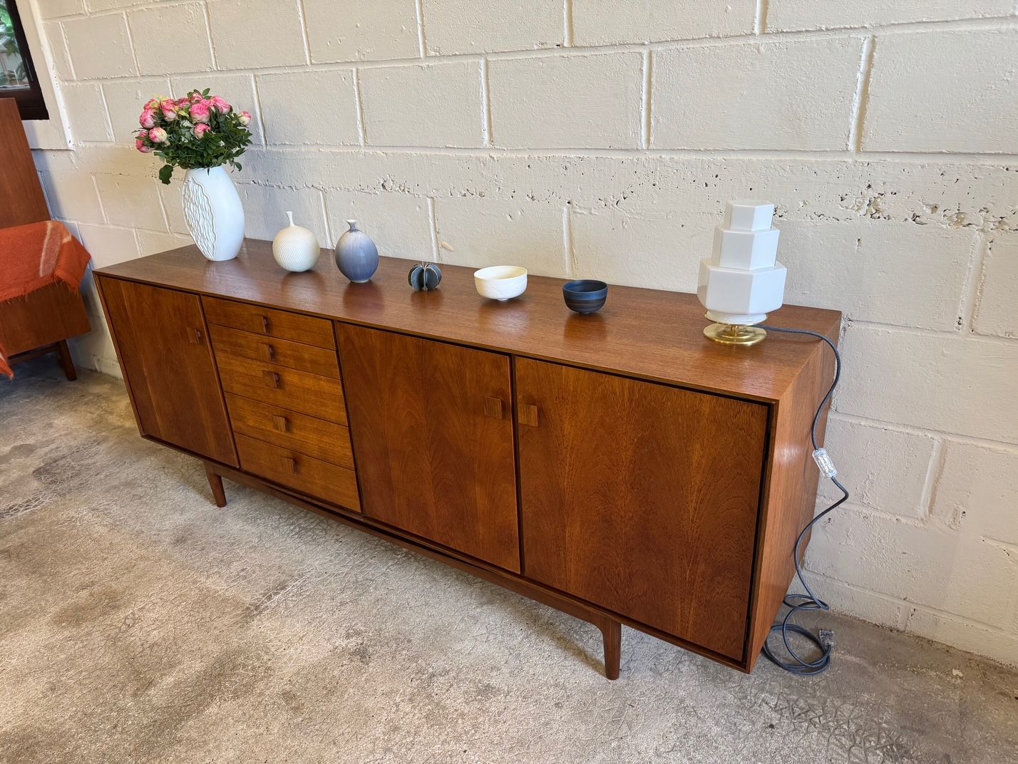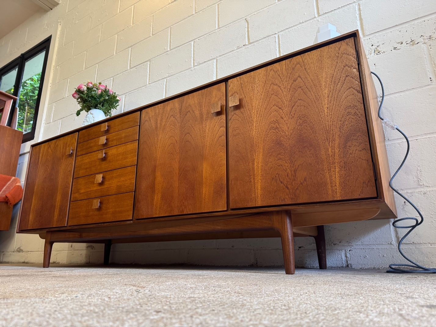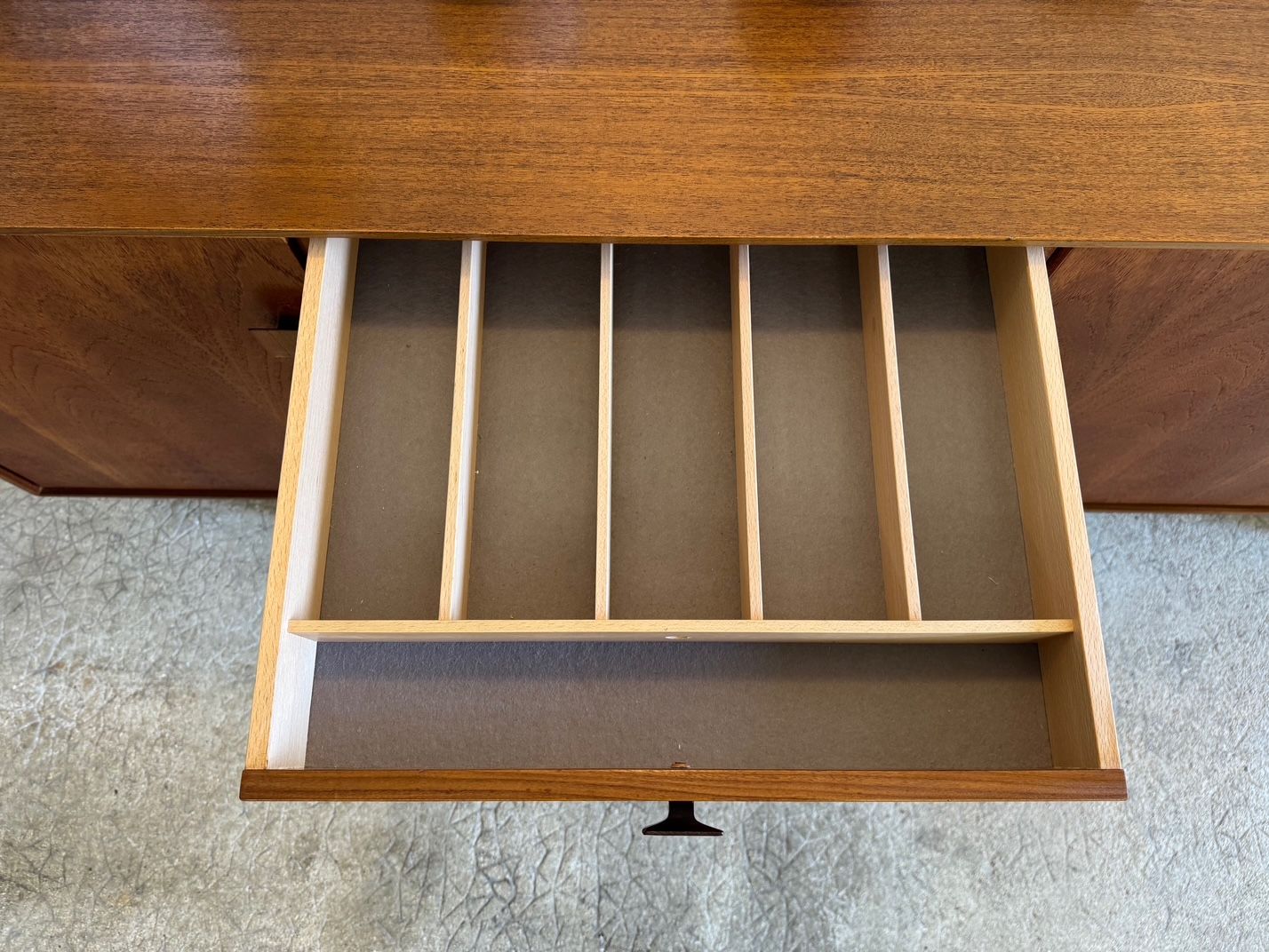 Une très belle enfilade en teck, pour G-Plan par Kofod Larsen dans les années 60. Elle offre une bonne capacité de rangement.