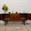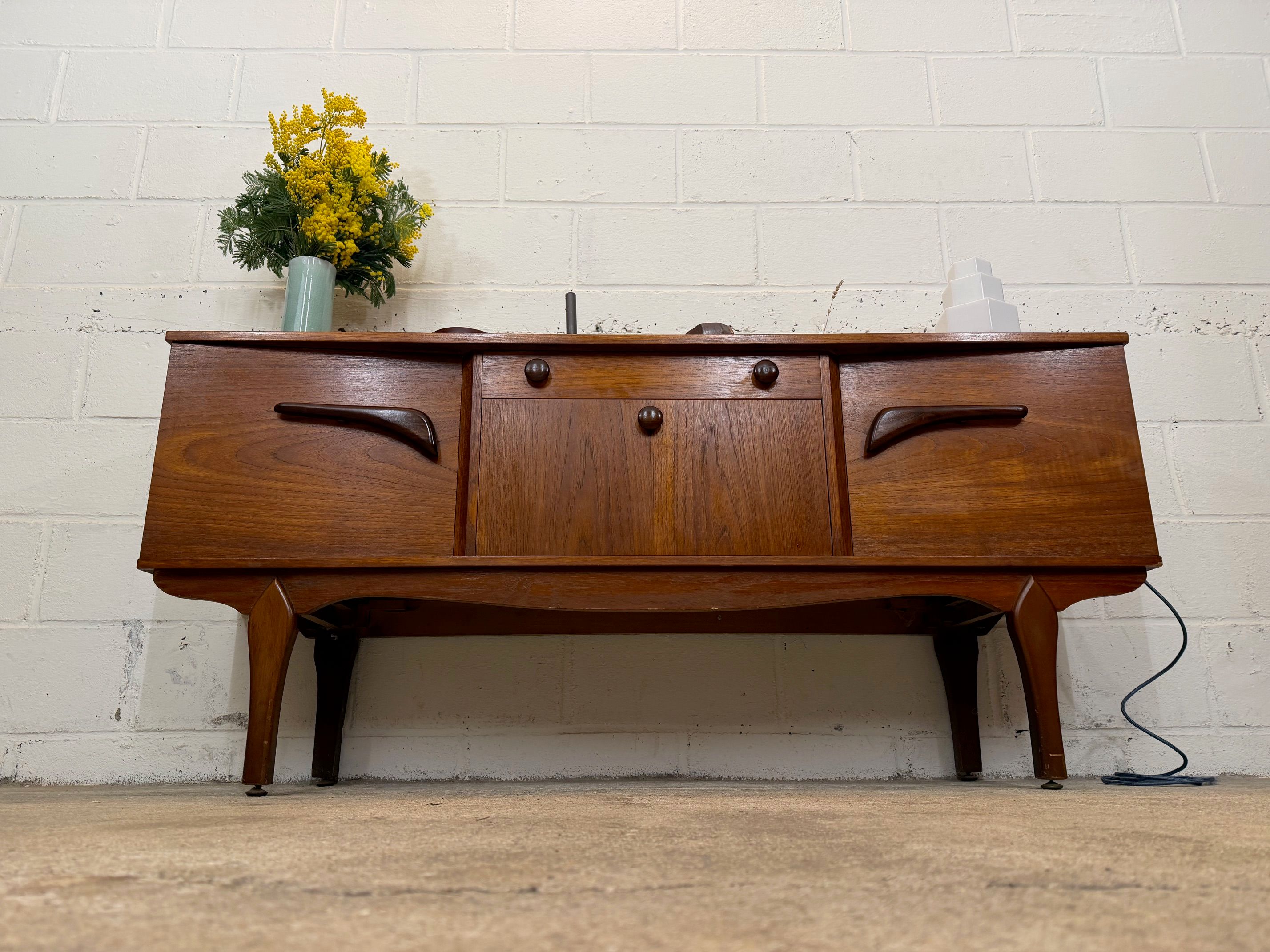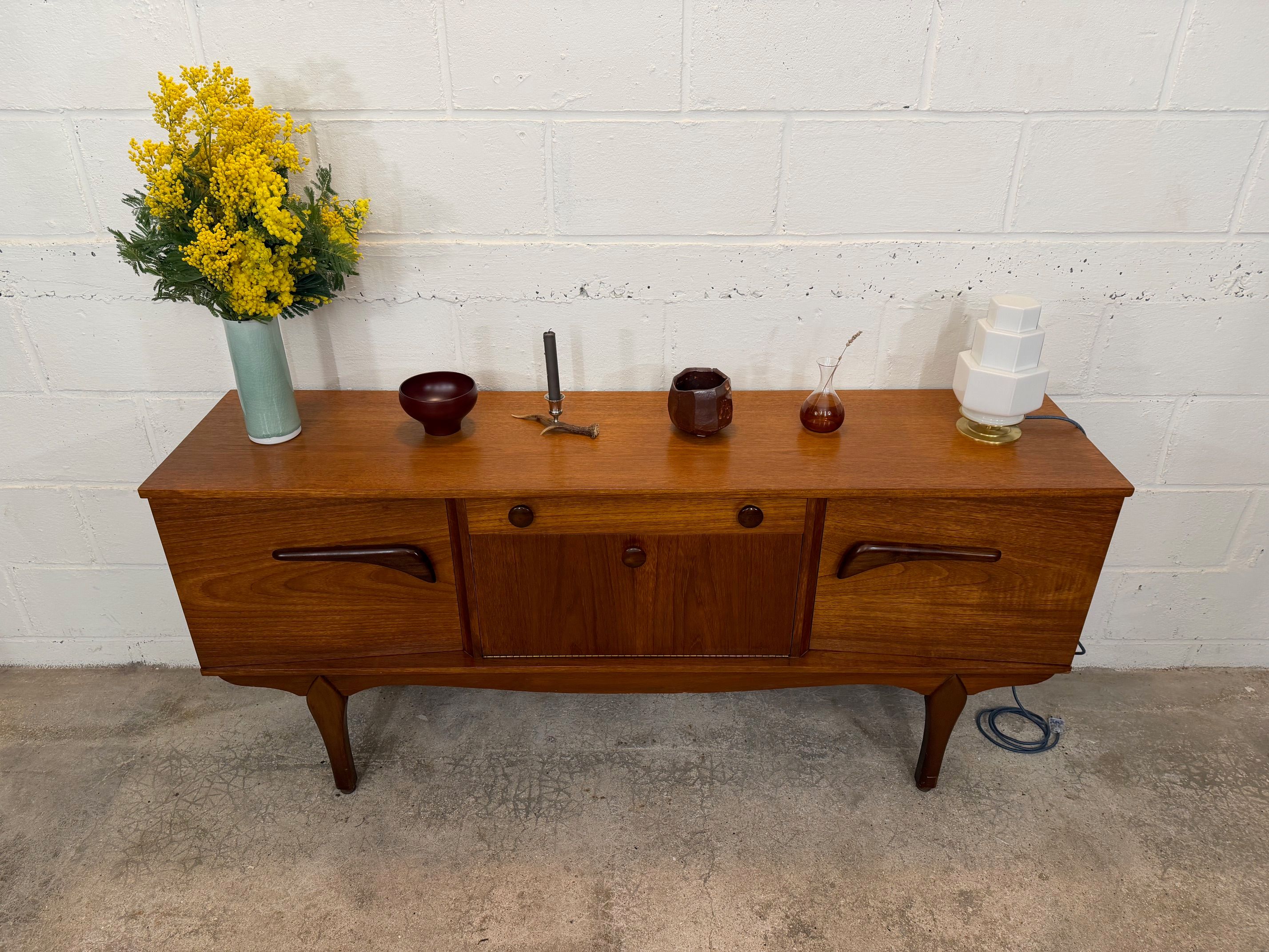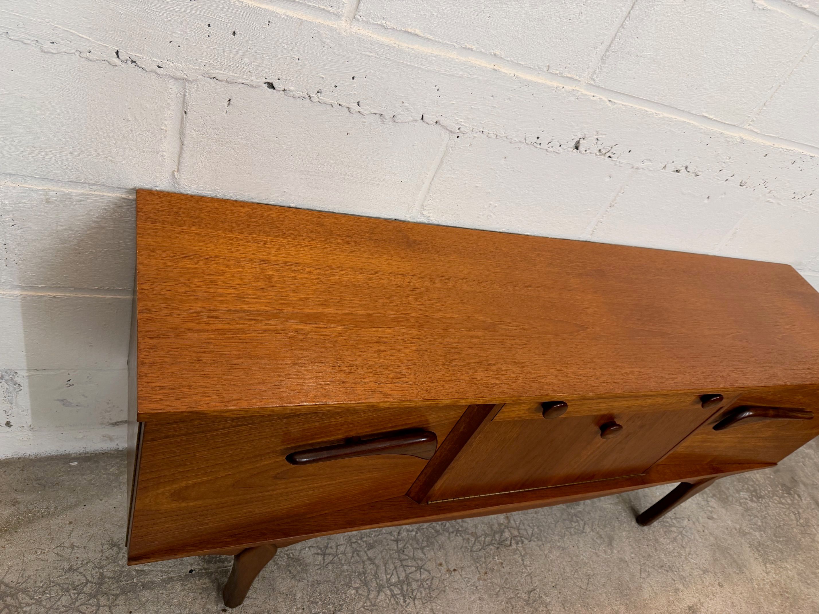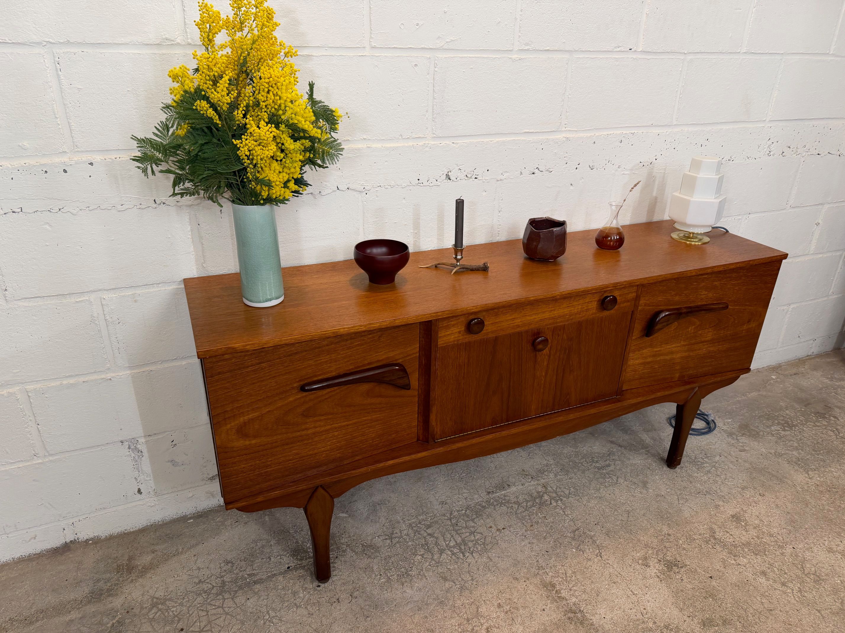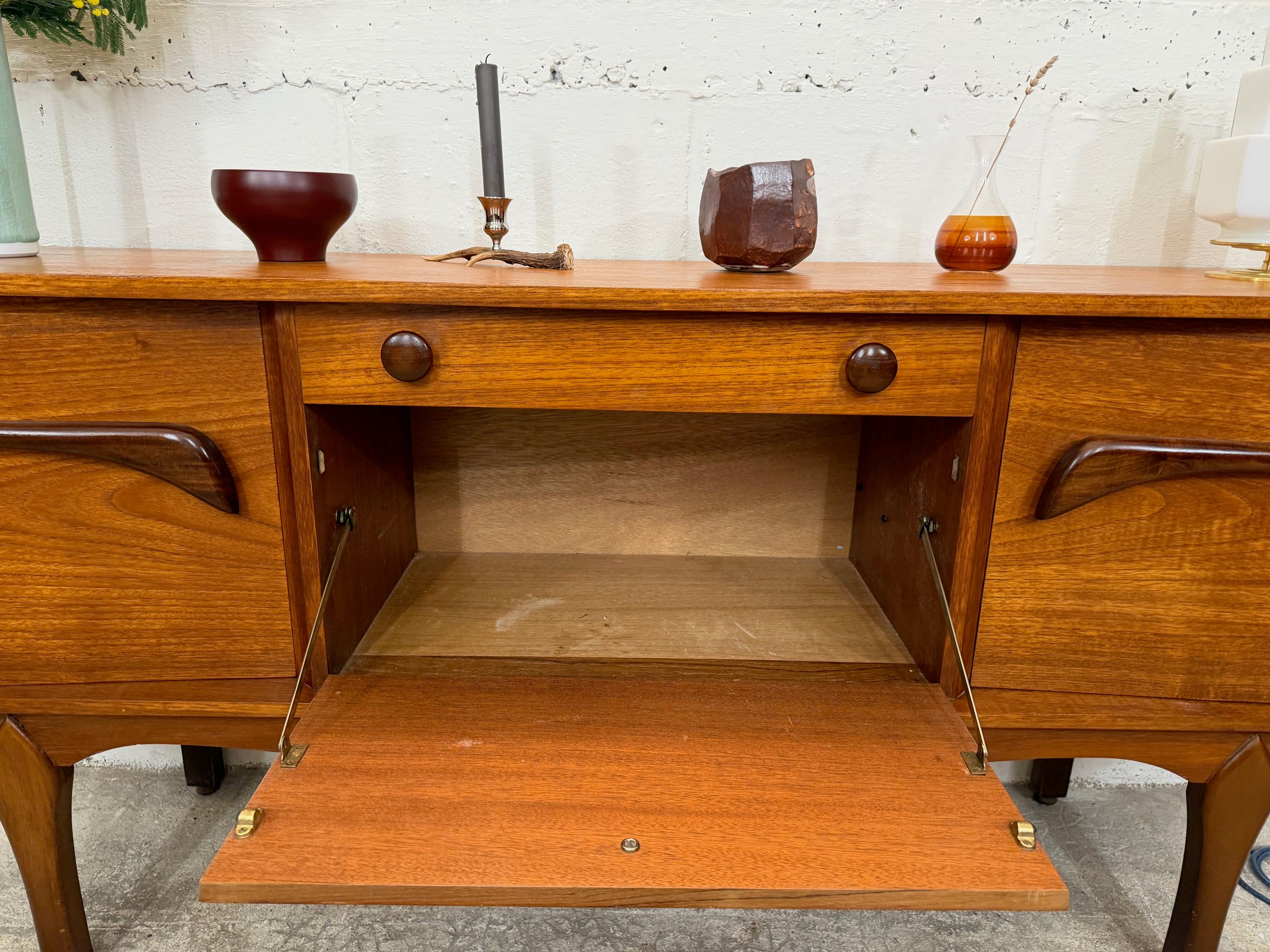 Une belle enfilade scandinave en teck, éditée en Angleterre dans les années 60. Elle offre une bonne capacité de rangement dont un bar avec abattant, deux espaces de rangement avec étagères et un tiroir. A noter la jolie forme des poignées.
