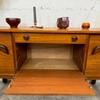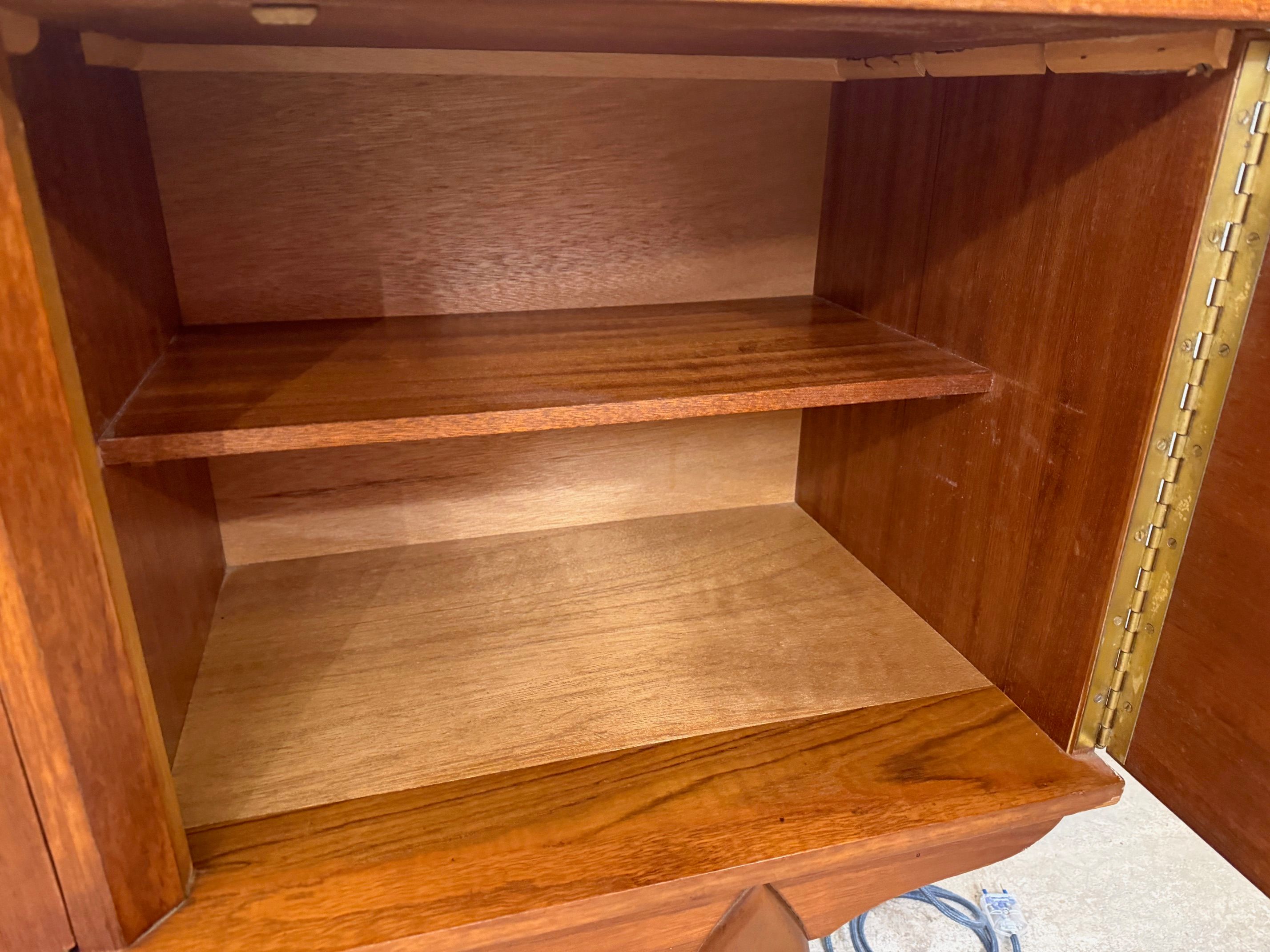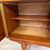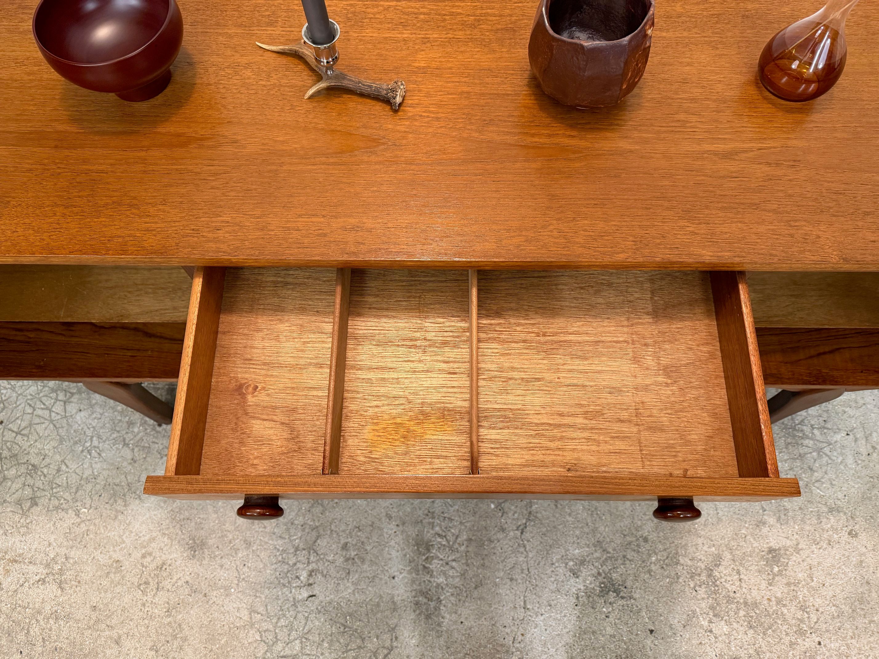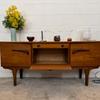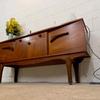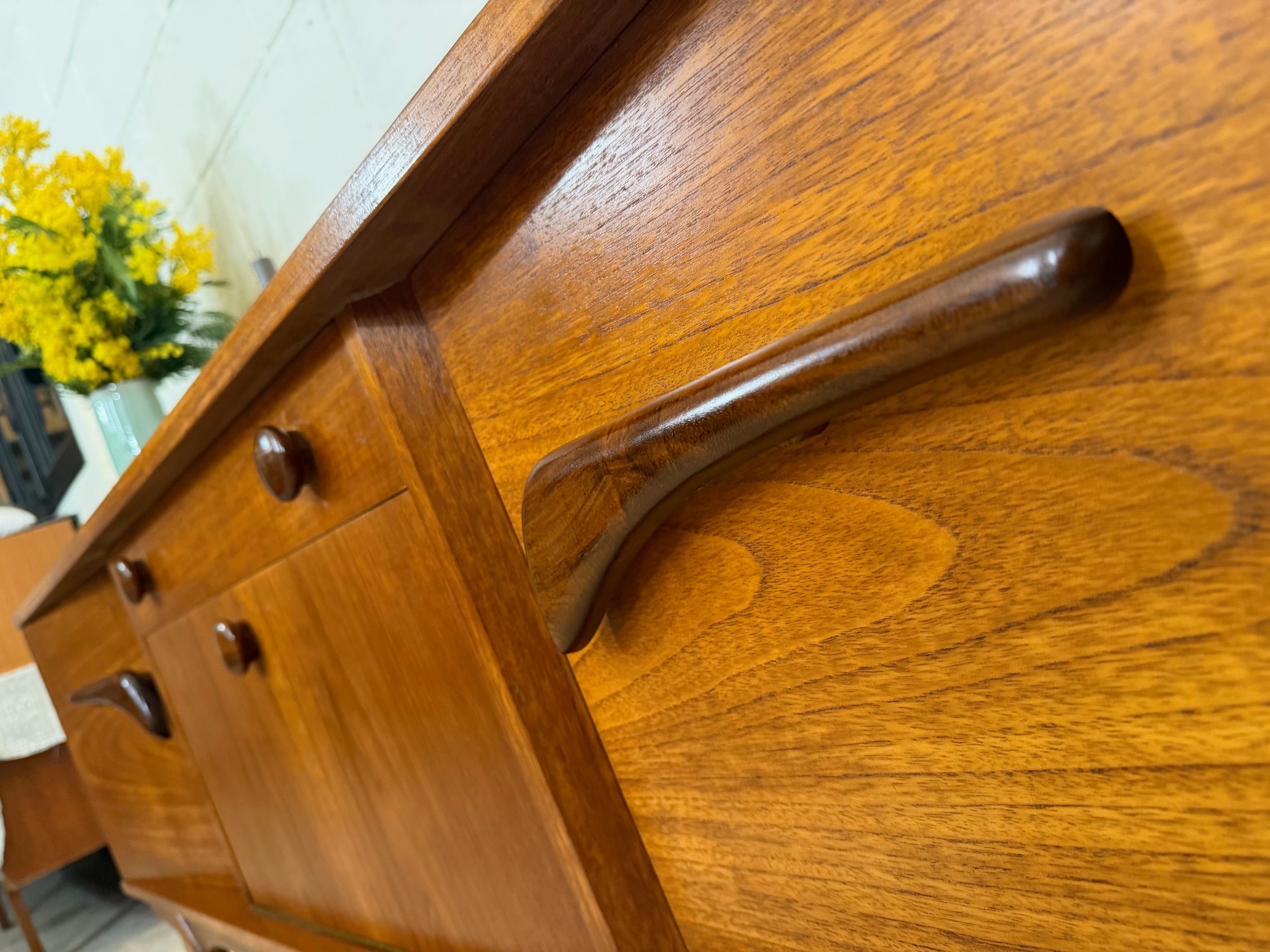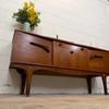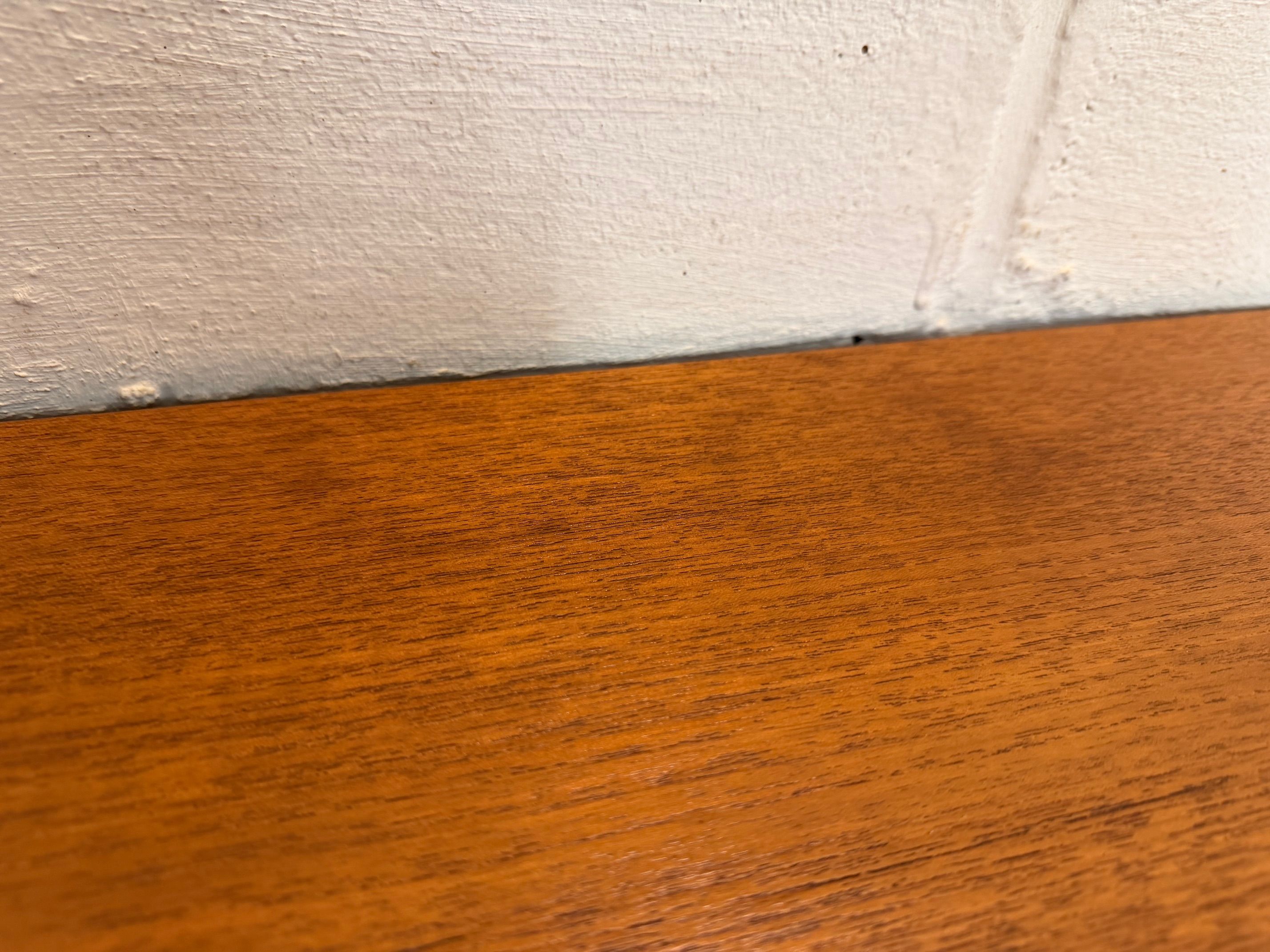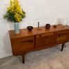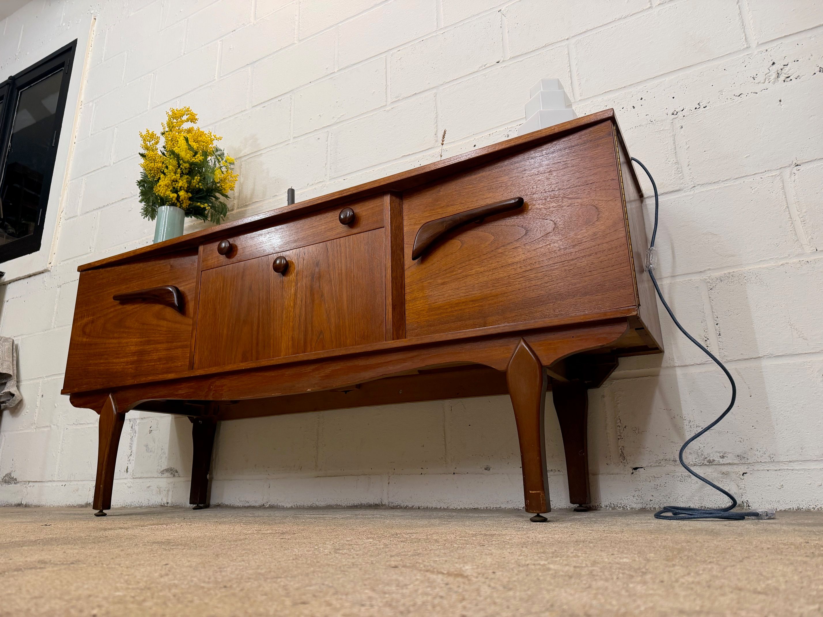 Une belle enfilade scandinave en teck, éditée en Angleterre dans les années 60. Elle offre une bonne capacité de rangement dont un bar avec abattant, deux espaces de rangement avec étagères et un tiroir. A noter la jolie forme des poignées.
