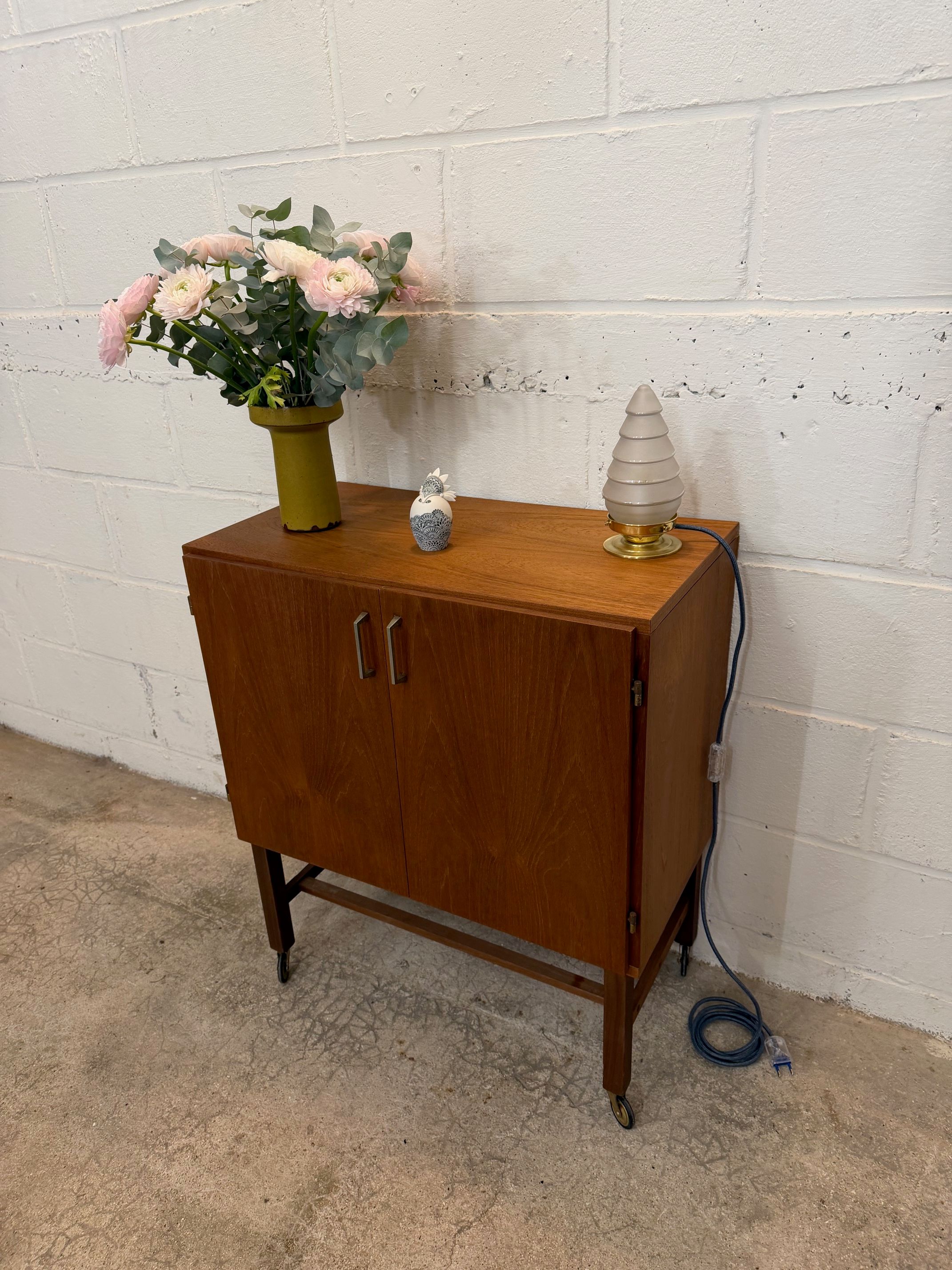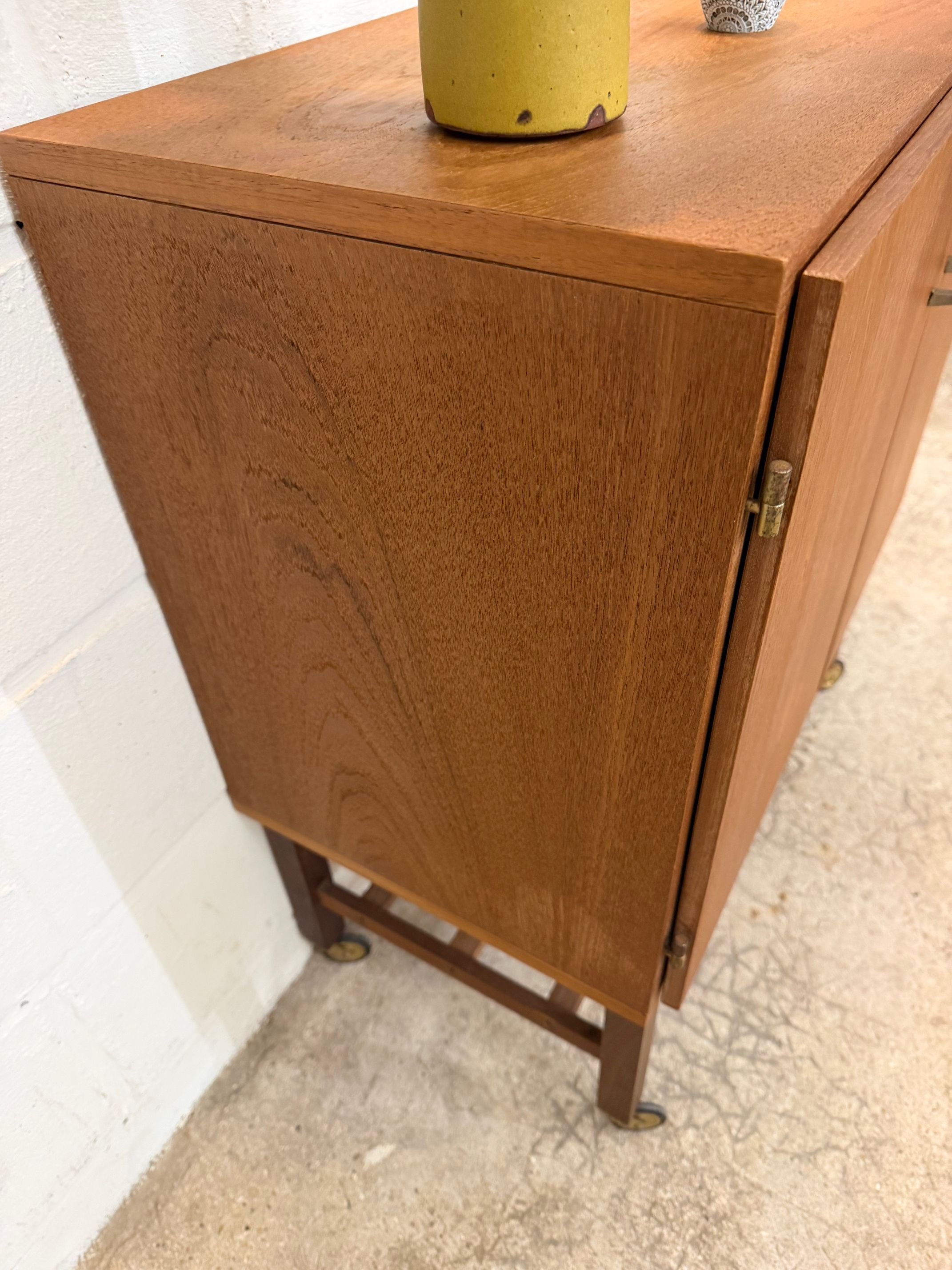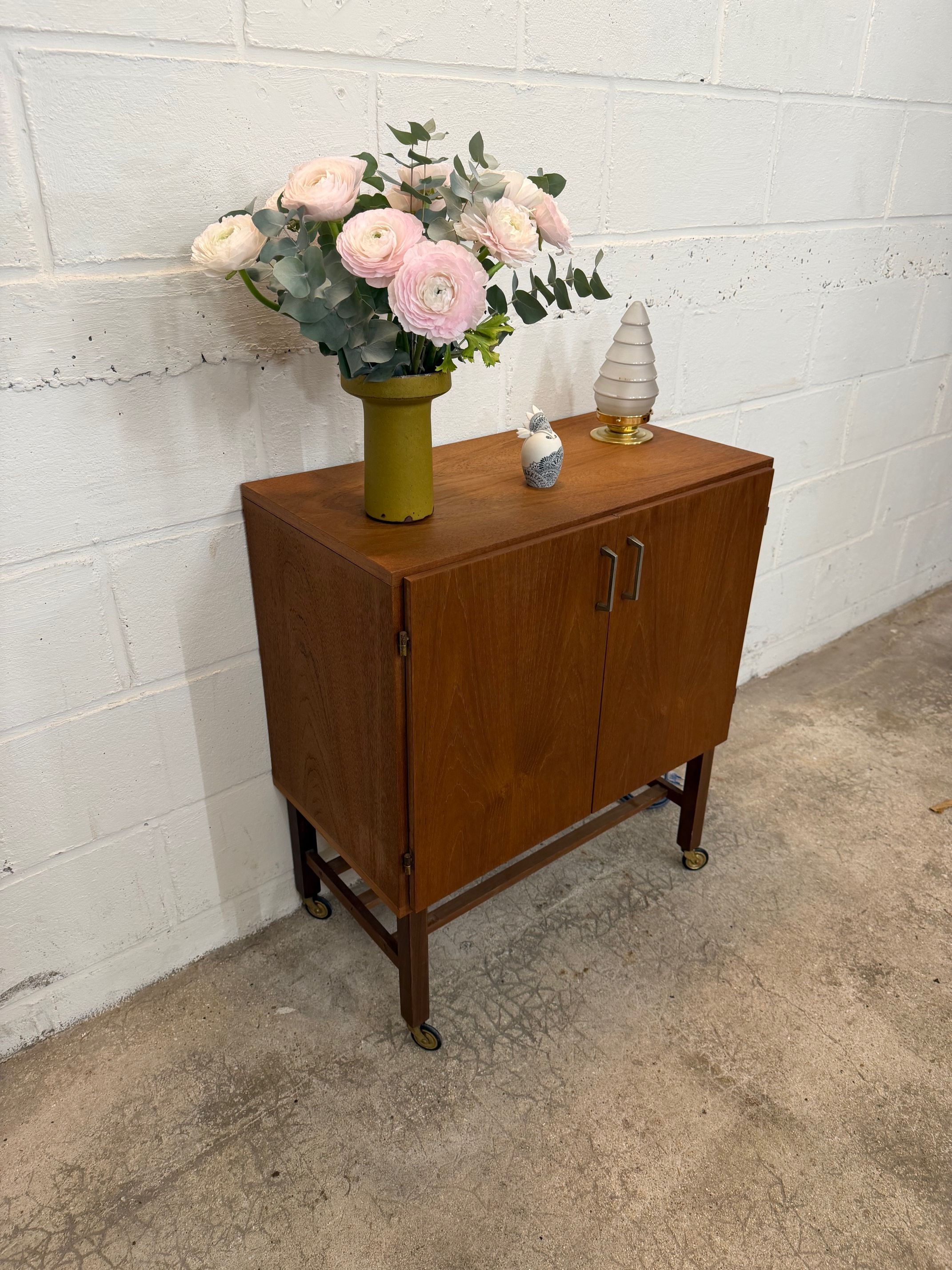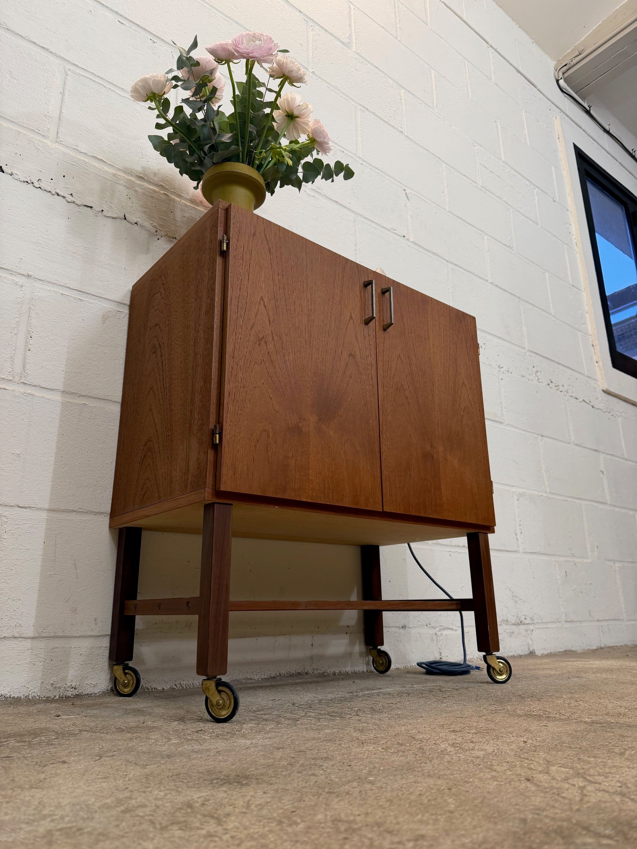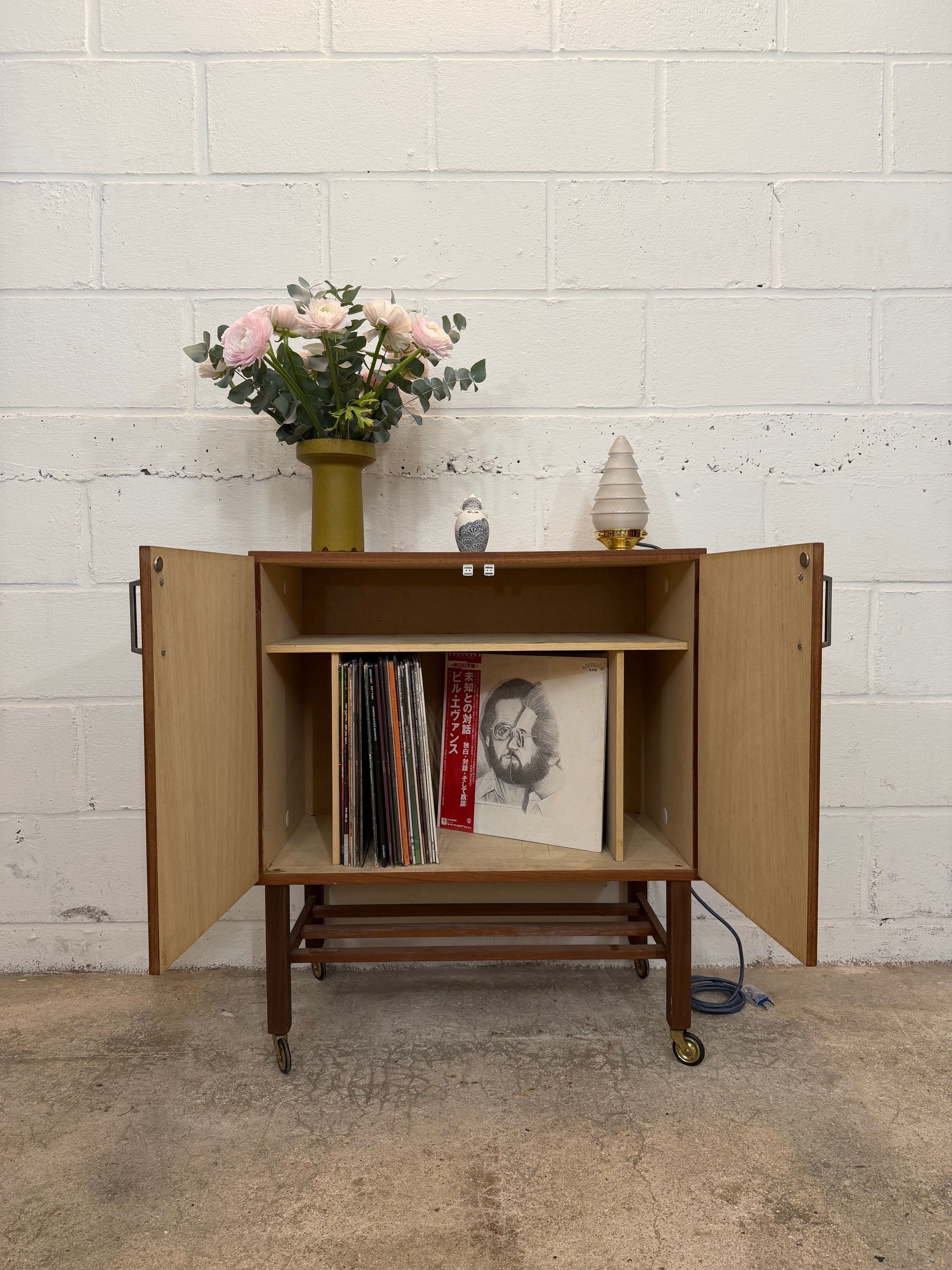 Un meuble années 60 destiné au rangement des vinyles. Il est monté sur roulettes d'origine. Il peut contenir environ 120 disques.