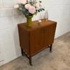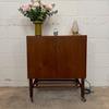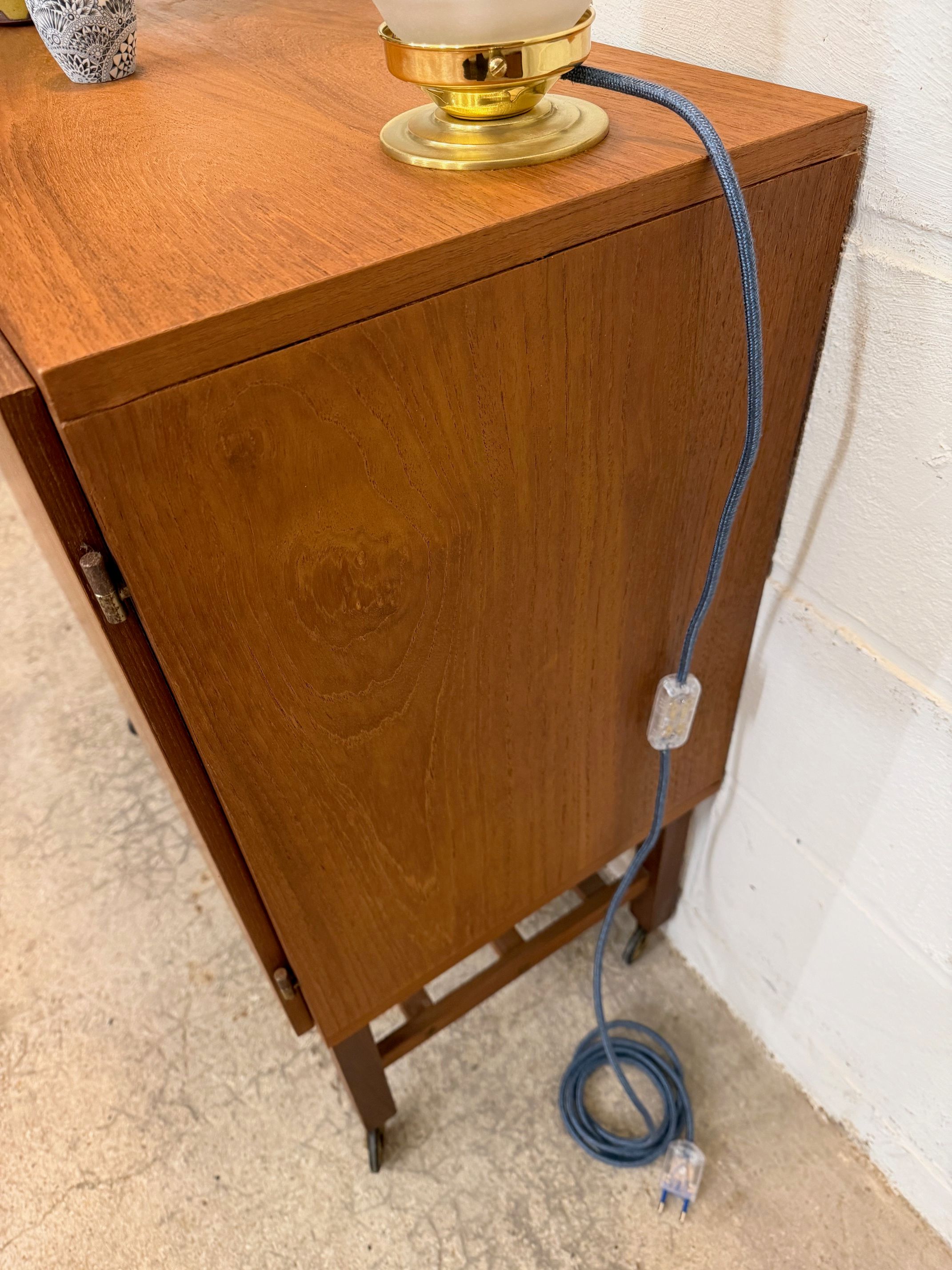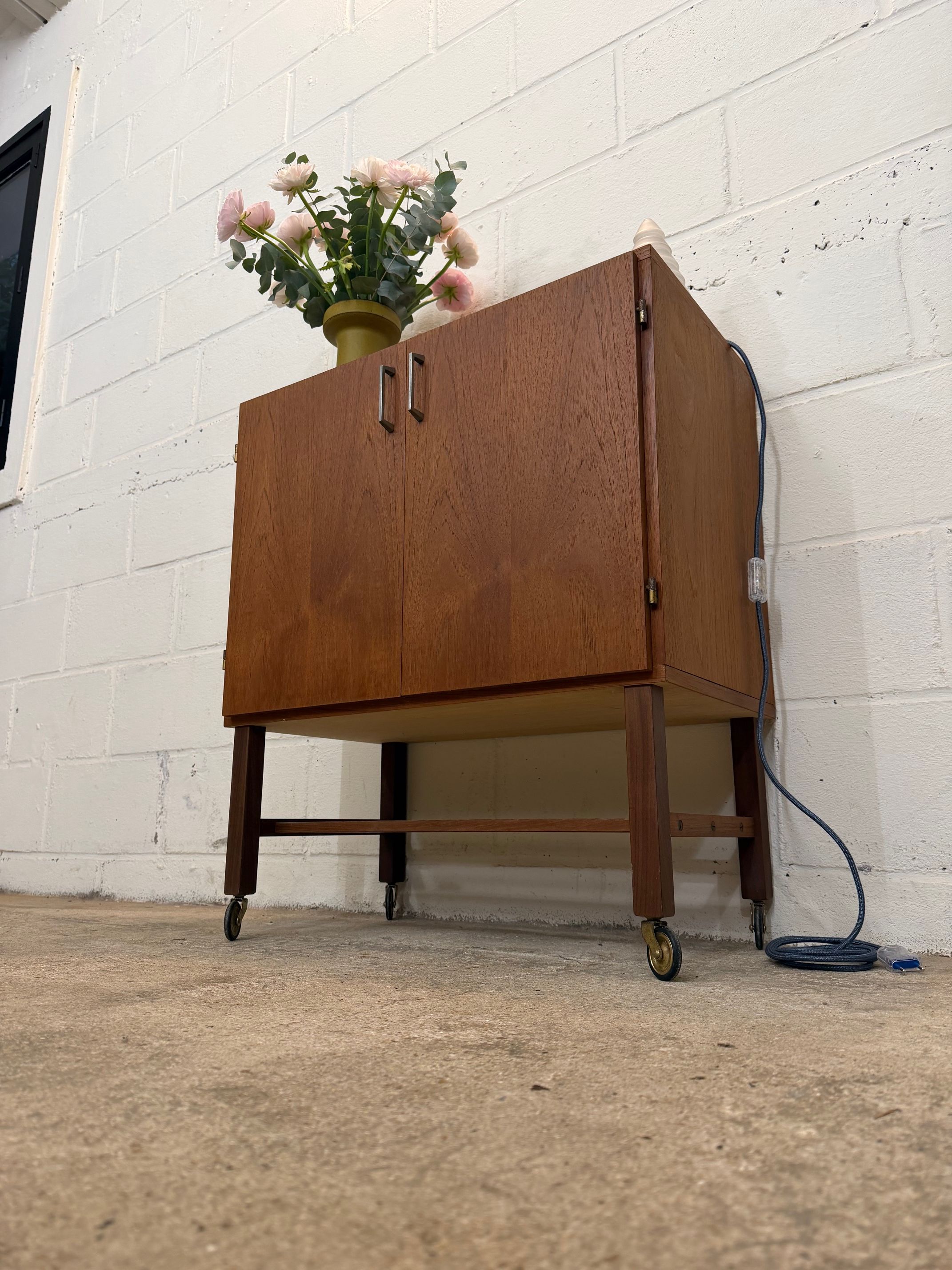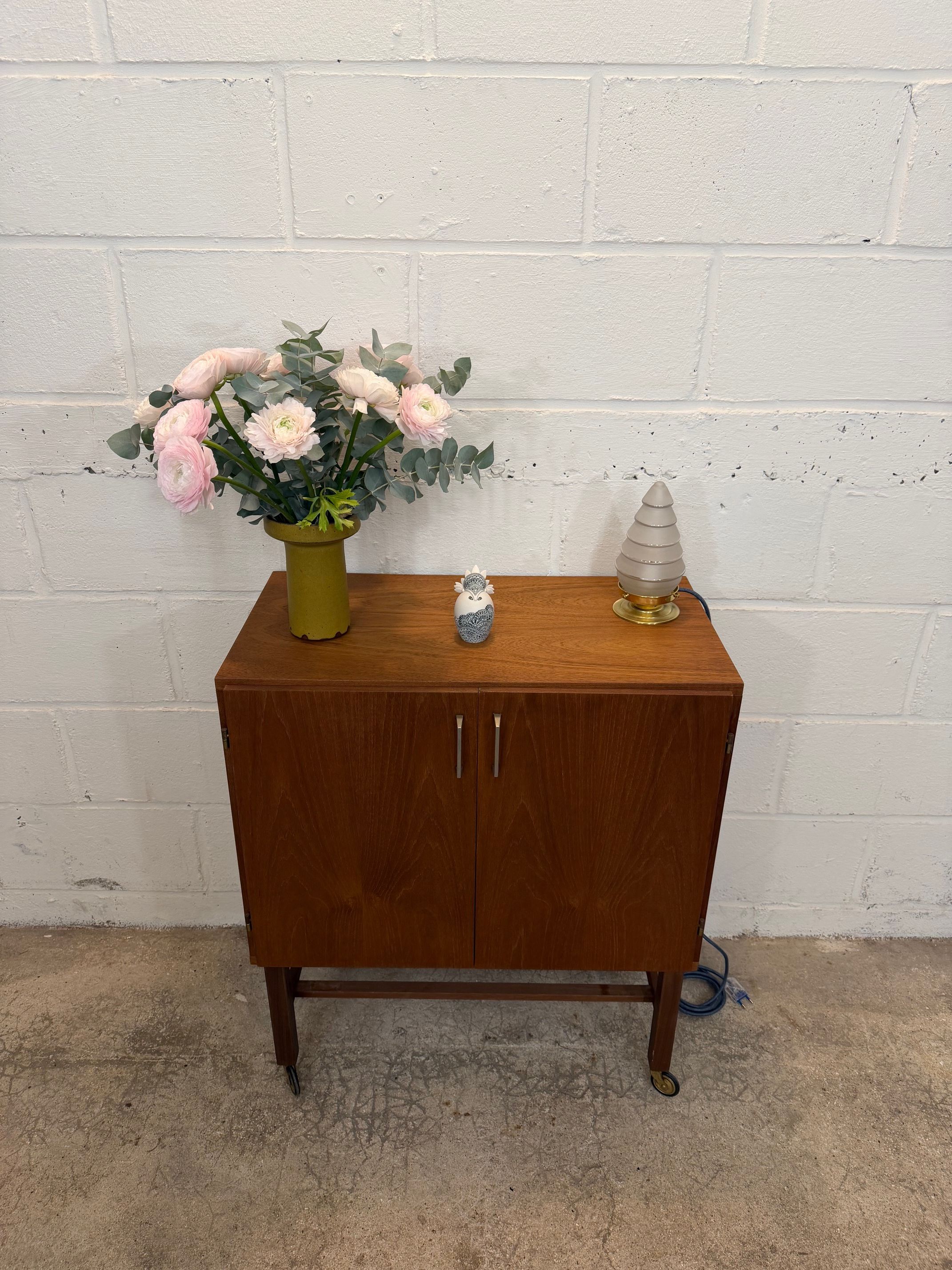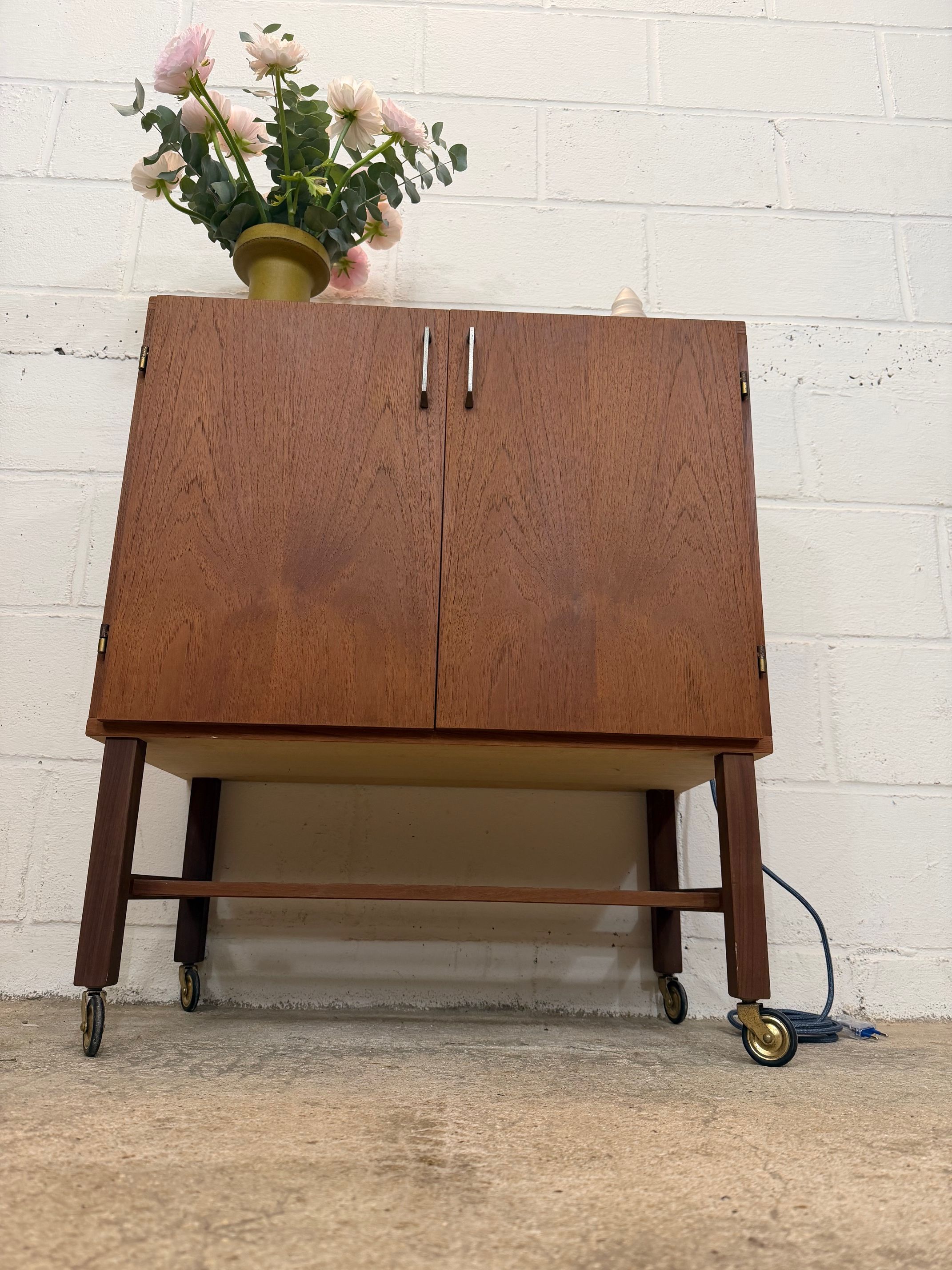 Un meuble années 60 destiné au rangement des vinyles. Il est monté sur roulettes d'origine. Il peut contenir environ 120 disques.