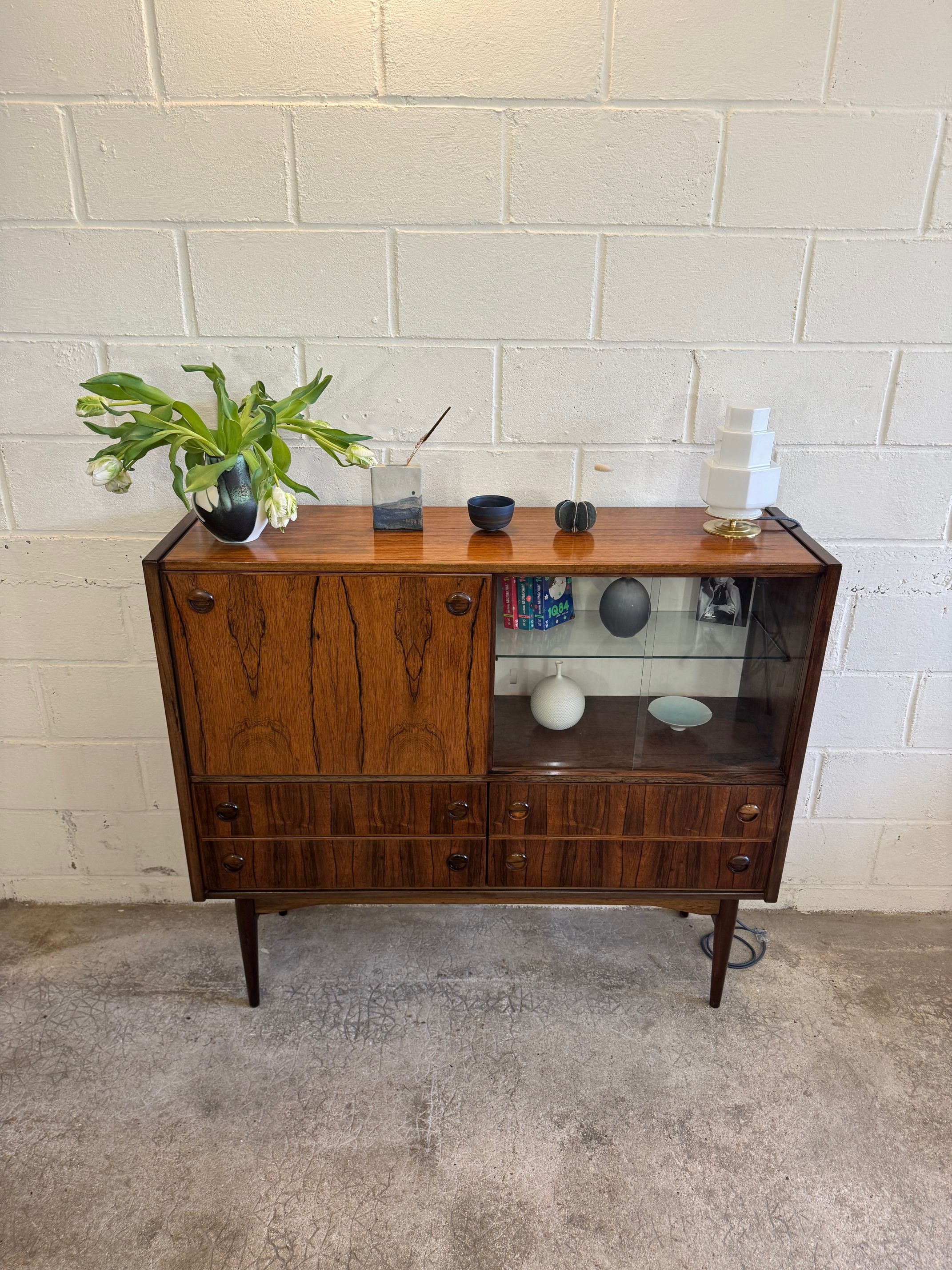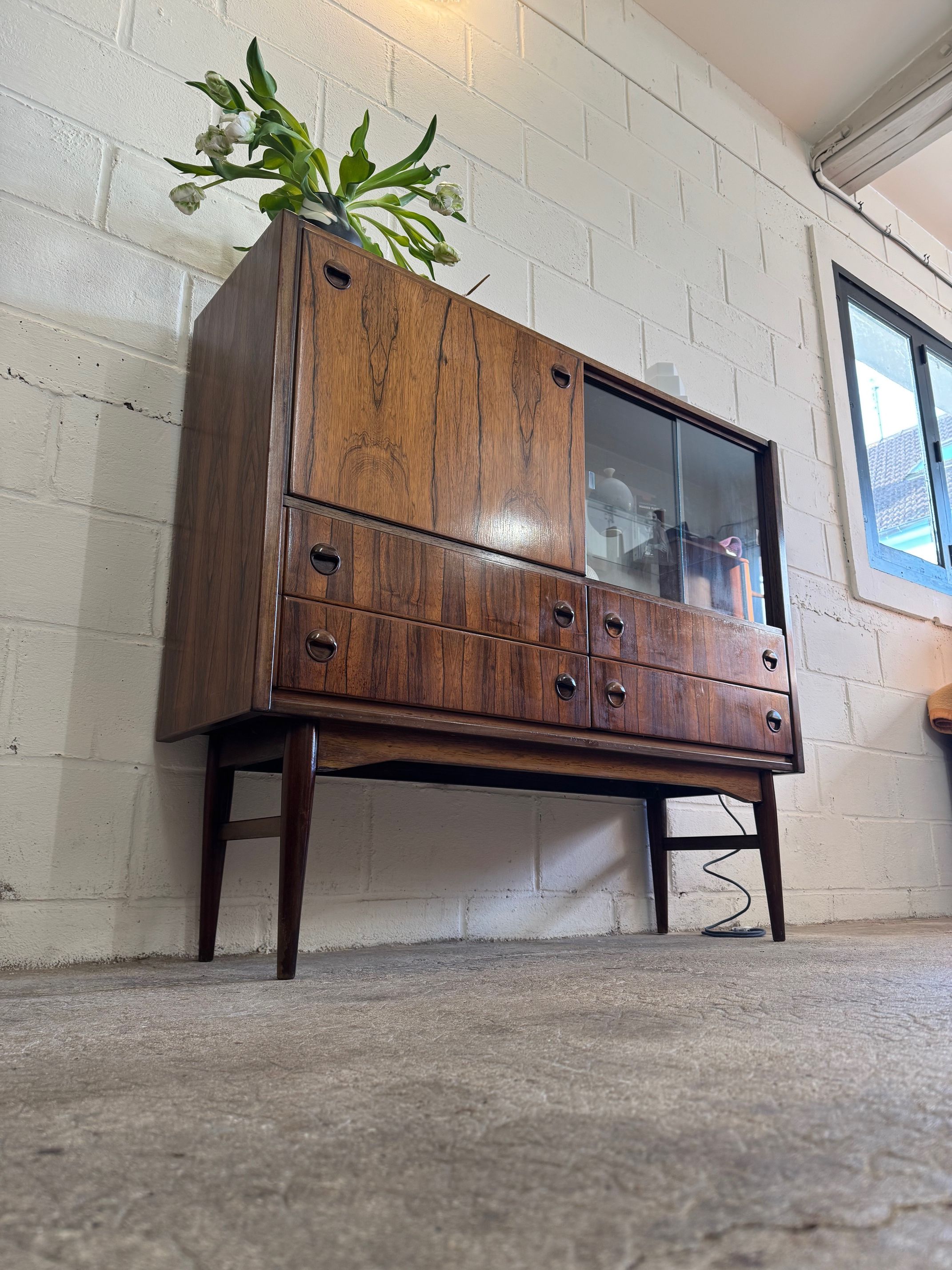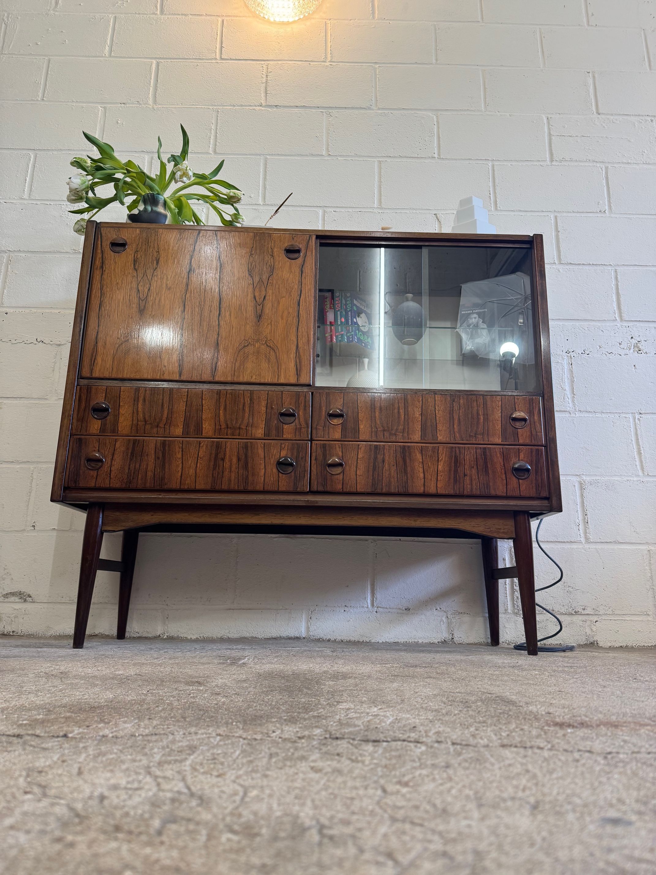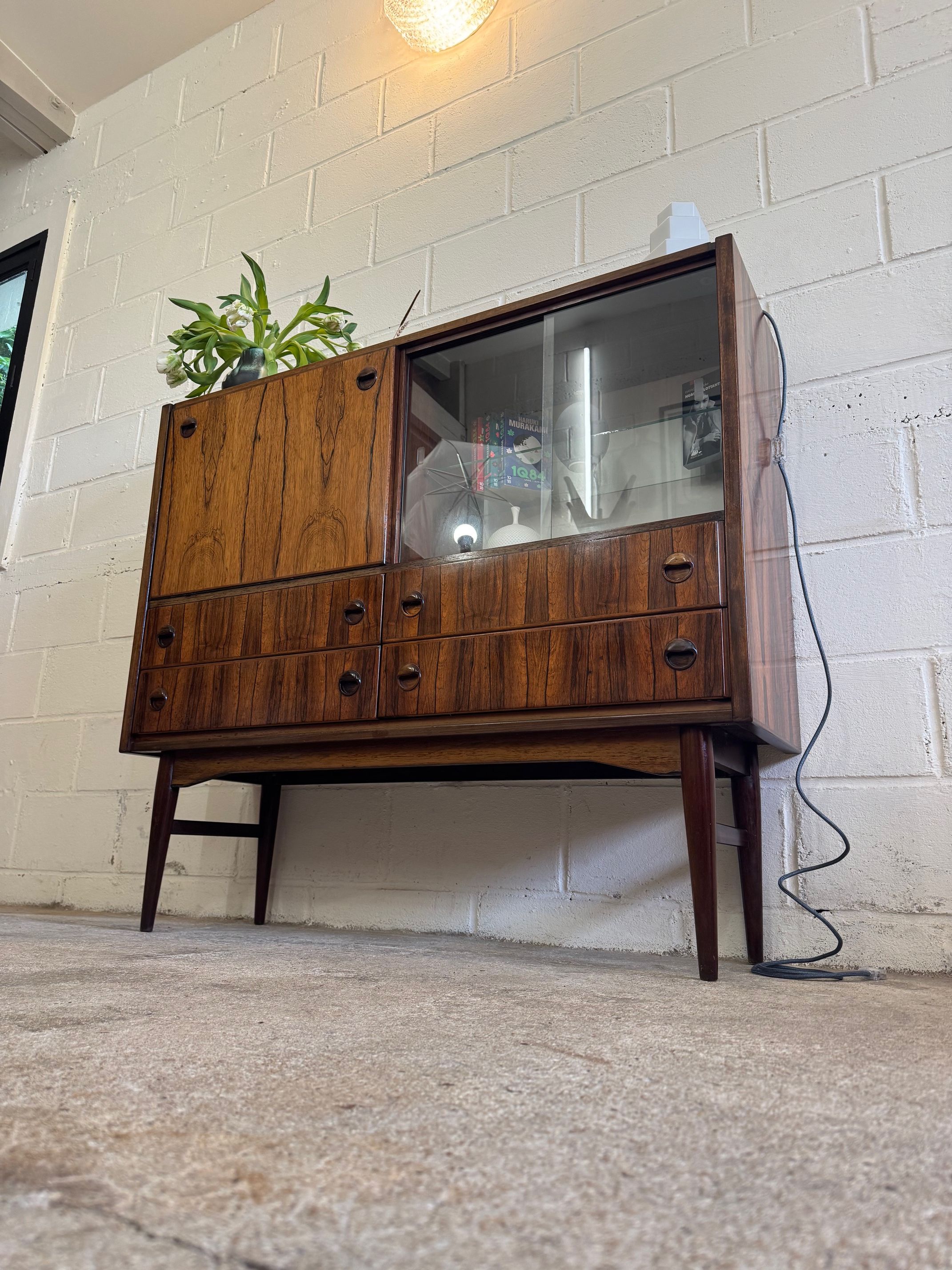 Un beau meuble de living années 60 en palissandre, fabrication française. Il dispose d'un espace bar avec abattant et petite étagère en verre, un espace vitrine avec étagère également et de 4 tiroirs.