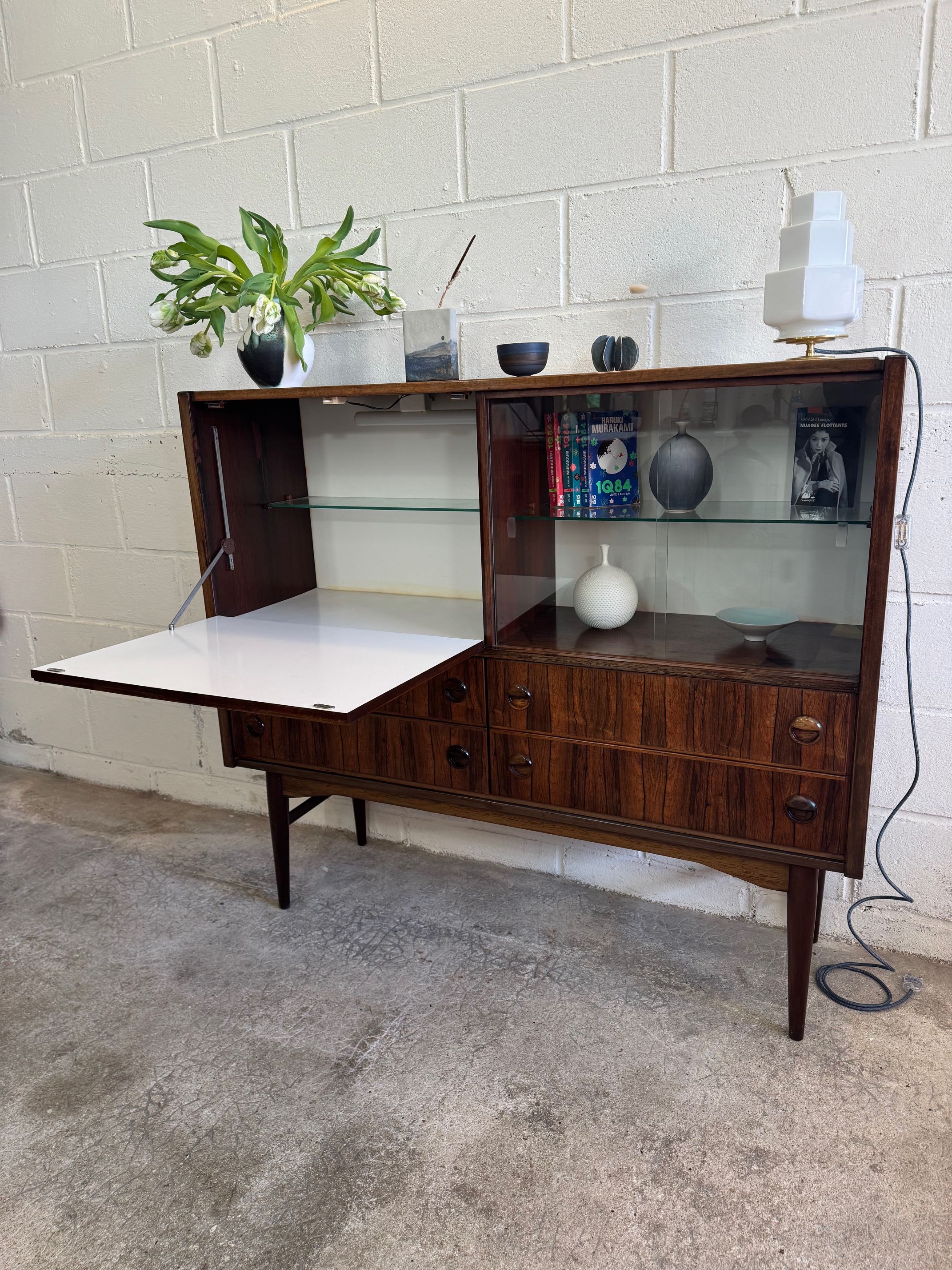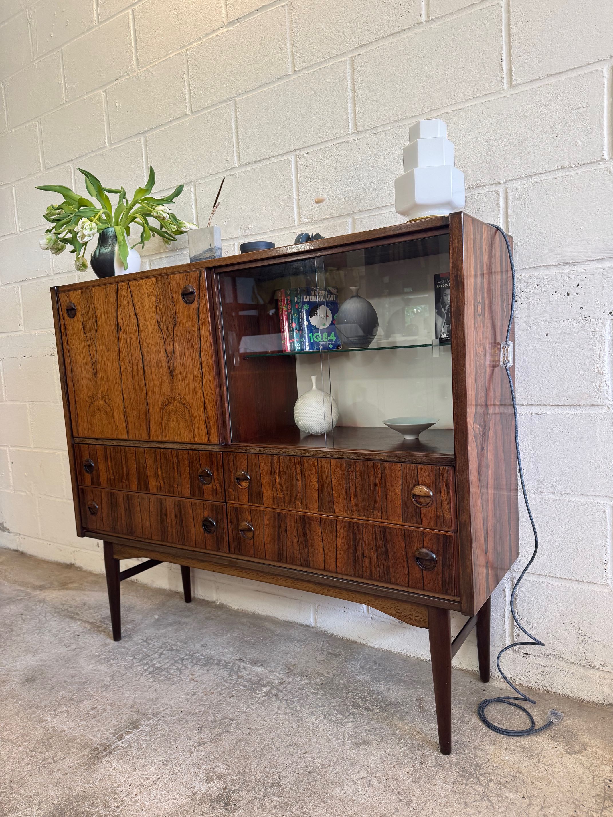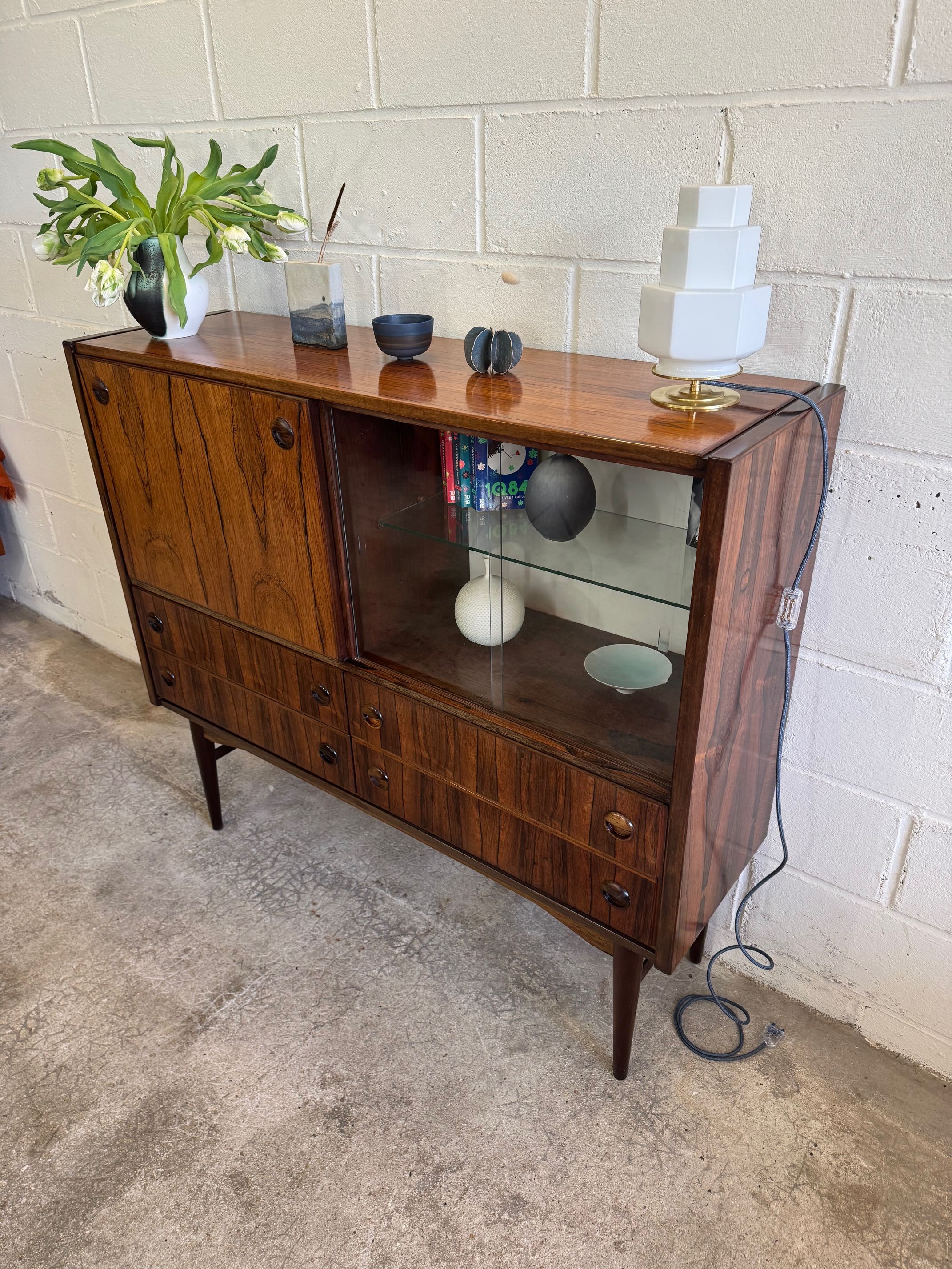 Un beau meuble de living années 60 en palissandre, fabrication française. Il dispose d'un espace bar avec abattant et petite étagère en verre, un espace vitrine avec étagère également et de 4 tiroirs.