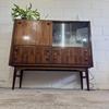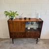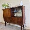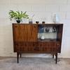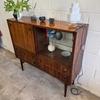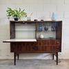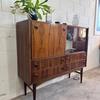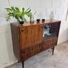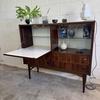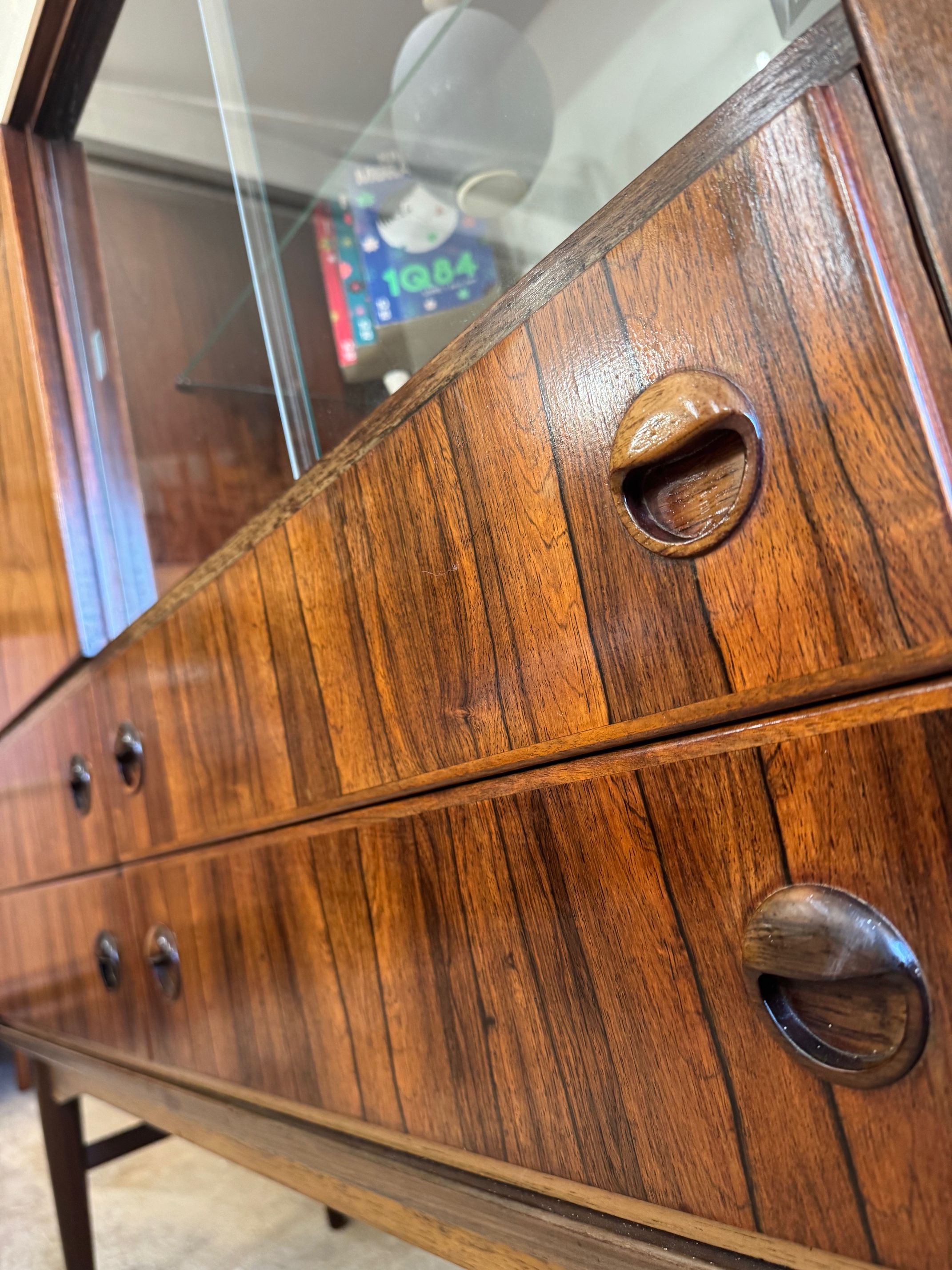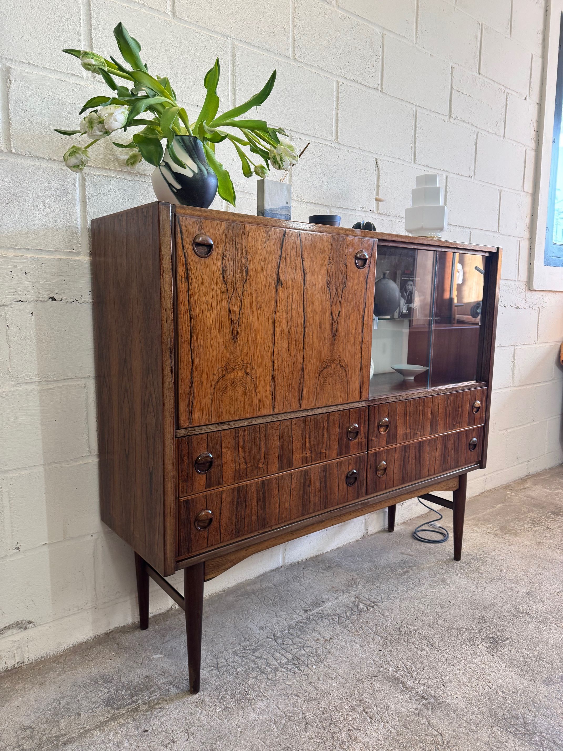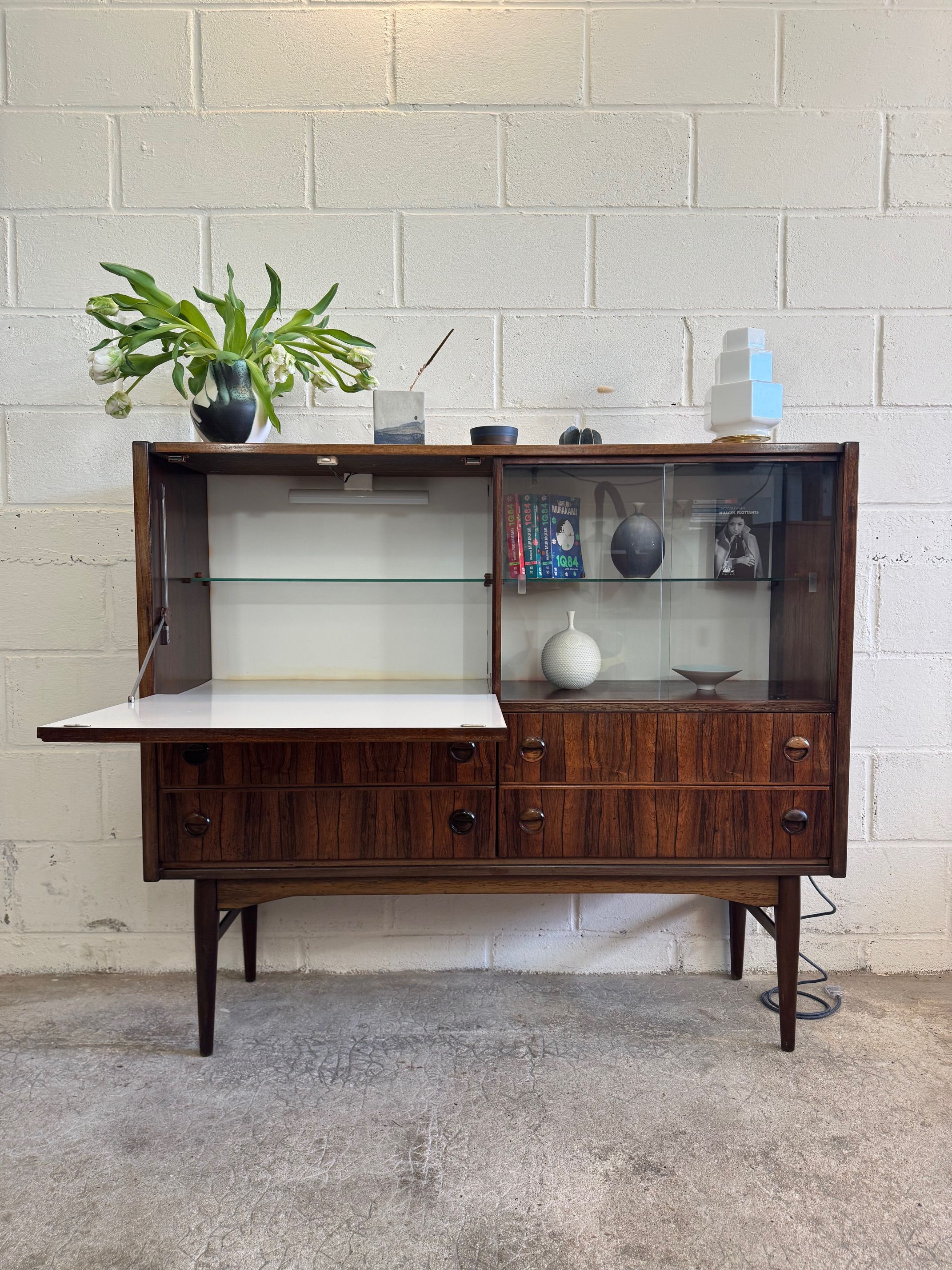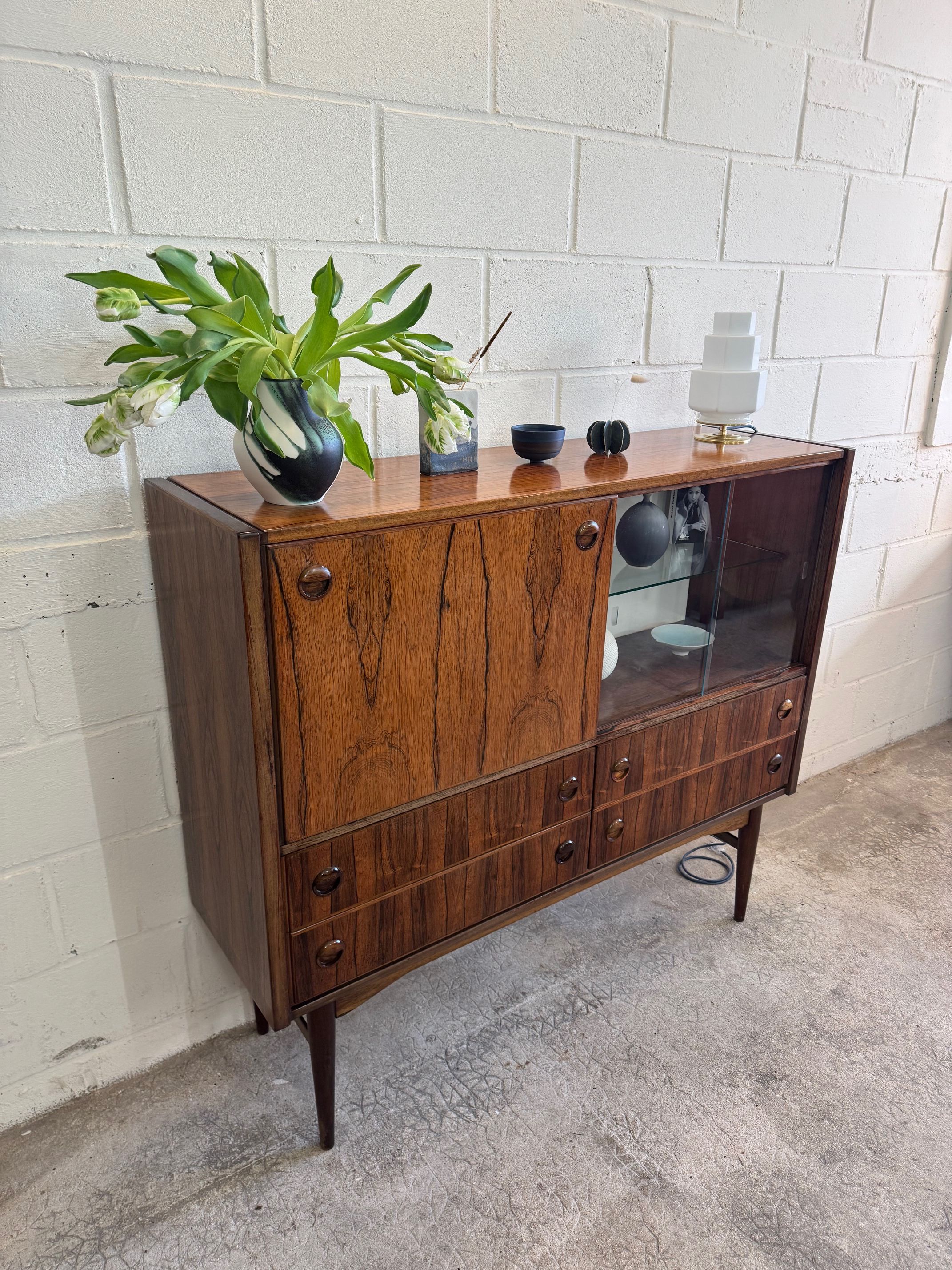Un beau meuble de living années 60 en palissandre, fabrication française. Il dispose d'un espace bar avec abattant et petite étagère en verre, un espace vitrine avec étagère également et de 4 tiroirs.