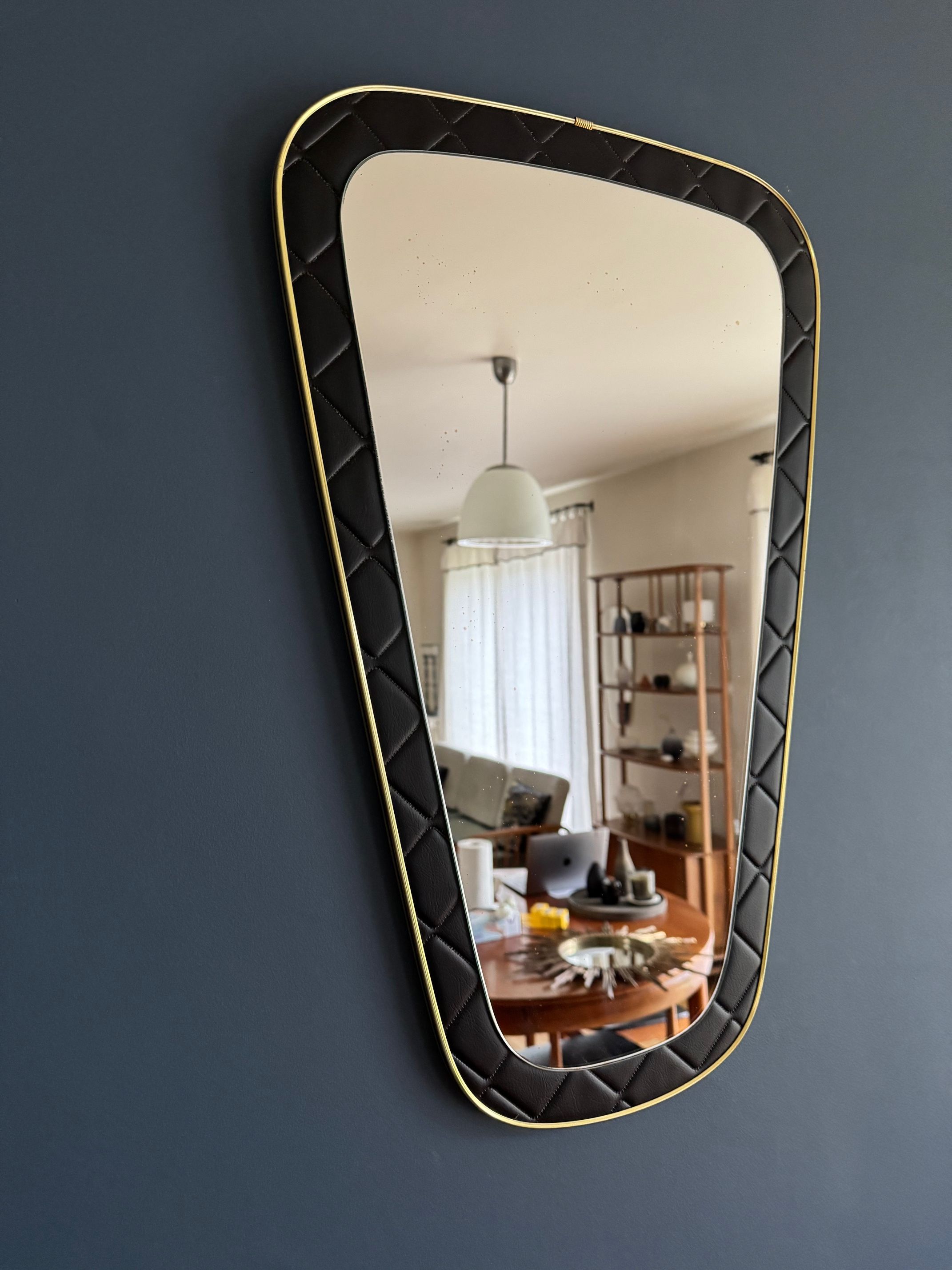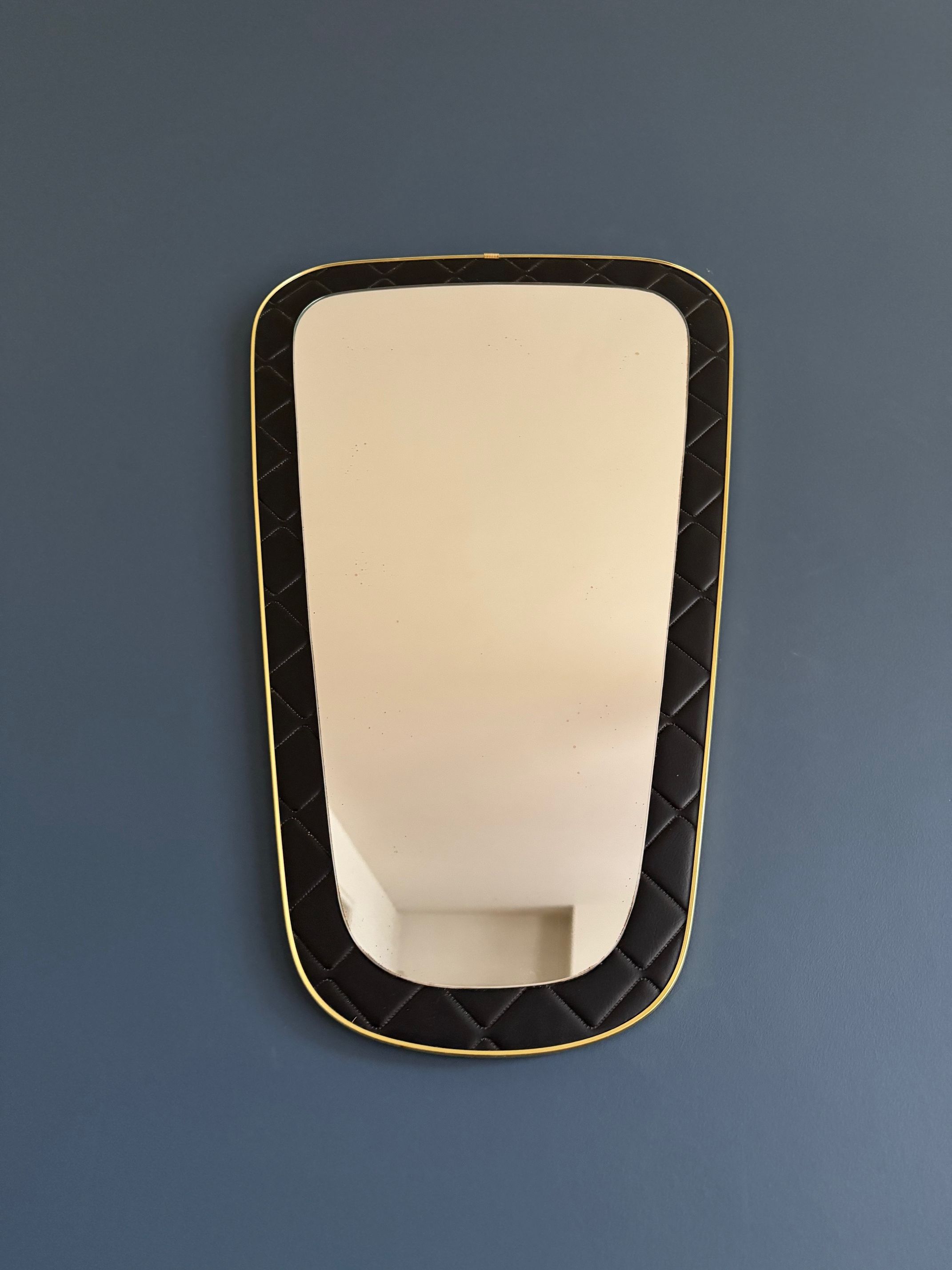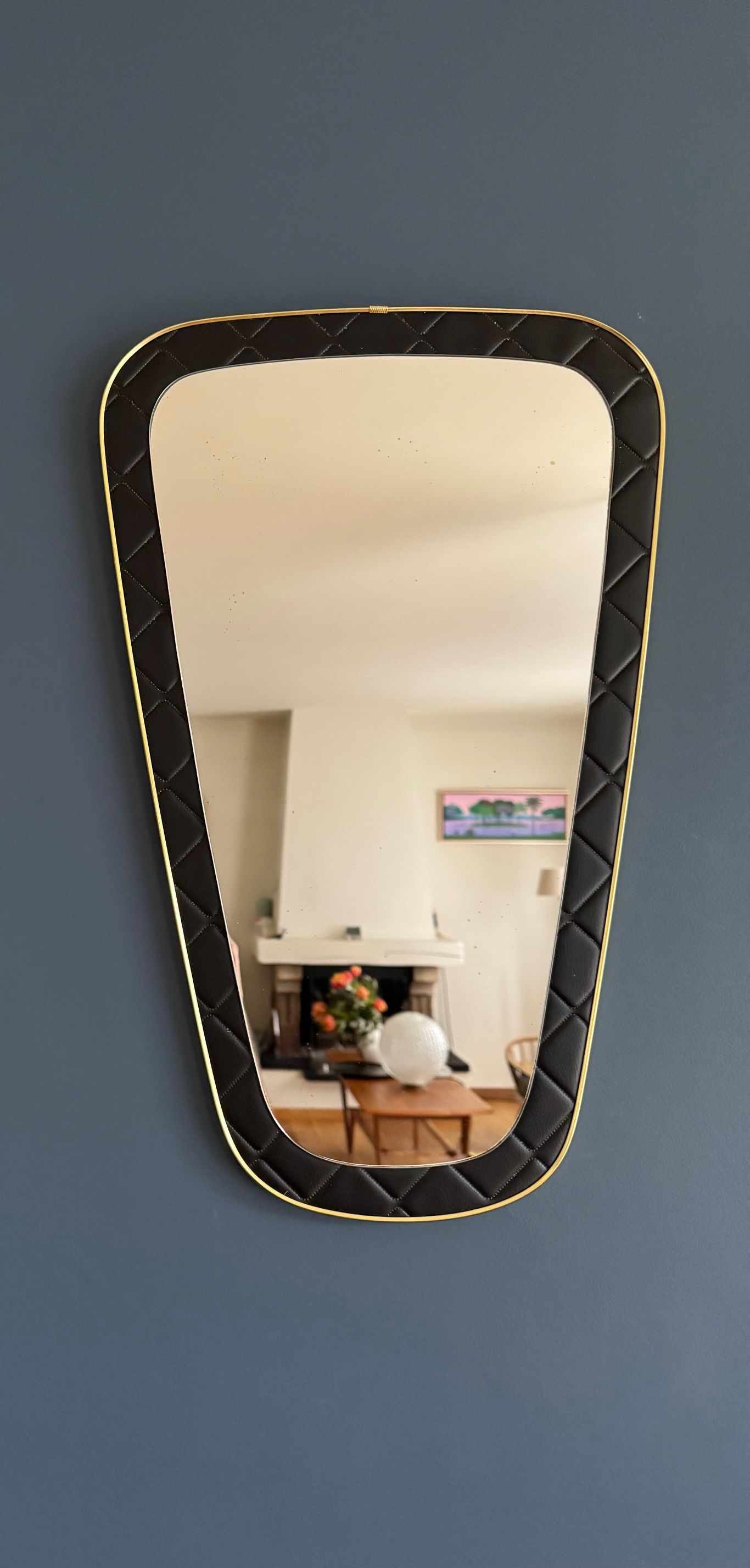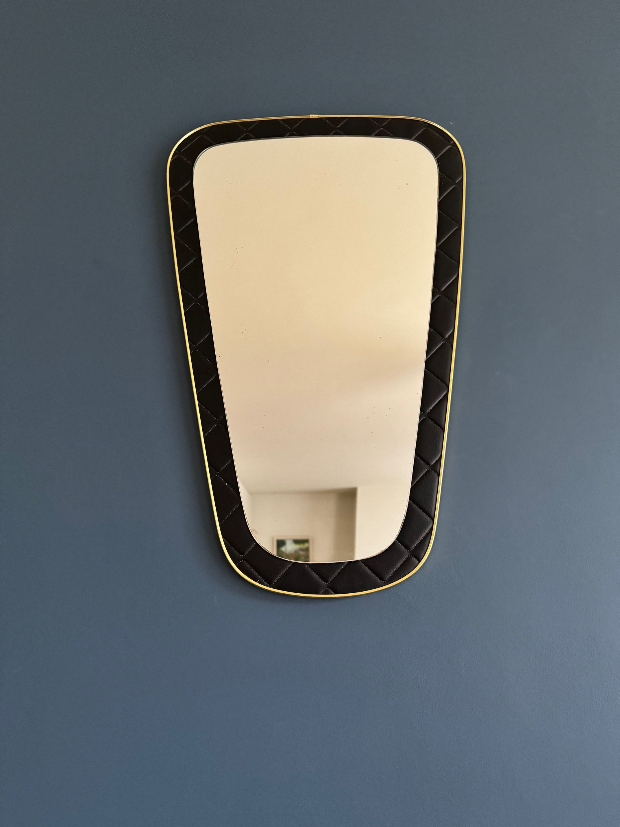Un miroir années 60 de forme dit "rétroviseur". Le cadre est en skaï noir d'inspiration Chesterfield.