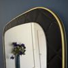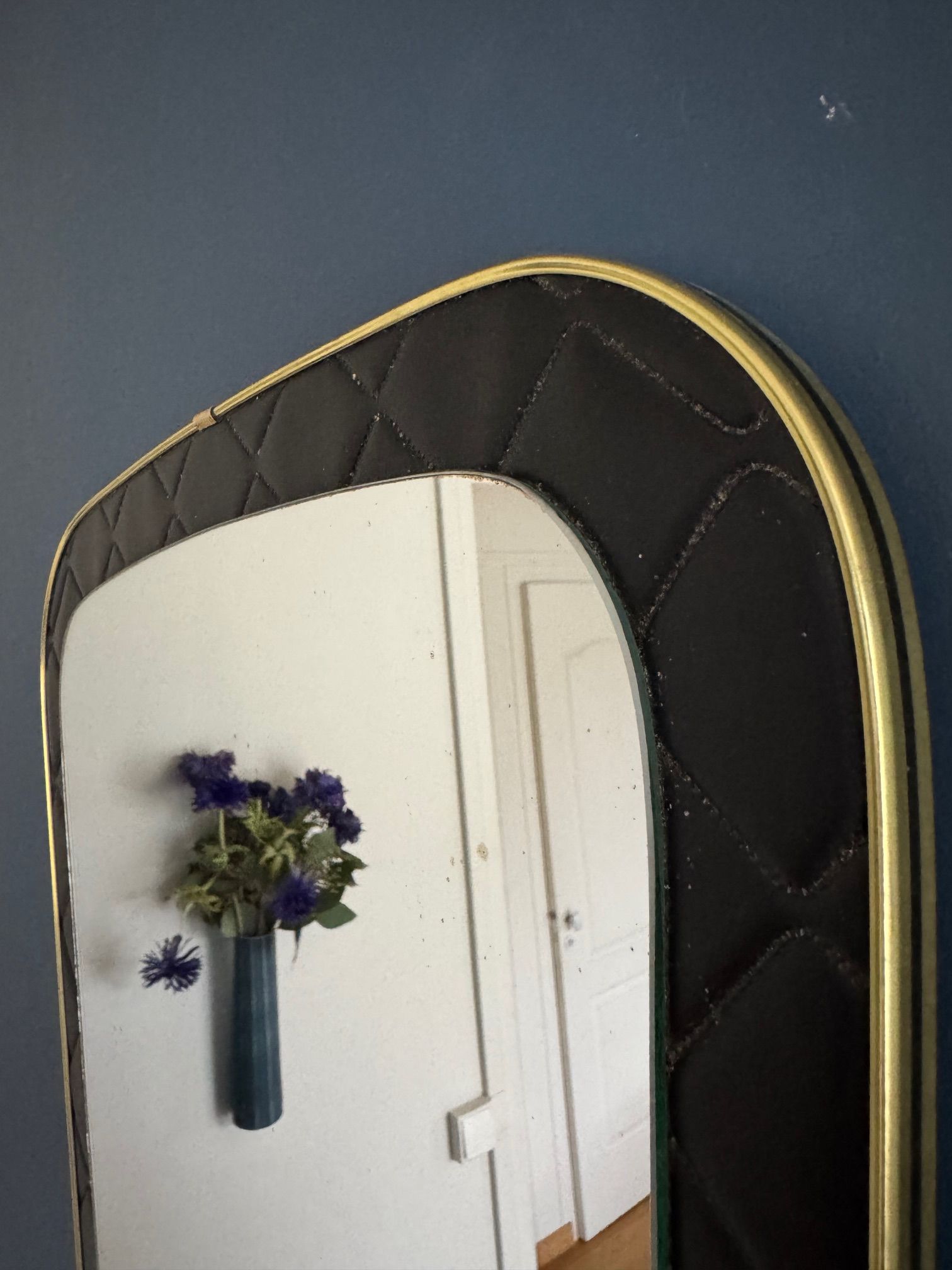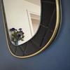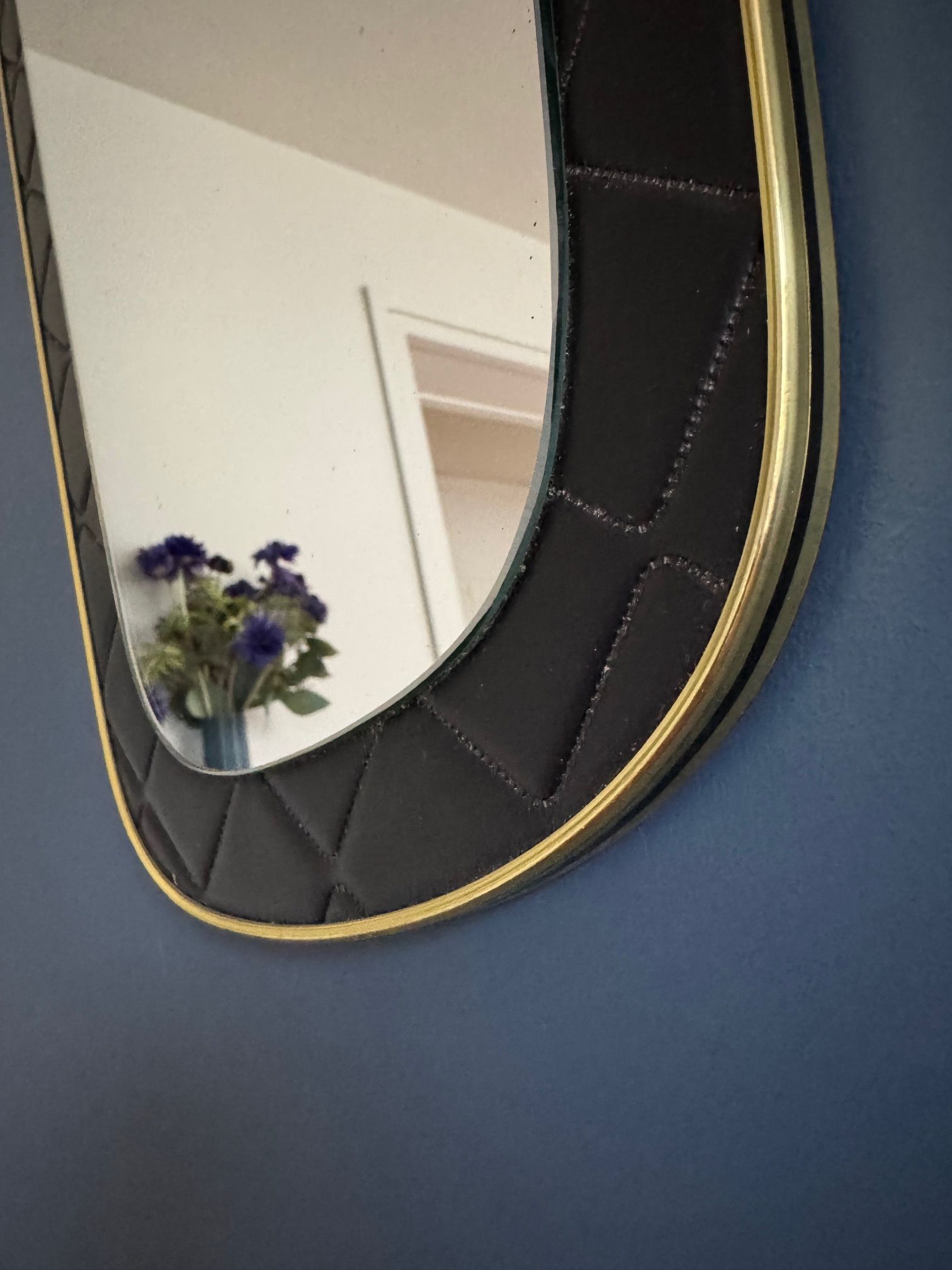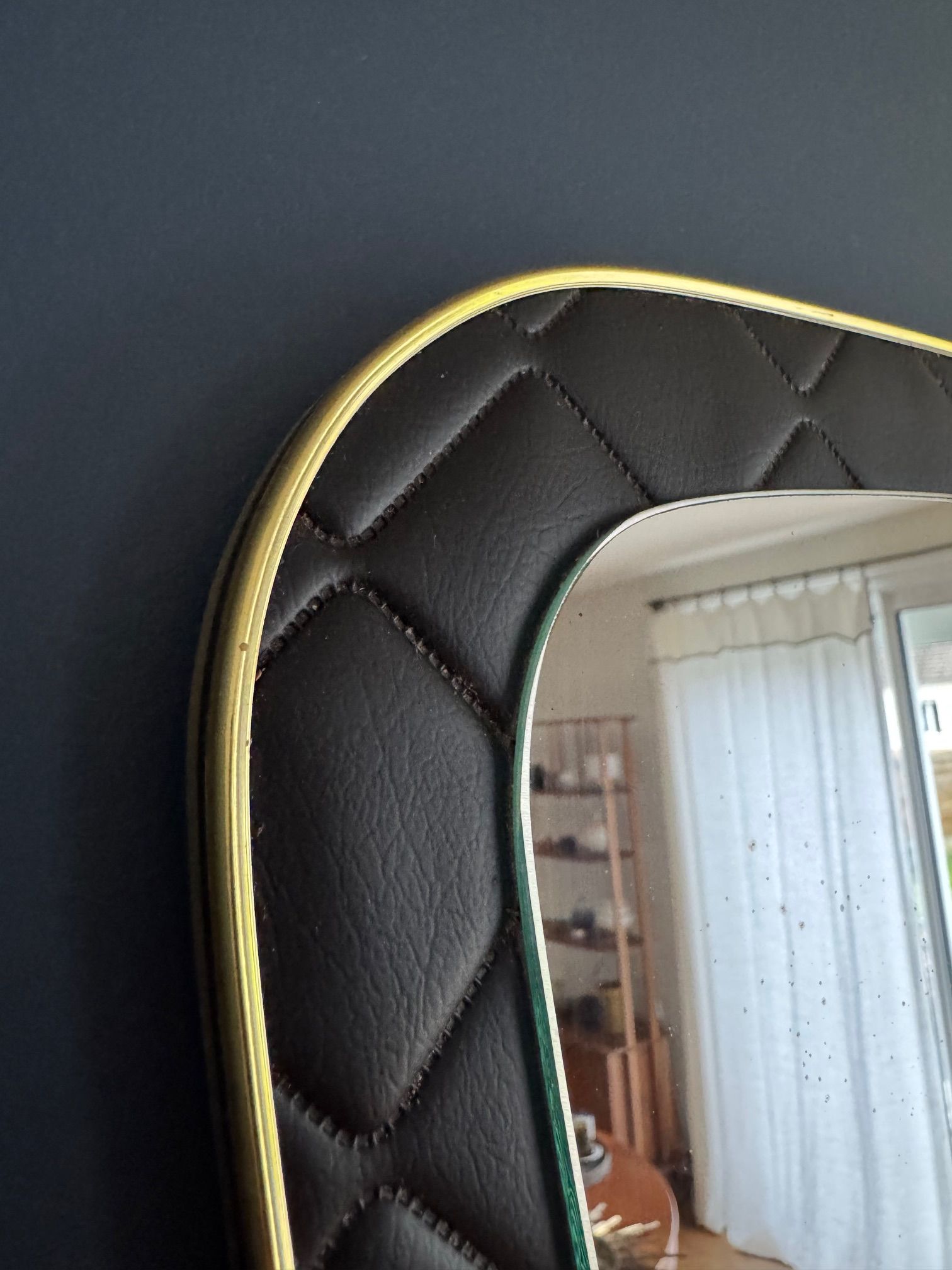 Un miroir années 60 de forme dit "rétroviseur". Le cadre est en skaï noir d'inspiration Chesterfield.
