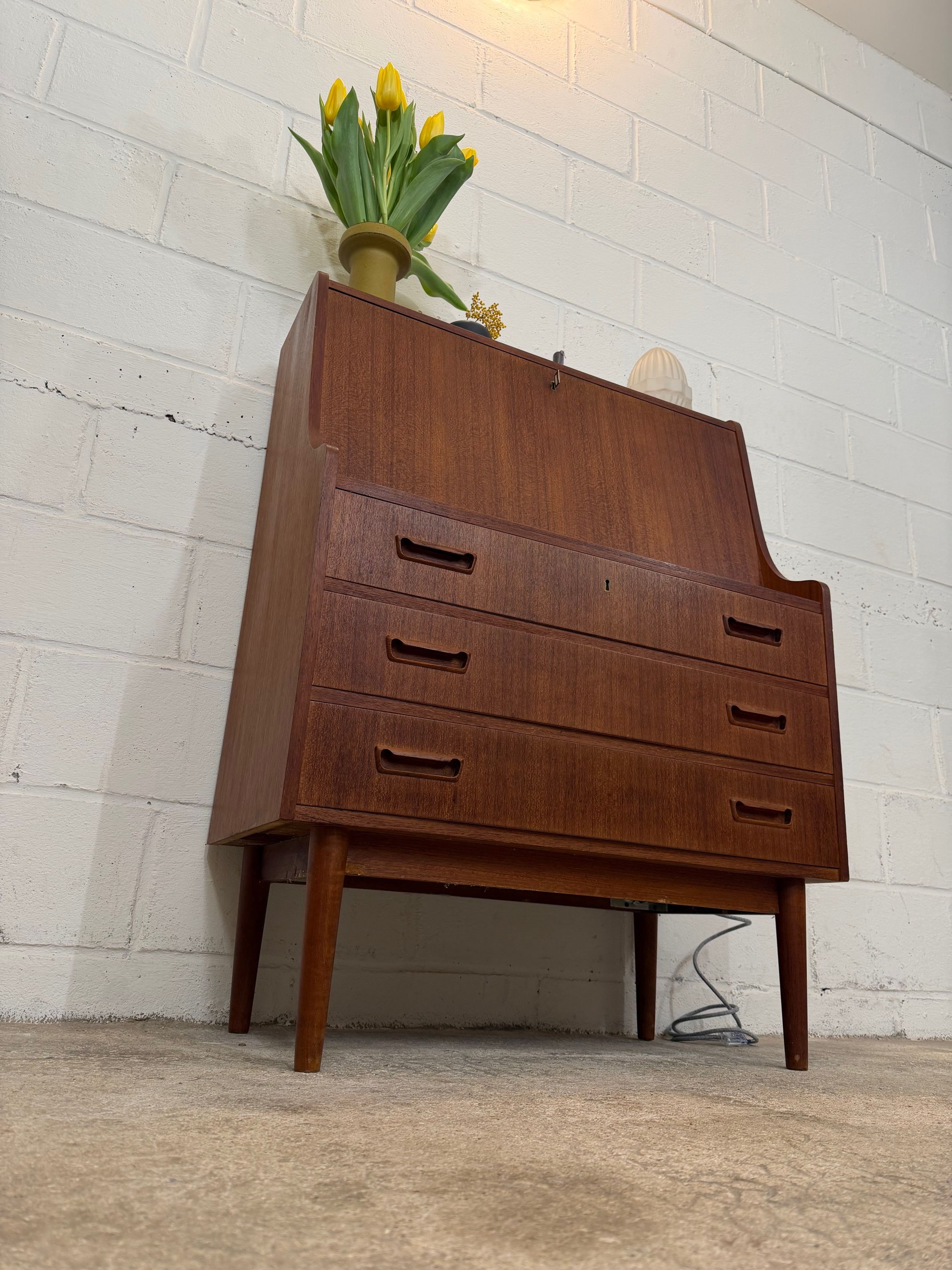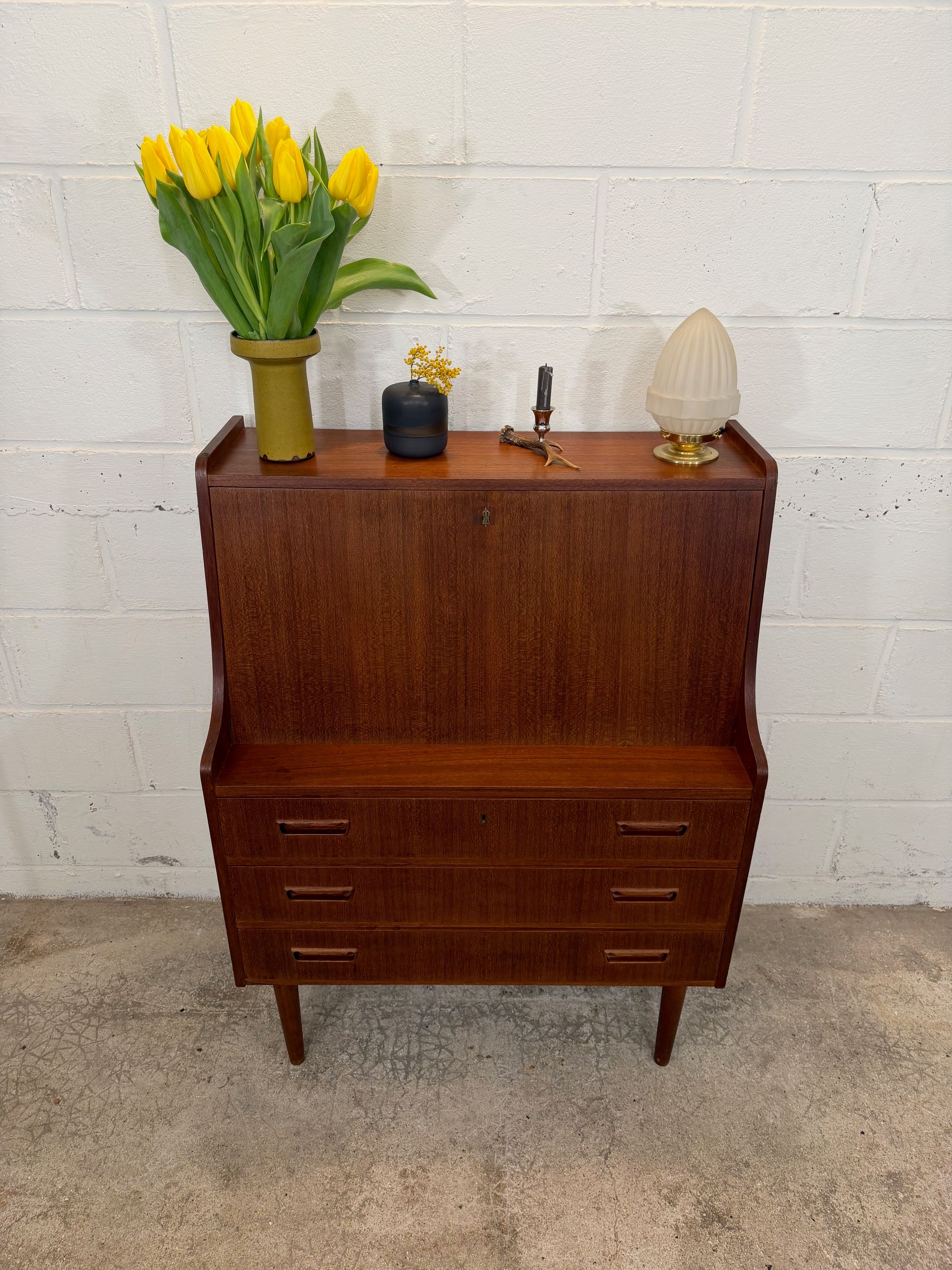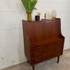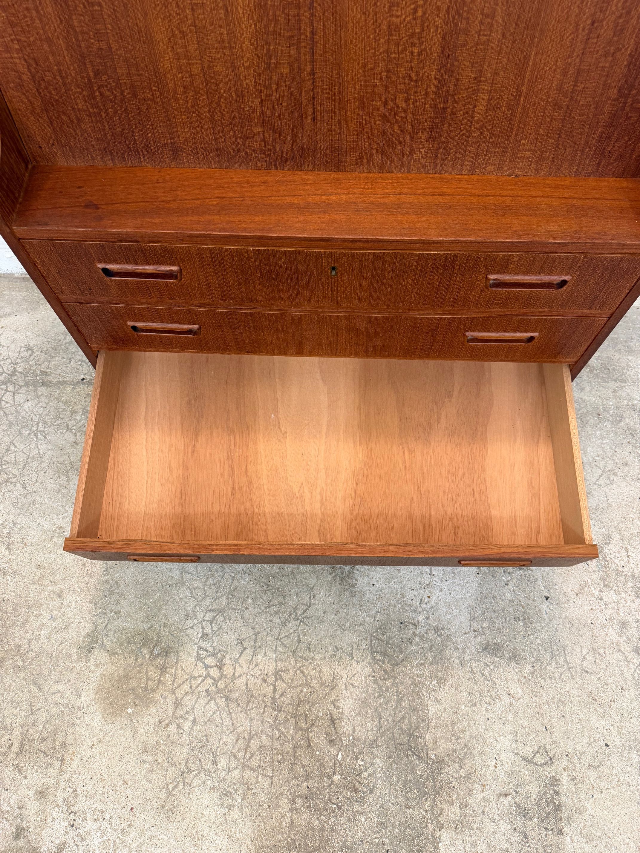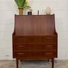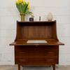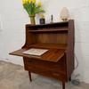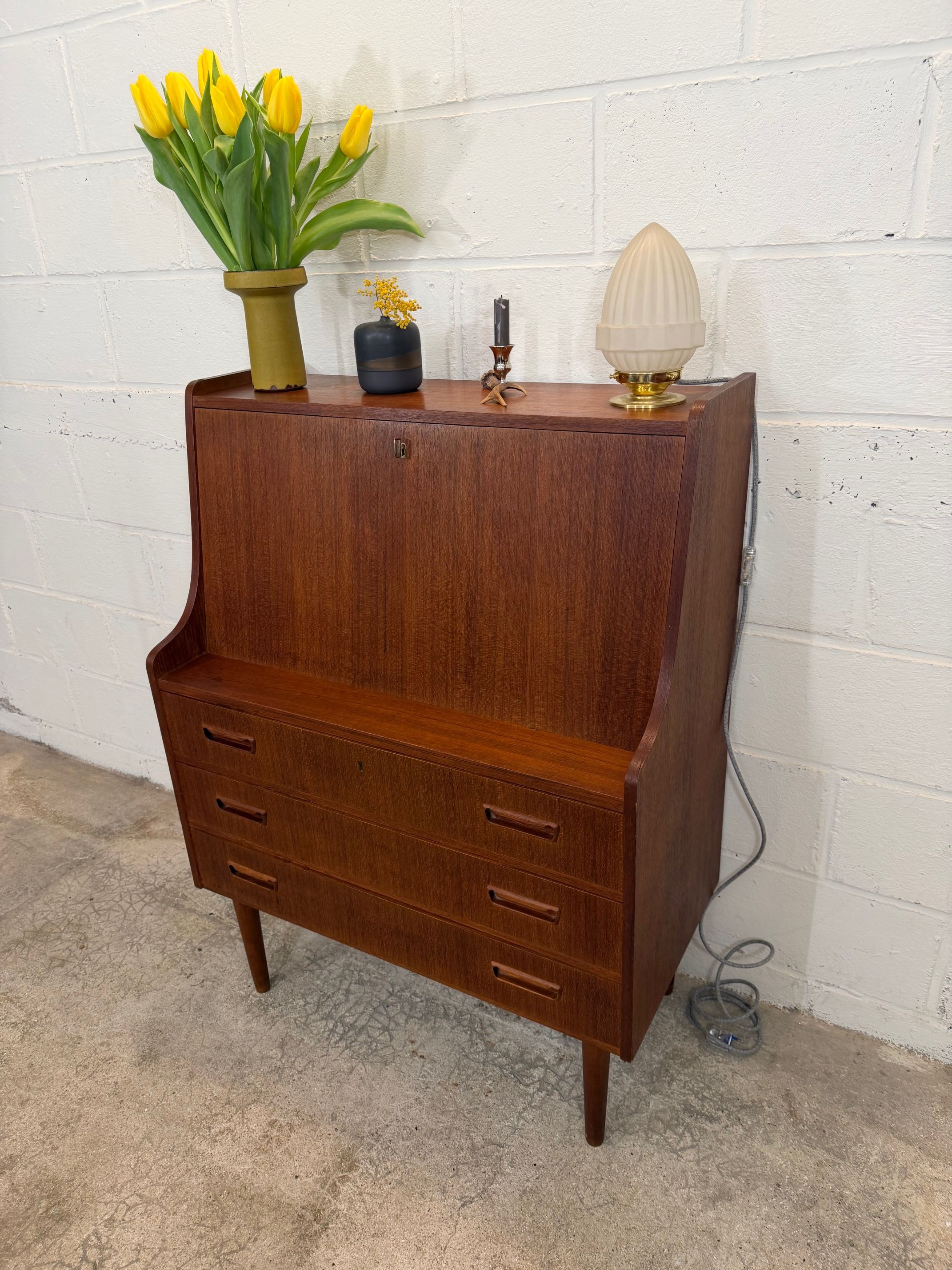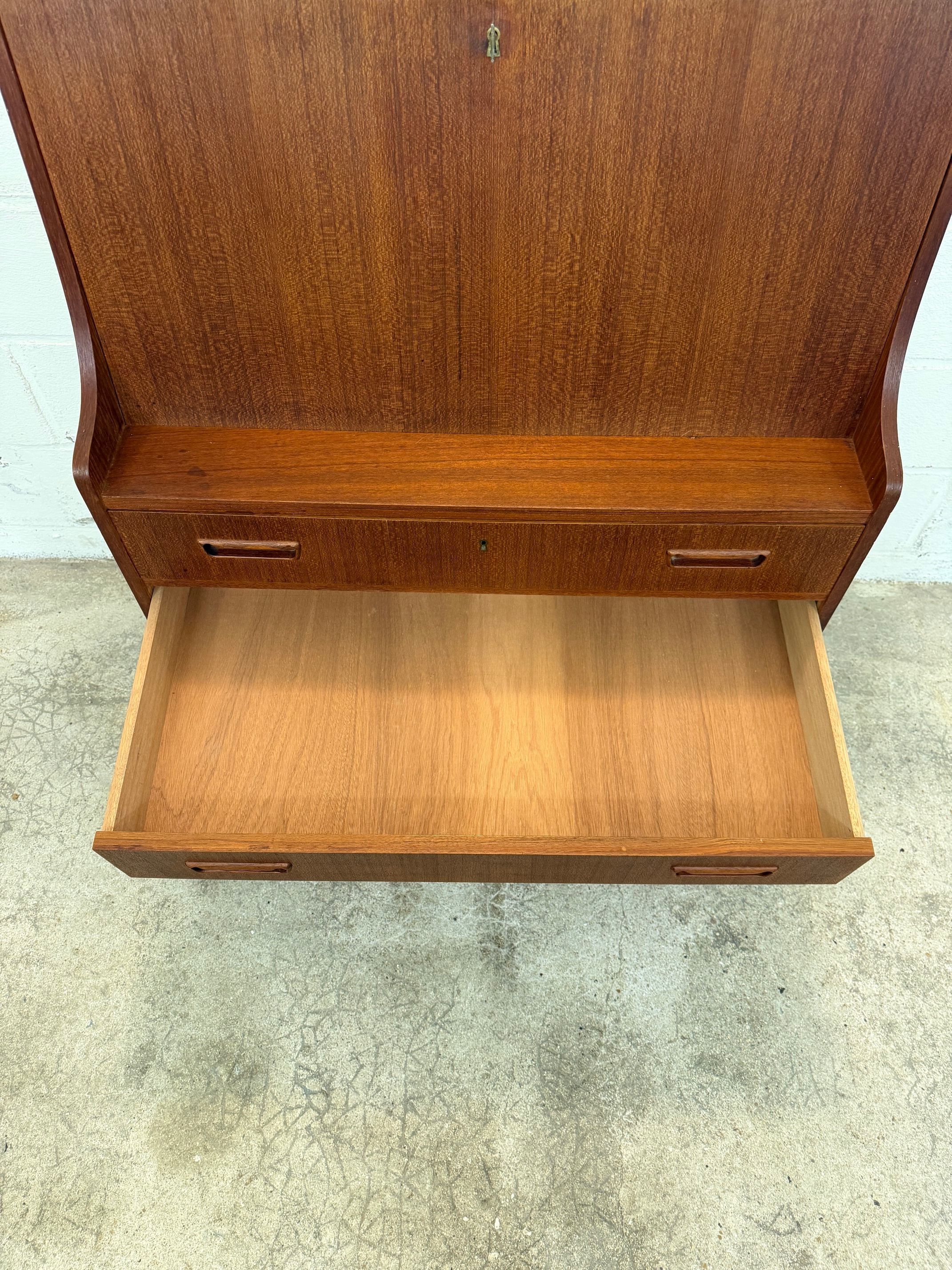 Un beau secrétaire en teck, édité au Danemark dans les années 60. Il dispose d'un confortable espace de bureau lorsque son abattant est ouvert et d'une partie commode ajoutant de l'espace de rangement.