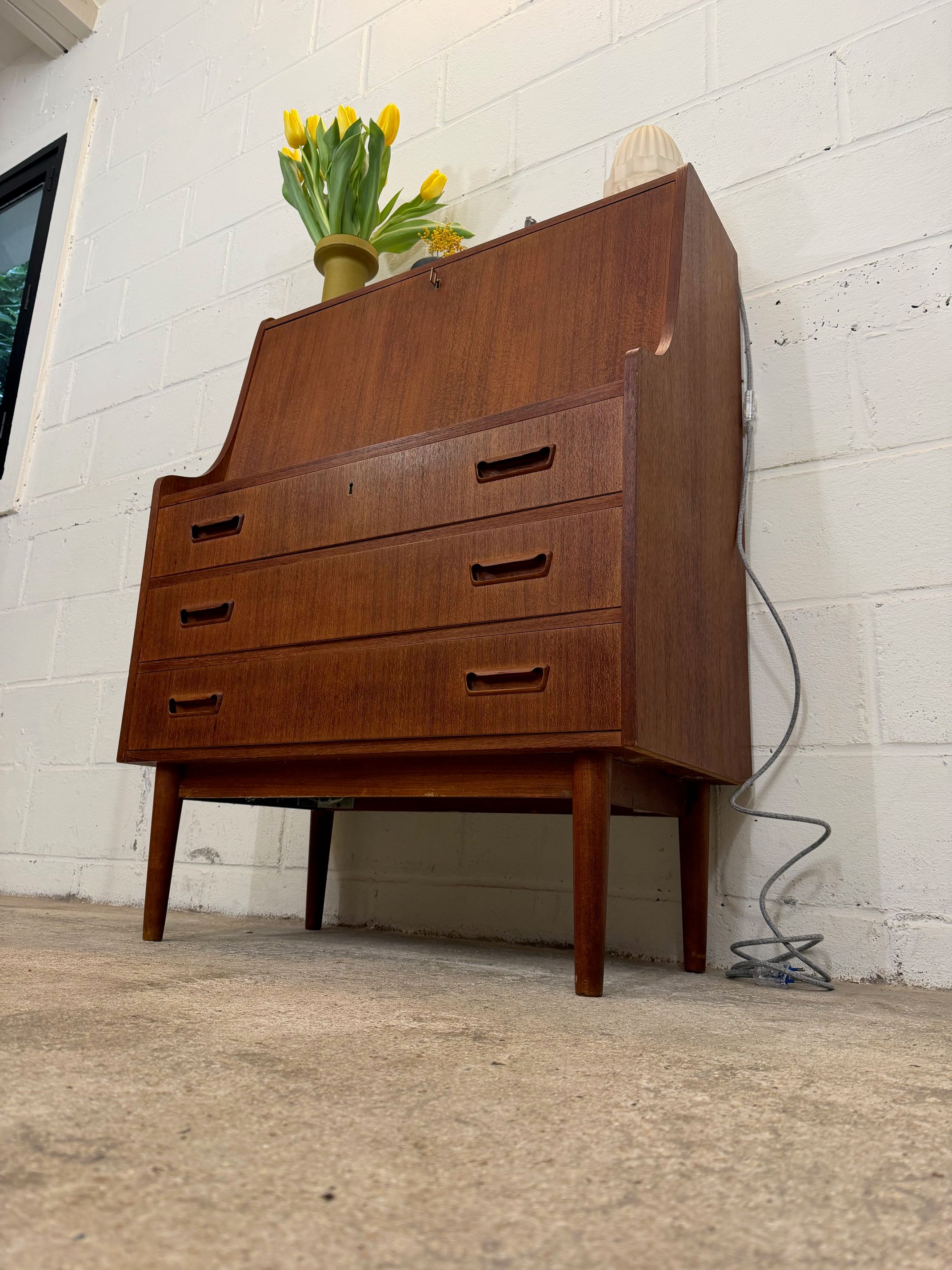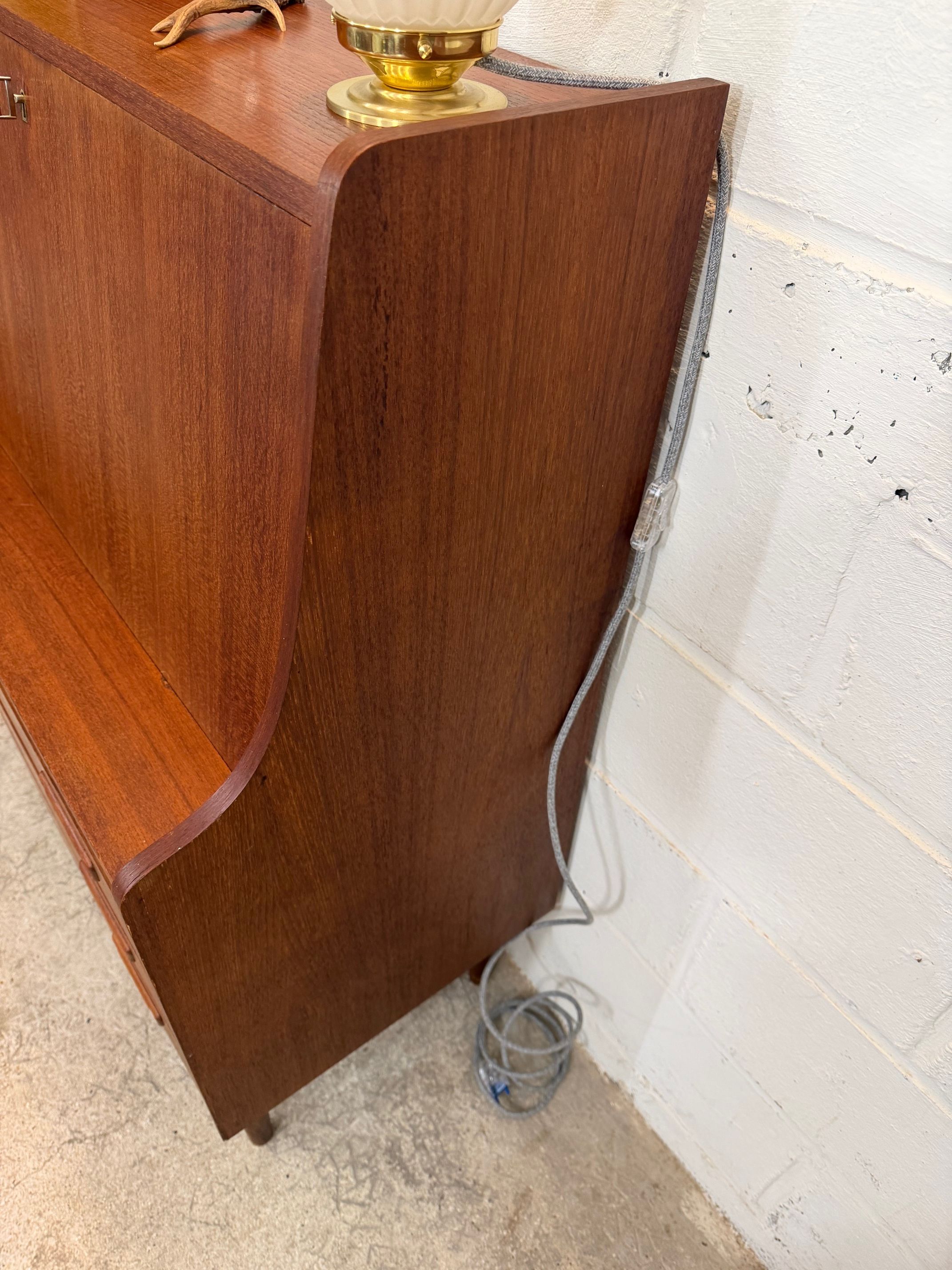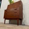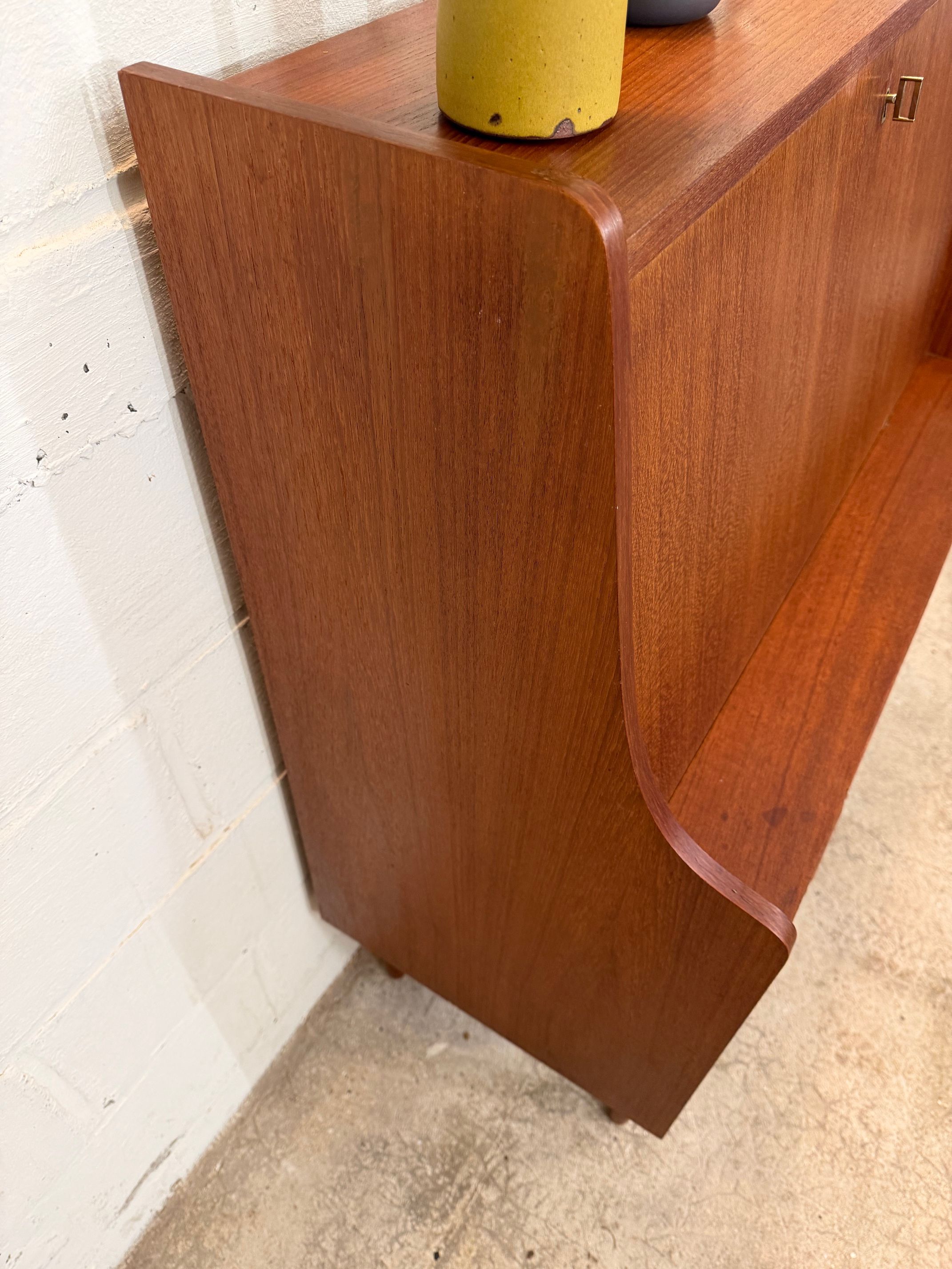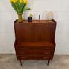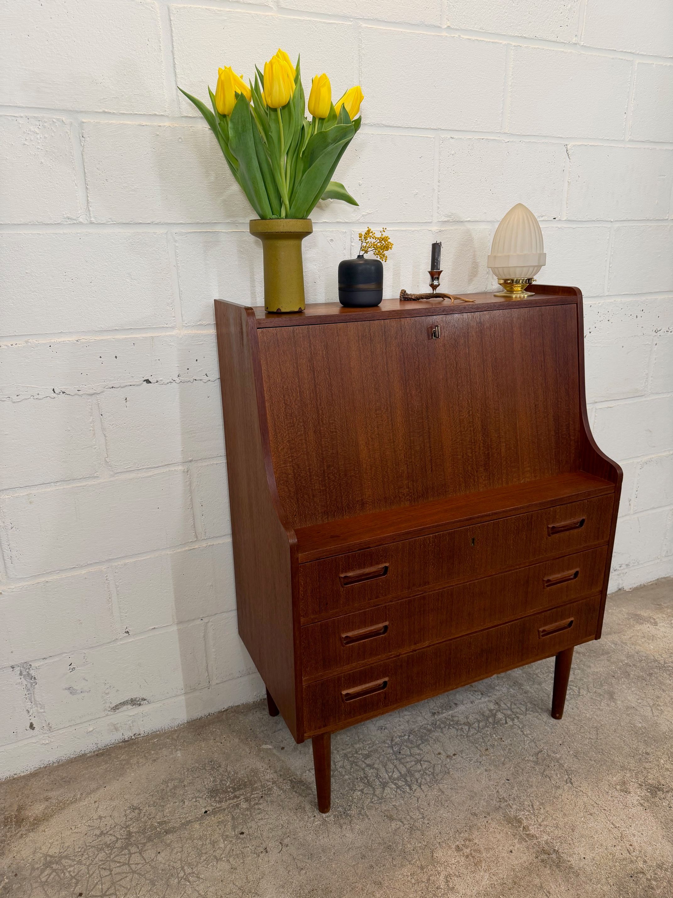 Un beau secrétaire en teck, édité au Danemark dans les années 60. Il dispose d'un confortable espace de bureau lorsque son abattant est ouvert et d'une partie commode ajoutant de l'espace de rangement.