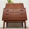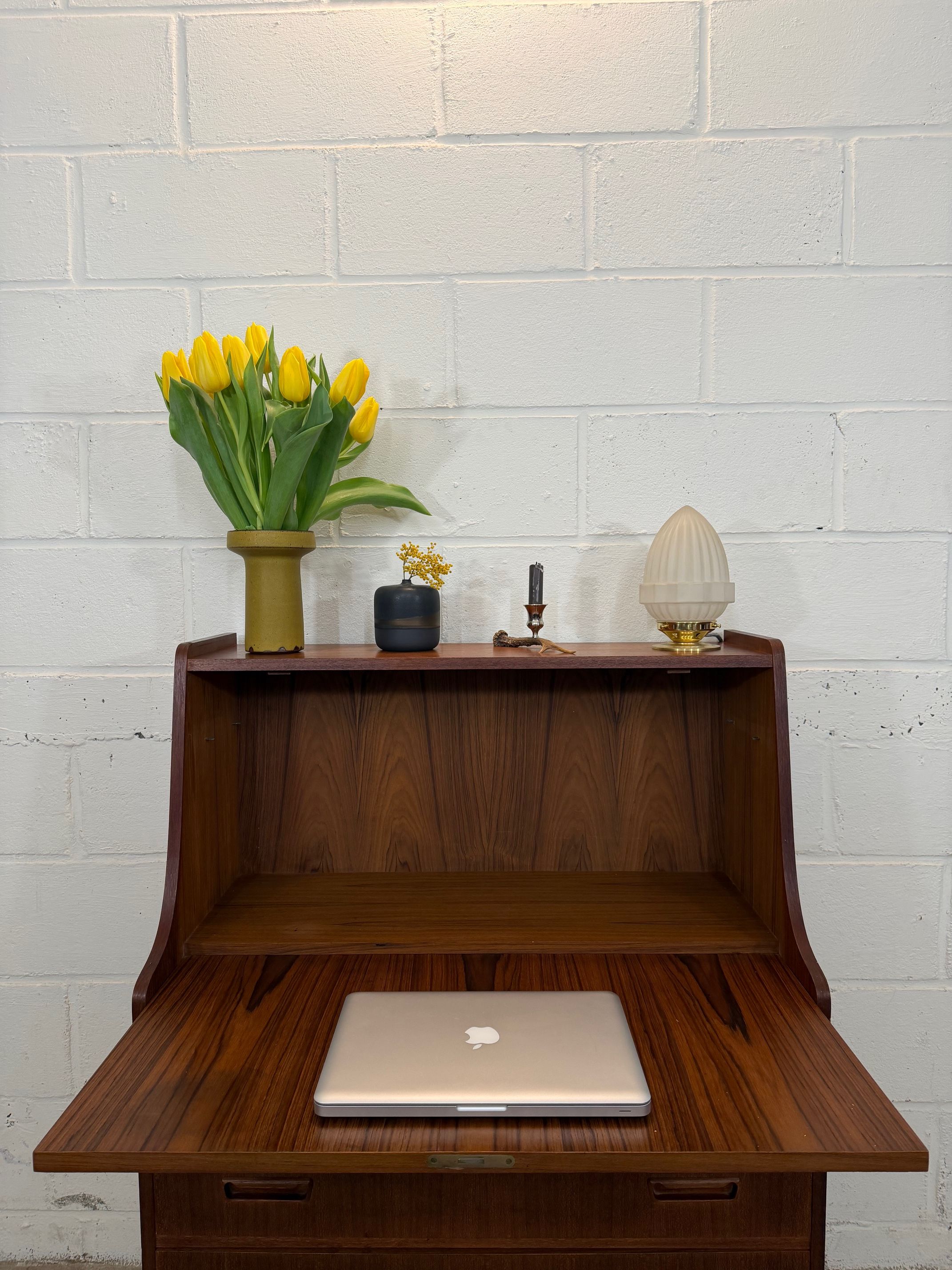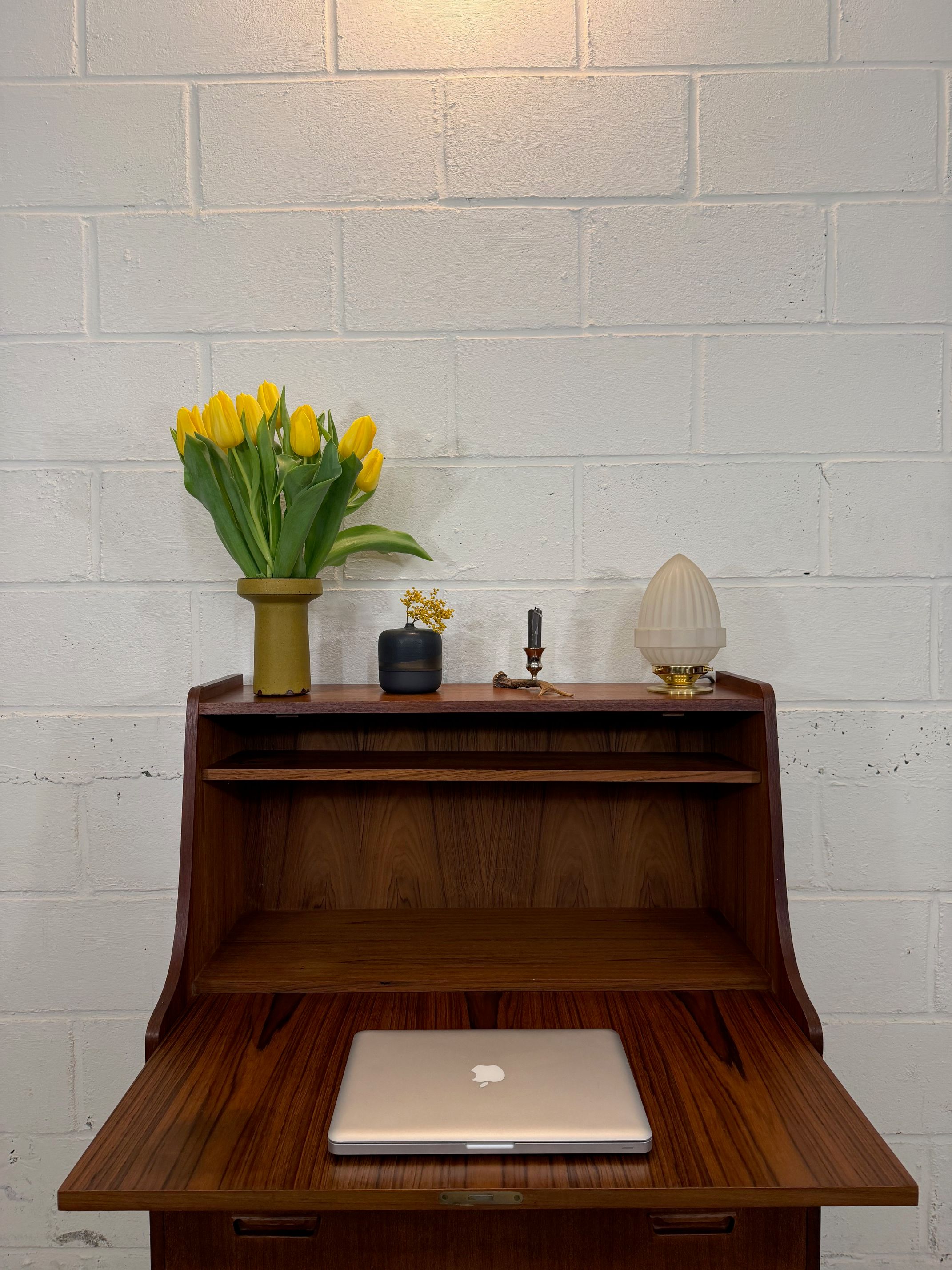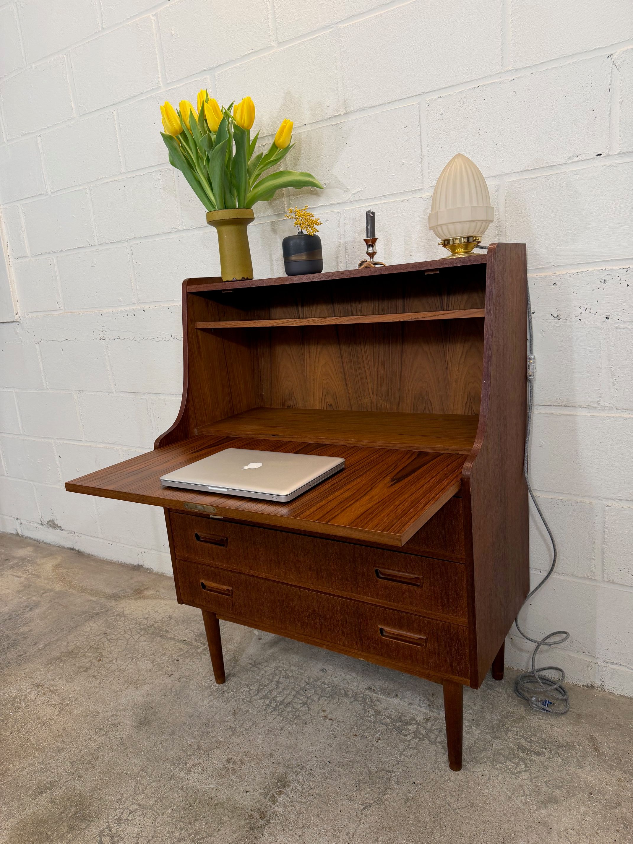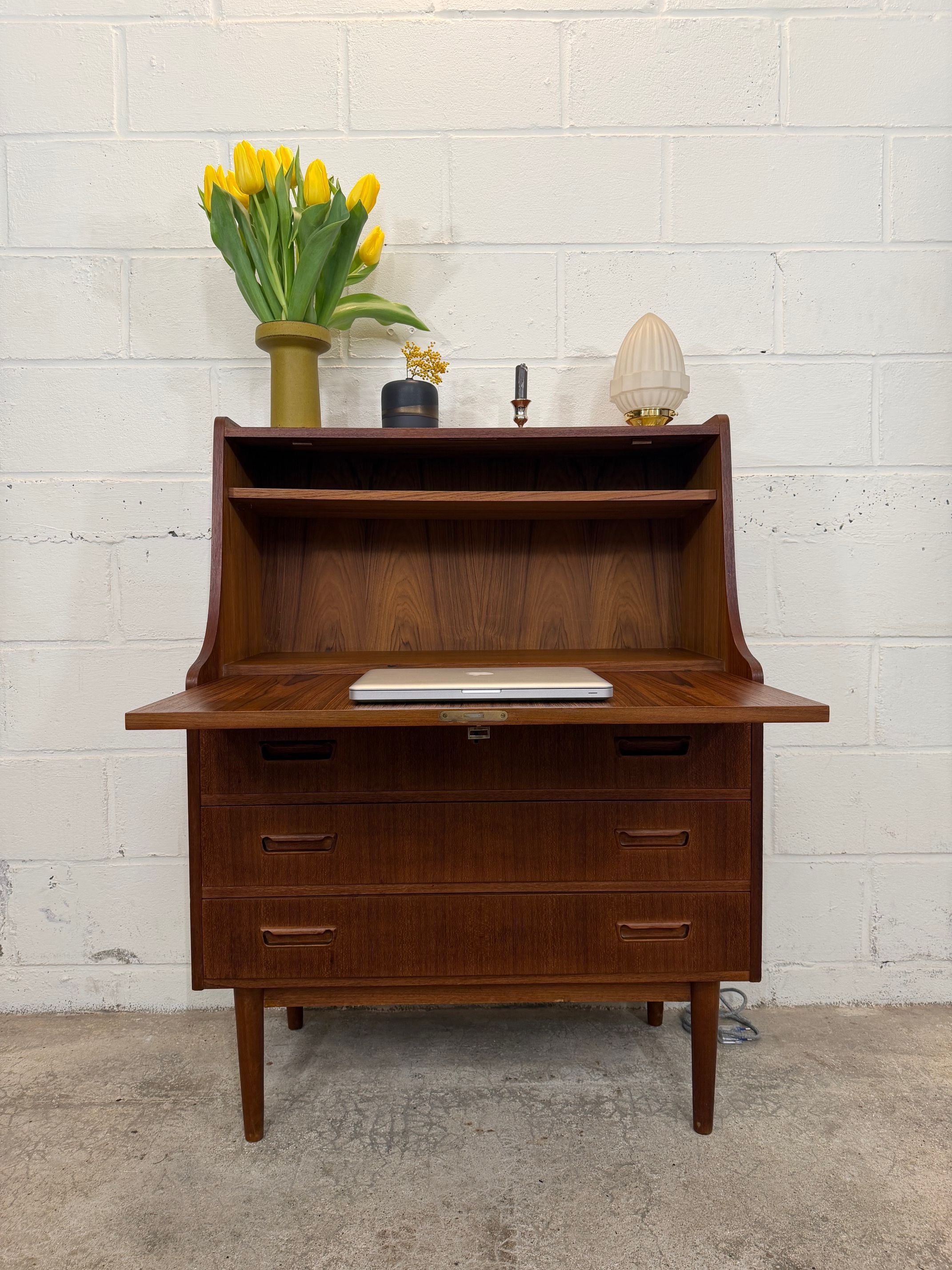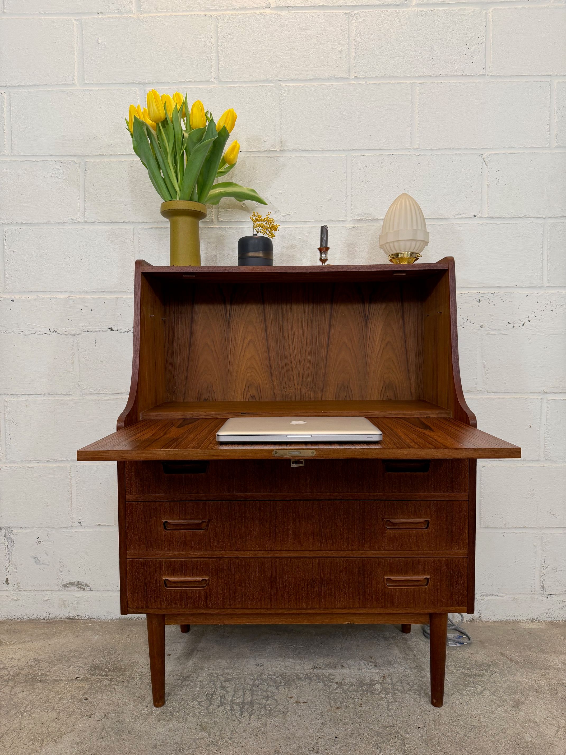 Un beau secrétaire en teck, édité au Danemark dans les années 60. Il dispose d'un confortable espace de bureau lorsque son abattant est ouvert et d'une partie commode ajoutant de l'espace de rangement.