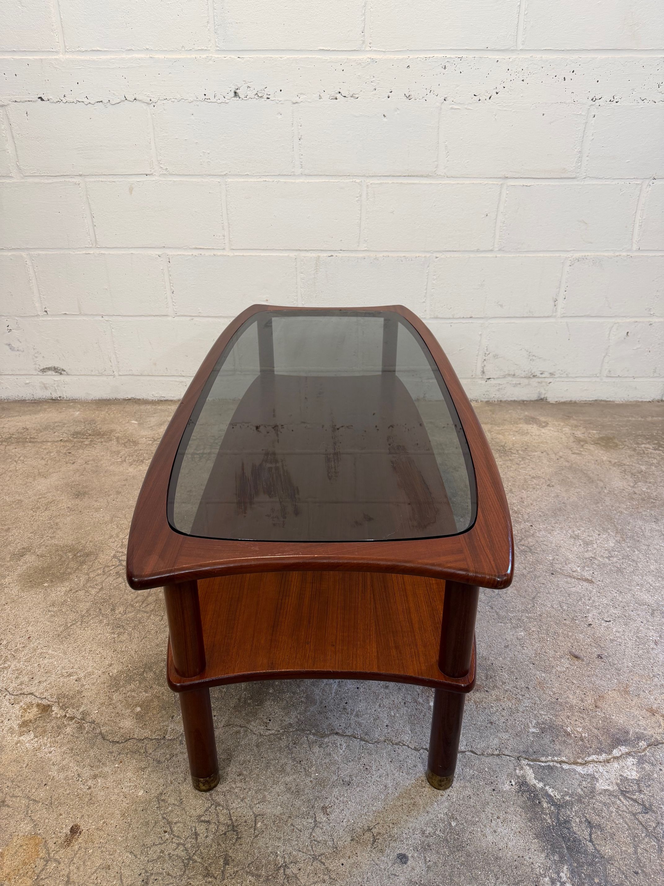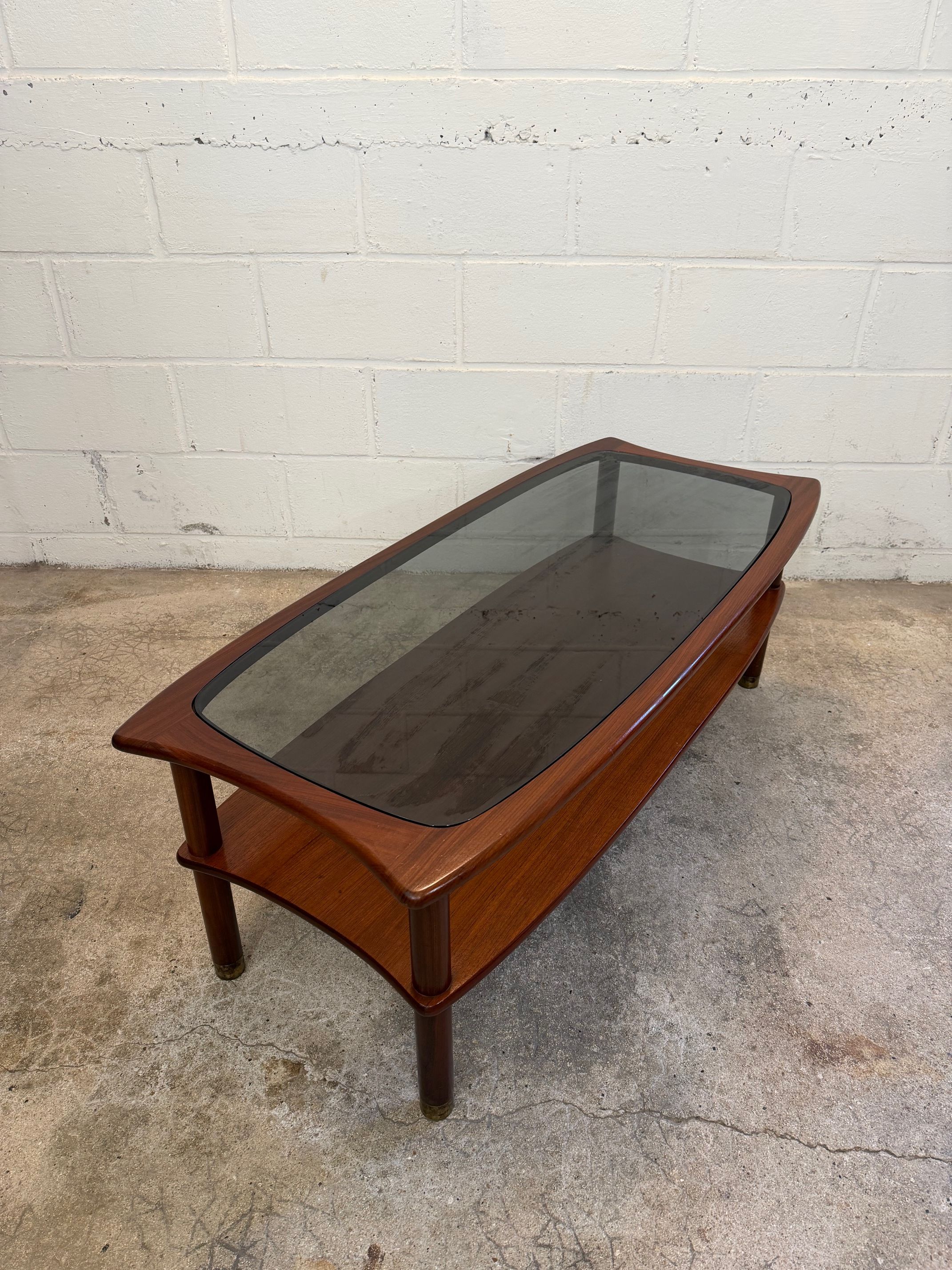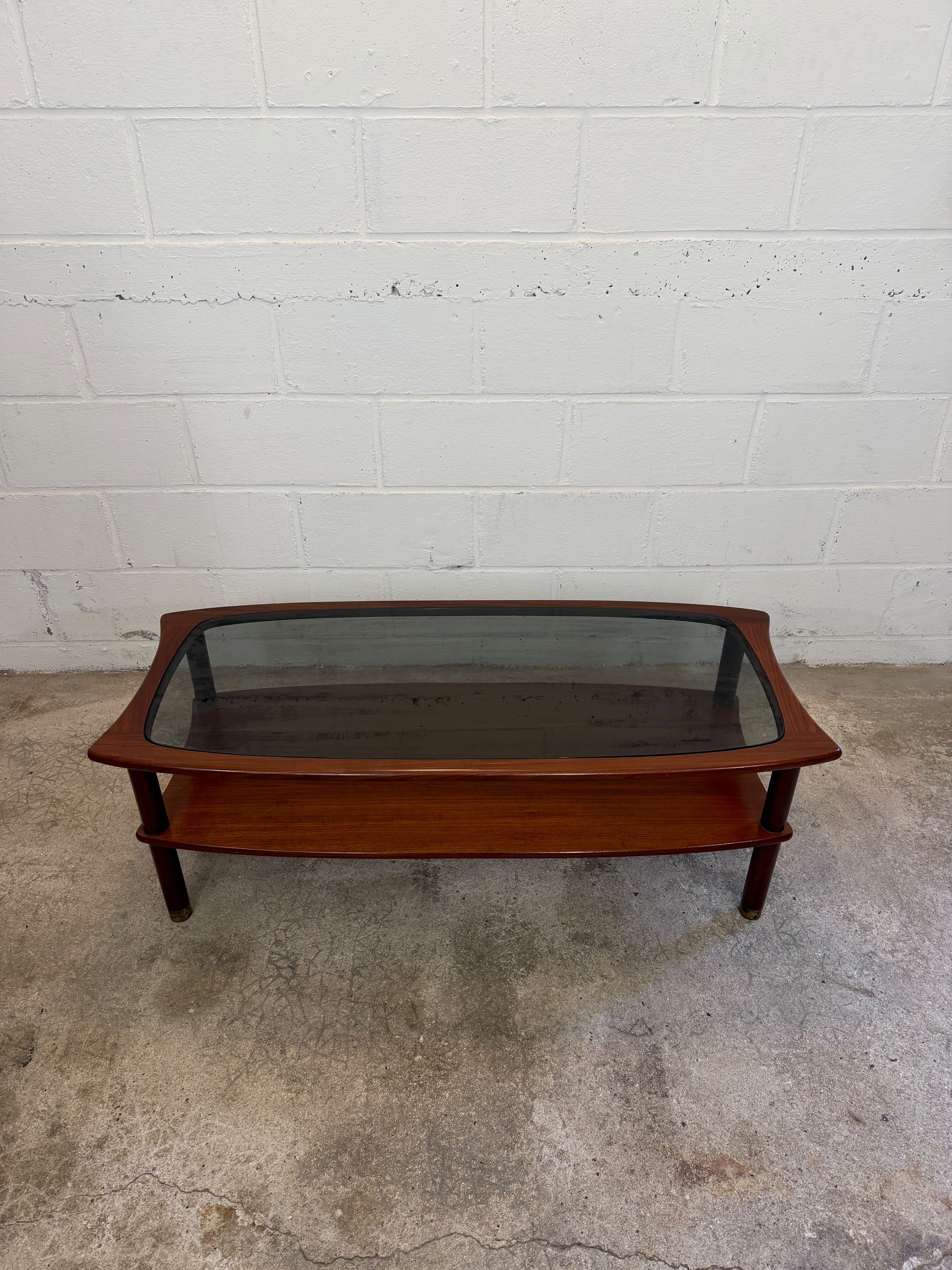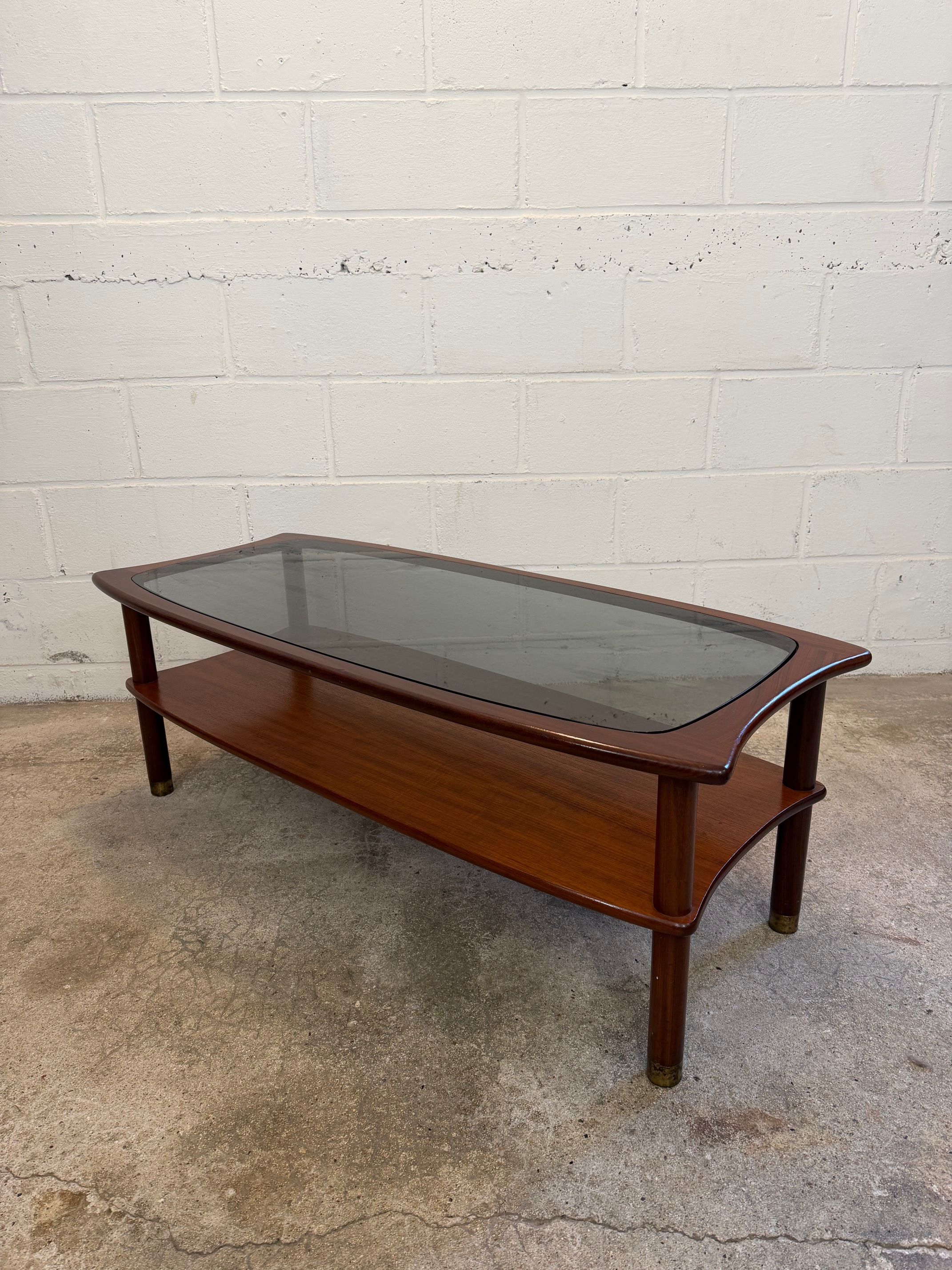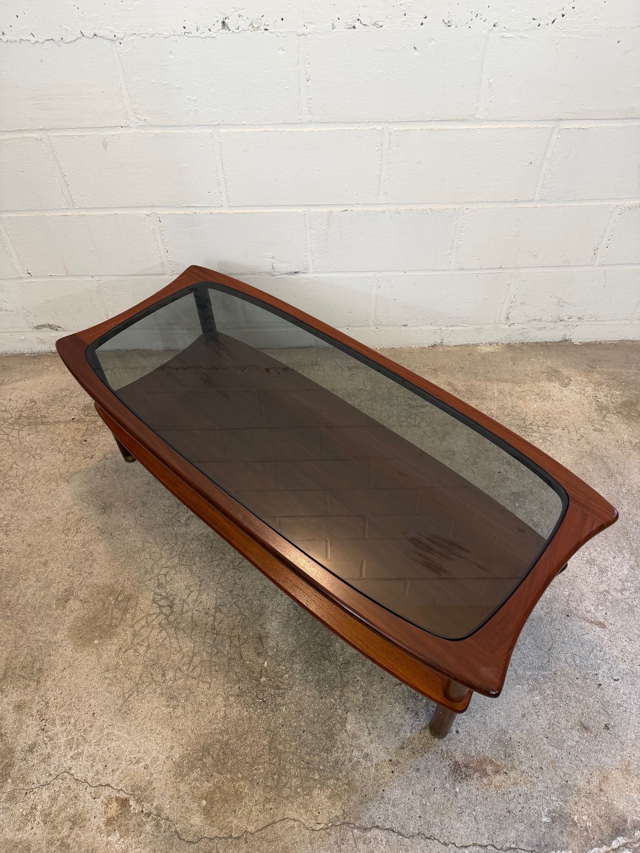 Une table basse en teck avec un plateau en verre fumé, années 60. A noter quelques petites rayures de surface sur le verre d'origine.