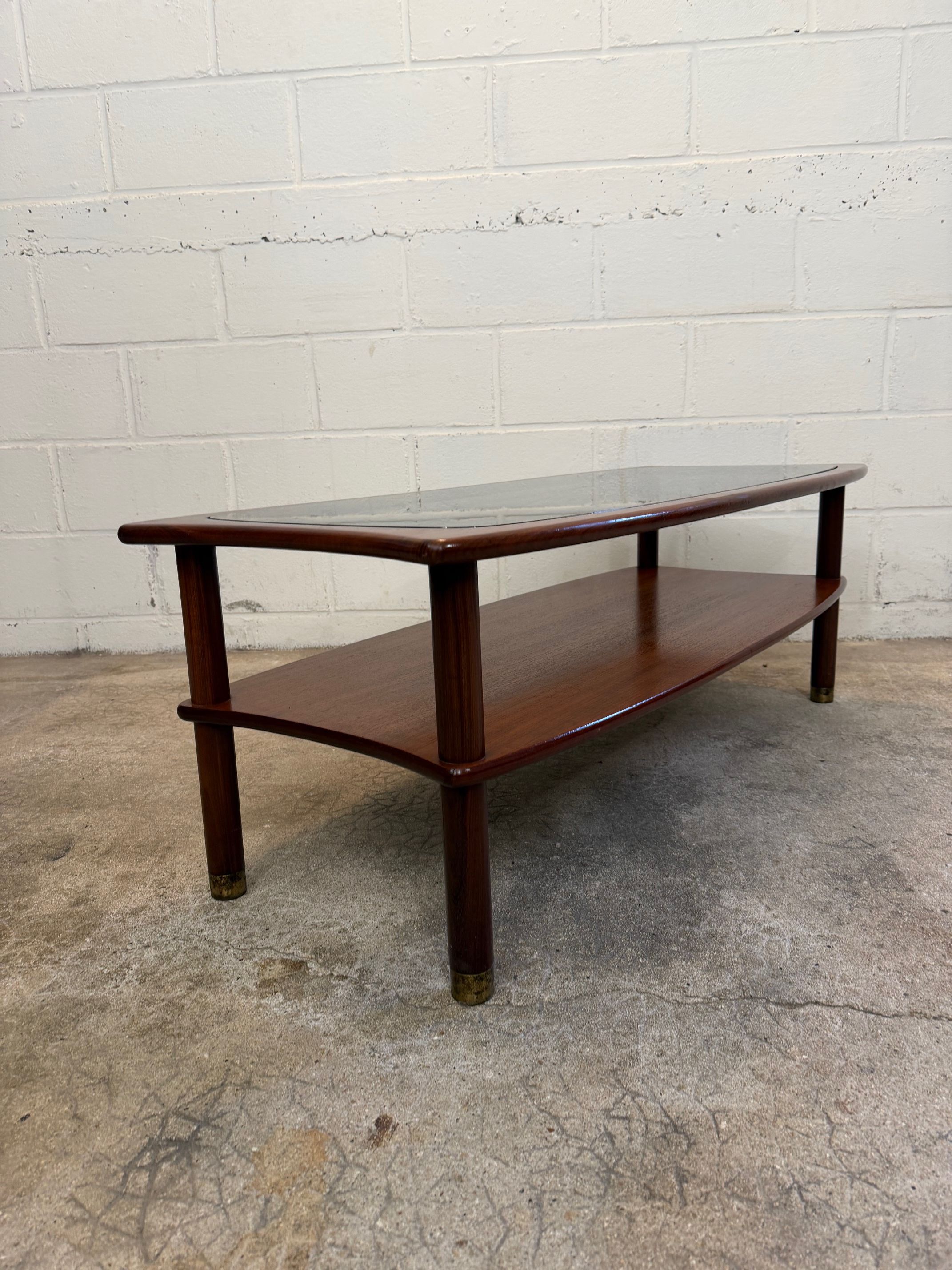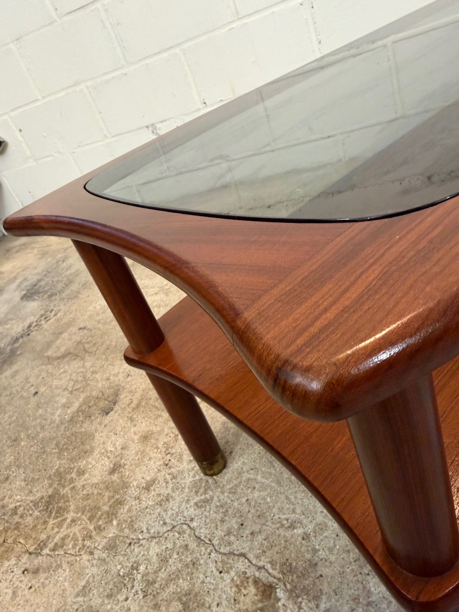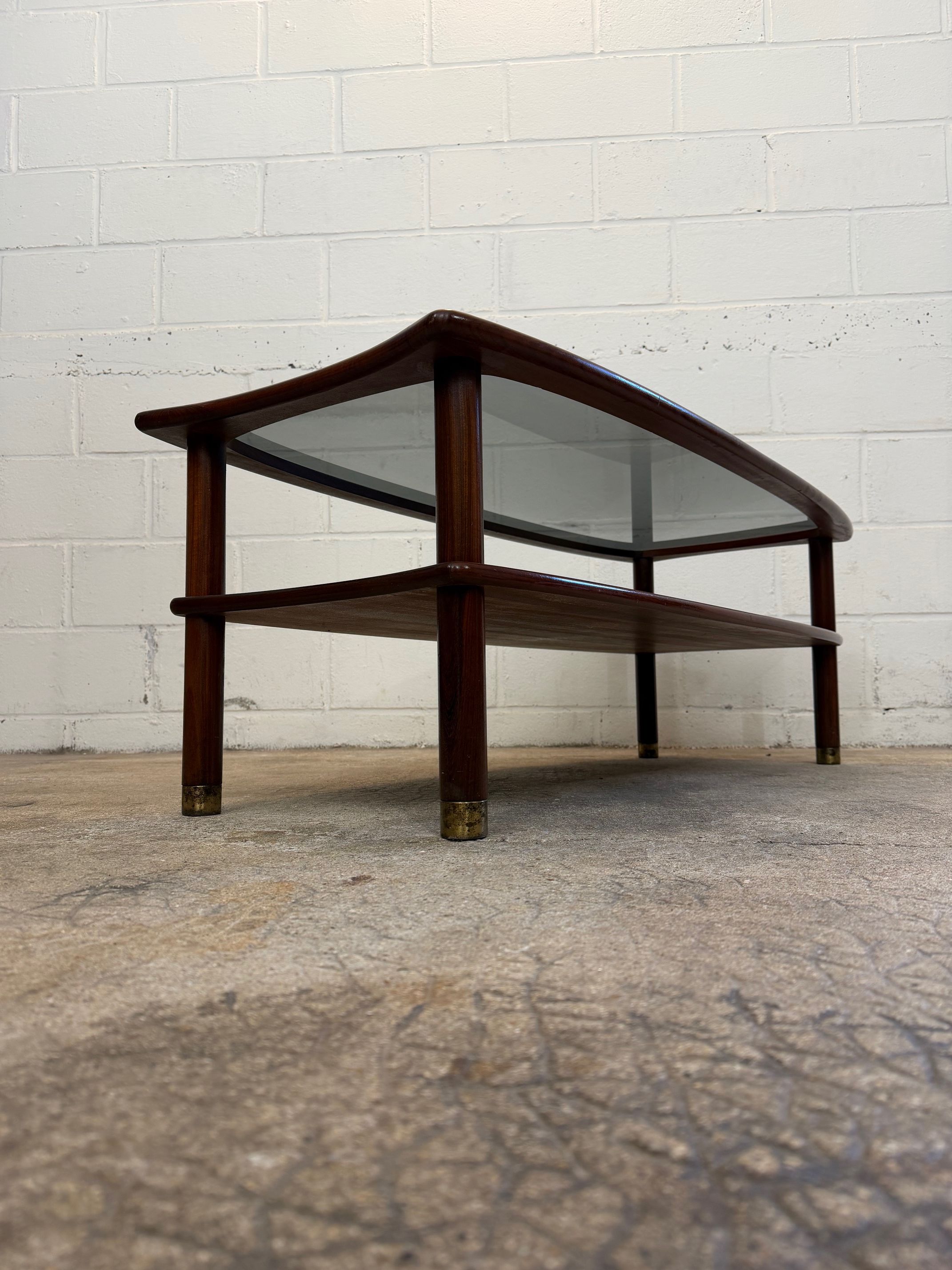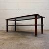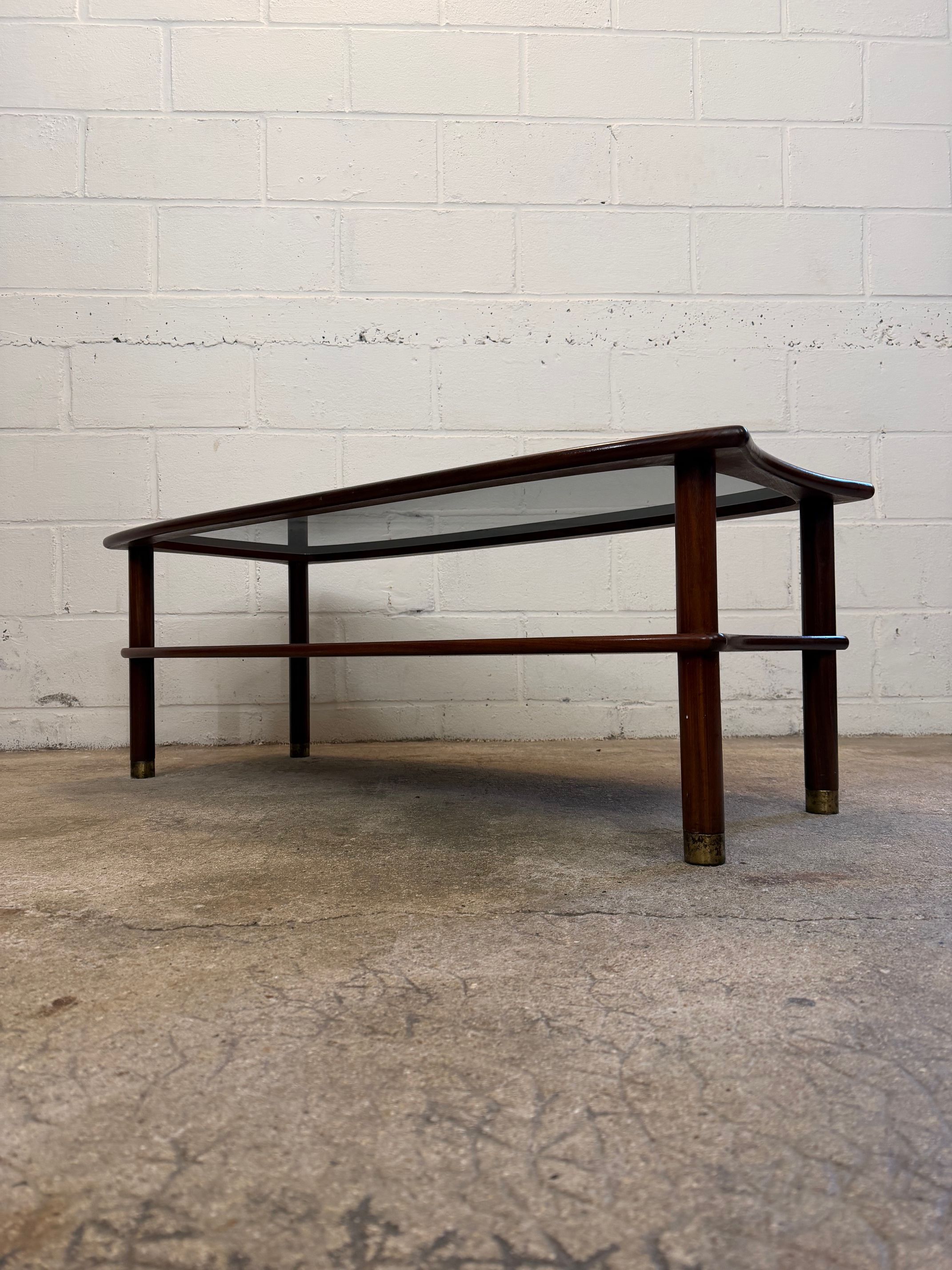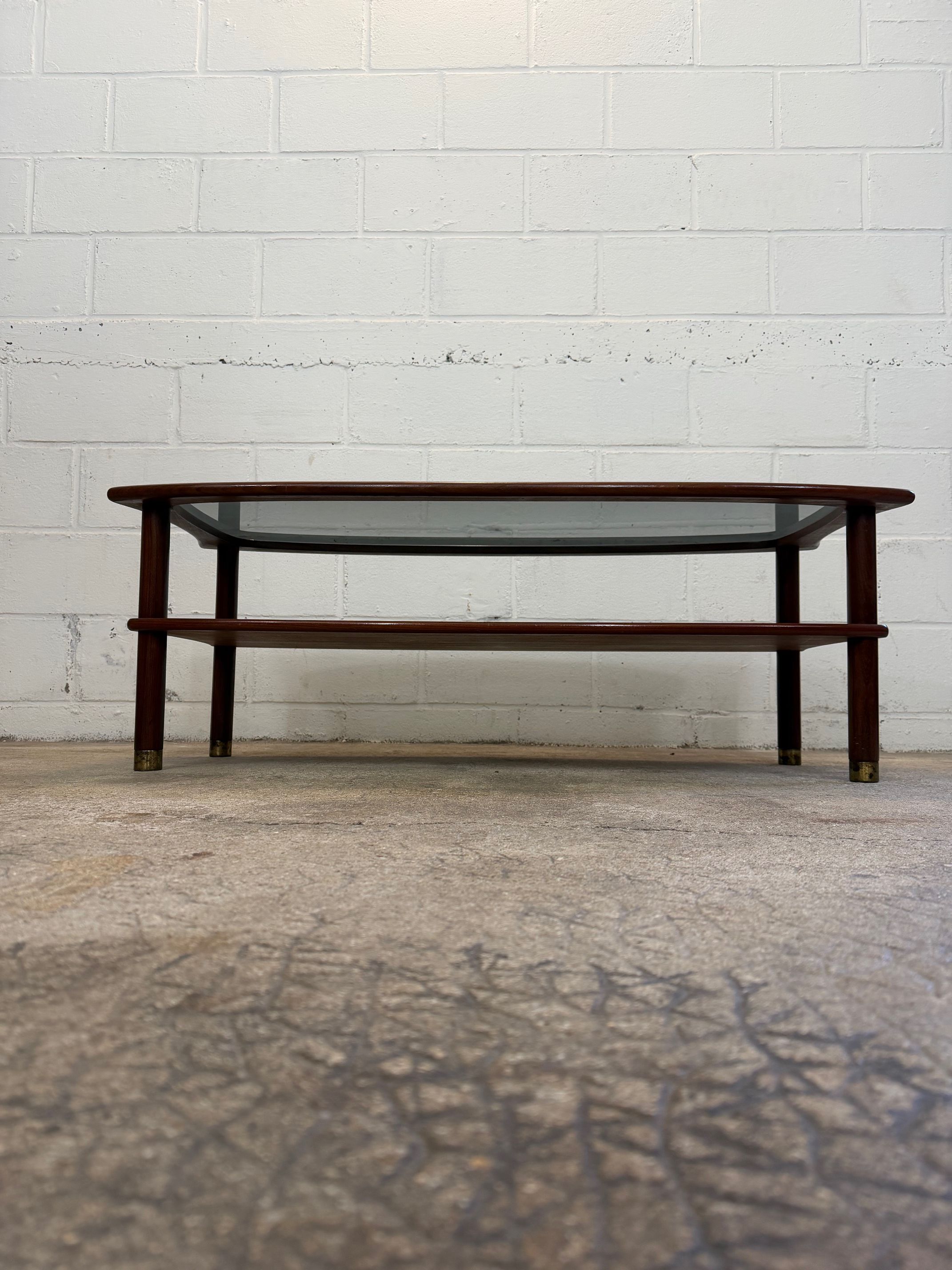 Une table basse en teck avec un plateau en verre fumé, années 60. A noter quelques petites rayures de surface sur le verre d'origine.