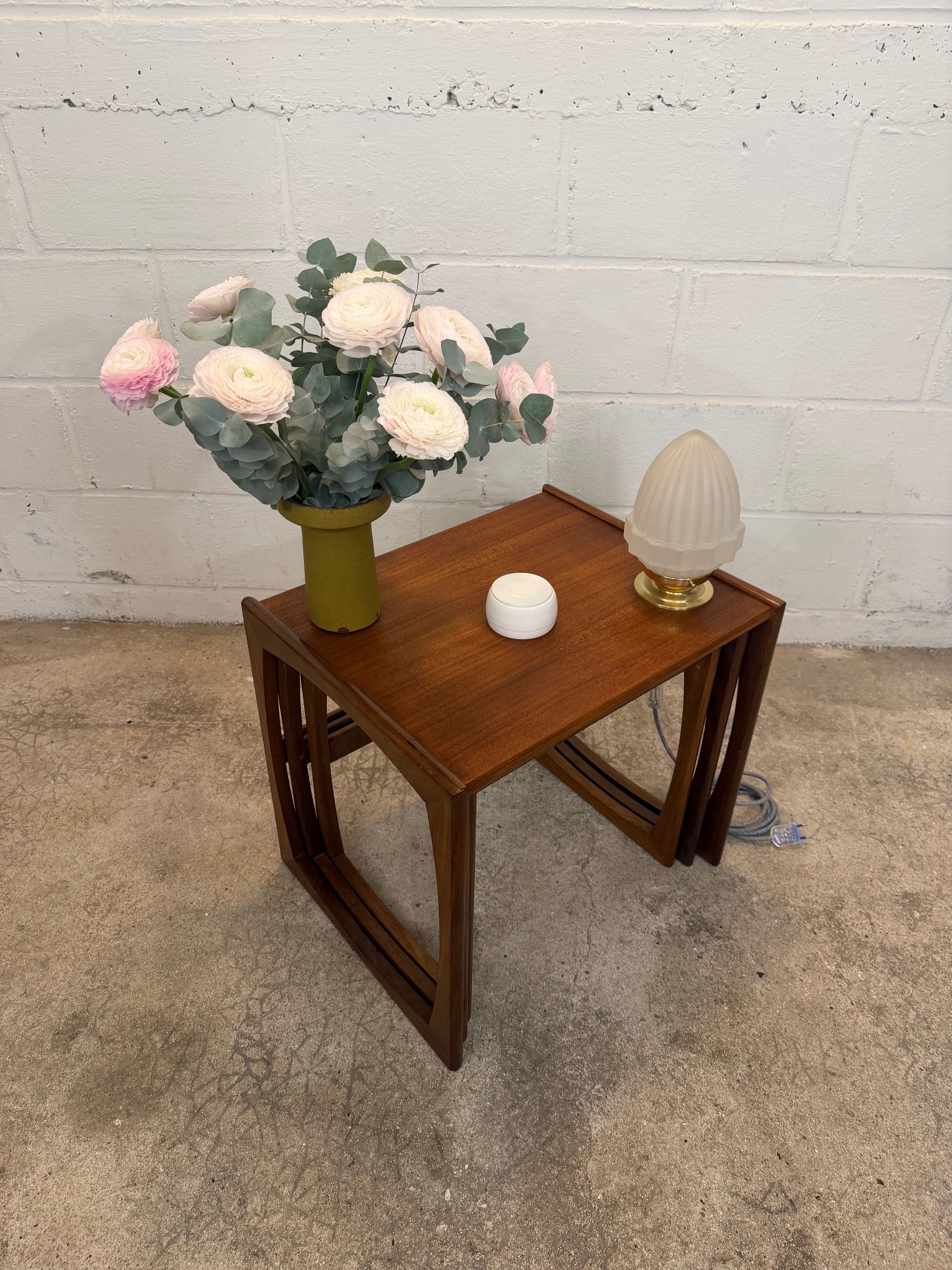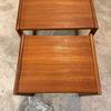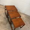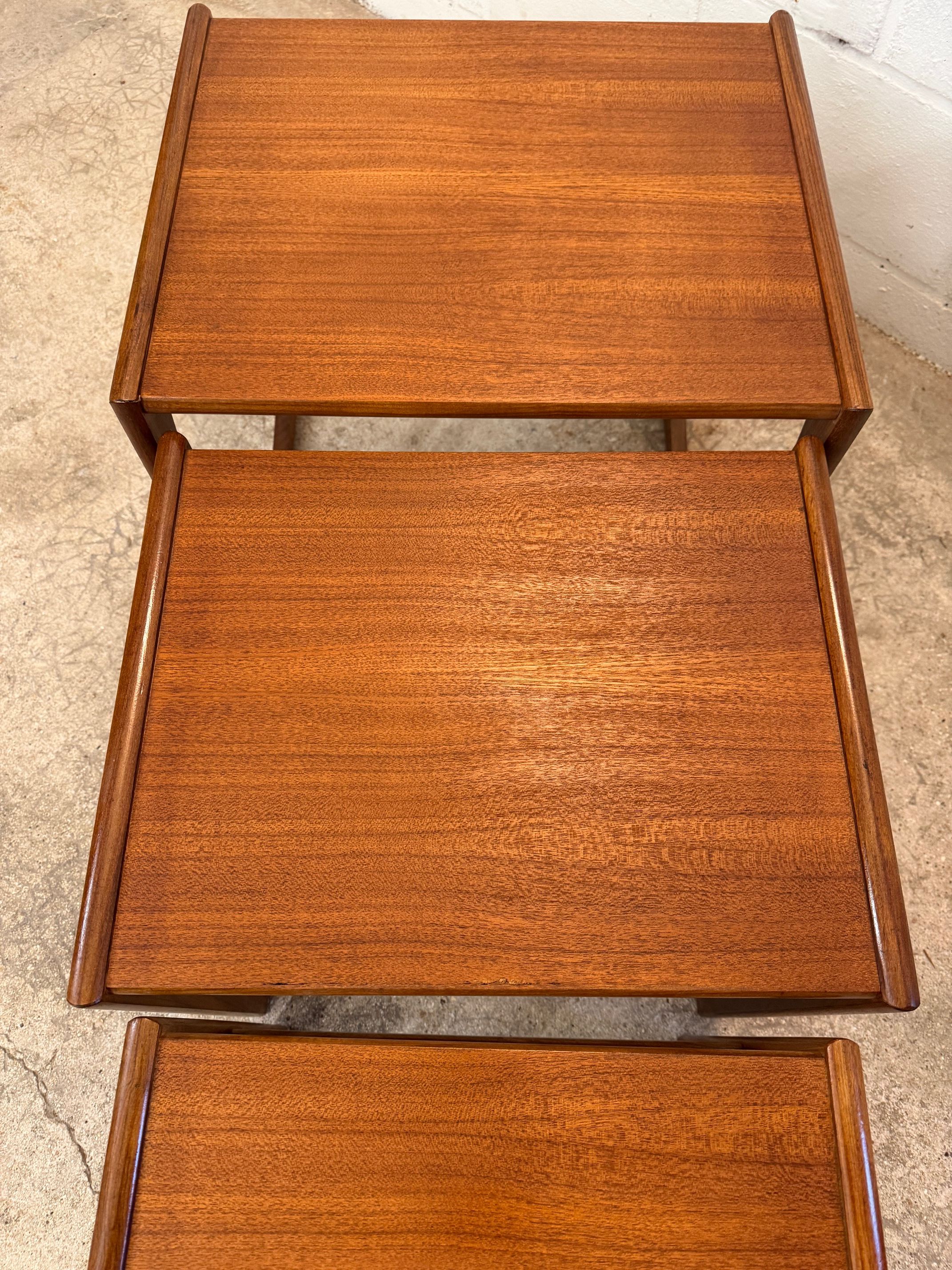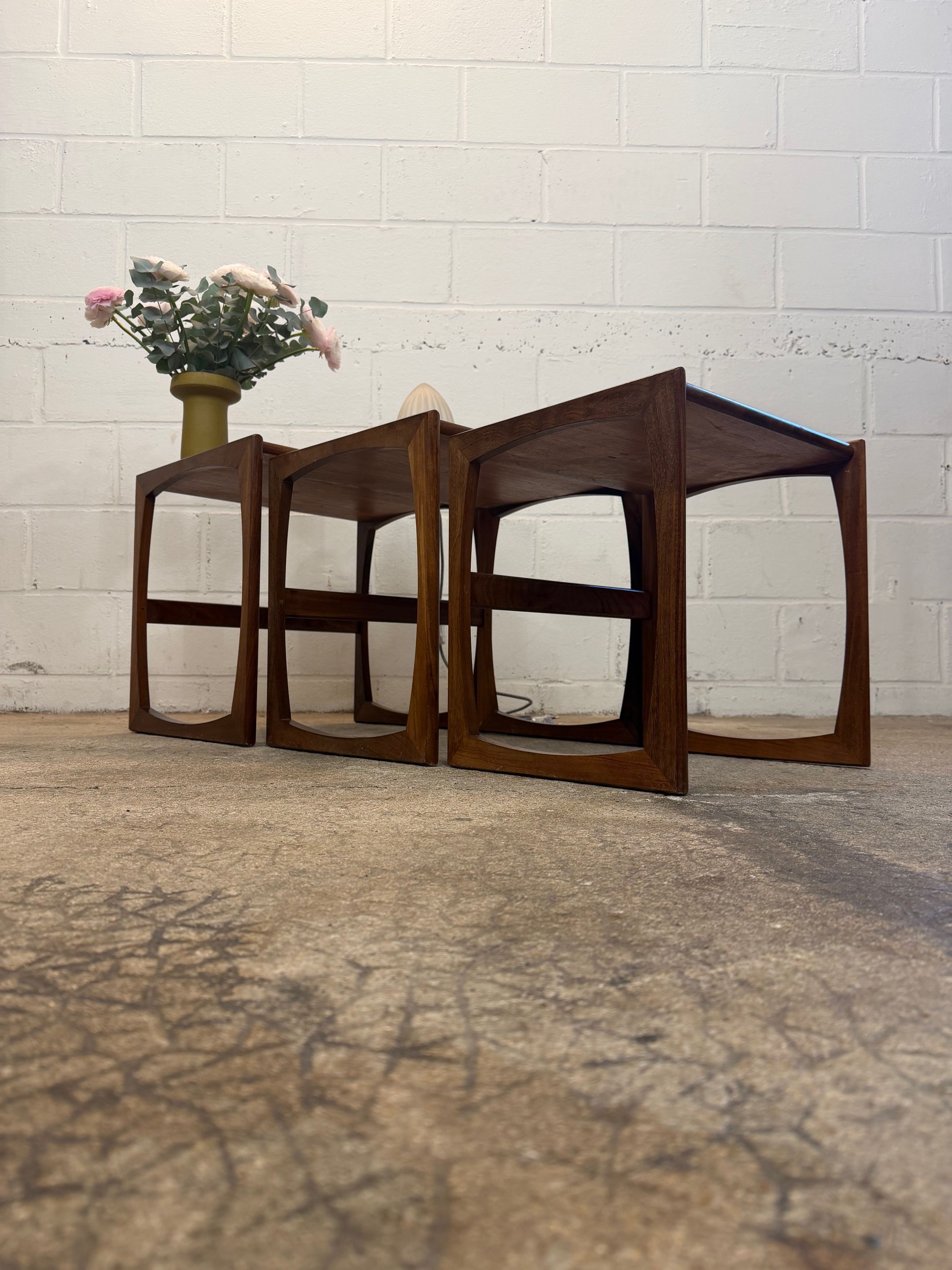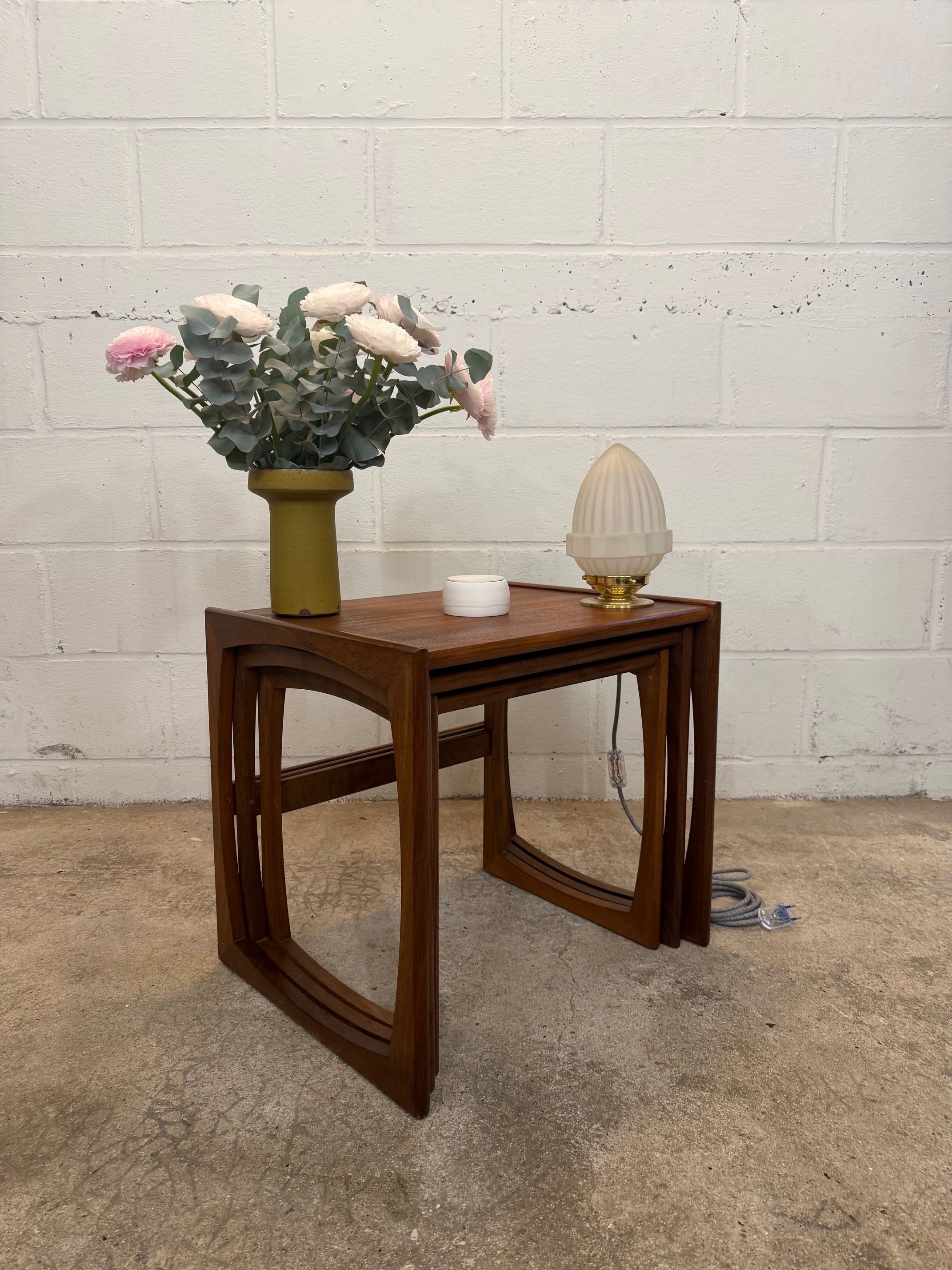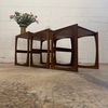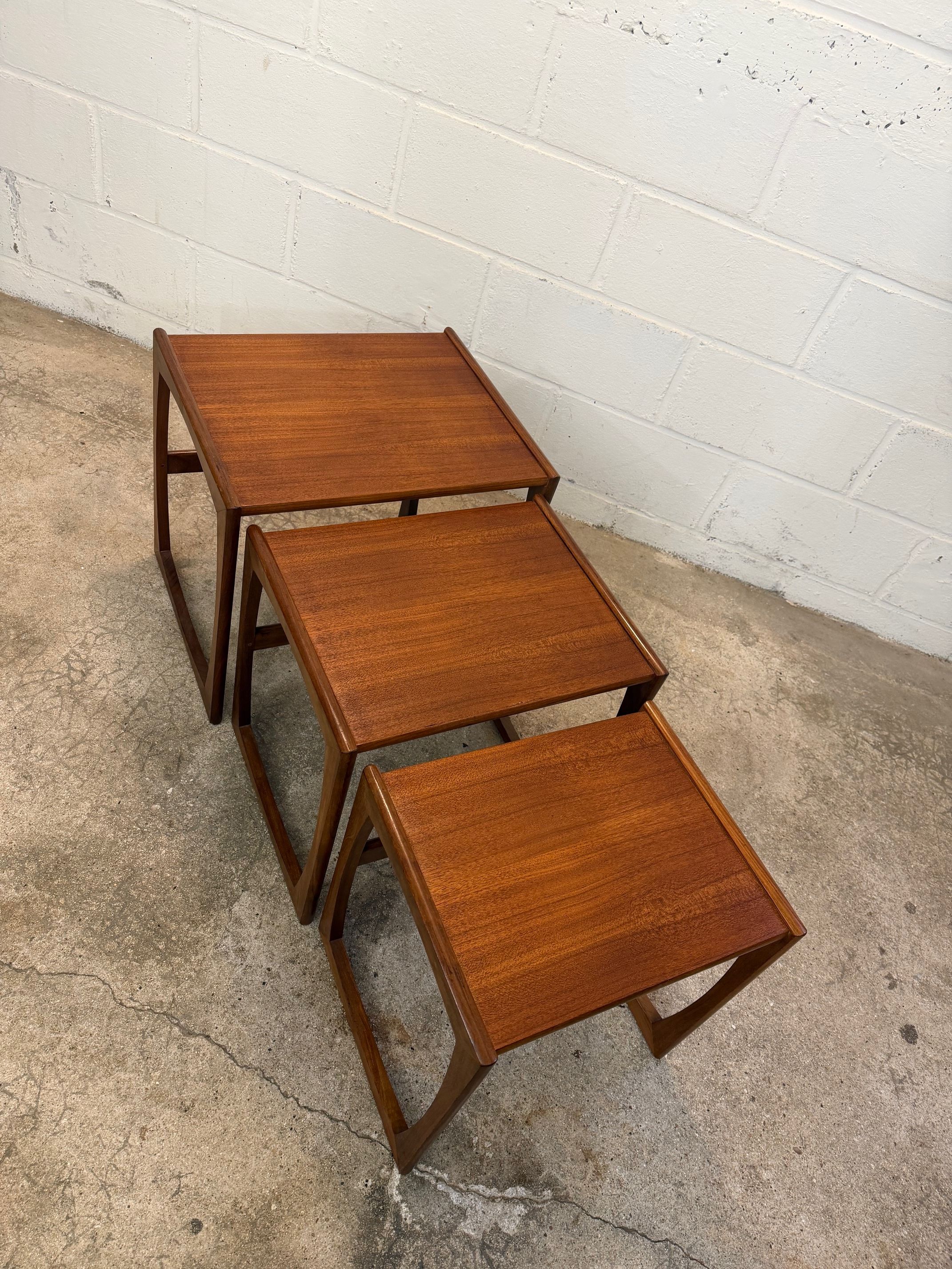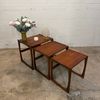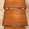 Un trio de tables gigognes en teck, modèle Quadrille édité par G-Plan dans les années 60 au Royaume-Uni. La table du milieu a un petit défaut de placage.(cf photo gros plan)