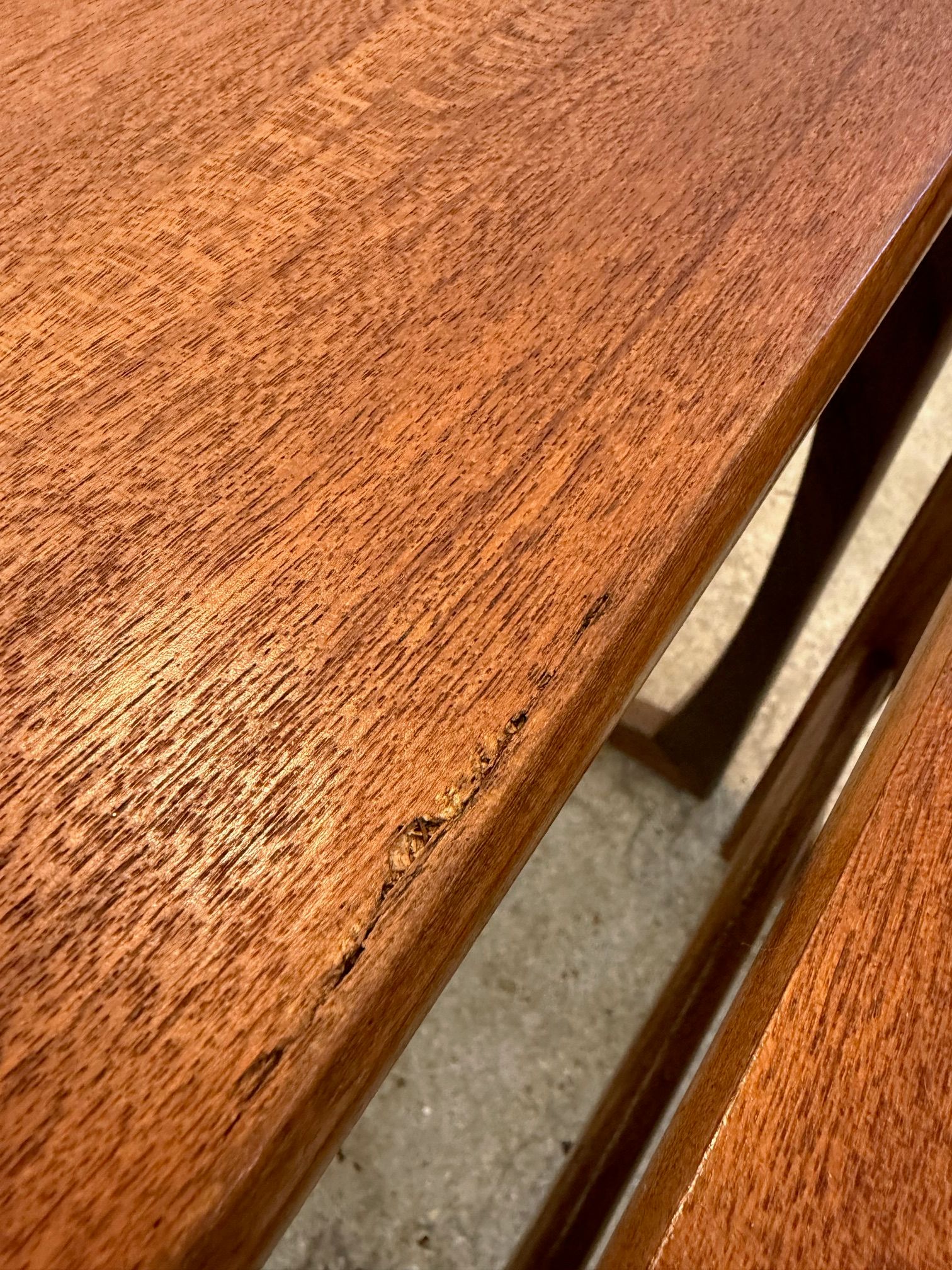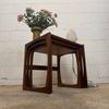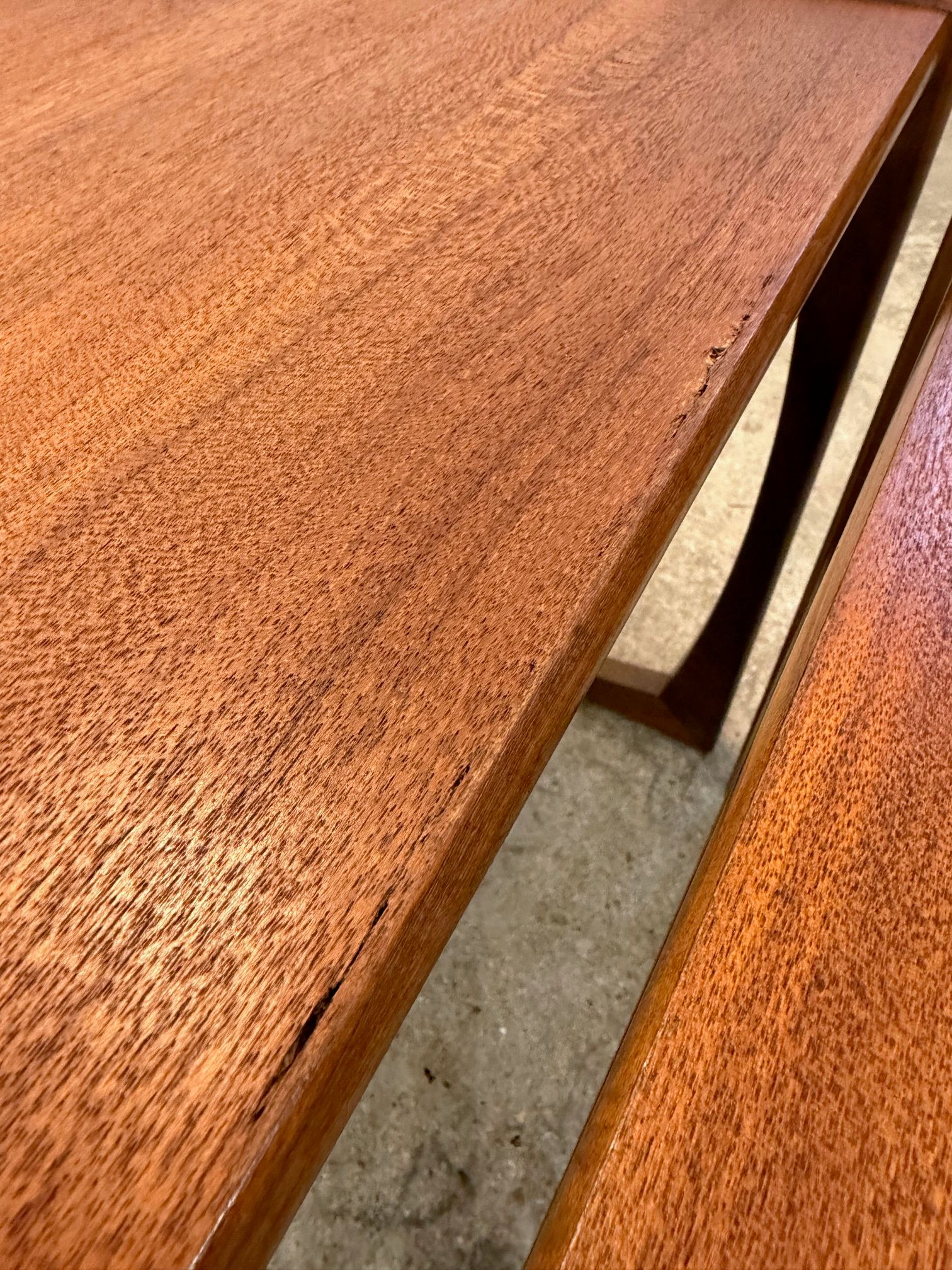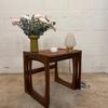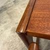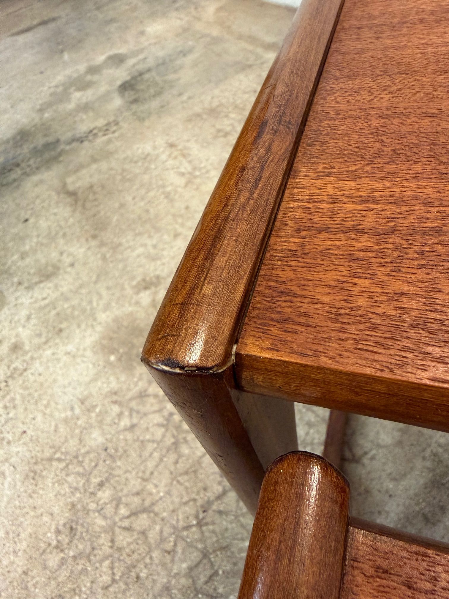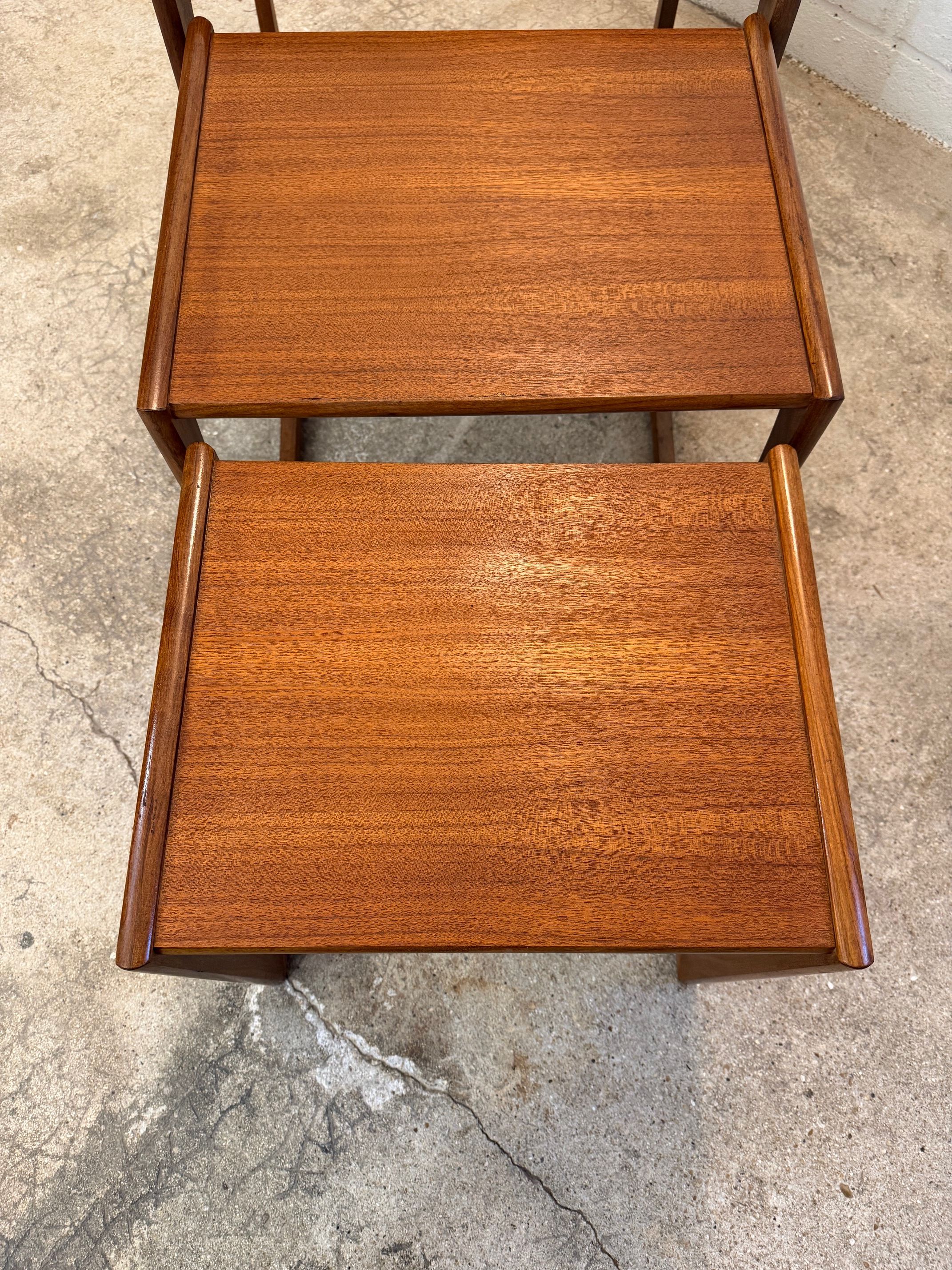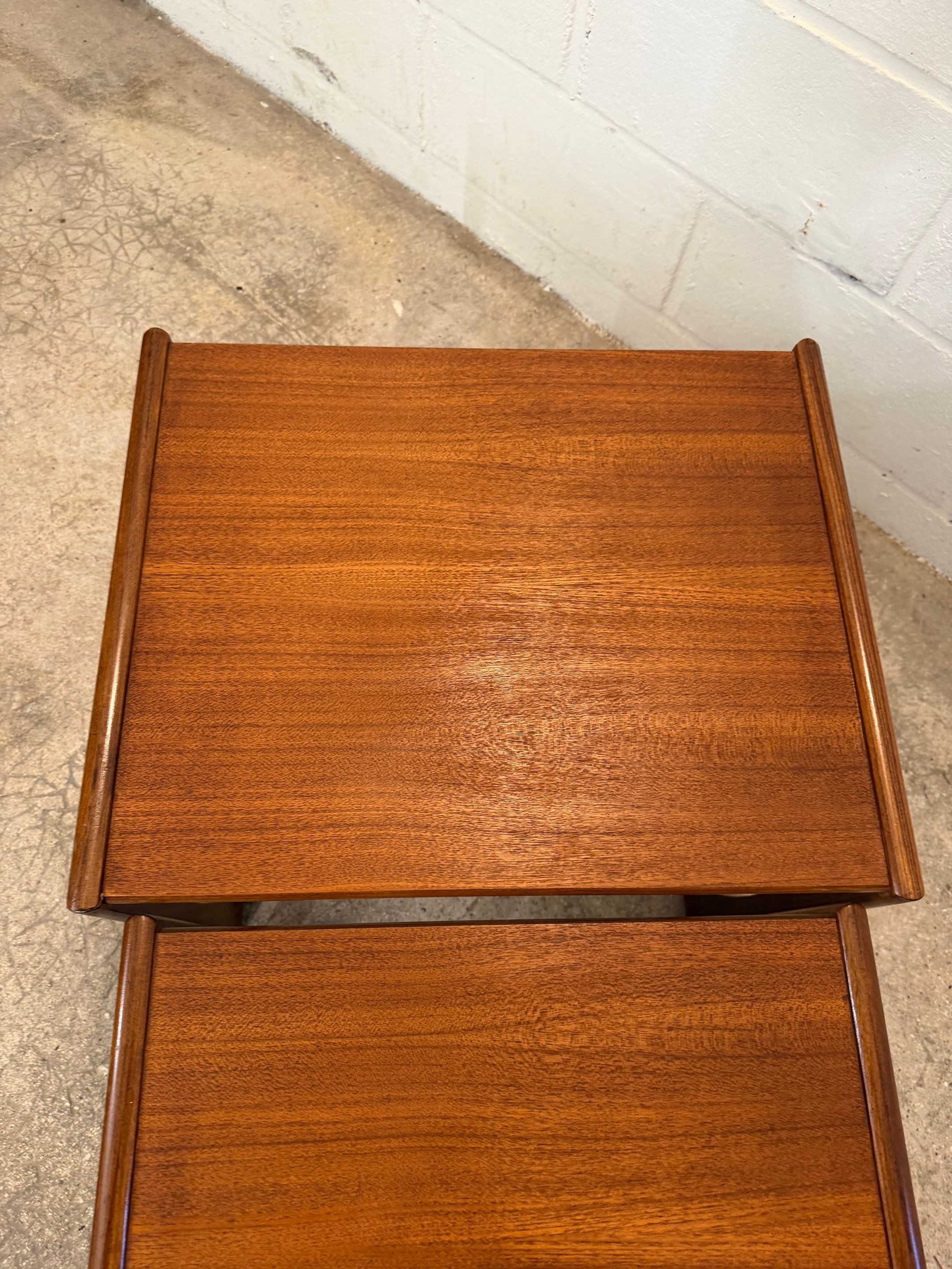 Un trio de tables gigognes en teck, modèle Quadrille édité par G-Plan dans les années 60 au Royaume-Uni. La table du milieu a un petit défaut de placage.(cf photo gros plan)